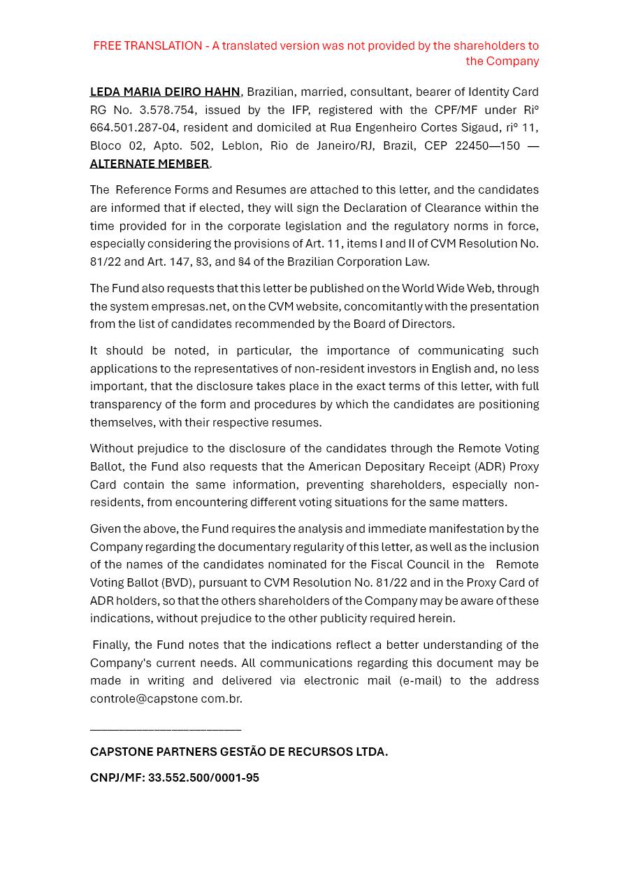 The nominations and required information are disclosed in the form received by the Company and disclosed to the market in the Management Proposal, and are attached to this communication.