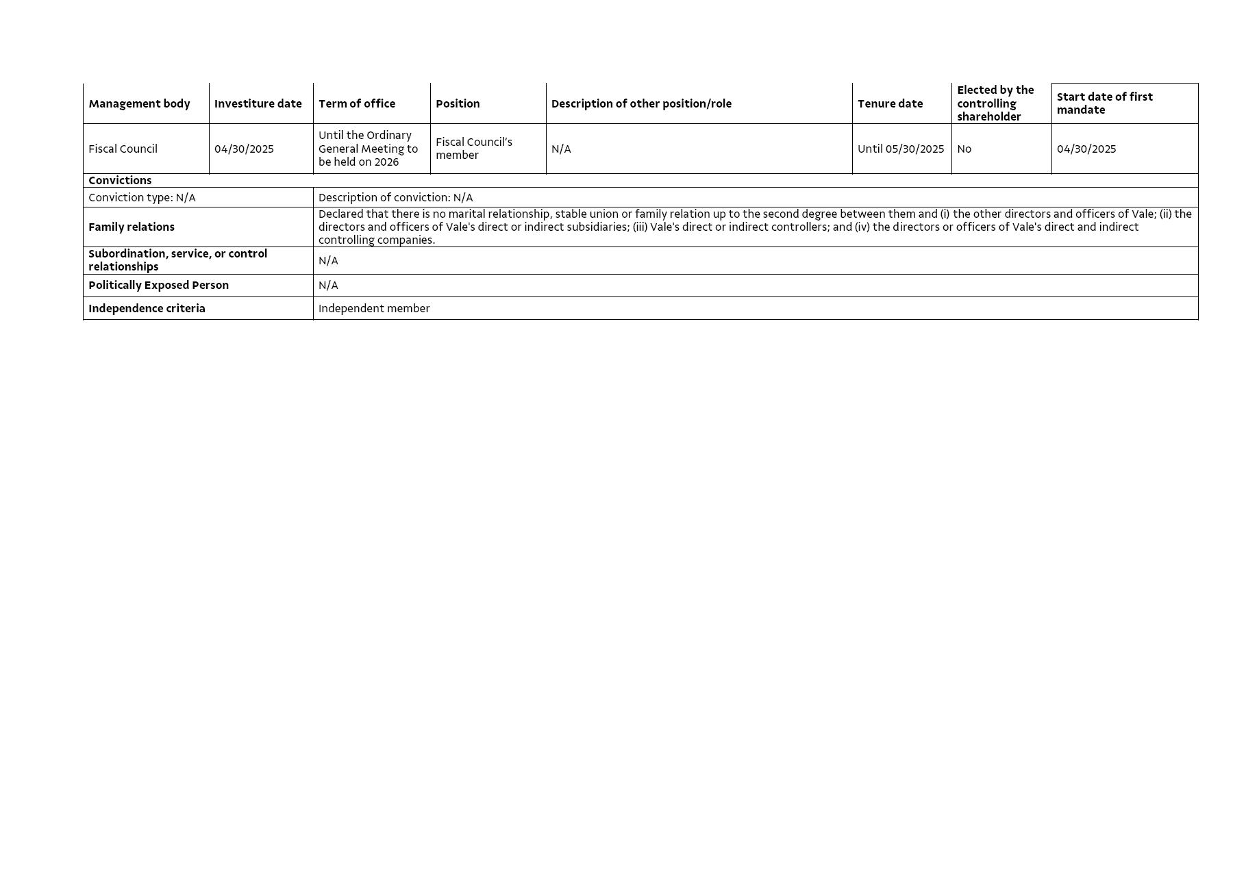 Vale confirms receipt of nominations for candidates for the Fiscal Council