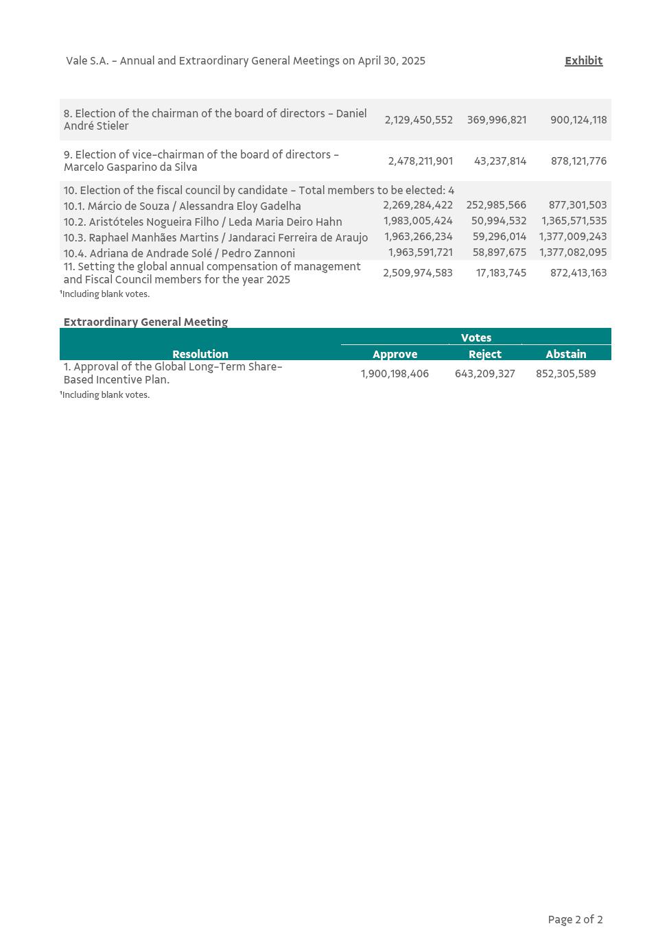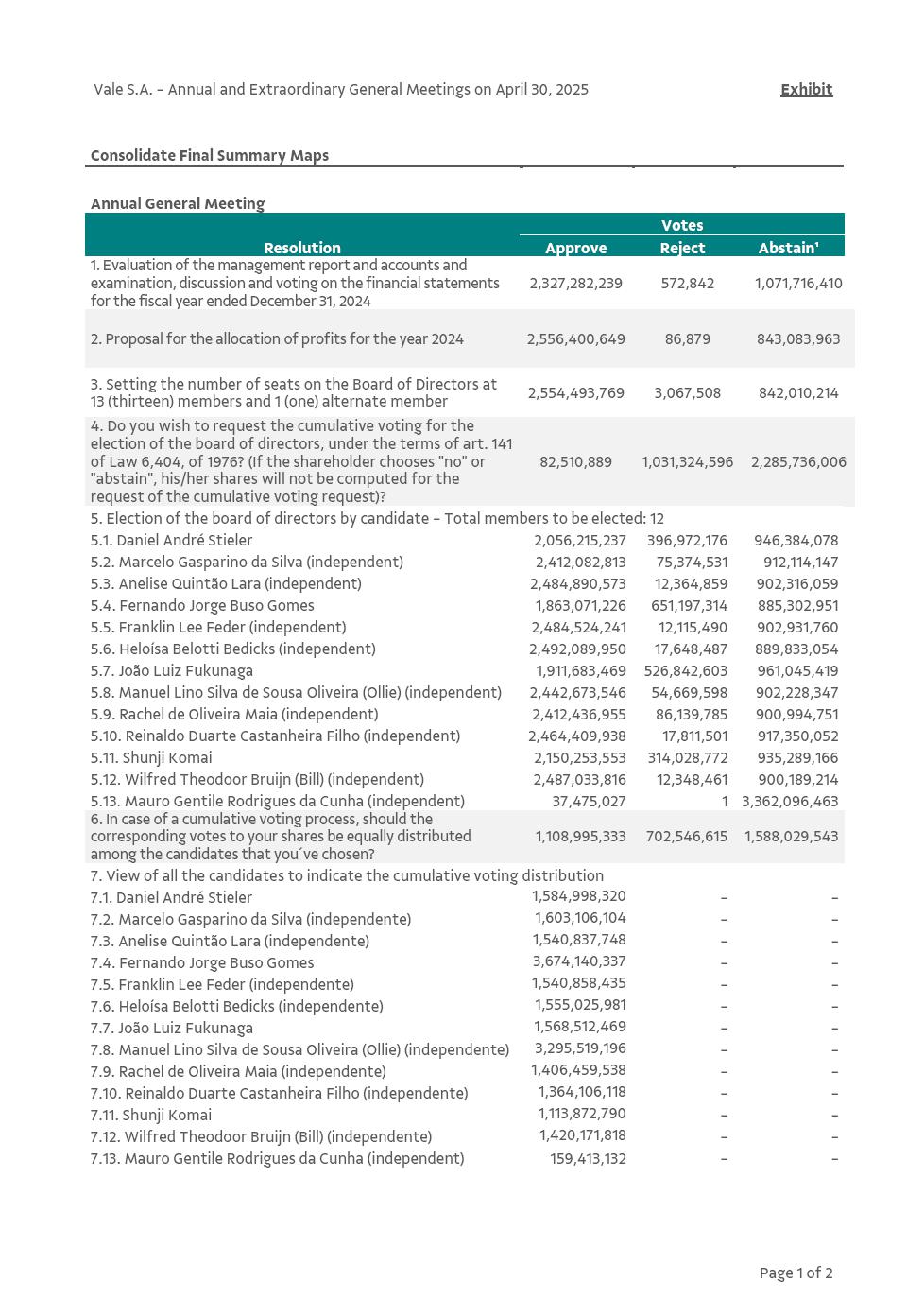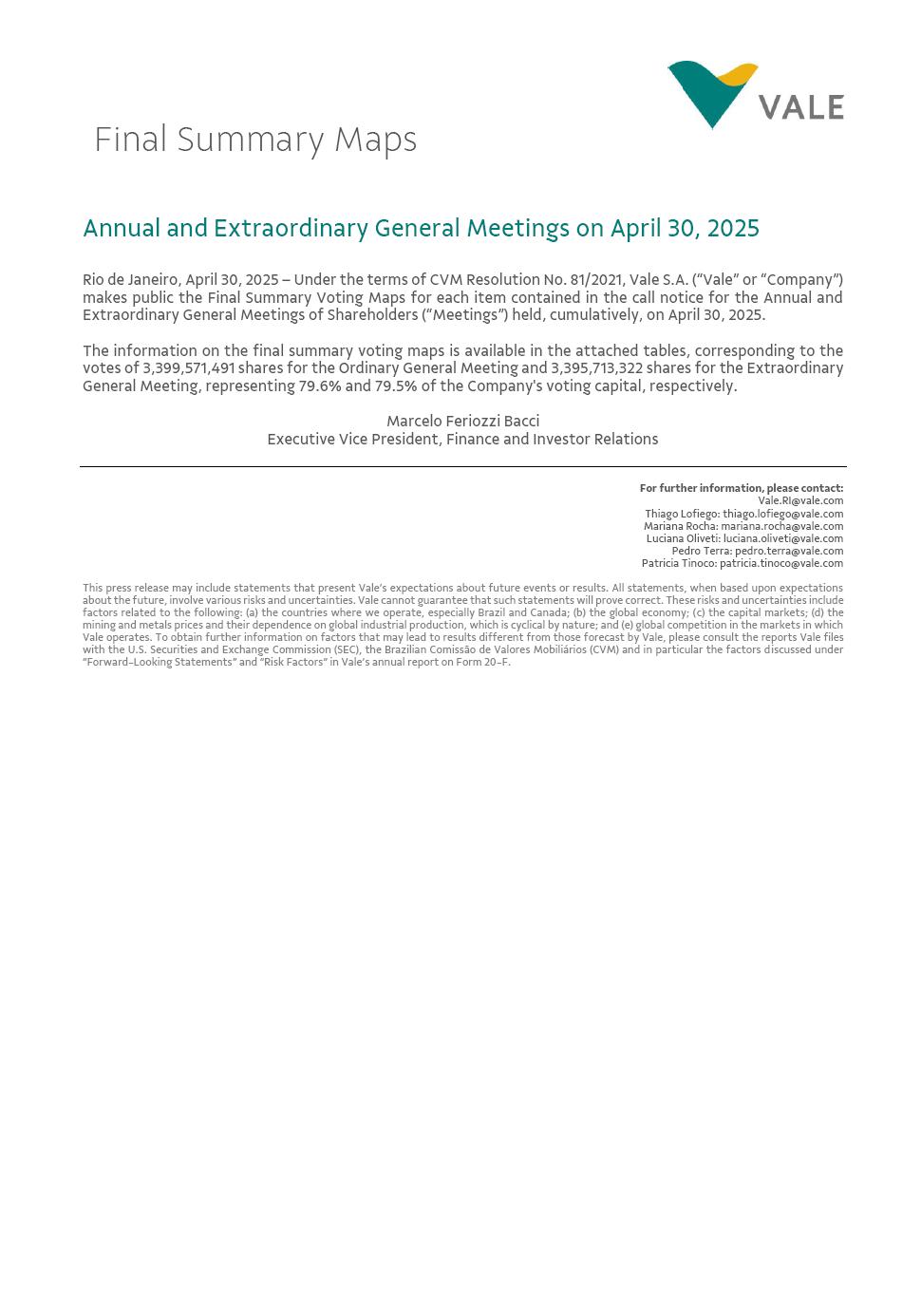 Annual and Extraordinary General Meetings on April 30, 2025 Rio de Janeiro, April 30, 2025 – Under the terms of CVM Resolution No. 81/2021, Vale S.A. (“Vale” or “Company”) makes public the Final Summary Voting Maps for each item contained in the call notice for the Annual and Extraordinary General Meetings of Shareholders (“Meetings”) held, cumulatively, on April 30, 2025. The information on the final summary voting maps is available in the attached tables, corresponding to the votes of 3,399,571,491 shares for the Ordinary General Meeting and 3,395,713,322 shares for the Extraordinary General Meeting, representing 79.6% and 79.5% of the Company's voting capital, respectively. Marcelo Feriozzi Bacci Executive Vice President, Finance and Investor Relations For further information, please contact: Vale.RI@vale.com Thiago Lofiego: thiago.lofiego@vale.com Mariana Rocha: mariana.rocha@vale.com Luciana Oliveti: luciana.oliveti@vale.com Pedro Terra: pedro.terra@vale.com Patricia Tinoco: patricia.tinoco@vale.com This press release may include statements that present Vale’s expectations about future events or results. All statements, when based upon expectations about the future, involve various risks and uncertainties. Vale cannot guarantee that such statements will prove correct. These risks and uncertainties include factors related to the following: (a) the countries where we operate, especially Brazil and Canada; (b) the global economy; (c) the capital markets; (d) the mining and metals prices and their dependence on global industrial production, which is cyclical by nature; and (e) global competition in the markets in which Vale operates. To obtain further information on factors that may lead to results different from those forecast by Vale, please consult the reports Vale files with the U.S. Securities and Exchange Commission (SEC), the Brazilian Comissão de Valores Mobiliários (CVM) and in particular the factors discussed under “Forward-Looking Statements” and “Risk Factors” in Vale’s annual report on Form 20-F. Final Summary Maps Vale S.A. - Annual and Extraordinary General Meetings on April 30, 2025 Exhibit Consolidate Final Summary Maps Annual General Meeting Resolution Votes Approve Reject Abstain¹ 1. Evaluation of the management report and accounts and examination, discussion and voting on the financial statements for the fiscal year ended December 31, 2024 2,327,282,239 572,842 1,071,716,410 2. Proposal for the allocation of profits for the year 2024 2,556,400,649 86,879 843,083,963 3. Setting the number of seats on the Board of Directors at 13 (thirteen) members and 1 (one) alternate member 2,554,493,769 3,067,508 842,010,214 4. Do you wish to request the cumulative voting for the election of the board of directors, under the terms of art. 141 of Law 6,404, of 1976? (If the shareholder chooses "no" or "abstain", his/her shares will not be computed for the request of the cumulative voting request)? 82,510,889 1,031,324,596 2,285,736,006 5. Election of the board of directors by candidate - Total members to be elected: 12 5.1. Daniel André Stieler 2,056,215,237 396,972,176 946,384,078 5.2. Marcelo Gasparino da Silva (independent) 2,412,082,813 75,374,531 912,114,147 5.3. Anelise Quintão Lara (independent) 2,484,890,573 12,364,859 902,316,059 5.4. Fernando Jorge Buso Gomes 1,863,071,226 651,197,314 885,302,951 5.5. Franklin Lee Feder (independent) 2,484,524,241 12,115,490 902,931,760 5.6. Heloísa Belotti Bedicks (independent) 2,492,089,950 17,648,487 889,833,054 5.7. João Luiz Fukunaga 1,911,683,469 526,842,603 961,045,419 5.8. Manuel Lino Silva de Sousa Oliveira (Ollie) (independent) 2,442,673,546 54,669,598 902,228,347 5.9. Rachel de Oliveira Maia (independent) 2,412,436,955 86,139,785 900,994,751 5.10. Reinaldo Duarte Castanheira Filho (independent) 2,464,409,938 17,811,501 917,350,052 5.11. Shunji Komai 2,150,253,553 314,028,772 935,289,166 5.12. Wilfred Theodoor Bruijn (Bill) (independent) 2,487,033,816 12,348,461 900,189,214 5.13. Mauro Gentile Rodrigues da Cunha (independent) 37,475,027 1 3,362,096,463 6. In case of a cumulative voting process, should the corresponding votes to your shares be equally distributed among the candidates that you´ve chosen? 1,108,995,333 702,546,615 1,588,029,543 7. View of all the candidates to indicate the cumulative voting distribution 7.1. Daniel André Stieler 1,584,998,320 - - 7.2. Marcelo Gasparino da Silva (independente) 1,603,106,104 - - 7.3. Anelise Quintão Lara (independente) 1,540,837,748 - - 7.4. Fernando Jorge Buso Gomes 3,674,140,337 - - 7.5. Franklin Lee Feder (independente) 1,540,858,435 - - 7.6. Heloísa Belotti Bedicks (independente) 1,555,025,981 - - 7.7. João Luiz Fukunaga 1,568,512,469 - - 7.8. Manuel Lino Silva de Sousa Oliveira (Ollie) (independente) 3,295,519,196 - - 7.9. Rachel de Oliveira Maia (independente) 1,406,459,538 - - 7.10. Reinaldo Duarte Castanheira Filho (independente) 1,364,106,118 - - 7.11. Shunji Komai 1,113,872,790 - - 7.12. Wilfred Theodoor Bruijn (Bill) (independente) 1,420,171,818 - - 7.13. Mauro Gentile Rodrigues da Cunha (independent) 159,413,132 - - Vale S.A. - Annual and Extraordinary General Meetings on April 30, 2025 Exhibit 8. Election of the chairman of the board of directors - Daniel André Stieler 2,129,450,552 369,996,821 900,124,118 9. Election of vice-chairman of the board of directors - Marcelo Gasparino da Silva 2,478,211,901 43,237,814 878,121,776 10. Election of the fiscal council by candidate - Total members to be elected: 4 10.1. Márcio de Souza / Alessandra Eloy Gadelha 2,269,284,422 252,985,566 877,301,503 10.2. Aristóteles Nogueira Filho / Leda Maria Deiro Hahn 1,983,005,424 50,994,532 1,365,571,535 10.3. Raphael Manhães Martins / Jandaraci Ferreira de Araujo 1,963,266,234 59,296,014 1,377,009,243 10.4. Adriana de Andrade Solé / Pedro Zannoni 1,963,591,721 58,897,675 1,377,082,095 11. Setting the global annual compensation of management and Fisca