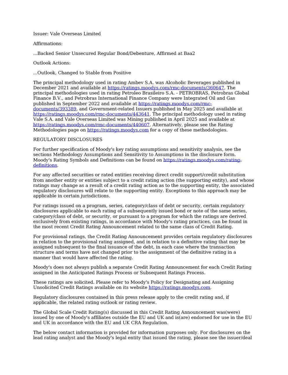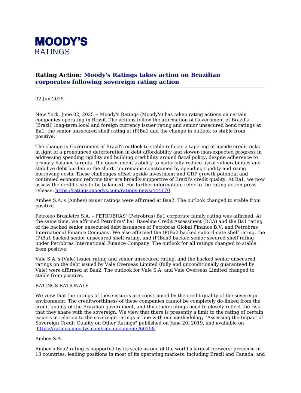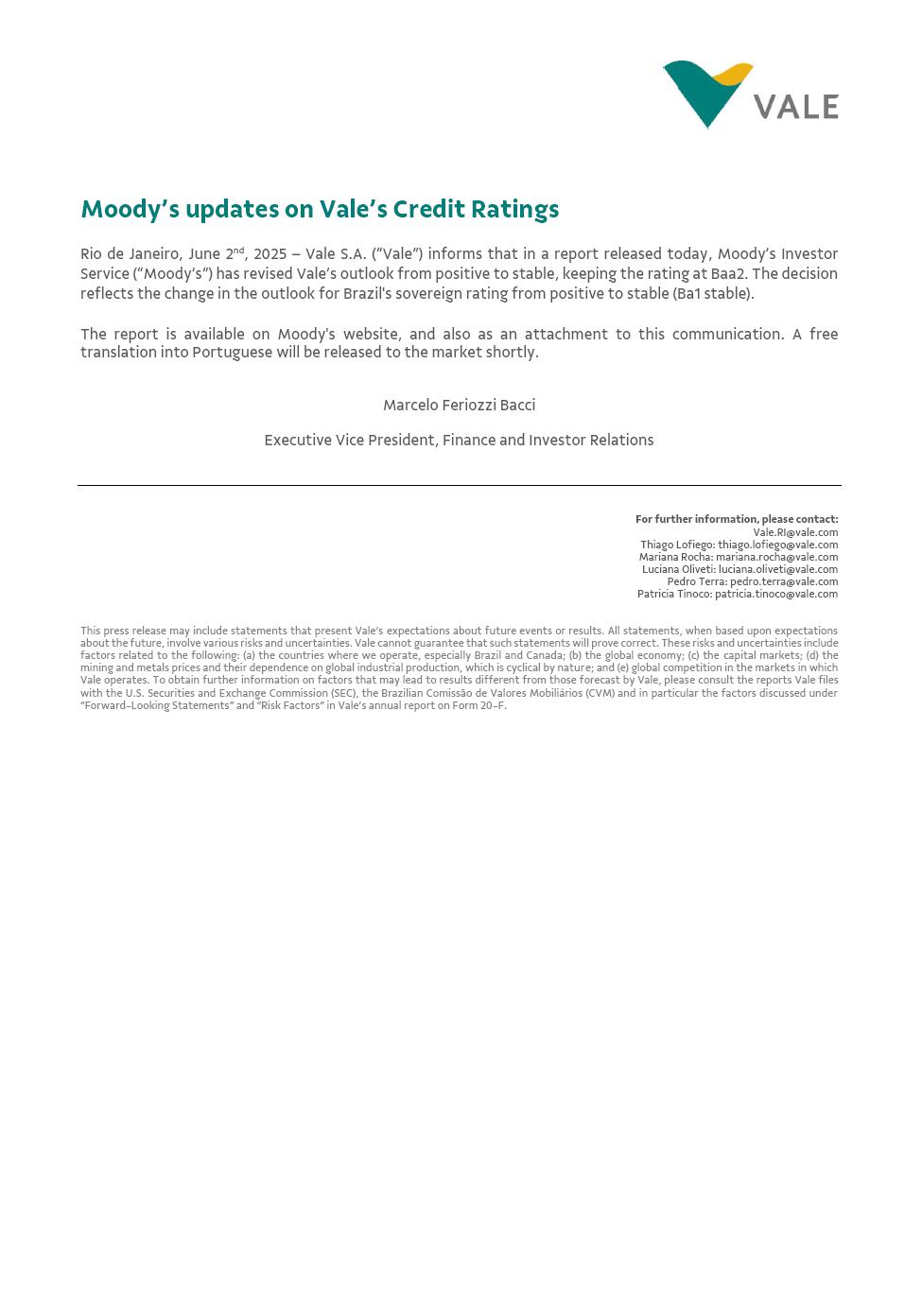 Moody’s updates on Vale’s Credit Ratings Rio de Janeiro, June 2nd, 2025 – Vale S.A. (“Vale”) informs that in a report released today, Moody’s Investor Service (“Moody’s”) has revised Vale’s outlook from positive to stable, keeping the rating at Baa2. The decision reflects the change in the outlook for Brazil's sovereign rating from positive to stable (Ba1 stable). The report is available on Moody's website, and also as an attachment to this communication. A free translation into Portuguese will be released to the market shortly. Marcelo Feriozzi Bacci Executive Vice President, Finance and Investor Relations For further information, please contact: Vale.RI@vale.com Thiago Lofiego: thiago.lofiego@vale.com Mariana Rocha: mariana.rocha@vale.com Luciana Oliveti: luciana.oliveti@vale.com Pedro Terra: pedro.terra@vale.com Patricia Tinoco: patricia.tinoco@vale.com This press release may include statements that present Vale’s expectations about future events or results. All statements, when based upon expectations about the future, involve various risks and uncertainties. Vale cannot guarantee that such statements will prove correct. These risks and uncertainties include factors related to the following: (a) the countries where we operate, especially Brazil and Canada; (b) the global economy; (c) the capital markets; (d) the mining and metals prices and their dependence on global industrial production, which is cyclical by nature; and (e) global competition in the markets in which Vale operates. To obtain further information on factors that may lead to results different from those forecast by Vale, please consult the reports Vale files with the U.S. Securities and Exchange Commission (SEC), the Brazilian Comissão de Valores Mobiliários (CVM) and in particular the factors discussed under “Forward-Looking Statements” and “Risk Factors” in Vale’s annual report on Form 20-F. Rating Action: Moody's Ratings takes action on Brazilian corporates following sovereign rating action 02 Jun 2025 New York, June 02, 2025 -- Moody's Ratings (Moody's) has taken rating actions on certain companies operating in Brazil. The actions follow the affirmation of Government of Brazil's (Brazil) long-term local and foreign currency issuer rating and senior unsecured bond ratings at Ba1, the senior unsecured shelf rating at (P)Ba1 and the change in outlook to stable from positive. The change in Government of Brazil's outlook to stable reflects a tapering of upside credit risks in light of a pronounced deterioration in debt affordability and slower-than-expected progress in addressing spending rigidity and building credibility around fiscal policy, despite adherence to primary balance targets. The government's ability to materially reduce fiscal vulnerabilities and stabilize debt burden in the short run remains constrained by spending rigidity and rising borrowing costs. These challenges offset upside investment and GDP growth potential and continued economic reforms that are broadly supportive of Brazil's credit quality. At Ba1, we now assess the credit risks to be balanced. For further information, refer to the rating action press release: https://ratings.moodys.com/ratings-news/444170. Ambev S.A.'s (Ambev) issuer ratings were affirmed at Baa2. The outlook changed to stable from positive. Petroleo Brasileiro S.A. – PETROBRAS' (Petrobras) Ba1 corporate family rating was affirmed. At the same time, we affirmed Petrobras' ba1 Baseline Credit Assessment (BCA) and the Ba1 rating of the backed senior unsecured debt issuances of Petrobras Global Finance B.V. and Petrobras International Finance Company. We also affirmed the (P)Ba2 backed subordinate shelf rating, the (P)Ba1 backed senior unsecured shelf rating, and (P)Baa3 backed senior secured shelf rating under Petrobras International Finance Company. The outlook for all ratings changed to stable from positive. Vale S.A.'s (Vale) issuer rating and senior unsecured rating, and the backed senior unsecured ratings on the debt issued by Vale Overseas Limited (fully and unconditionally guaranteed by Vale) were affirmed at Baa2. The outlook for Vale S.A. and Vale Overseas Limited changed to stable from positive. RATINGS RATIONALE We view that the ratings of these issuers are constrained by the credit quality of the sovereign environment. The creditworthiness of these companies cannot be completely de-linked from the credit quality of the Brazilian government, and thus their ratings need to closely reflect the risk that they share with the sovereign. We view that there is presently a limit to the rating of certain issuers in relation to the sovereign ratings in line with our methodology "Assessing the Impact of Sovereign Credit Quality on Other Ratings" published on June 20, 2019, and available on https://ratings.moodys.com/rmc-documents/60258. Ambev S.A. Ambev's Baa2 rating is supported by its scale as one of the world's largest brewers; presence in 18 countries; leading positions in most of its operating markets, including Brazil and Canada; and vast portfolio of brands of alcoholic and nonalcoholic beverages. The company benefits from its geographic diversification and brand recognition while its scale translates into a higher bargaining power with suppliers. Moreover, its geographic and product diversification mitigates cash flow volatility arising from weather events or market downturns in specific regions. The company's dominant market position in Brazil, strong execution capabilities and strict cost control allow it to withstand market volatility and still maintain exceptionally strong profitability and credit metrics. Ambev's limited reliance on the local banking system for funding, its generation of a significant portion of assets and cash outside Brazil, and its importance to the controlling shareholder Anheuser-Busch InBev SA/NV (ABI, A3 positive) help offset the negative effect of the company's links to the Brazilian economy. Ambev's rati
