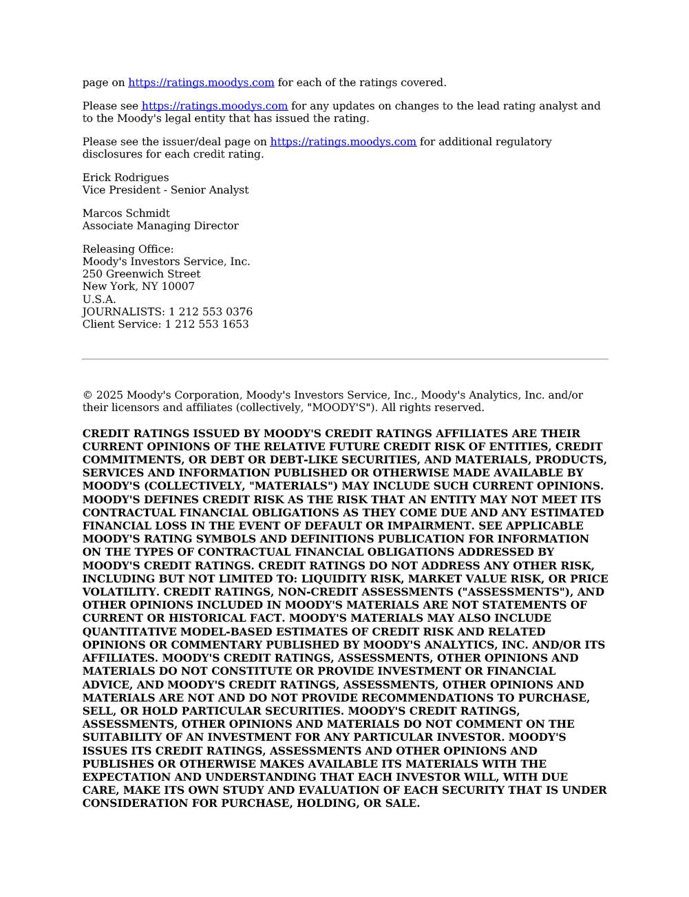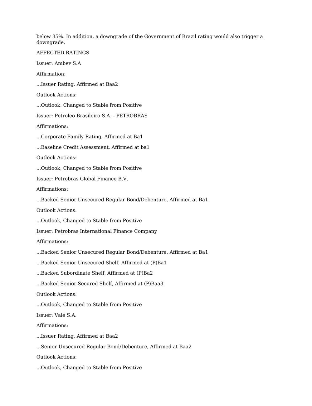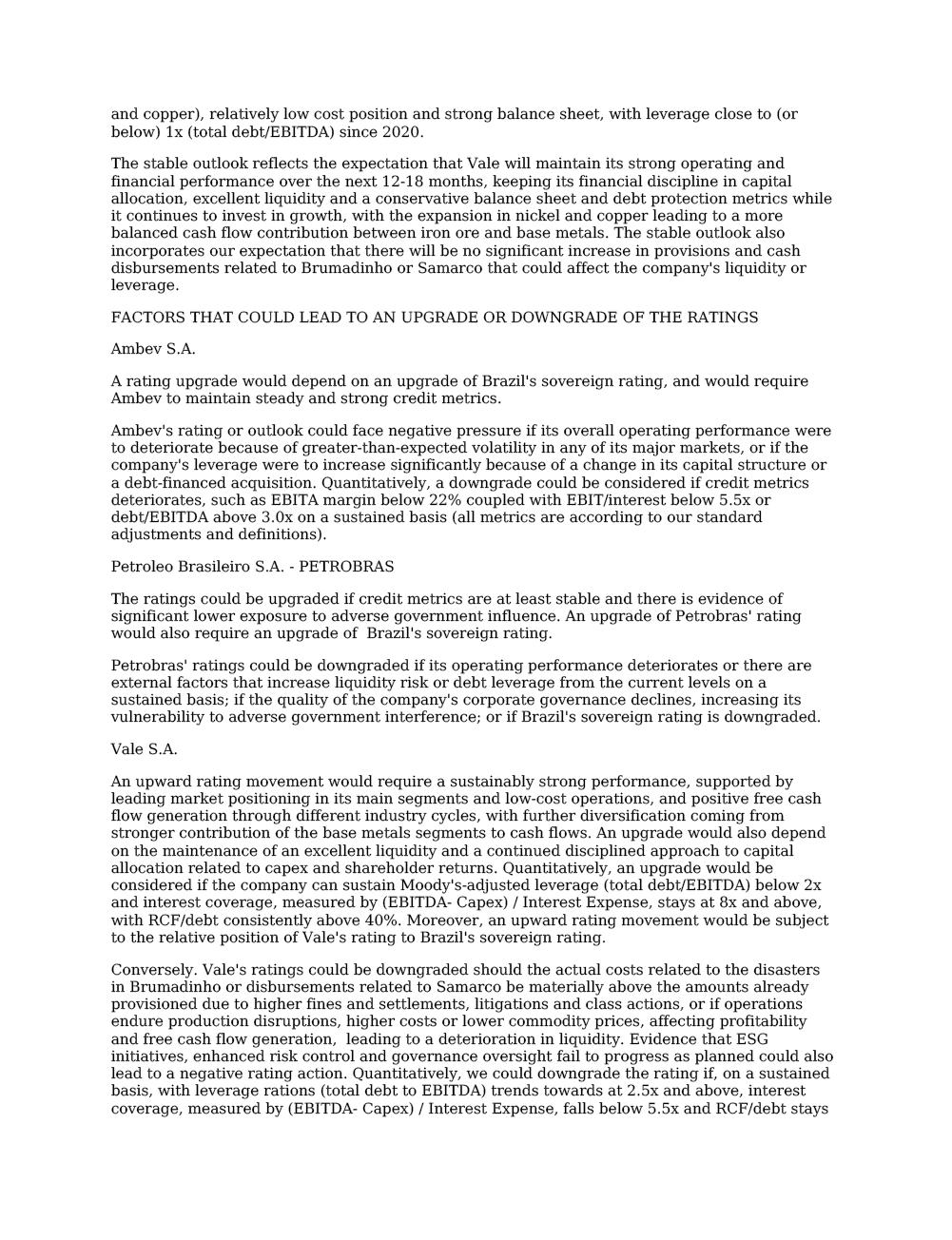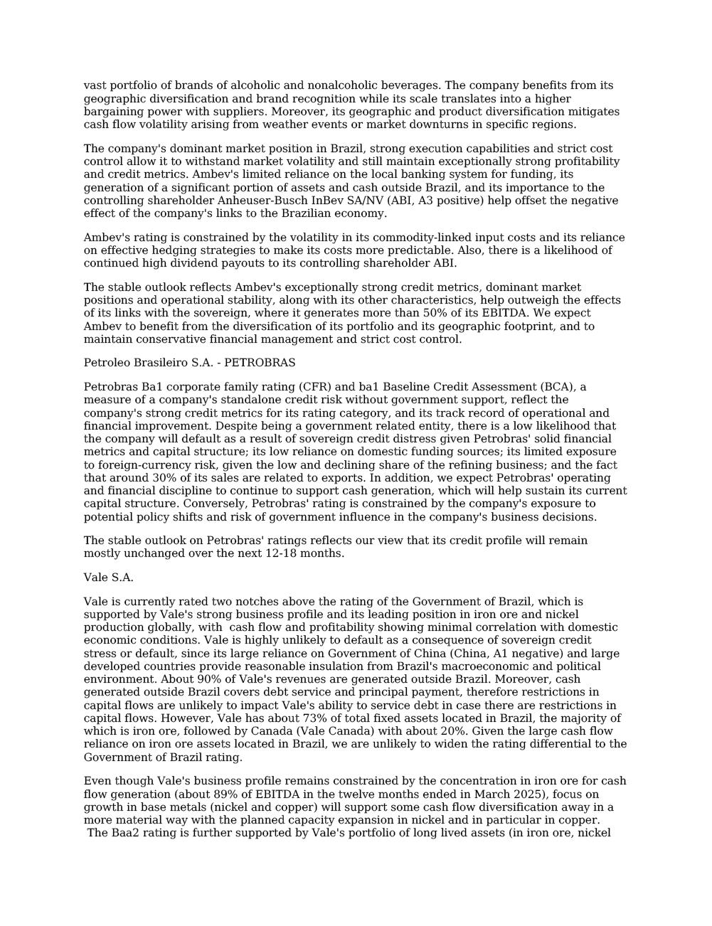 Moody’s updates on Vale’s Credit Ratings Rio de Janeiro, June 2nd, 2025 – Vale S.A. (“Vale”) informs that in a report released today, Moody’s Investor Service (“Moody’s”) has revised Vale’s outlook from positive to stable, keeping the rating at Baa2. The decision reflects the change in the outlook for Brazil's sovereign rating from positive to stable (Ba1 stable). The report is available on Moody's website, and also as an attachment to this communication. A free translation into Portuguese will be released to the market shortly. Marcelo Feriozzi Bacci Executive Vice President, Finance and Investor Relations For further information, please contact: Vale.RI@vale.com Thiago Lofiego: thiago.lofiego@vale.com Mariana Rocha: mariana.rocha@vale.com Luciana Oliveti: luciana.oliveti@vale.com Pedro Terra: pedro.terra@vale.com Patricia Tinoco: patricia.tinoco@vale.com This press release may include statements that present Vale’s expectations about future events or results. All statements, when based upon expectations about the future, involve various risks and uncertainties. Vale cannot guarantee that such statements will prove correct. These risks and uncertainties include factors related to the following: (a) the countries where we operate, especially Brazil and Canada; (b) the global economy; (c) the capital markets; (d) the mining and metals prices and their dependence on global industrial production, which is cyclical by nature; and (e) global competition in the markets in which Vale operates. To obtain further information on factors that may lead to results different from those forecast by Vale, please consult the reports Vale files with the U.S. Securities and Exchange Commission (SEC), the Brazilian Comissão de Valores Mobiliários (CVM) and in particular the factors discussed under “Forward-Looking Statements” and “Risk Factors” in Vale’s annual report on Form 20-F. Rating Action: Moody's Ratings takes action on Brazilian corporates following sovereign rating action 02 Jun 2025 New York, June 02, 2025 -- Moody's Ratings (Moody's) has taken rating actions on certain companies operating in Brazil. The actions follow the affirmation of Government of Brazil's (Brazil) long-term local and foreign currency issuer rating and senior unsecured bond ratings at Ba1, the senior unsecured shelf rating at (P)Ba1 and the change in outlook to stable from positive. The change in Government of Brazil's outlook to stable reflects a tapering of upside credit risks in light of a pronounced deterioration in debt affordability and slower-than-expected progress in addressing spending rigidity and building credibility around fiscal policy, despite adherence to primary balance targets. The government's ability to materially reduce fiscal vulnerabilities and stabilize debt burden in the short run remains constrained by spending rigidity and rising borrowing costs. These challenges offset upside investment and GDP growth potential and continued economic reforms that are broadly supportive of Brazil's credit quality. At Ba1, we now assess the credit risks to be balanced. For further information, refer to the rating action press release: https://ratings.moodys.com/ratings-news/444170. Ambev S.A.'s (Ambev) issuer ratings were affirmed at Baa2. The outlook changed to stable from positive. Petroleo Brasileiro S.A. – PETROBRAS' (Petrobras) Ba1 corporate family rating was affirmed. At the same time, we affirmed Petrobras' ba1 Baseline Credit Assessment (BCA) and the Ba1 rating of the backed senior unsecured debt issuances of Petrobras Global Finance B.V. and Petrobras International Finance Company. We also affirmed the (P)Ba2 backed subordinate shelf rating, the (P)Ba1 backed senior unsecured shelf rating, and (P)Baa3 backed senior secured shelf rating under Petrobras International Finance Company. The outlook for all ratings changed to stable from positive. Vale S.A.'s (Vale) issuer rating and senior unsecured rating, and the backed senior unsecured ratings on the debt issued by Vale Overseas Limited (fully and unconditionally guaranteed by Vale) were affirmed at Baa2. The outlook for Vale S.A. and Vale Overseas Limited changed to stable from positive. RATINGS RATIONALE We view that the ratings of these issuers are constrained by the credit quality of the sovereign environment. The creditworthiness of these companies cannot be completely de-linked from the credit quality of the Brazilian government, and thus their ratings need to closely reflect the risk that they share with the sovereign. We view that there is presently a limit to the rating of certain issuers in relation to the sovereign ratings in line with our methodology "Assessing the Impact of Sovereign Credit Quality on Other Ratings" published on June 20, 2019, and available on https://ratings.moodys.com/rmc-documents/60258. Ambev S.A. Ambev's Baa2 rating is supported by its scale as one of the world's largest brewers; presence in 18 countries; leading positions in most of its operating markets, including Brazil and Canada; and vast portfolio of brands of alcoholic and nonalcoholic beverages. The company benefits from its geographic diversification and brand recognition while its scale translates into a higher bargaining power with suppliers. Moreover, its geographic and product diversification mitigates cash flow volatility arising from weather events or market downturns in specific regions. The company's dominant market position in Brazil, strong execution capabilities and strict cost control allow it to withstand market volatility and still maintain exceptionally strong profitability and credit metrics. Ambev's limited reliance on the local banking system for funding, its generation of a significant portion of assets and cash outside Brazil, and its importance to the controlling shareholder Anheuser-Busch InBev SA/NV (ABI, A3 positive) help offset the negative effect of the company's links to the Brazilian economy. Ambev's rati