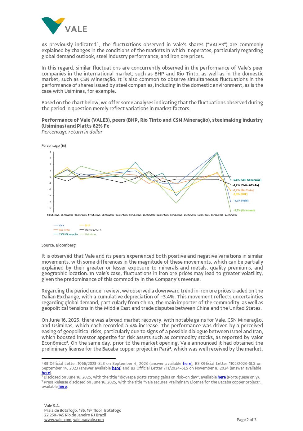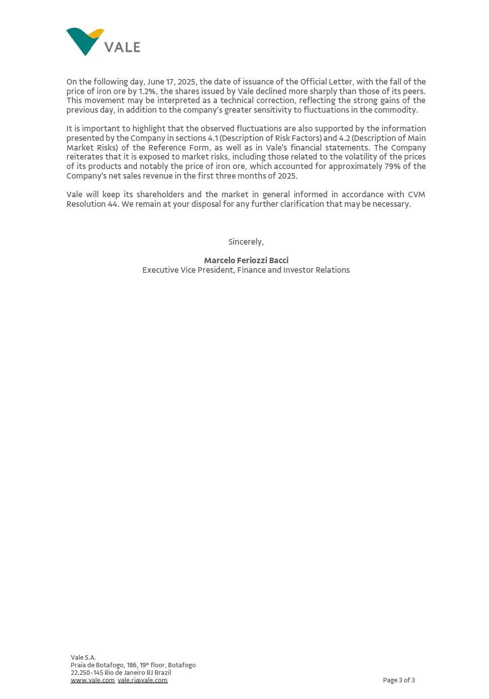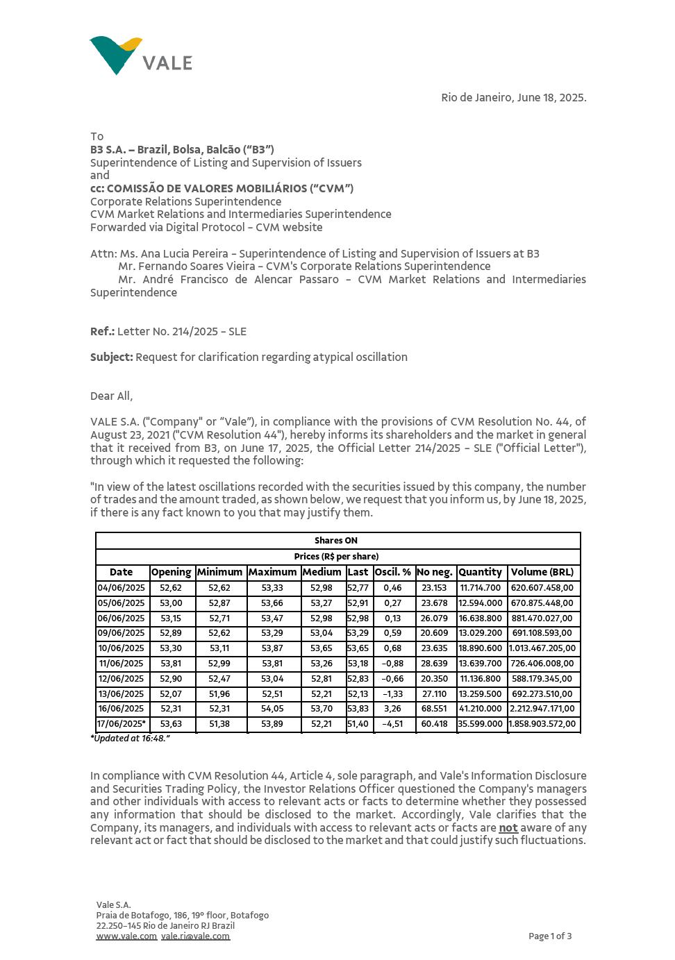 Vale S.A. Praia de Botafogo, 186, 19º floor, Botafogo 22.250-145 Rio de Janeiro RJ Brazil www.vale.com vale.ri@vale.com Page 1 of 3 Rio de Janeiro, June 18, 2025. To B3 S.A. – Brazil, Bolsa, Balcão (“B3”) Superintendence of Listing and Supervision of Issuers and cc: COMISSÃO DE VALORES MOBILIÁRIOS (“CVM”) Corporate Relations Superintendence CVM Market Relations and Intermediaries Superintendence Forwarded via Digital Protocol - CVM website Attn: Ms. Ana Lucia Pereira - Superintendence of Listing and Supervision of Issuers at B3 Mr. Fernando Soares Vieira - CVM's Corporate Relations Superintendence Mr. André Francisco de Alencar Passaro - CVM Market Relations and Intermediaries Superintendence Ref.: Letter No. 214/2025 - SLE Subject: Request for clarification regarding atypical oscillation Dear All, VALE S.A. ("Company" or “Vale”), in compliance with the provisions of CVM Resolution No. 44, of August 23, 2021 ("CVM Resolution 44"), hereby informs its shareholders and the market in general that it received from B3, on June 17, 2025, the Official Letter 214/2025 - SLE ("Official Letter"), through which it requested the following: "In view of the latest oscillations recorded with the securities issued by this company, the number of trades and the amount traded, as shown below, we request that you inform us, by June 18, 2025, if there is any fact known to you that may justify them. Shares ON Prices (R$ per share) Date Opening Minimum Maximum Medium Last Oscil. % No neg. Quantity Volume (BRL) 04/06/2025 52,62 52,62 53,33 52,98 52,77 0,46 23.153 11.714.700 620.607.458,00 05/06/2025 53,00 52,87 53,66 53,27 52,91 0,27 23.678 12.594.000 670.875.448,00 06/06/2025 53,15 52,71 53,47 52,98 52,98 0,13 26.079 16.638.800 881.470.027,00 09/06/2025 52,89 52,62 53,29 53,04 53,29 0,59 20.609 13.029.200 691.108.593,00 10/06/2025 53,30 53,11 53,87 53,65 53,65 0,68 23.635 18.890.600 1.013.467.205,00 11/06/2025 53,81 52,99 53,81 53,26 53,18 -0,88 28.639 13.639.700 726.406.008,00 12/06/2025 52,90 52,47 53,04 52,81 52,83 -0,66 20.350 11.136.800 588.179.345,00 13/06/2025 52,07 51,96 52,51 52,21 52,13 -1,33 27.110 13.259.500 692.273.510,00 16/06/2025 52,31 52,31 54,05 53,70 53,83 3,26 68.551 41.210.000 2.212.947.171,00 17/06/2025* 53,63 51,38 53,89 52,21 51,40 -4,51 60.418 35.599.000 1.858.903.572,00 *Updated at 16:48.” In compliance with CVM Resolution 44, Article 4, sole paragraph, and Vale's Information Disclosure and Securities Trading Policy, the Investor Relations Officer questioned the Company's managers and other individuals with access to relevant acts or facts to determine whether they possessed any information that should be disclosed to the market. Accordingly, Vale clarifies that the Company, its managers, and individuals with access to relevant acts or facts are not aware of any relevant act or fact that should be disclosed to the market and that could justify such fluctuations. Vale S.A. Praia de Botafogo, 186, 19º floor, Botafogo 22.250-145 Rio de Janeiro RJ Brazil www.vale.com vale.ri@vale.com Page 2 of 3 As previously indicated1, the fluctuations observed in Vale’s shares (“VALE3”) are commonly explained by changes in the conditions of the markets in which it operates, particularly regarding global demand outlook, steel industry performance, and iron ore prices. In this regard, similar fluctuations are concurrently observed in the performance of Vale’s peer companies in the international market, such as BHP and Rio Tinto, as well as in the domestic market, such as CSN Mineração. It is also common to observe simultaneous fluctuations in the performance of shares issued by steel companies, including in the domestic environment, as is the case with Usiminas, for example. Based on the chart below, we offer some analyses indicating that the fluctuations observed during the period in question merely reflect variations in market factors. Performance of Vale (VALE3), peers (BHP, Rio Tinto and CSN Mineração), steelmaking industry (Usiminas) and Platts 62% Fe Percentage return in dollar Source: Bloomberg It is observed that Vale and its peers experienced both positive and negative variations in similar movements, with some differences in the magnitude of these movements, which can be partially explained by their greater or lesser exposure to minerals and metals, quality premiums, and geographic location. In Vale’s case, fluctuations in iron ore prices may lead to greater volatility, given the predominance of this commodity in the Company’s revenue. Regarding the period under review, we observed a downward trend in iron ore prices traded on the Dalian Exchange, with a cumulative depreciation of -3.4%. This movement reflects uncertainties regarding global demand, particularly from China, the main importer of the commodity, as well as geopolitical tensions in the Middle East and trade disputes between China and the United States. On June 16, 2025, there was a broad market recovery, with notable gains for Vale, CSN Mineração, and Usiminas, which each recorded a 4% increase. The performance was driven by a perceived easing of geopolitical risks, particularly due to signs of a possible dialogue between Israel and Iran, which boosted investor appetite for risk assets such as commodity stocks, as reported by Valor Econômico2. On the same day, prior to the market opening, Vale announced it had obtained the preliminary license for the Bacaba copper project in Pará3, which was well received by the market. 1 B3 Official Letter 1066/2023-SLS on September 4, 2023 (answer available here), B3 Official Letter 1102/2023-SLS on September 14, 2023 (answer available here) and B3 Official Letter 711/2024-SLS on November 8, 2024 (answer available here). 2 Disclosed on June 16, 2025, with the title “Ibovespa posts strong gains on risk-on day”, available here (Portuguese only). 3 Press Release disclosed on June 16, 2025, with the title “Vale secures Preliminary License for the Bacaba c