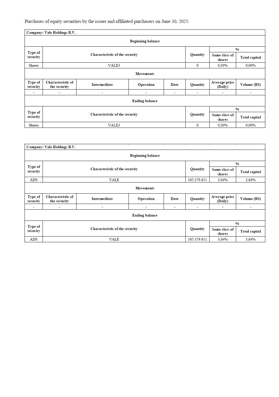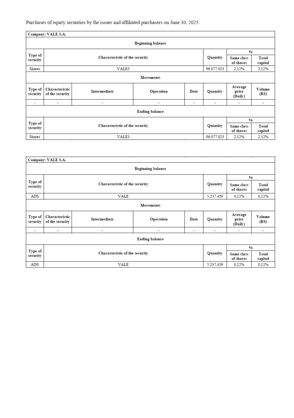 Purchases of equity securities by the issuer and affiliated purchasers on June 30, 2025. Company: VALE S.A. Beginning balance Type of security Characteristic of the security Quantity % Same class of shares Total capital Shares VALE3 96.077.023 2,12% 2,12% Movements Type of security Characteristic of the security Intermediate Operation Date Quantity Average price (Daily) Volume (R$) - - - - - - - - Ending balance Type of security Characteristic of the security Quantity % Same class of shares Total capital Shares VALE3 96.077.023 2,12% 2,12% Company: VALE S.A. Beginning balance Type of security Characteristic of the security Quantity % Same class of shares Total capital ADS VALE 5.237.459 0,12% 0,12% Movements Type of security Characteristic of the security Intermediate Operation Date Quantity Average price (Daily) Volume (R$) - - - - - - - - Ending balance Type of security Characteristic of the security Quantity % Same class of shares Total capital ADS VALE 5.237.459 0,12% 0,12% Purchases of equity securities by the issuer and affiliated purchasers on June 30, 2025. Company: MBR S.A. Beginning balance Type of security Characteristic of the security Quantity % Same class of shares Total capital Shares VALE3 3.534.700 0,08% 0,08% Movements Type of security Characteristic of the security Intermediate Operation Date Quantity Average price (Daily) Volume (R$) - - - - - - - - Ending balance Type of security Characteristic of the security Quantity % Same class of shares Total capital Shares VALE3 3.534.700 0,08% 0,08% Company: MBR S.A. Beginning balance Type of security Characteristic of the security Quantity % Same class of shares Total capital ADS VALE 0 0,00% 0,00% Movements Type of security Characteristic of the security Intermediate Operation Date Quantity Average price (Daily) Volume (R$) - - - - - - - - Ending balance Type of security Characteristic of the security Quantity % Same class of shares Total capital ADS VALE 0 0,00% 0,00% Purchases of equity securities by the issuer and affiliated purchasers on June 30, 2025. Company: Vale Holdings B.V. Beginning balance Type of security Characteristic of the security Quantity % Same class of shares Total capital Shares VALE3 0 0,00% 0,00% Movements Type of security Characteristic of the security Intermediate Operation Date Quantity Average price (Daily) Volume (R$) - - - - - - - - Ending balance Type of security Characteristic of the security Quantity % Same class of shares Total capital Shares VALE3 0 0,00% 0,00% Company: Vale Holdings B.V. Beginning balance Type of security Characteristic of the security Quantity % Same class of shares Total capital ADS VALE 165.379.611 3,64% 3,64% Movements Type of security Characteristic of the security Intermediate Operation Date Quantity Average price (Daily) Volume (R$) - - - - - - - - Ending balance Type of security Characteristic of the security Quantity % Same class of shares Total capital ADS VALE 165.379.611 3,64% 3,64%