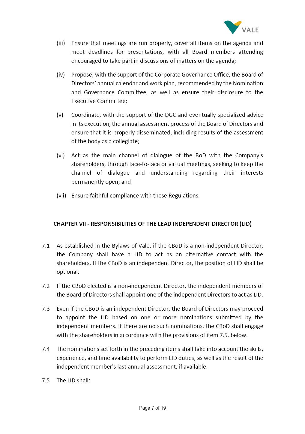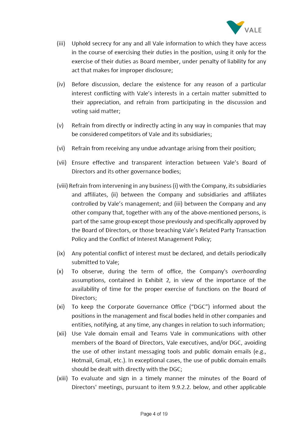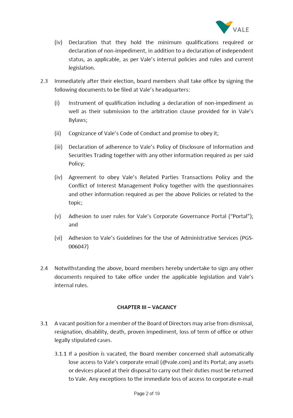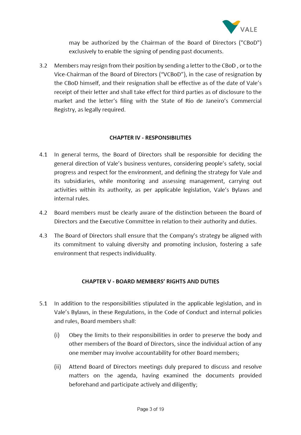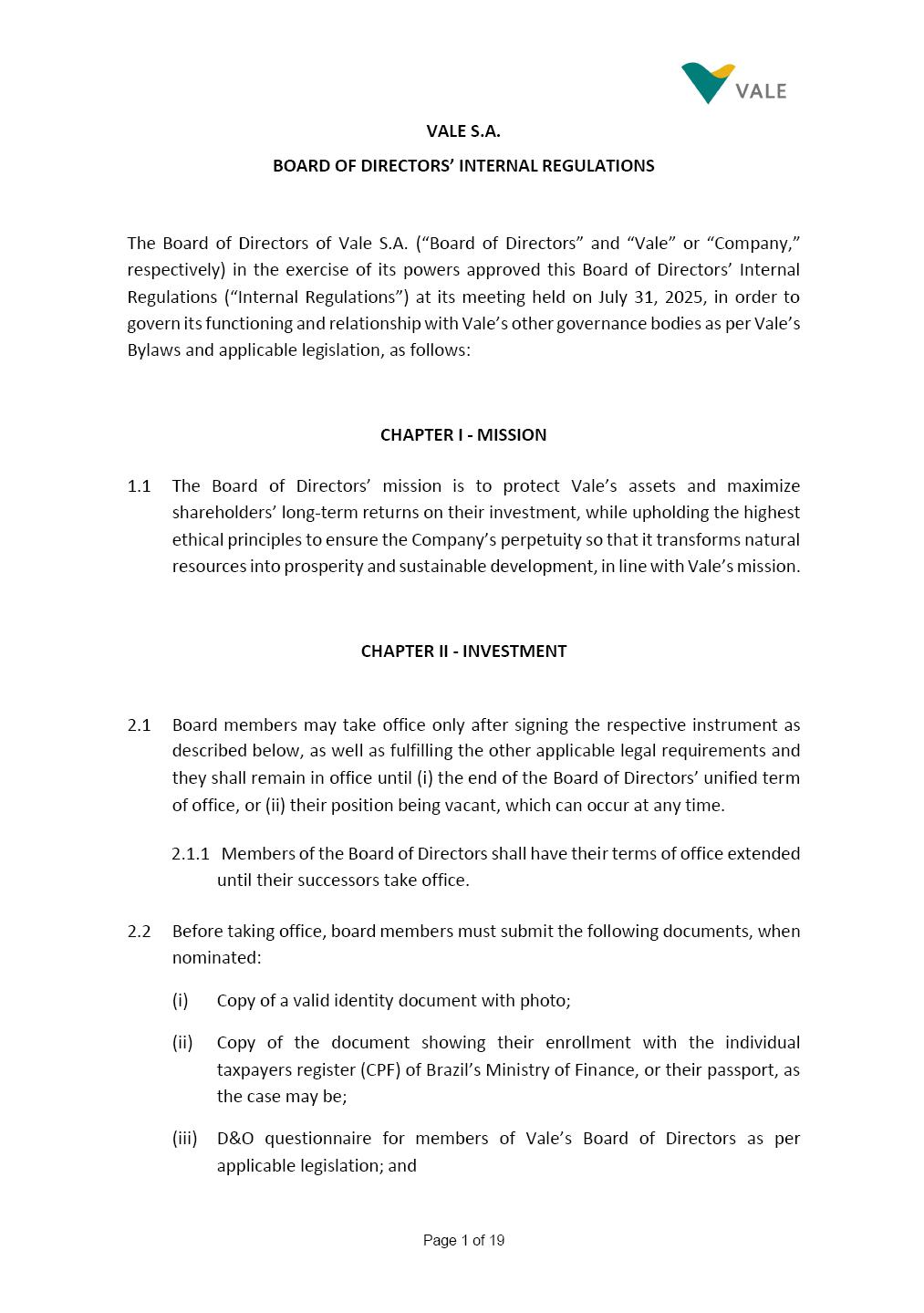 Page 1 of 19 VALE S.A. BOARD OF DIRECTORS’ INTERNAL REGULATIONS The Board of Directors of Vale S.A. (“Board of Directors” and “Vale” or “Company,” respectively) in the exercise of its powers approved this Board of Directors’ Internal Regulations (“Internal Regulations”) at its meeting held on July 31, 2025, in order to govern its functioning and relationship with Vale’s other governance bodies as per Vale’s Bylaws and applicable legislation, as follows: CHAPTER I - MISSION 1.1 The Board of Directors’ mission is to protect Vale’s assets and maximize shareholders’ long-term returns on their investment, while upholding the highest ethical principles to ensure the Company’s perpetuity so that it transforms natural resources into prosperity and sustainable development, in line with Vale’s mission. CHAPTER II - INVESTMENT 2.1 Board members may take office only after signing the respective instrument as described below, as well as fulfilling the other applicable legal requirements and they shall remain in office until (i) the end of the Board of Directors’ unified term of office, or (ii) their position being vacant, which can occur at any time. 2.1.1 Members of the Board of Directors shall have their terms of office extended until their successors take office. 2.2 Before taking office, board members must submit the following documents, when nominated: (i) Copy of a valid identity document with photo; (ii) Copy of the document showing their enrollment with the individual taxpayers register (CPF) of Brazil’s Ministry of Finance, or their passport, as the case may be; (iii) D&O questionnaire for members of Vale’s Board of Directors as per applicable legislation; and Page 2 of 19 (iv) Declaration that they hold the minimum qualifications required or declaration of non-impediment, in addition to a declaration of independent status, as applicable, as per Vale’s internal policies and rules and current legislation. 2.3 Immediately after their election, board members shall take office by signing the following documents to be filed at Vale’s headquarters: (i) Instrument of qualification including a declaration of non-impediment as well as their submission to the arbitration clause provided for in Vale’s Bylaws; (ii) Cognizance of Vale’s Code of Conduct and promise to obey it; (iii) Declaration of adherence to Vale’s Policy of Disclosure of Information and Securities Trading together with any other information required as per said Policy; (iv) Agreement to obey Vale’s Related Parties Transactions Policy and the Conflict of Interest Management Policy together with the questionnaires and other information required as per the above Policies or related to the topic; (v) Adhesion to user rules for Vale’s Corporate Governance Portal (“Portal”); and (vi) Adhesion to Vale’s Guidelines for the Use of Administrative Services (PGS- 006047) 2.4 Notwithstanding the above, board members hereby undertake to sign any other documents required to take office under the applicable legislation and Vale’s internal rules. CHAPTER III – VACANCY 3.1 A vacant position for a member of the Board of Directors may arise from dismissal, resignation, disability, death, proven impediment, loss of term of office or other legally stipulated cases. 3.1.1 If a position is vacated, the Board member concerned shall automatically lose access to Vale’s corporate email (@vale.com) and its Portal; any assets or devices placed at their disposal to carry out their duties must be returned to Vale. Any exceptions to the immediate loss of access to corporate e-mail Page 3 of 19 may be authorized by the Chairman of the Board of Directors ("CBoD") exclusively to enable the signing of pending past documents. 3.2 Members may resign from their position by sending a letter to the CBoD , or to the Vice-Chairman of the Board of Directors (“VCBoD”), in the case of resignation by the CBoD himself, and their resignation shall be effective as of the date of Vale’s receipt of their letter and shall take effect for third parties as of disclosure to the market and the letter’s filing with the State of Rio de Janeiro’s Commercial Registry, as legally required. CHAPTER IV - RESPONSIBILITIES 4.1 In general terms, the Board of Directors shall be responsible for deciding the general direction of Vale’s business ventures, considering people’s safety, social progress and respect for the environment, and defining the strategy for Vale and its subsidiaries, while monitoring and assessing management, carrying out activities within its authority, as per applicable legislation, Vale’s Bylaws and internal rules. 4.2 Board members must be clearly aware of the distinction between the Board of Directors and the Executive Committee in relation to their authority and duties. 4.3 The Board of Directors shall ensure that the Company’s strategy be aligned with its commitment to valuing diversity and promoting inclusion, fostering a safe environment that respects individuality. CHAPTER V - BOARD MEMBERS’ RIGHTS AND DUTIES 5.1 In addition to the responsibilities stipulated in the applicable legislation, and in Vale’s Bylaws, in these Regulations, in the Code of Conduct and internal policies and rules, Board members shall: (i) Obey the limits to their responsibilities in order to preserve the body and other members of the Board of Directors, since the individual action of any one member may involve accountability for other Board members; (ii) Attend Board of Directors meetings duly prepared to discuss and resolve matters on the agenda, having examined the documents provided beforehand and participate actively and diligently; Page 4 of 19 (iii) Uphold secrecy for any and all Vale information to which they have access in the course of exercising their duties in the position, using it only for the exercise of their duties as Board member, under penalty of liability for any act that makes for improper disclo
