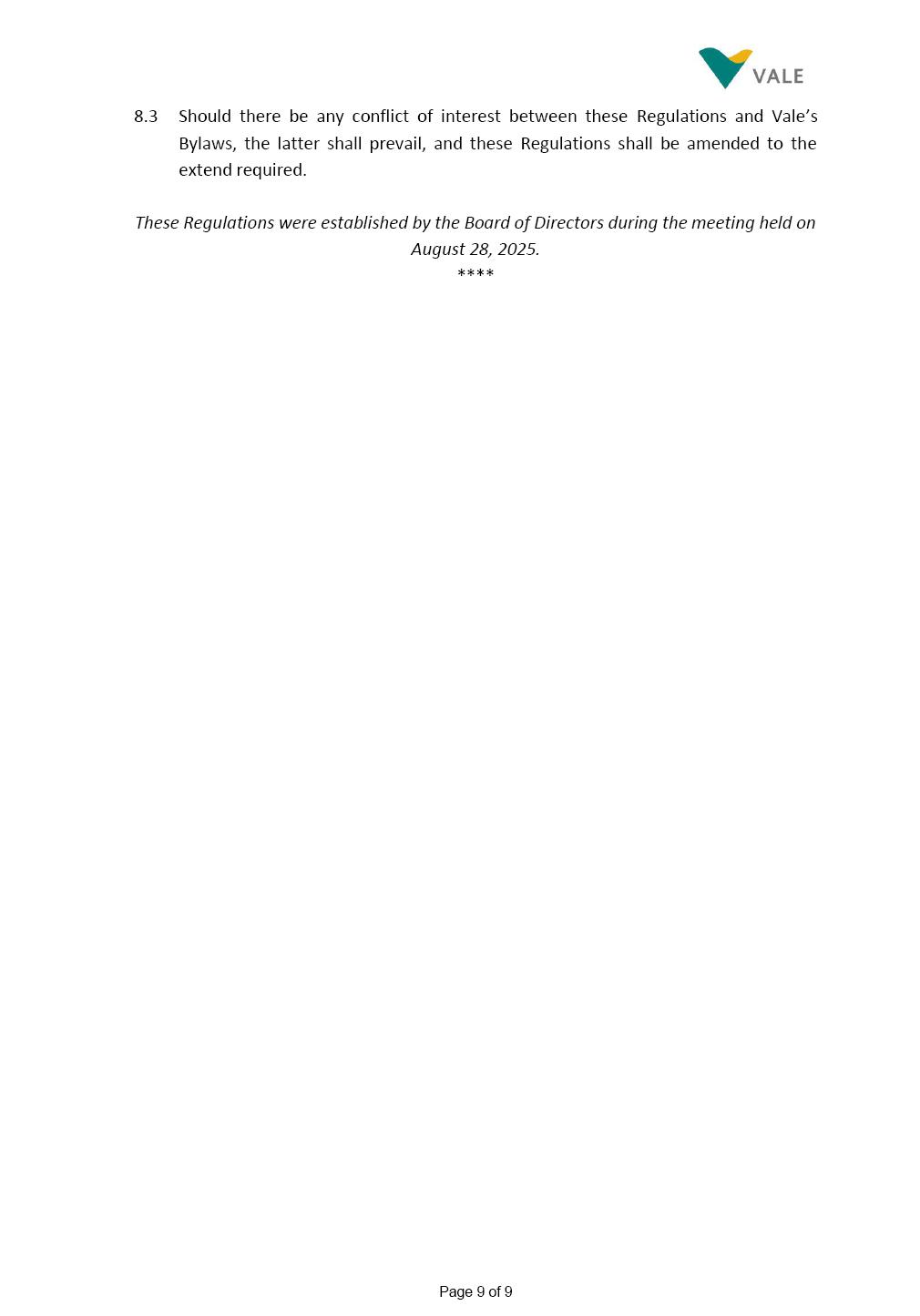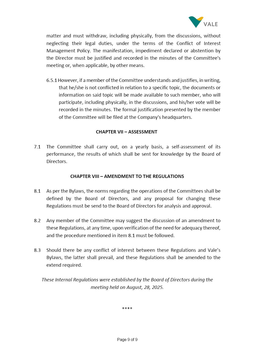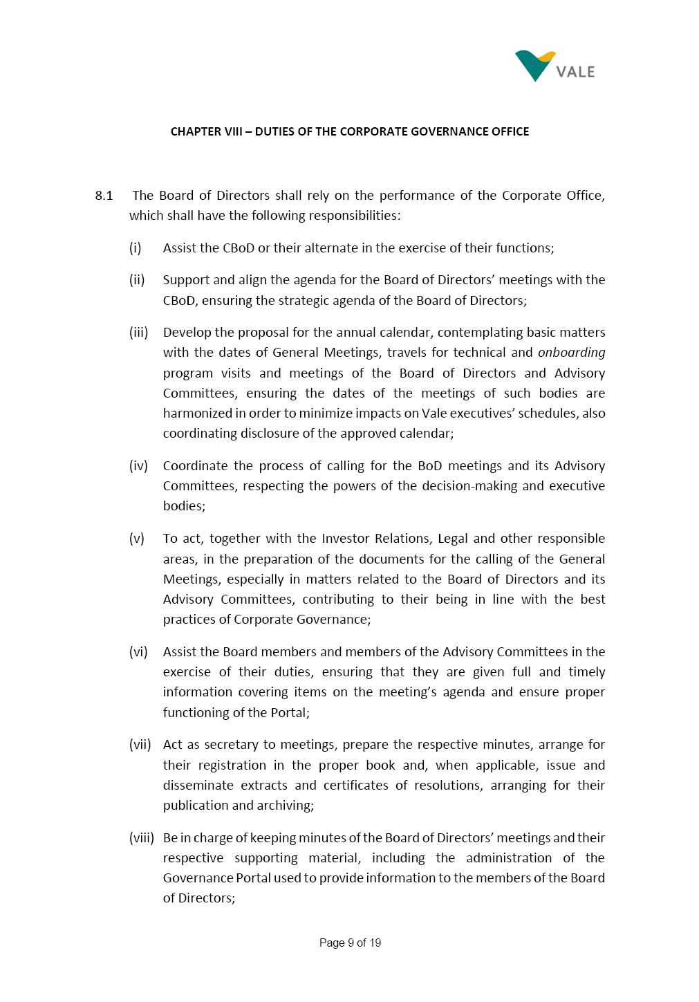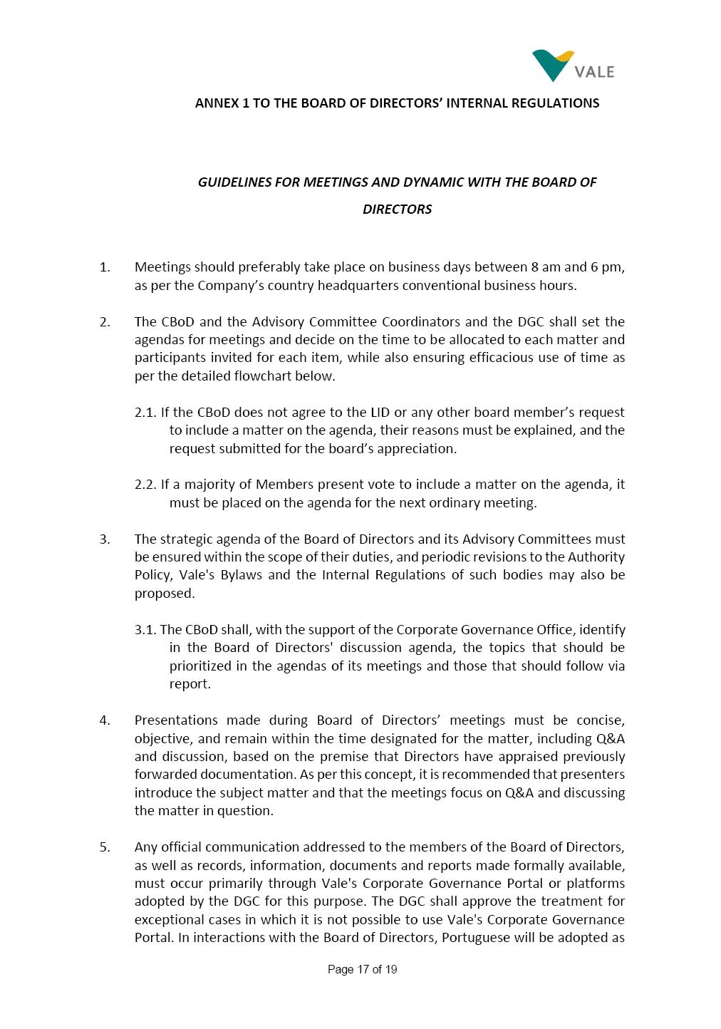 Page 1 of 19 VALE S.A. BOARD OF DIRECTORS’ INTERNAL REGULATIONS The Board of Directors of Vale S.A. (“Board of Directors” and “Vale” or “Company,” respectively) in the exercise of its powers approved this Board of Directors’ Internal Regulations (“Internal Regulations”) at its meeting held on July 31, 2025, in order to govern its functioning and relationship with Vale’s other governance bodies as per Vale’s Bylaws and applicable legislation, as follows: CHAPTER I - MISSION 1.1 The Board of Directors’ mission is to protect Vale’s assets and maximize shareholders’ long-term returns on their investment, while upholding the highest ethical principles to ensure the Company’s perpetuity so that it transforms natural resources into prosperity and sustainable development, in line with Vale’s mission. CHAPTER II - INVESTMENT 2.1 Board members may take office only after signing the respective instrument as described below, as well as fulfilling the other applicable legal requirements and they shall remain in office until (i) the end of the Board of Directors’ unified term of office, or (ii) their position being vacant, which can occur at any time. 2.1.1 Members of the Board of Directors shall have their terms of office extended until their successors take office. 2.2 Before taking office, board members must submit the following documents, when nominated: (i) Copy of a valid identity document with photo; (ii) Copy of the document showing their enrollment with the individual taxpayers register (CPF) of Brazil’s Ministry of Finance, or their passport, as the case may be; (iii) D&O questionnaire for members of Vale’s Board of Directors as per applicable legislation; and Page 2 of 19 (iv) Declaration that they hold the minimum qualifications required or declaration of non-impediment, in addition to a declaration of independent status, as applicable, as per Vale’s internal policies and rules and current legislation. 2.3 Immediately after their election, board members shall take office by signing the following documents to be filed at Vale’s headquarters: (i) Instrument of qualification including a declaration of non-impediment as well as their submission to the arbitration clause provided for in Vale’s Bylaws; (ii) Cognizance of Vale’s Code of Conduct and promise to obey it; (iii) Declaration of adherence to Vale’s Policy of Disclosure of Information and Securities Trading together with any other information required as per said Policy; (iv) Agreement to obey Vale’s Related Parties Transactions Policy and the Conflict of Interest Management Policy together with the questionnaires and other information required as per the above Policies or related to the topic; (v) Adhesion to user rules for Vale’s Corporate Governance Portal (“Portal”); and (vi) Adhesion to Vale’s Guidelines for the Use of Administrative Services (PGS- 006047) 2.4 Notwithstanding the above, board members hereby undertake to sign any other documents required to take office under the applicable legislation and Vale’s internal rules. CHAPTER III – VACANCY 3.1 A vacant position for a member of the Board of Directors may arise from dismissal, resignation, disability, death, proven impediment, loss of term of office or other legally stipulated cases. 3.1.1 If a position is vacated, the Board member concerned shall automatically lose access to Vale’s corporate email (@vale.com) and its Portal; any assets or devices placed at their disposal to carry out their duties must be returned to Vale. Any exceptions to the immediate loss of access to corporate e-mail Page 3 of 19 may be authorized by the Chairman of the Board of Directors ("CBoD") exclusively to enable the signing of pending past documents. 3.2 Members may resign from their position by sending a letter to the CBoD , or to the Vice-Chairman of the Board of Directors (“VCBoD”), in the case of resignation by the CBoD himself, and their resignation shall be effective as of the date of Vale’s receipt of their letter and shall take effect for third parties as of disclosure to the market and the letter’s filing with the State of Rio de Janeiro’s Commercial Registry, as legally required. CHAPTER IV - RESPONSIBILITIES 4.1 In general terms, the Board of Directors shall be responsible for deciding the general direction of Vale’s business ventures, considering people’s safety, social progress and respect for the environment, and defining the strategy for Vale and its subsidiaries, while monitoring and assessing management, carrying out activities within its authority, as per applicable legislation, Vale’s Bylaws and internal rules. 4.2 Board members must be clearly aware of the distinction between the Board of Directors and the Executive Committee in relation to their authority and duties. 4.3 The Board of Directors shall ensure that the Company’s strategy be aligned with its commitment to valuing diversity and promoting inclusion, fostering a safe environment that respects individuality. CHAPTER V - BOARD MEMBERS’ RIGHTS AND DUTIES 5.1 In addition to the responsibilities stipulated in the applicable legislation, and in Vale’s Bylaws, in these Regulations, in the Code of Conduct and internal policies and rules, Board members shall: (i) Obey the limits to their responsibilities in order to preserve the body and other members of the Board of Directors, since the individual action of any one member may involve accountability for other Board members; (ii) Attend Board of Directors meetings duly prepared to discuss and resolve matters on the agenda, having examined the documents provided beforehand and participate actively and diligently; Page 4 of 19 (iii) Uphold secrecy for any and all Vale information to which they have access in the course of exercising their duties in the position, using it only for the exercise of their duties as Board member, under penalty of liability for any act that makes for improper disclo