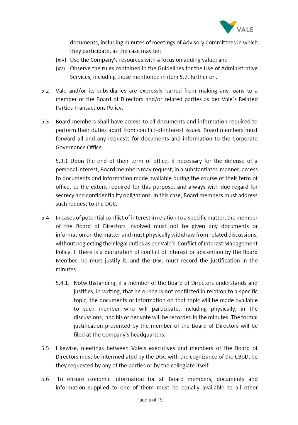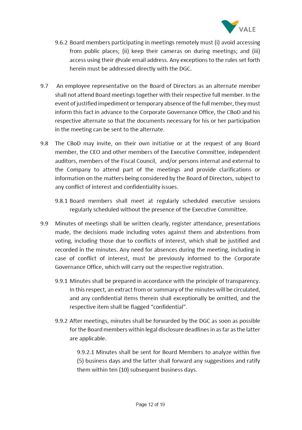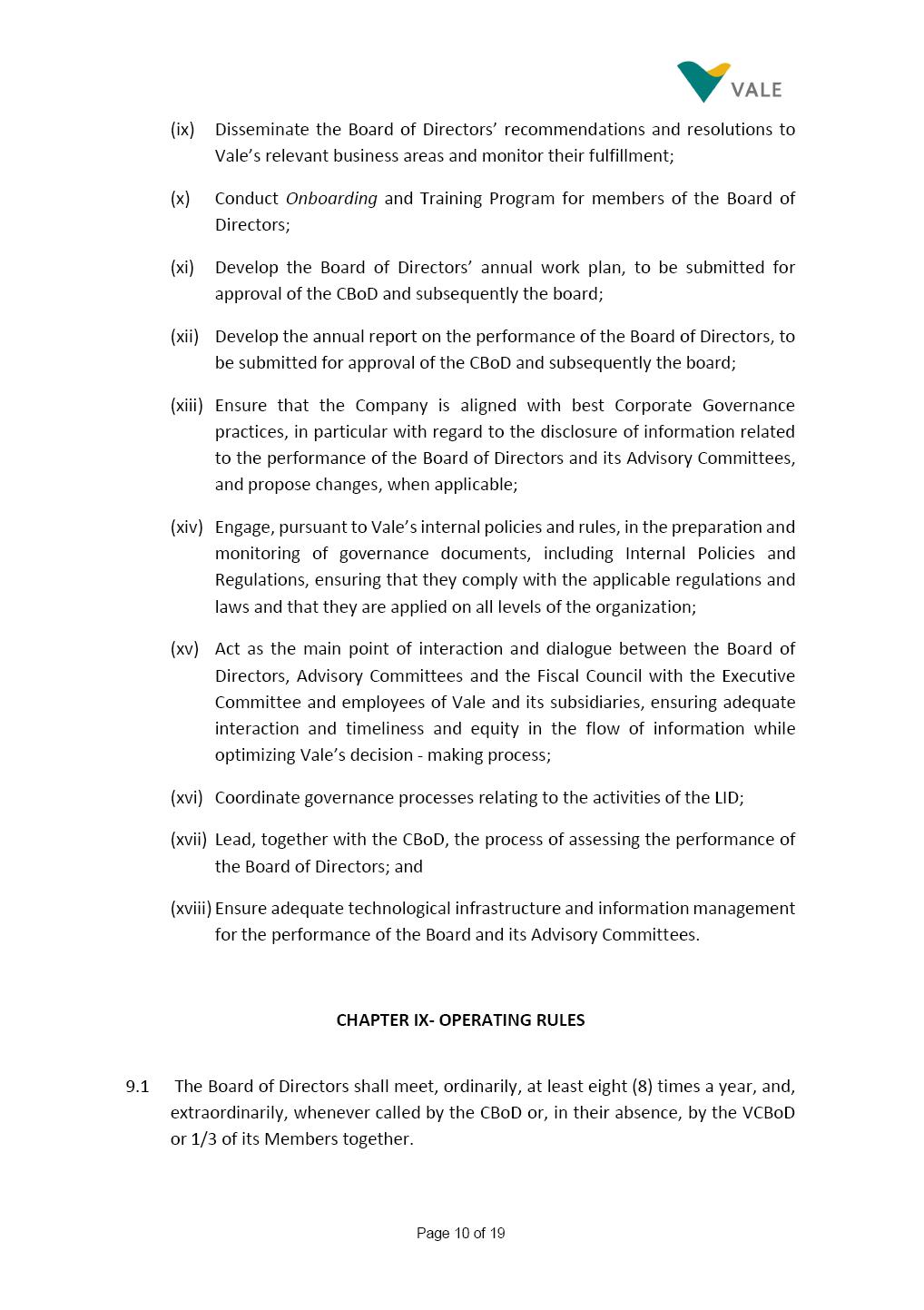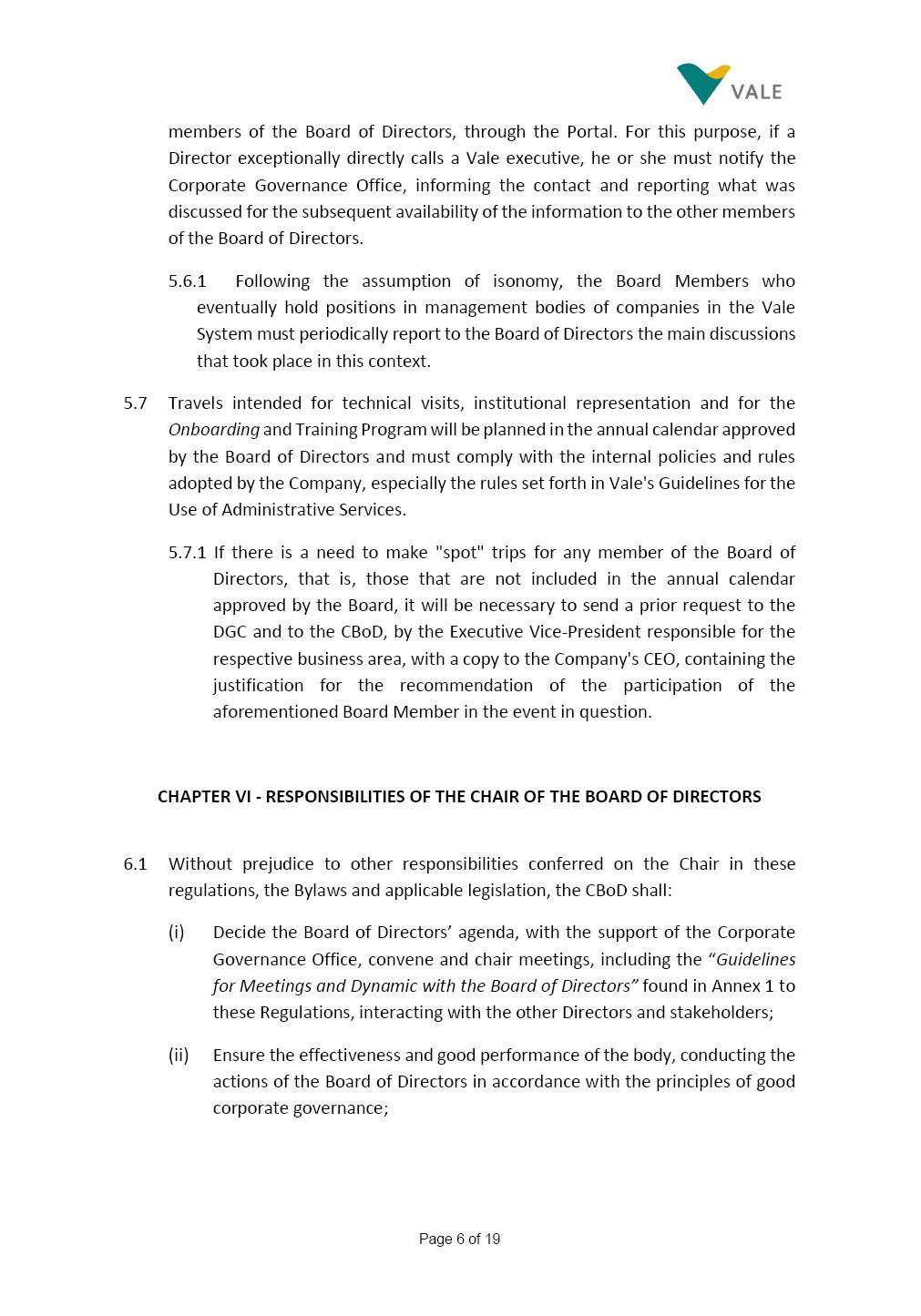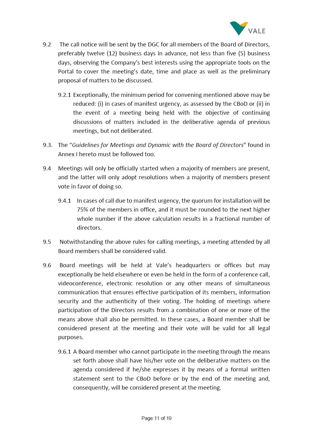 Page 1 of 19 VALE S.A. BOARD OF DIRECTORS’ INTERNAL REGULATIONS The Board of Directors of Vale S.A. (“Board of Directors” and “Vale” or “Company,” respectively) in the exercise of its powers approved this Board of Directors’ Internal Regulations (“Internal Regulations”) at its meeting held on July 31, 2025, in order to govern its functioning and relationship with Vale’s other governance bodies as per Vale’s Bylaws and applicable legislation, as follows: CHAPTER I - MISSION 1.1 The Board of Directors’ mission is to protect Vale’s assets and maximize shareholders’ long-term returns on their investment, while upholding the highest ethical principles to ensure the Company’s perpetuity so that it transforms natural resources into prosperity and sustainable development, in line with Vale’s mission. CHAPTER II - INVESTMENT 2.1 Board members may take office only after signing the respective instrument as described below, as well as fulfilling the other applicable legal requirements and they shall remain in office until (i) the end of the Board of Directors’ unified term of office, or (ii) their position being vacant, which can occur at any time. 2.1.1 Members of the Board of Directors shall have their terms of office extended until their successors take office. 2.2 Before taking office, board members must submit the following documents, when nominated: (i) Copy of a valid identity document with photo; (ii) Copy of the document showing their enrollment with the individual taxpayers register (CPF) of Brazil’s Ministry of Finance, or their passport, as the case may be; (iii) D&O questionnaire for members of Vale’s Board of Directors as per applicable legislation; and Page 2 of 19 (iv) Declaration that they hold the minimum qualifications required or declaration of non-impediment, in addition to a declaration of independent status, as applicable, as per Vale’s internal policies and rules and current legislation. 2.3 Immediately after their election, board members shall take office by signing the following documents to be filed at Vale’s headquarters: (i) Instrument of qualification including a declaration of non-impediment as well as their submission to the arbitration clause provided for in Vale’s Bylaws; (ii) Cognizance of Vale’s Code of Conduct and promise to obey it; (iii) Declaration of adherence to Vale’s Policy of Disclosure of Information and Securities Trading together with any other information required as per said Policy; (iv) Agreement to obey Vale’s Related Parties Transactions Policy and the Conflict of Interest Management Policy together with the questionnaires and other information required as per the above Policies or related to the topic; (v) Adhesion to user rules for Vale’s Corporate Governance Portal (“Portal”); and (vi) Adhesion to Vale’s Guidelines for the Use of Administrative Services (PGS- 006047) 2.4 Notwithstanding the above, board members hereby undertake to sign any other documents required to take office under the applicable legislation and Vale’s internal rules. CHAPTER III – VACANCY 3.1 A vacant position for a member of the Board of Directors may arise from dismissal, resignation, disability, death, proven impediment, loss of term of office or other legally stipulated cases. 3.1.1 If a position is vacated, the Board member concerned shall automatically lose access to Vale’s corporate email (@vale.com) and its Portal; any assets or devices placed at their disposal to carry out their duties must be returned to Vale. Any exceptions to the immediate loss of access to corporate e-mail Page 3 of 19 may be authorized by the Chairman of the Board of Directors ("CBoD") exclusively to enable the signing of pending past documents. 3.2 Members may resign from their position by sending a letter to the CBoD , or to the Vice-Chairman of the Board of Directors (“VCBoD”), in the case of resignation by the CBoD himself, and their resignation shall be effective as of the date of Vale’s receipt of their letter and shall take effect for third parties as of disclosure to the market and the letter’s filing with the State of Rio de Janeiro’s Commercial Registry, as legally required. CHAPTER IV - RESPONSIBILITIES 4.1 In general terms, the Board of Directors shall be responsible for deciding the general direction of Vale’s business ventures, considering people’s safety, social progress and respect for the environment, and defining the strategy for Vale and its subsidiaries, while monitoring and assessing management, carrying out activities within its authority, as per applicable legislation, Vale’s Bylaws and internal rules. 4.2 Board members must be clearly aware of the distinction between the Board of Directors and the Executive Committee in relation to their authority and duties. 4.3 The Board of Directors shall ensure that the Company’s strategy be aligned with its commitment to valuing diversity and promoting inclusion, fostering a safe environment that respects individuality. CHAPTER V - BOARD MEMBERS’ RIGHTS AND DUTIES 5.1 In addition to the responsibilities stipulated in the applicable legislation, and in Vale’s Bylaws, in these Regulations, in the Code of Conduct and internal policies and rules, Board members shall: (i) Obey the limits to their responsibilities in order to preserve the body and other members of the Board of Directors, since the individual action of any one member may involve accountability for other Board members; (ii) Attend Board of Directors meetings duly prepared to discuss and resolve matters on the agenda, having examined the documents provided beforehand and participate actively and diligently; Page 4 of 19 (iii) Uphold secrecy for any and all Vale information to which they have access in the course of exercising their duties in the position, using it only for the exercise of their duties as Board member, under penalty of liability for any act that makes for improper disclo