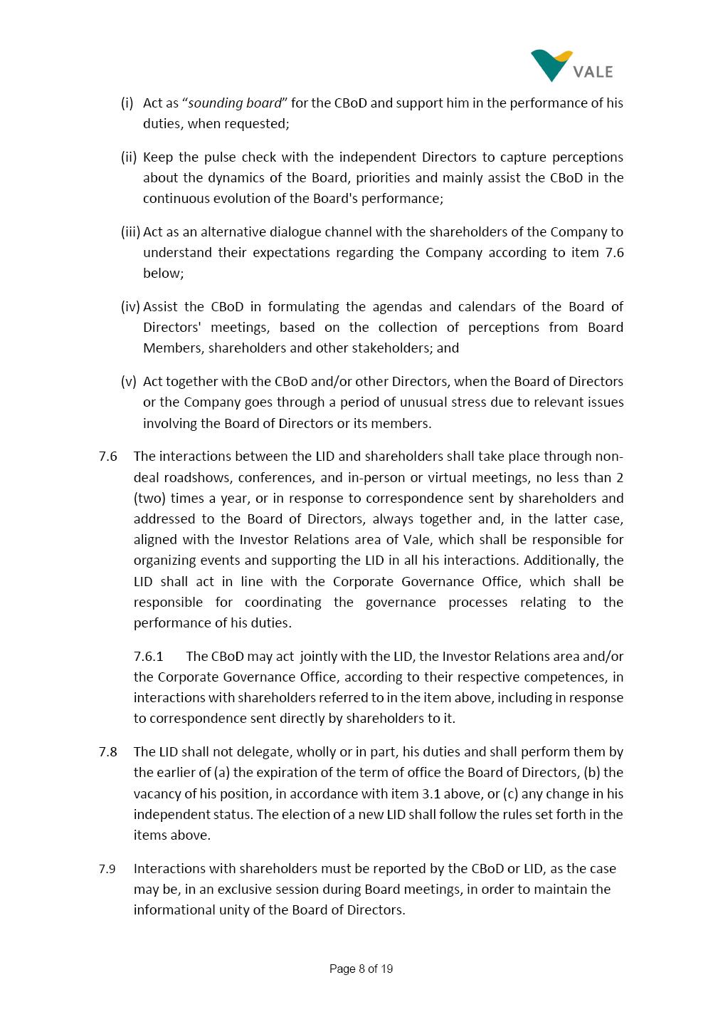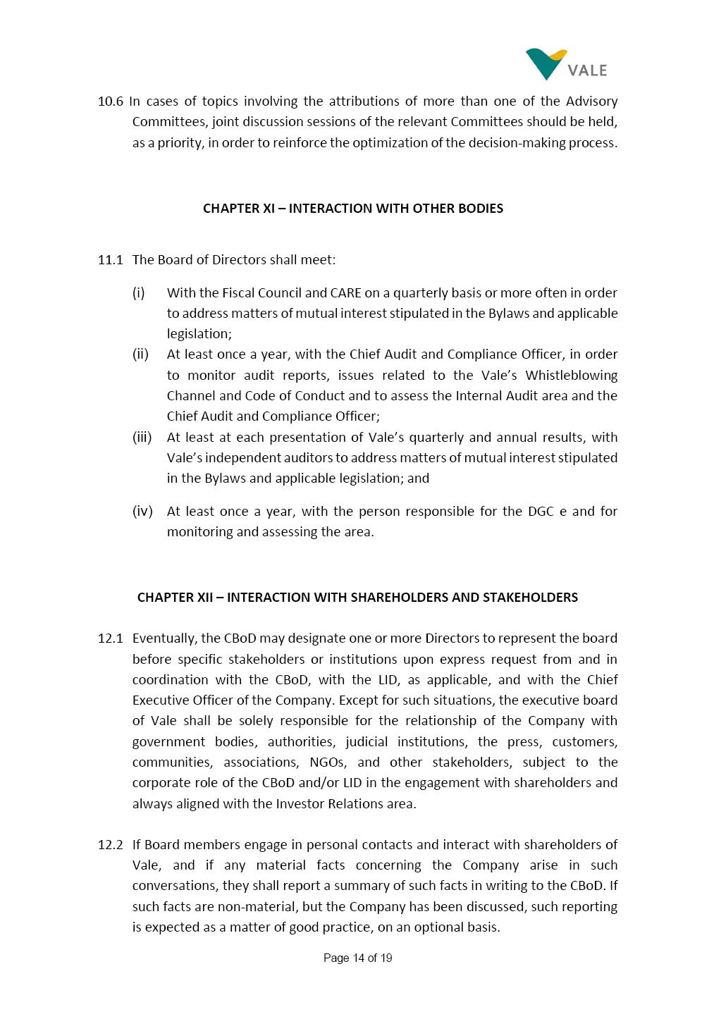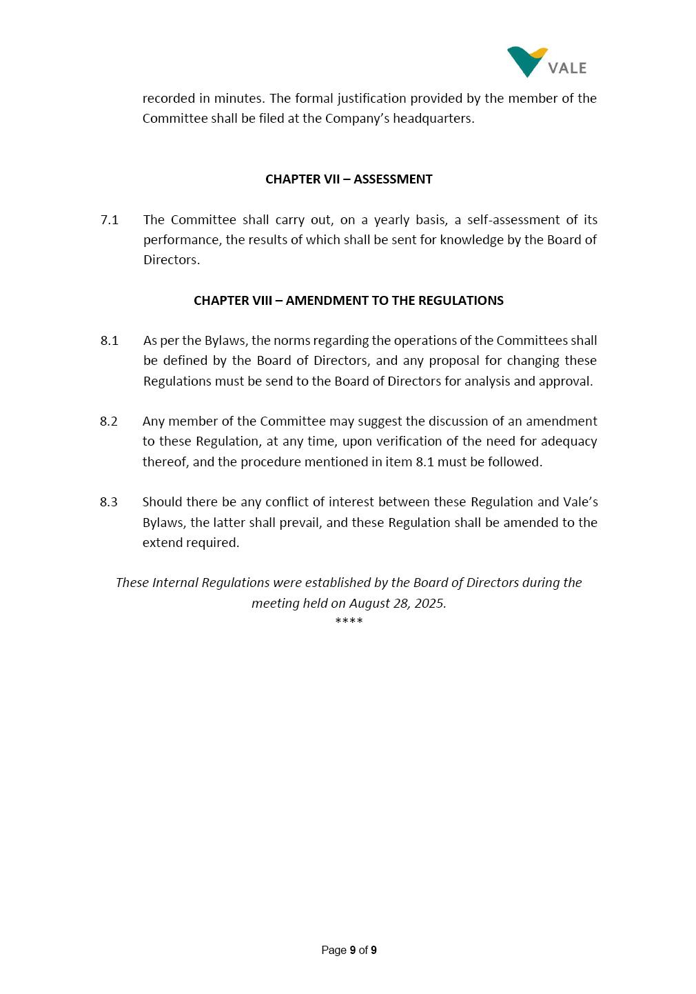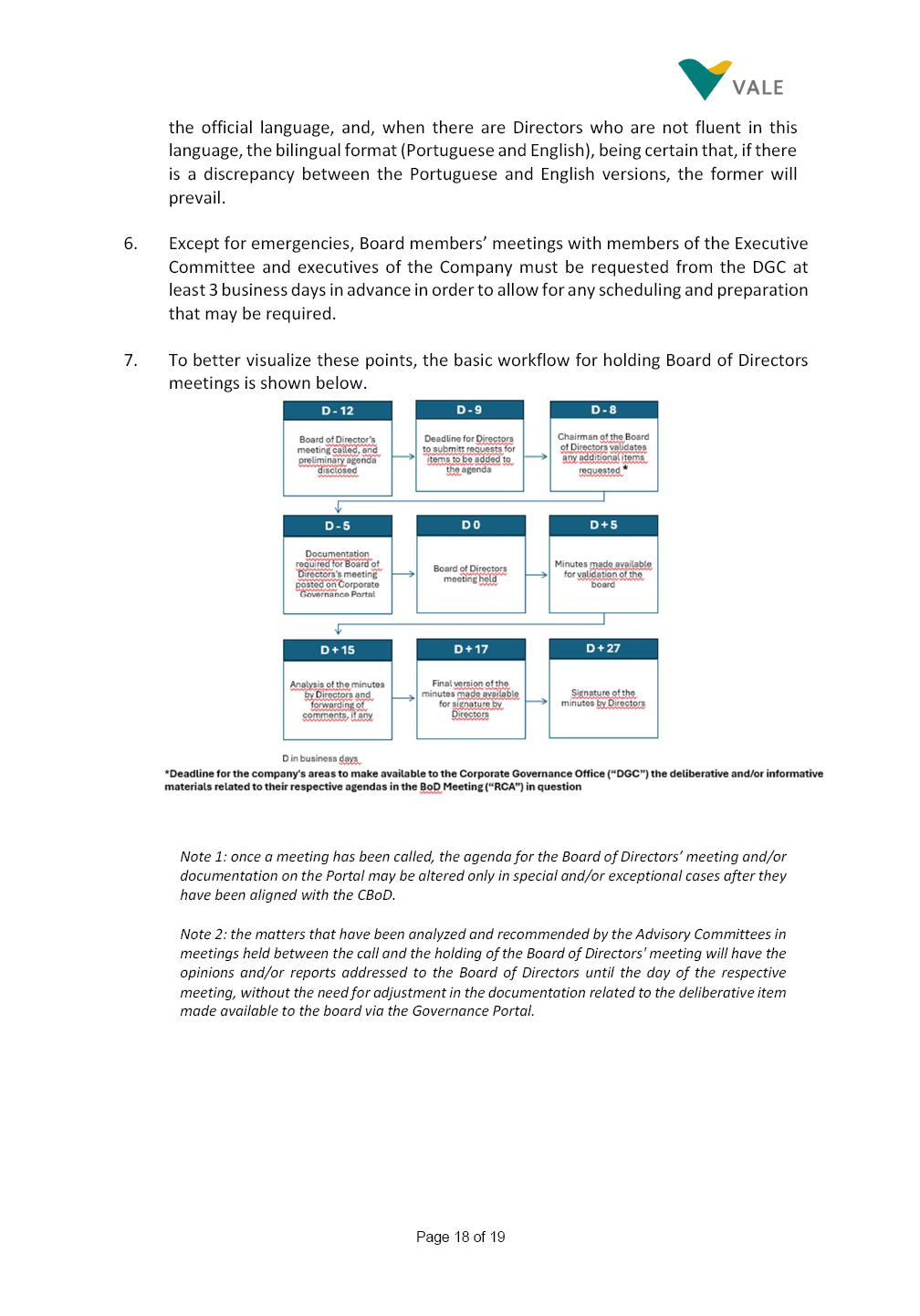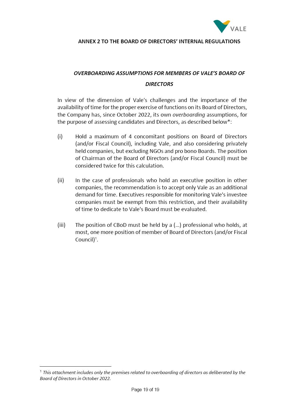 Page 1 of 19 VALE S.A. BOARD OF DIRECTORS’ INTERNAL REGULATIONS The Board of Directors of Vale S.A. (“Board of Directors” and “Vale” or “Company,” respectively) in the exercise of its powers approved this Board of Directors’ Internal Regulations (“Internal Regulations”) at its meeting held on July 31, 2025, in order to govern its functioning and relationship with Vale’s other governance bodies as per Vale’s Bylaws and applicable legislation, as follows: CHAPTER I - MISSION 1.1 The Board of Directors’ mission is to protect Vale’s assets and maximize shareholders’ long-term returns on their investment, while upholding the highest ethical principles to ensure the Company’s perpetuity so that it transforms natural resources into prosperity and sustainable development, in line with Vale’s mission. CHAPTER II - INVESTMENT 2.1 Board members may take office only after signing the respective instrument as described below, as well as fulfilling the other applicable legal requirements and they shall remain in office until (i) the end of the Board of Directors’ unified term of office, or (ii) their position being vacant, which can occur at any time. 2.1.1 Members of the Board of Directors shall have their terms of office extended until their successors take office. 2.2 Before taking office, board members must submit the following documents, when nominated: (i) Copy of a valid identity document with photo; (ii) Copy of the document showing their enrollment with the individual taxpayers register (CPF) of Brazil’s Ministry of Finance, or their passport, as the case may be; (iii) D&O questionnaire for members of Vale’s Board of Directors as per applicable legislation; and Page 2 of 19 (iv) Declaration that they hold the minimum qualifications required or declaration of non-impediment, in addition to a declaration of independent status, as applicable, as per Vale’s internal policies and rules and current legislation. 2.3 Immediately after their election, board members shall take office by signing the following documents to be filed at Vale’s headquarters: (i) Instrument of qualification including a declaration of non-impediment as well as their submission to the arbitration clause provided for in Vale’s Bylaws; (ii) Cognizance of Vale’s Code of Conduct and promise to obey it; (iii) Declaration of adherence to Vale’s Policy of Disclosure of Information and Securities Trading together with any other information required as per said Policy; (iv) Agreement to obey Vale’s Related Parties Transactions Policy and the Conflict of Interest Management Policy together with the questionnaires and other information required as per the above Policies or related to the topic; (v) Adhesion to user rules for Vale’s Corporate Governance Portal (“Portal”); and (vi) Adhesion to Vale’s Guidelines for the Use of Administrative Services (PGS- 006047) 2.4 Notwithstanding the above, board members hereby undertake to sign any other documents required to take office under the applicable legislation and Vale’s internal rules. CHAPTER III – VACANCY 3.1 A vacant position for a member of the Board of Directors may arise from dismissal, resignation, disability, death, proven impediment, loss of term of office or other legally stipulated cases. 3.1.1 If a position is vacated, the Board member concerned shall automatically lose access to Vale’s corporate email (@vale.com) and its Portal; any assets or devices placed at their disposal to carry out their duties must be returned to Vale. Any exceptions to the immediate loss of access to corporate e-mail Page 3 of 19 may be authorized by the Chairman of the Board of Directors ("CBoD") exclusively to enable the signing of pending past documents. 3.2 Members may resign from their position by sending a letter to the CBoD , or to the Vice-Chairman of the Board of Directors (“VCBoD”), in the case of resignation by the CBoD himself, and their resignation shall be effective as of the date of Vale’s receipt of their letter and shall take effect for third parties as of disclosure to the market and the letter’s filing with the State of Rio de Janeiro’s Commercial Registry, as legally required. CHAPTER IV - RESPONSIBILITIES 4.1 In general terms, the Board of Directors shall be responsible for deciding the general direction of Vale’s business ventures, considering people’s safety, social progress and respect for the environment, and defining the strategy for Vale and its subsidiaries, while monitoring and assessing management, carrying out activities within its authority, as per applicable legislation, Vale’s Bylaws and internal rules. 4.2 Board members must be clearly aware of the distinction between the Board of Directors and the Executive Committee in relation to their authority and duties. 4.3 The Board of Directors shall ensure that the Company’s strategy be aligned with its commitment to valuing diversity and promoting inclusion, fostering a safe environment that respects individuality. CHAPTER V - BOARD MEMBERS’ RIGHTS AND DUTIES 5.1 In addition to the responsibilities stipulated in the applicable legislation, and in Vale’s Bylaws, in these Regulations, in the Code of Conduct and internal policies and rules, Board members shall: (i) Obey the limits to their responsibilities in order to preserve the body and other members of the Board of Directors, since the individual action of any one member may involve accountability for other Board members; (ii) Attend Board of Directors meetings duly prepared to discuss and resolve matters on the agenda, having examined the documents provided beforehand and participate actively and diligently; Page 4 of 19 (iii) Uphold secrecy for any and all Vale information to which they have access in the course of exercising their duties in the position, using it only for the exercise of their duties as Board member, under penalty of liability for any act that makes for improper disclo