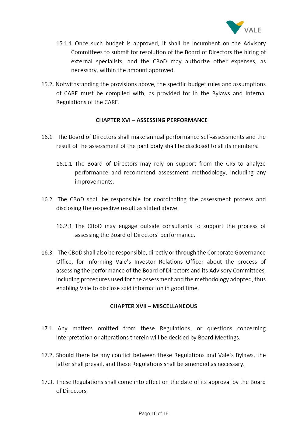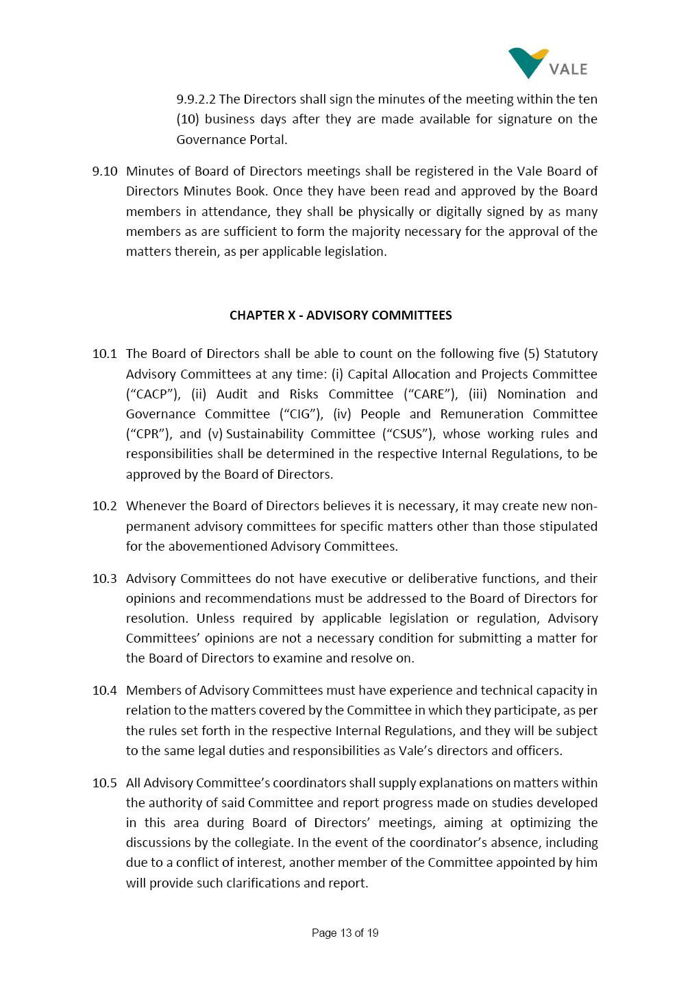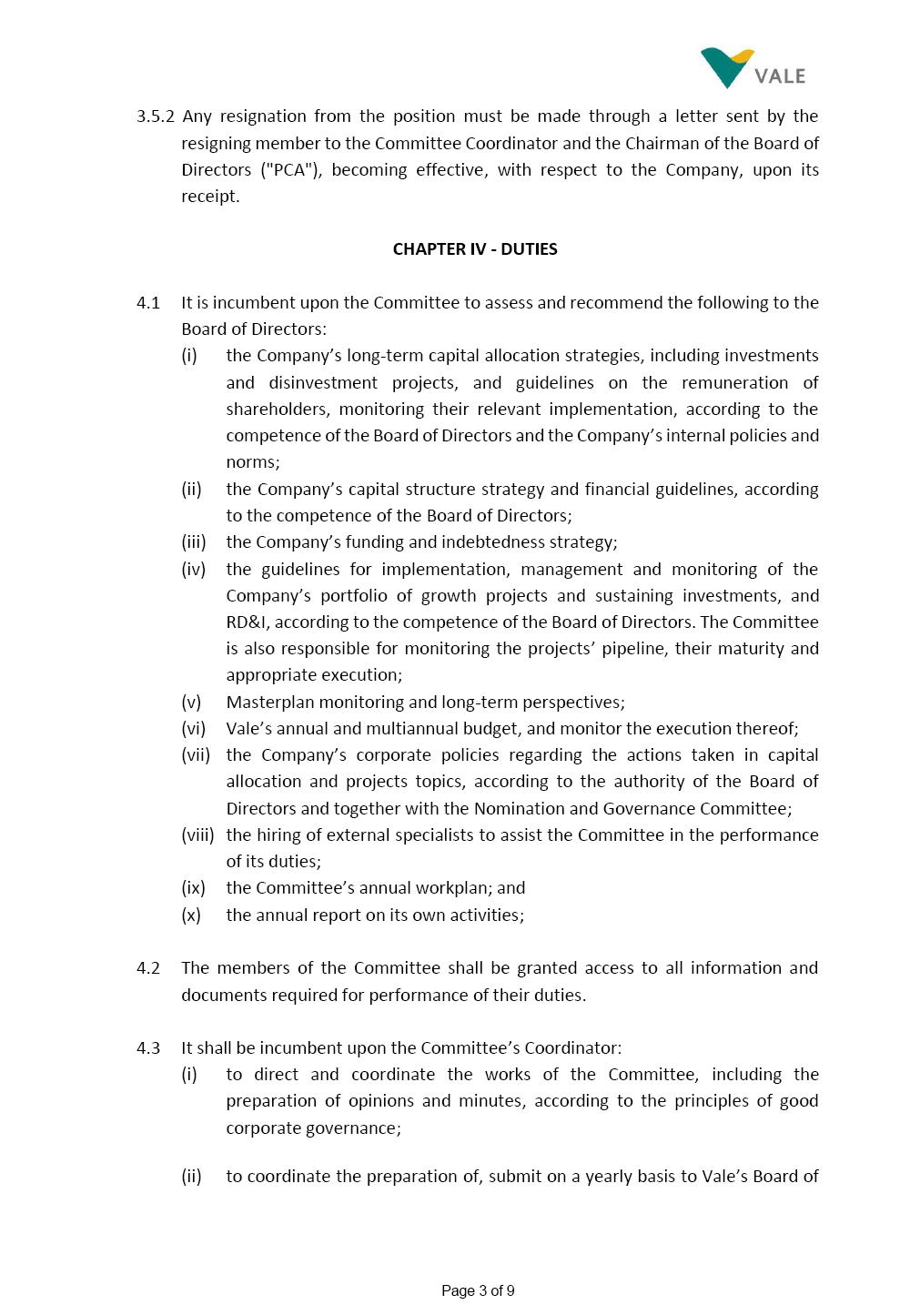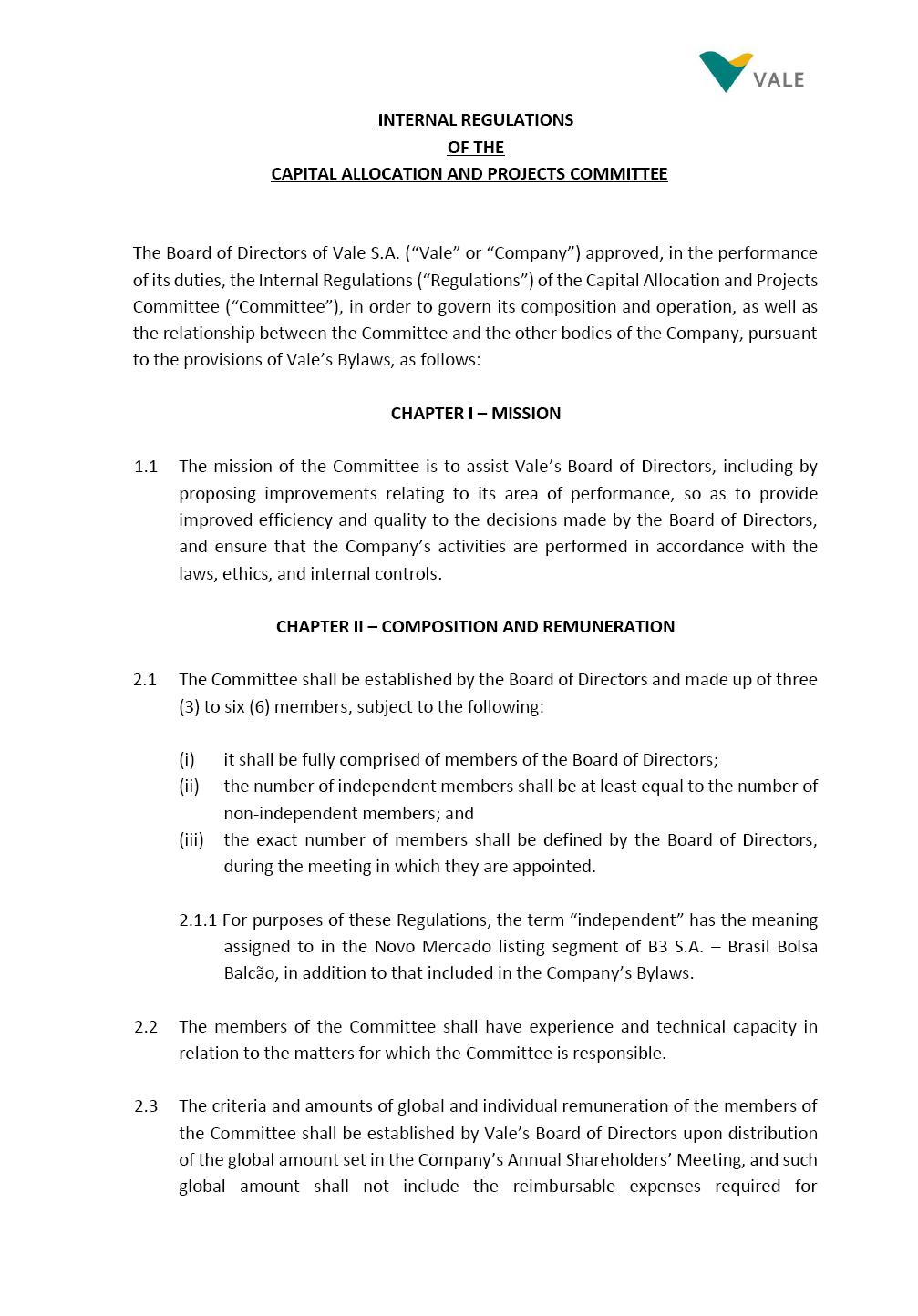 INTERNAL REGULATIONS OF THE CAPITAL ALLOCATION AND PROJECTS COMMITTEE The Board of Directors of Vale S.A. (“Vale” or “Company”) approved, in the performance of its duties, the Internal Regulations (“Regulations”) of the Capital Allocation and Projects Committee (“Committee”), in order to govern its composition and operation, as well as the relationship between the Committee and the other bodies of the Company, pursuant to the provisions of Vale’s Bylaws, as follows: CHAPTER I – MISSION 1.1 The mission of the Committee is to assist Vale’s Board of Directors, including by proposing improvements relating to its area of performance, so as to provide improved efficiency and quality to the decisions made by the Board of Directors, and ensure that the Company’s activities are performed in accordance with the laws, ethics, and internal controls. CHAPTER II – COMPOSITION AND REMUNERATION 2.1 The Committee shall be established by the Board of Directors and made up of three (3) to six (6) members, subject to the following: (i) it shall be fully comprised of members of the Board of Directors; (ii) the number of independent members shall be at least equal to the number of non-independent members; and (iii) the exact number of members shall be defined by the Board of Directors, during the meeting in which they are appointed. 2.1.1 For purposes of these Regulations, the term “independent” has the meaning assigned to in the Novo Mercado listing segment of B3 S.A. – Brasil Bolsa Balcão, in addition to that included in the Company’s Bylaws. 2.2 The members of the Committee shall have experience and technical capacity in relation to the matters for which the Committee is responsible. 2.3 The criteria and amounts of global and individual remuneration of the members of the Committee shall be established by Vale’s Board of Directors upon distribution of the global amount set in the Company’s Annual Shareholders’ Meeting, and such global amount shall not include the reimbursable expenses required for Page 2 of 9 performance of their duties. The remuneration of Committee members shall consider their responsibilities and the time dedicated to their functions, in line with market practices. 2.4 The members of the Committee shall be reimbursed for the travel, meals, and lodging expenses required for performance of their duties, subject to the internal norms and policies adopted by Vale. CHAPTER III - MANAGEMENT 3.1 The term of management of the members of the Committee shall commence as from the signature of the relevant instrument of investiture and be effective until (i) the end of the unified term of management of the members of Vale’s Board of Directors, or (ii) their removal from office by the Board of Directors, or resignation, which may occur at any time. 3.2 Upon lapse of the term of management of the members of the Committee, they may be reinstated through a new nomination by the Board of Directors. 3.3 The Coordinator of the Committee shall be chosen by the Board of Directors itself, it being understood that, in the event of his/her absence, the Coordinator him/herself shall be responsible for appointing his/her deputy among the other members, as well as the relevant period of replacement. 3.3.1 Should the Coordinator not exercise the prerogative above, the other members shall be responsible for appointing, among those who are present at the meeting, the person that shall take over the function of Coordinator of the Committee. 3.4 The members of the Committee shall not have deputies. 3.5 In the case of vacancy or removal of Committee members, including its Coordinator, by the Board of Directors, it shall appoint a deputy member to complete the remaining management term of the replaced member, and this measure shall be permitted if the minimum composition is maintained according to item 2.1. 3.5.1 A vacancy in a Committee member position may occur due to dismissal, resignation, invalidity, death, proven impediment, loss of the mandate as a Board Member, or as a result of other situations provided for by law. Page 3 of 9 3.5.2 Any resignation from the position must be made through a letter sent by the resigning member to the Committee Coordinator and the Chairman of the Board of Directors ("PCA"), becoming effective, with respect to the Company, upon its receipt. CHAPTER IV - DUTIES 4.1 It is incumbent upon the Committee to assess and recommend the following to the Board of Directors: (i) the Company’s long-term capital allocation strategies, including investments and disinvestment projects, and guidelines on the remuneration of shareholders, monitoring their relevant implementation, according to the competence of the Board of Directors and the Company’s internal policies and norms; (ii) the Company’s capital structure strategy and financial guidelines, according to the competence of the Board of Directors; (iii) the Company’s funding and indebtedness strategy; (iv) the guidelines for implementation, management and monitoring of the Company’s portfolio of growth projects and sustaining investments, and RD&I, according to the competence of the Board of Directors. The Committee is also responsible for monitoring the projects’ pipeline, their maturity and appropriate execution; (v) Masterplan monitoring and long-term perspectives; (vi) Vale’s annual and multiannual budget, and monitor the execution thereof; (vii) the Company’s corporate policies regarding the actions taken in capital allocation and projects topics, according to the authority of the Board of Directors and together with the Nomination and Governance Committee; (viii) the hiring of external specialists to assist the Committee in the performance of its duties; (ix) the Committee’s annual workplan; and (x) the annual report on its own activities; 4.2 The members of the Committee shall be granted access to all information and documents required for performance of their duties. 4.3 It shal