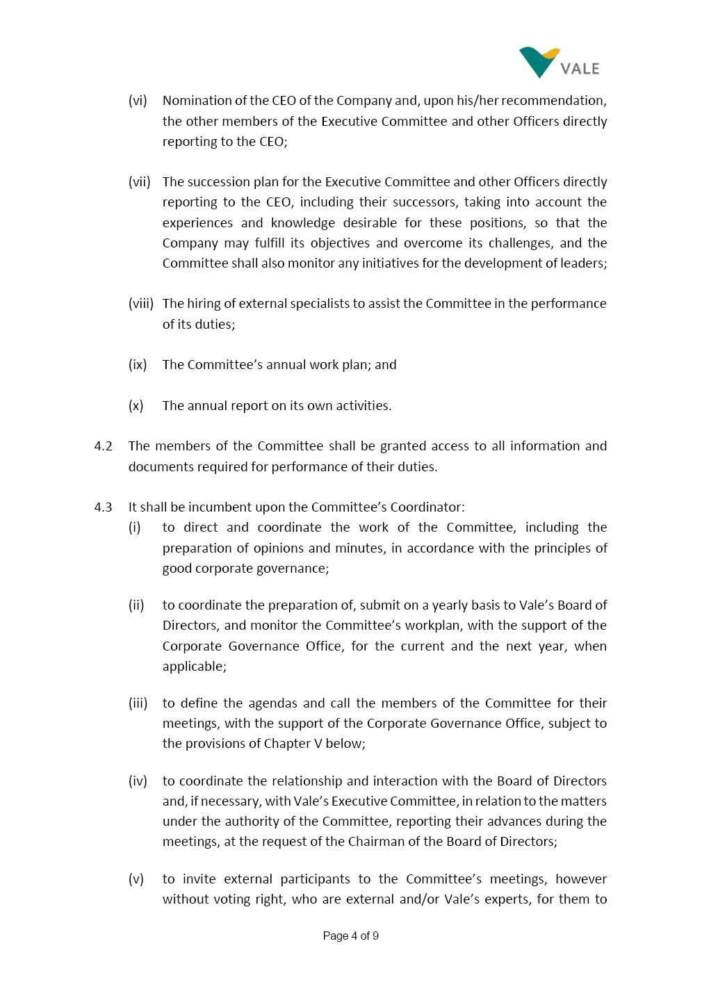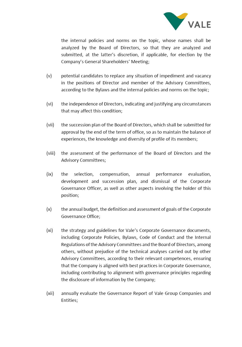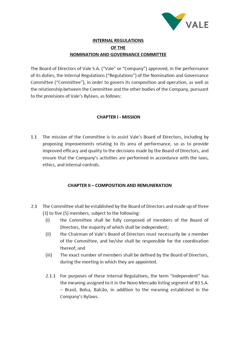 INTERNAL REGULATIONS OF THE NOMINATION AND GOVERNANCE COMMITTEE The Board of Directors of Vale S.A. (“Vale” or “Company”) approved, in the performance of its duties, the Internal Regulations (“Regulations”) of the Nomination and Governance Committee (“Committee”), in order to govern its composition and operation, as well as the relationship between the Committee and the other bodies of the Company, pursuant to the provisions of Vale’s Bylaws, as follows: CHAPTER I - MISSION 1.1 The mission of the Committee is to assist Vale’s Board of Directors, including by proposing improvements relating to its area of performance, so as to provide improved efficacy and quality to the decisions made by the Board of Directors, and ensure that the Company’s activities are performed in accordance with the laws, ethics, and internal controls. CHAPTER II – COMPOSITION AND REMUNERATION 2.1 The Committee shall be established by the Board of Directors and made up of three (3) to five (5) members, subject to the following: (i) the Committee shall be fully composed of members of the Board of Directors, the majority of which shall be independent; (ii) the Chairman of Vale’s Board of Directors must necessarily be a member of the Committee, and he/she shall be responsible for the coordination thereof; and (iii) The exact number of members shall be defined by the Board of Directors, during the meeting in which they are appointed. 2.1.1 For purposes of these Internal Regulations, the term “independent” has the meaning assigned to it in the Novo Mercado listing segment of B3 S.A. – Brasil, Bolsa, Balcão, in addition to the meaning established in the Company’s Bylaws. 2.2 The members of the Committee shall have experience and technical capacity in relation to the matters for which the Committee is responsible. 2.3 The criteria and amounts of global and individual remuneration of the members of the Committee shall be established by Vale’s Board of Directors upon distribution of the global amount set in the Company’s Annual Shareholders’ Meeting, and such global amount shall not include the reimbursable expenses required for performance of their duties. The remuneration of Committee members shall consider their responsibilities and the time dedicated to their functions, in line with market practices. 2.4 The members of the Committee shall be reimbursed for the travel, meals, and lodging expenses required for performance of their duties, subject to the internal norms and policies adopted by Vale. CHAPTER III - MANAGEMENT 3.1 The term of management of the members of the Committee shall commence as from the signature of the relevant instrument of investiture and be effective until (i) the end of the unified term of management of the members of Vale’s Board of Directors, or (ii) their removal from office by the Board of Directors, or resignation, which may occur at any time. 3.2 Upon lapse of the term of management of the members of the Committee, they may be reinstated through a new nomination by the Board of Directors. 3.3 The Coordination of the Committee shall be exercised by the Chairman of Board of Directors, it being understood that, in the event of his/her absence, the Coordinator him/herself shall be responsible for appointing his/her deputy among the other members, as well as the relevant period of replacement. 3.3.1 Should the Coordinator not exercise the prerogative above, the other members shall be responsible for appointing, among the independent members who are present at the meeting, the person that shall take over the function of Coordinator of the Committee. 3.4 The members of the Committee shall not have deputies. 3.5 In the case of vacancy or removal of Committee members, including its Coordinator, by the Board of Directors, it shall appoint a deputy member to complete the remaining management term of the replaced member, and this measure shall be permitted if the minimum composition is maintained according to item 2.1. 3.5.1 A vacancy in a Committee member position may occur due to dismissal, resignation, disability, death, proven impediment, loss of the mandate as a Board Member, or as a result of other situations provided for by law. 3.5.2 Any resignation from the position must be made through a letter sent by the resigning member to the Committee Coordinator and the Chairman of the Board of Directors (“PCA”), becoming effective, with respect to the Company, upon its receipt. CHAPTER IV - DUTIES 4.1 It is incumbent upon the Committee to assess and recommend the following to the Board of Directors: (i) Vale’s internal policies and norms regarding the nomination of members of the Board of Directors, Advisory Committees and the Company’s Chairman, in compliance with the applicable legal requirements and best Corporate Governance practices; (ii) evolution and continuous improvement of Vale’s Corporate Governance practices, also regarding the structure, duties, size and composition of the Board of Directors and the Advisory Committees, aiming at a balance of experiences, knowledge and diversity in the profile of its members. The Committee is also responsible for reviewing Vale’s Governance system on a yearly basis; (iii) the appropriate profile of applicants for member of the Board of Directors and Advisory Committees, and that best suits the needs of the Company, according to the criteria and guidelines set forth in the internal policies and norms on the topic; (iv) potential applicants for the position of Director and member of the Advisory Committees, according to the criteria and guidelines set forth in the internal policies and norms on the topic, whose names shall be analyzed by the Board of Directors, so that they are analyzed and submitted, at the latter’s discretion, if applicable, for election by the Company’s General Shareholders’ Meeting; (v) potential candidates to replace any situation of impediment and vacancy in the positions of Di