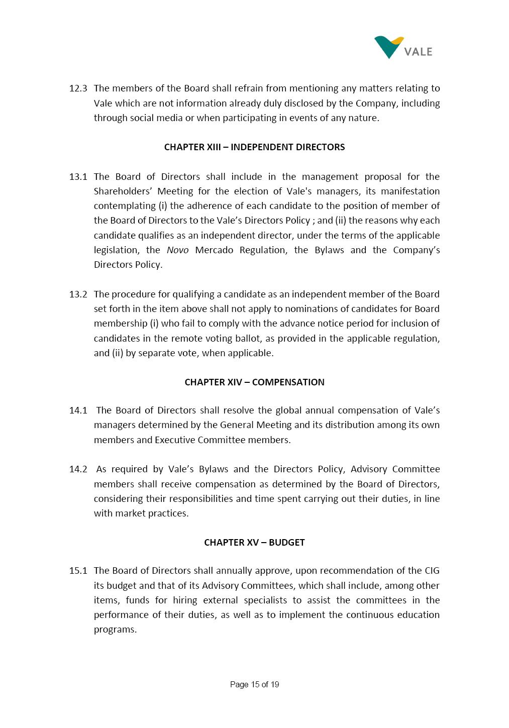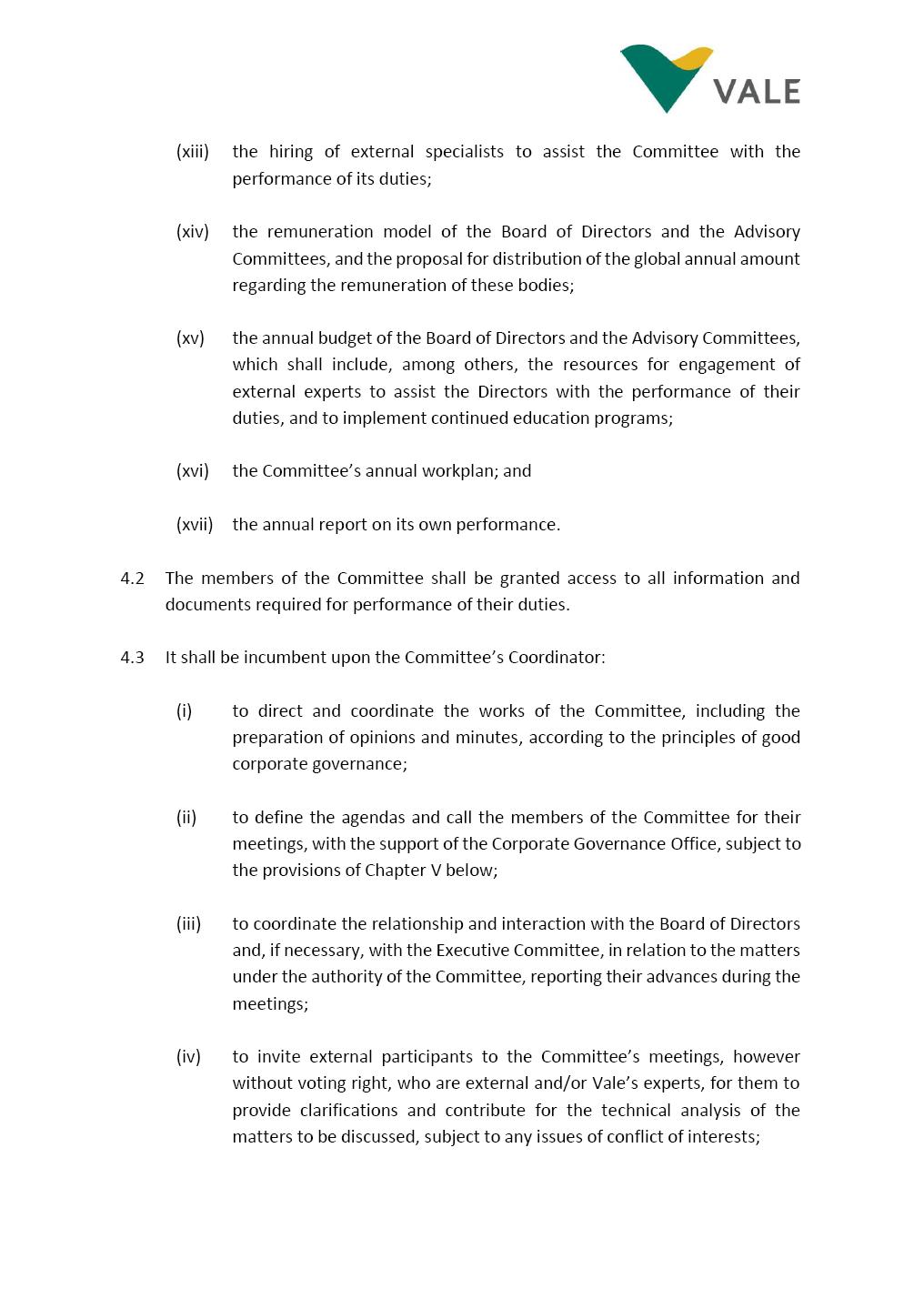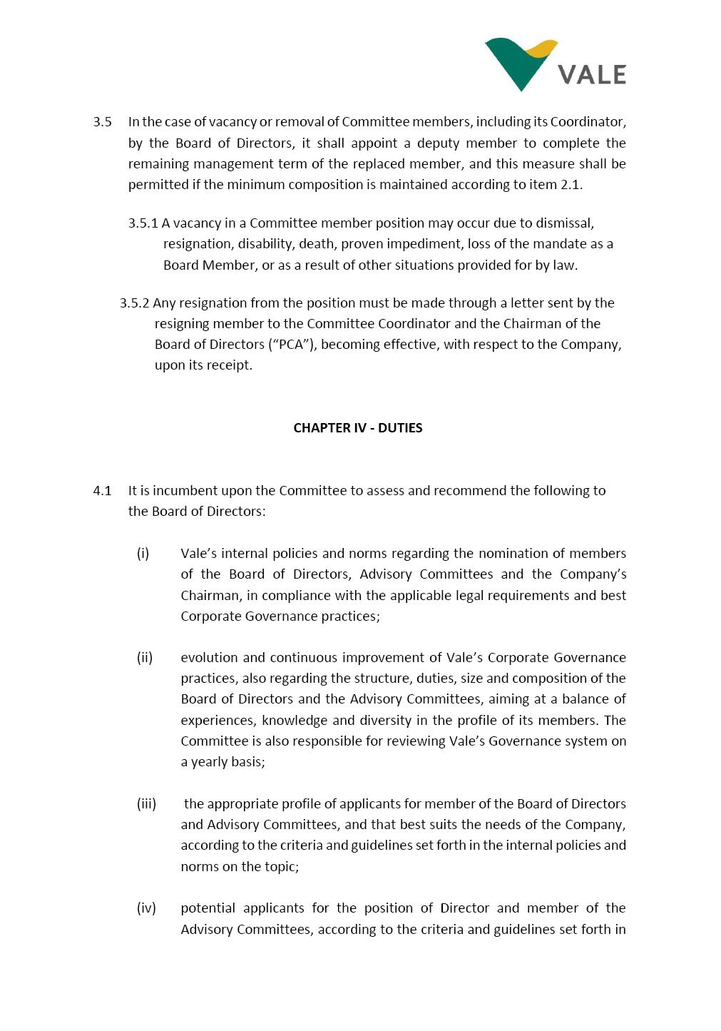 INTERNAL REGULATIONS OF THE NOMINATION AND GOVERNANCE COMMITTEE The Board of Directors of Vale S.A. (“Vale” or “Company”) approved, in the performance of its duties, the Internal Regulations (“Regulations”) of the Nomination and Governance Committee (“Committee”), in order to govern its composition and operation, as well as the relationship between the Committee and the other bodies of the Company, pursuant to the provisions of Vale’s Bylaws, as follows: CHAPTER I - MISSION 1.1 The mission of the Committee is to assist Vale’s Board of Directors, including by proposing improvements relating to its area of performance, so as to provide improved efficacy and quality to the decisions made by the Board of Directors, and ensure that the Company’s activities are performed in accordance with the laws, ethics, and internal controls. CHAPTER II – COMPOSITION AND REMUNERATION 2.1 The Committee shall be established by the Board of Directors and made up of three (3) to five (5) members, subject to the following: (i) the Committee shall be fully composed of members of the Board of Directors, the majority of which shall be independent; (ii) the Chairman of Vale’s Board of Directors must necessarily be a member of the Committee, and he/she shall be responsible for the coordination thereof; and (iii) The exact number of members shall be defined by the Board of Directors, during the meeting in which they are appointed. 2.1.1 For purposes of these Internal Regulations, the term “independent” has the meaning assigned to it in the Novo Mercado listing segment of B3 S.A. – Brasil, Bolsa, Balcão, in addition to the meaning established in the Company’s Bylaws. 2.2 The members of the Committee shall have experience and technical capacity in relation to the matters for which the Committee is responsible. 2.3 The criteria and amounts of global and individual remuneration of the members of the Committee shall be established by Vale’s Board of Directors upon distribution of the global amount set in the Company’s Annual Shareholders’ Meeting, and such global amount shall not include the reimbursable expenses required for performance of their duties. The remuneration of Committee members shall consider their responsibilities and the time dedicated to their functions, in line with market practices. 2.4 The members of the Committee shall be reimbursed for the travel, meals, and lodging expenses required for performance of their duties, subject to the internal norms and policies adopted by Vale. CHAPTER III - MANAGEMENT 3.1 The term of management of the members of the Committee shall commence as from the signature of the relevant instrument of investiture and be effective until (i) the end of the unified term of management of the members of Vale’s Board of Directors, or (ii) their removal from office by the Board of Directors, or resignation, which may occur at any time. 3.2 Upon lapse of the term of management of the members of the Committee, they may be reinstated through a new nomination by the Board of Directors. 3.3 The Coordination of the Committee shall be exercised by the Chairman of Board of Directors, it being understood that, in the event of his/her absence, the Coordinator him/herself shall be responsible for appointing his/her deputy among the other members, as well as the relevant period of replacement. 3.3.1 Should the Coordinator not exercise the prerogative above, the other members shall be responsible for appointing, among the independent members who are present at the meeting, the person that shall take over the function of Coordinator of the Committee. 3.4 The members of the Committee shall not have deputies. 3.5 In the case of vacancy or removal of Committee members, including its Coordinator, by the Board of Directors, it shall appoint a deputy member to complete the remaining management term of the replaced member, and this measure shall be permitted if the minimum composition is maintained according to item 2.1. 3.5.1 A vacancy in a Committee member position may occur due to dismissal, resignation, disability, death, proven impediment, loss of the mandate as a Board Member, or as a result of other situations provided for by law. 3.5.2 Any resignation from the position must be made through a letter sent by the resigning member to the Committee Coordinator and the Chairman of the Board of Directors (“PCA”), becoming effective, with respect to the Company, upon its receipt. CHAPTER IV - DUTIES 4.1 It is incumbent upon the Committee to assess and recommend the following to the Board of Directors: (i) Vale’s internal policies and norms regarding the nomination of members of the Board of Directors, Advisory Committees and the Company’s Chairman, in compliance with the applicable legal requirements and best Corporate Governance practices; (ii) evolution and continuous improvement of Vale’s Corporate Governance practices, also regarding the structure, duties, size and composition of the Board of Directors and the Advisory Committees, aiming at a balance of experiences, knowledge and diversity in the profile of its members. The Committee is also responsible for reviewing Vale’s Governance system on a yearly basis; (iii) the appropriate profile of applicants for member of the Board of Directors and Advisory Committees, and that best suits the needs of the Company, according to the criteria and guidelines set forth in the internal policies and norms on the topic; (iv) potential applicants for the position of Director and member of the Advisory Committees, according to the criteria and guidelines set forth in the internal policies and norms on the topic, whose names shall be analyzed by the Board of Directors, so that they are analyzed and submitted, at the latter’s discretion, if applicable, for election by the Company’s General Shareholders’ Meeting; (v) potential candidates to replace any situation of impediment and vacancy in the positions of Di