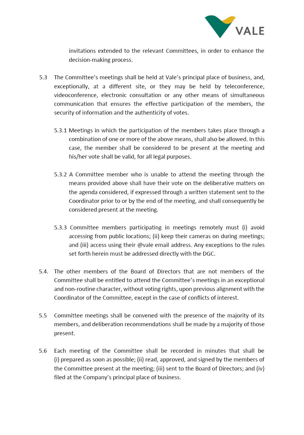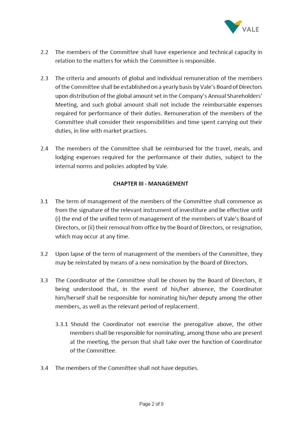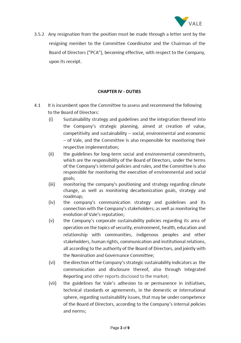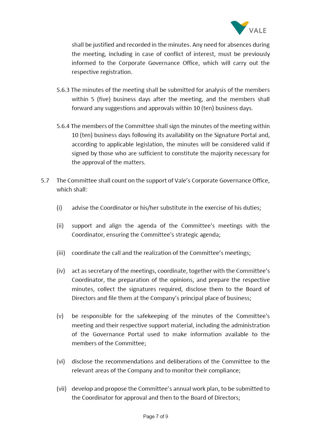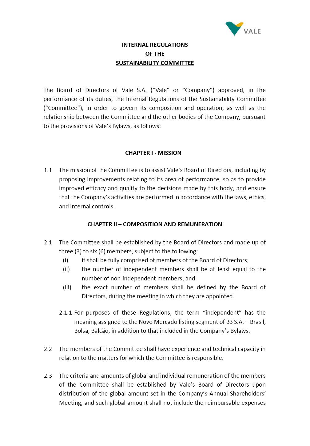 INTERNAL REGULATIONS OF THE SUSTAINABILITY COMMITTEE The Board of Directors of Vale S.A. (“Vale” or “Company”) approved, in the performance of its duties, the Internal Regulations of the Sustainability Committee (“Committee”), in order to govern its composition and operation, as well as the relationship between the Committee and the other bodies of the Company, pursuant to the provisions of Vale’s Bylaws, as follows: CHAPTER I - MISSION 1.1 The mission of the Committee is to assist Vale’s Board of Directors, including by proposing improvements relating to its area of performance, so as to provide improved efficacy and quality to the decisions made by this body, and ensure that the Company’s activities are performed in accordance with the laws, ethics, and internal controls. CHAPTER II – COMPOSITION AND REMUNERATION 2.1 The Committee shall be established by the Board of Directors and made up of three (3) to six (6) members, subject to the following: (i) it shall be fully comprised of members of the Board of Directors; (ii) the number of independent members shall be at least equal to the number of non-independent members; and (iii) the exact number of members shall be defined by the Board of Directors, during the meeting in which they are appointed. 2.1.1 For purposes of these Regulations, the term “independent” has the meaning assigned to the Novo Mercado listing segment of B3 S.A. – Brasil, Bolsa, Balcão, in addition to that included in the Company’s Bylaws. 2.2 The members of the Committee shall have experience and technical capacity in relation to the matters for which the Committee is responsible. 2.3 The criteria and amounts of global and individual remuneration of the members of the Committee shall be established by Vale’s Board of Directors upon distribution of the global amount set in the Company’s Annual Shareholders’ Meeting, and such global amount shall not include the reimbursable expenses Page 2 of 9 required for performance of their duties. The remuneration of Committee members shall consider their responsibilities and the time dedicated to their functions, in line with market practices. 2.4 The members of the Committee shall be reimbursed for the travel, meals, and lodging expenses required for performance of their duties, subject to the internal norms and policies adopted by Vale. CHAPTER III - MANAGEMENT 3.1 The term of management of the members of the Committee shall commence as from the signature of the relevant instrument of investiture and be effective until (i) the end of the unified term of management of the members of Vale’s Board of Directors, or (ii) their removal from office by the Board of Directors, or resignation, which may occur at any time. 3.2 Upon lapse of the term of management of the members of the Committee, they may be reinstated through a new nomination by the Board of Directors. 3.3 The Coordinator of the Committee shall be chosen by the Board of Directors itself, it being understood that, in the event of his/her absence, the Coordinator him/herself shall be responsible for appointing his/her deputy among the other members, as well as the relevant period of replacement. 3.3.1 Should the Coordinator not exercise the prerogative above, the other members shall be responsible for appointing, among those who are present at the meeting, the person that shall take over the function of Coordinator of the Committee. 3.4 The members of the Committee shall not have deputies. 3.5 In the case of vacancy or removal of Committee members, including its Coordinator, by the Board of Directors, it shall appoint a deputy member to complete the remaining management term of the replaced member, and this measure shall be permitted if the minimum composition is maintained according to item 2.1. 3.5.1 A vacancy in a Committee member position may occur due to dismissal, resignation, invalidity, death, proven impediment, loss of the mandate as a Board Member, or as a result of other situations provided for by law. Page 3 of 9 3.5.2 Any resignation from the position must be made through a letter sent by the resigning member to the Committee Coordinator and the Chairman of the Board of Directors ("PCA"), becoming effective, with respect to the Company, upon its receipt. CHAPTER IV - DUTIES 4.1 It is incumbent upon the Committee to assess and recommend the following to the Board of Directors: (i) Sustainability strategy and guidelines and the integration thereof into the Company’s strategic planning, aimed at creation of value, competitivity and sustainability – social, environmental and economic – of Vale, and the Committee is also responsible for monitoring their respective implementation; (ii) the guidelines for long-term social and environmental commitments, which are the responsibility of the Board of Directors, under the terms of the Company's internal policies and rules, and the Committee is also responsible for monitoring the execution of environmental and social goals; (iii) monitoring the company's positioning and strategy regarding climate change, as well as monitoring decarbonization goals, strategy and roadmap; (iv) the company's communication strategy and guidelines and its connection with the Company's stakeholders; as well as monitoring the evolution of Vale's reputation; (v) the Company’s corporate sustainability policies regarding its area of operation on the topics of security, environment, health, education and relationship with communities, indigenous peoples and other stakeholders, human rights, communication and institutional relations, all according to the authority of the Board of Directors, and jointly with the Nomination and Governance Committee; (vi) the direction of the Company’s strategic sustainability indicators as the communication and disclosure thereof, also through Integrated Reporting and other reports disclosed to the market; (vii) the guidelines for Vale’s adhesion to or permanence in initiat