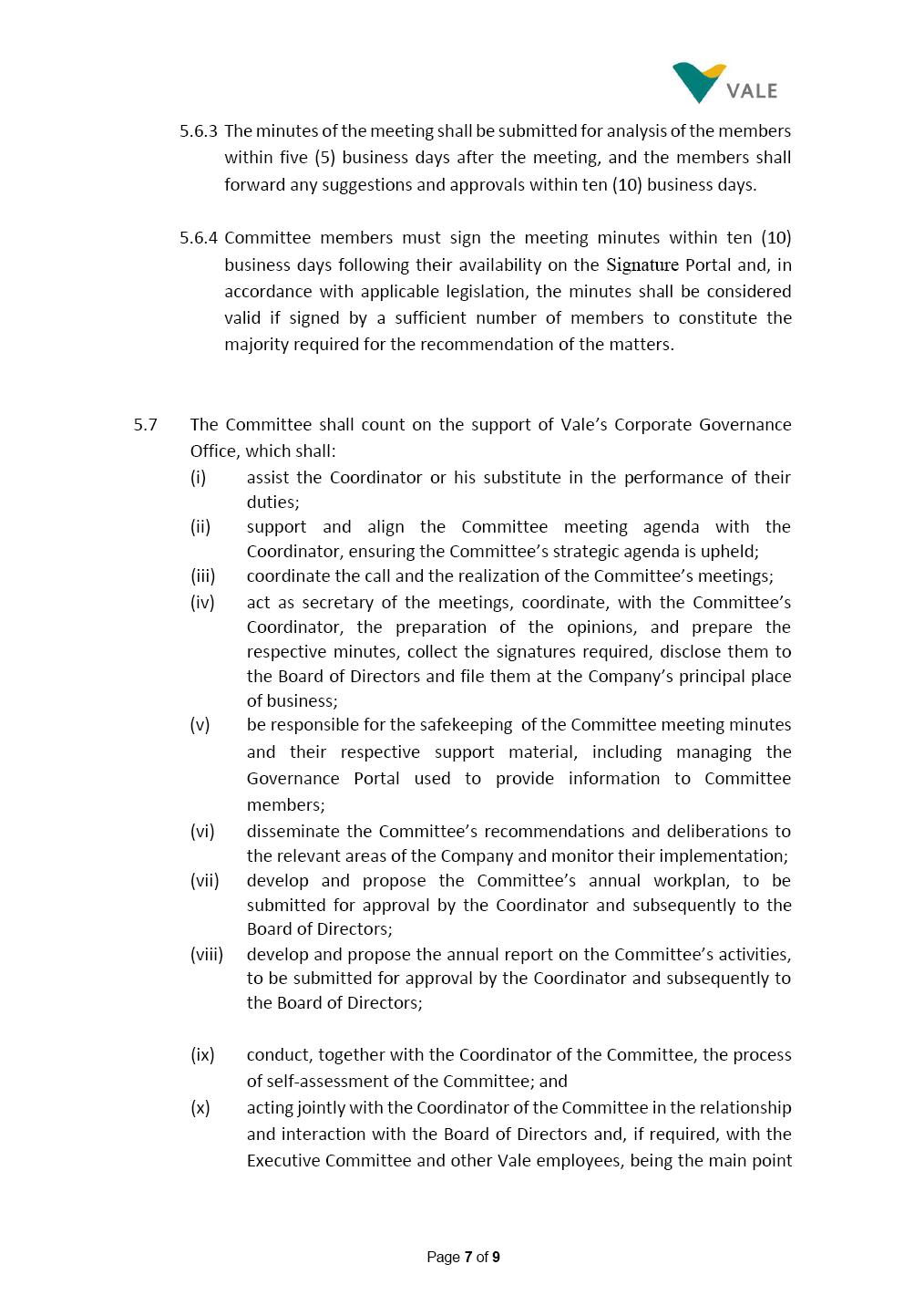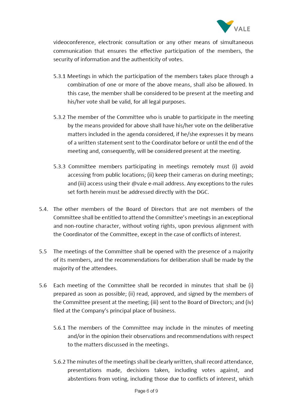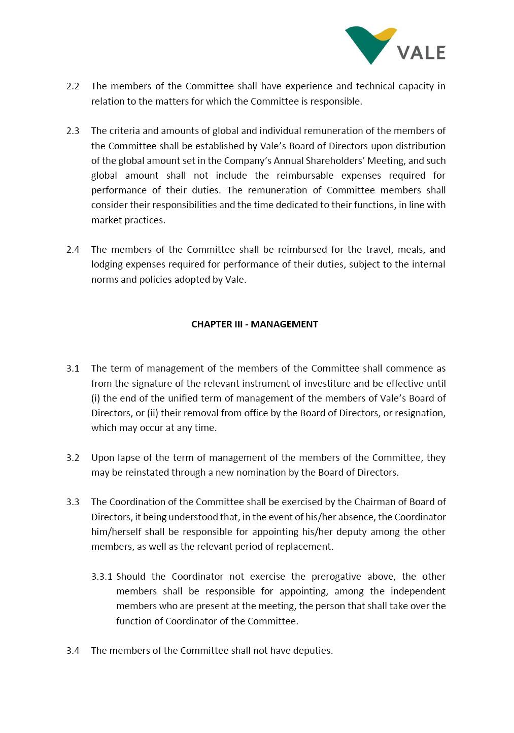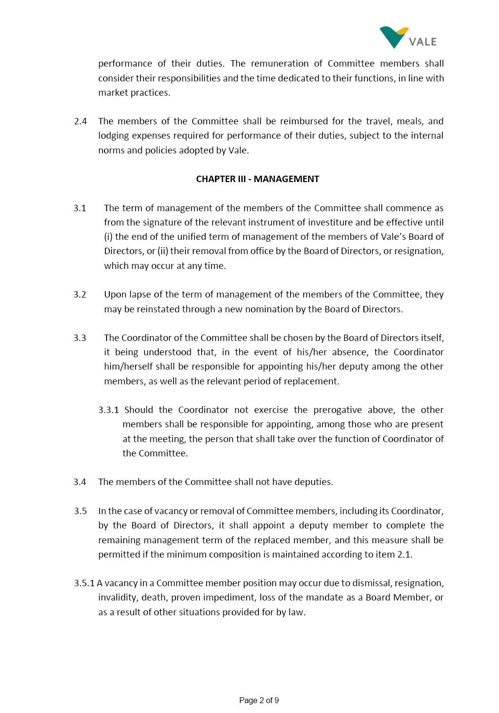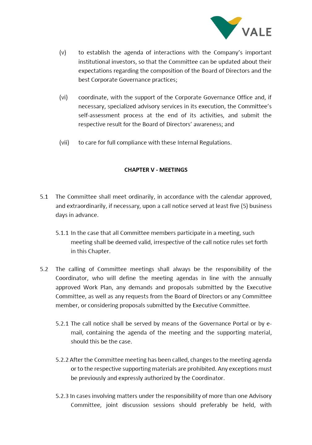 INTERNAL REGULATIONS OF THE SUSTAINABILITY COMMITTEE The Board of Directors of Vale S.A. (“Vale” or “Company”) approved, in the performance of its duties, the Internal Regulations of the Sustainability Committee (“Committee”), in order to govern its composition and operation, as well as the relationship between the Committee and the other bodies of the Company, pursuant to the provisions of Vale’s Bylaws, as follows: CHAPTER I - MISSION 1.1 The mission of the Committee is to assist Vale’s Board of Directors, including by proposing improvements relating to its area of performance, so as to provide improved efficacy and quality to the decisions made by this body, and ensure that the Company’s activities are performed in accordance with the laws, ethics, and internal controls. CHAPTER II – COMPOSITION AND REMUNERATION 2.1 The Committee shall be established by the Board of Directors and made up of three (3) to six (6) members, subject to the following: (i) it shall be fully comprised of members of the Board of Directors; (ii) the number of independent members shall be at least equal to the number of non-independent members; and (iii) the exact number of members shall be defined by the Board of Directors, during the meeting in which they are appointed. 2.1.1 For purposes of these Regulations, the term “independent” has the meaning assigned to the Novo Mercado listing segment of B3 S.A. – Brasil, Bolsa, Balcão, in addition to that included in the Company’s Bylaws. 2.2 The members of the Committee shall have experience and technical capacity in relation to the matters for which the Committee is responsible. 2.3 The criteria and amounts of global and individual remuneration of the members of the Committee shall be established by Vale’s Board of Directors upon distribution of the global amount set in the Company’s Annual Shareholders’ Meeting, and such global amount shall not include the reimbursable expenses Page 2 of 9 required for performance of their duties. The remuneration of Committee members shall consider their responsibilities and the time dedicated to their functions, in line with market practices. 2.4 The members of the Committee shall be reimbursed for the travel, meals, and lodging expenses required for performance of their duties, subject to the internal norms and policies adopted by Vale. CHAPTER III - MANAGEMENT 3.1 The term of management of the members of the Committee shall commence as from the signature of the relevant instrument of investiture and be effective until (i) the end of the unified term of management of the members of Vale’s Board of Directors, or (ii) their removal from office by the Board of Directors, or resignation, which may occur at any time. 3.2 Upon lapse of the term of management of the members of the Committee, they may be reinstated through a new nomination by the Board of Directors. 3.3 The Coordinator of the Committee shall be chosen by the Board of Directors itself, it being understood that, in the event of his/her absence, the Coordinator him/herself shall be responsible for appointing his/her deputy among the other members, as well as the relevant period of replacement. 3.3.1 Should the Coordinator not exercise the prerogative above, the other members shall be responsible for appointing, among those who are present at the meeting, the person that shall take over the function of Coordinator of the Committee. 3.4 The members of the Committee shall not have deputies. 3.5 In the case of vacancy or removal of Committee members, including its Coordinator, by the Board of Directors, it shall appoint a deputy member to complete the remaining management term of the replaced member, and this measure shall be permitted if the minimum composition is maintained according to item 2.1. 3.5.1 A vacancy in a Committee member position may occur due to dismissal, resignation, invalidity, death, proven impediment, loss of the mandate as a Board Member, or as a result of other situations provided for by law. Page 3 of 9 3.5.2 Any resignation from the position must be made through a letter sent by the resigning member to the Committee Coordinator and the Chairman of the Board of Directors ("PCA"), becoming effective, with respect to the Company, upon its receipt. CHAPTER IV - DUTIES 4.1 It is incumbent upon the Committee to assess and recommend the following to the Board of Directors: (i) Sustainability strategy and guidelines and the integration thereof into the Company’s strategic planning, aimed at creation of value, competitivity and sustainability – social, environmental and economic – of Vale, and the Committee is also responsible for monitoring their respective implementation; (ii) the guidelines for long-term social and environmental commitments, which are the responsibility of the Board of Directors, under the terms of the Company's internal policies and rules, and the Committee is also responsible for monitoring the execution of environmental and social goals; (iii) monitoring the company's positioning and strategy regarding climate change, as well as monitoring decarbonization goals, strategy and roadmap; (iv) the company's communication strategy and guidelines and its connection with the Company's stakeholders; as well as monitoring the evolution of Vale's reputation; (v) the Company’s corporate sustainability policies regarding its area of operation on the topics of security, environment, health, education and relationship with communities, indigenous peoples and other stakeholders, human rights, communication and institutional relations, all according to the authority of the Board of Directors, and jointly with the Nomination and Governance Committee; (vi) the direction of the Company’s strategic sustainability indicators as the communication and disclosure thereof, also through Integrated Reporting and other reports disclosed to the market; (vii) the guidelines for Vale’s adhesion to or permanence in initiat