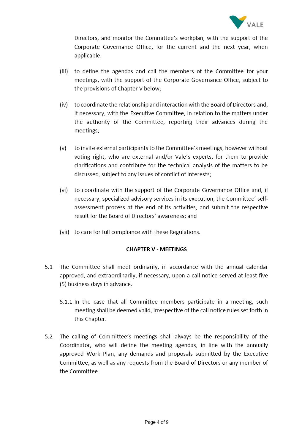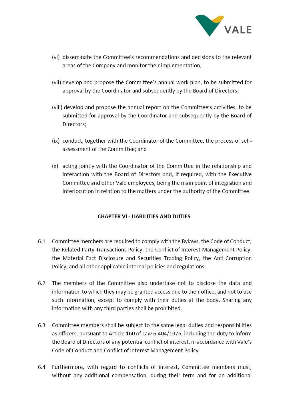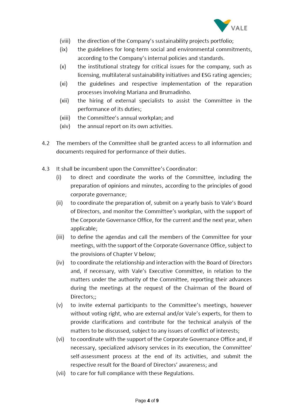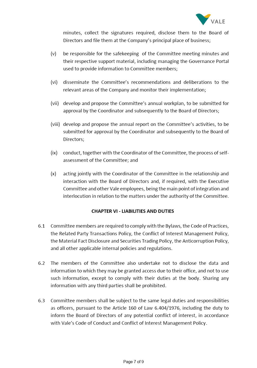 INTERNAL REGULATIONS OF THE SUSTAINABILITY COMMITTEE The Board of Directors of Vale S.A. (“Vale” or “Company”) approved, in the performance of its duties, the Internal Regulations of the Sustainability Committee (“Committee”), in order to govern its composition and operation, as well as the relationship between the Committee and the other bodies of the Company, pursuant to the provisions of Vale’s Bylaws, as follows: CHAPTER I - MISSION 1.1 The mission of the Committee is to assist Vale’s Board of Directors, including by proposing improvements relating to its area of performance, so as to provide improved efficacy and quality to the decisions made by this body, and ensure that the Company’s activities are performed in accordance with the laws, ethics, and internal controls. CHAPTER II – COMPOSITION AND REMUNERATION 2.1 The Committee shall be established by the Board of Directors and made up of three (3) to six (6) members, subject to the following: (i) it shall be fully comprised of members of the Board of Directors; (ii) the number of independent members shall be at least equal to the number of non-independent members; and (iii) the exact number of members shall be defined by the Board of Directors, during the meeting in which they are appointed. 2.1.1 For purposes of these Regulations, the term “independent” has the meaning assigned to the Novo Mercado listing segment of B3 S.A. – Brasil, Bolsa, Balcão, in addition to that included in the Company’s Bylaws. 2.2 The members of the Committee shall have experience and technical capacity in relation to the matters for which the Committee is responsible. 2.3 The criteria and amounts of global and individual remuneration of the members of the Committee shall be established by Vale’s Board of Directors upon distribution of the global amount set in the Company’s Annual Shareholders’ Meeting, and such global amount shall not include the reimbursable expenses Page 2 of 9 required for performance of their duties. The remuneration of Committee members shall consider their responsibilities and the time dedicated to their functions, in line with market practices. 2.4 The members of the Committee shall be reimbursed for the travel, meals, and lodging expenses required for performance of their duties, subject to the internal norms and policies adopted by Vale. CHAPTER III - MANAGEMENT 3.1 The term of management of the members of the Committee shall commence as from the signature of the relevant instrument of investiture and be effective until (i) the end of the unified term of management of the members of Vale’s Board of Directors, or (ii) their removal from office by the Board of Directors, or resignation, which may occur at any time. 3.2 Upon lapse of the term of management of the members of the Committee, they may be reinstated through a new nomination by the Board of Directors. 3.3 The Coordinator of the Committee shall be chosen by the Board of Directors itself, it being understood that, in the event of his/her absence, the Coordinator him/herself shall be responsible for appointing his/her deputy among the other members, as well as the relevant period of replacement. 3.3.1 Should the Coordinator not exercise the prerogative above, the other members shall be responsible for appointing, among those who are present at the meeting, the person that shall take over the function of Coordinator of the Committee. 3.4 The members of the Committee shall not have deputies. 3.5 In the case of vacancy or removal of Committee members, including its Coordinator, by the Board of Directors, it shall appoint a deputy member to complete the remaining management term of the replaced member, and this measure shall be permitted if the minimum composition is maintained according to item 2.1. 3.5.1 A vacancy in a Committee member position may occur due to dismissal, resignation, invalidity, death, proven impediment, loss of the mandate as a Board Member, or as a result of other situations provided for by law. Page 3 of 9 3.5.2 Any resignation from the position must be made through a letter sent by the resigning member to the Committee Coordinator and the Chairman of the Board of Directors ("PCA"), becoming effective, with respect to the Company, upon its receipt. CHAPTER IV - DUTIES 4.1 It is incumbent upon the Committee to assess and recommend the following to the Board of Directors: (i) Sustainability strategy and guidelines and the integration thereof into the Company’s strategic planning, aimed at creation of value, competitivity and sustainability – social, environmental and economic – of Vale, and the Committee is also responsible for monitoring their respective implementation; (ii) the guidelines for long-term social and environmental commitments, which are the responsibility of the Board of Directors, under the terms of the Company's internal policies and rules, and the Committee is also responsible for monitoring the execution of environmental and social goals; (iii) monitoring the company's positioning and strategy regarding climate change, as well as monitoring decarbonization goals, strategy and roadmap; (iv) the company's communication strategy and guidelines and its connection with the Company's stakeholders; as well as monitoring the evolution of Vale's reputation; (v) the Company’s corporate sustainability policies regarding its area of operation on the topics of security, environment, health, education and relationship with communities, indigenous peoples and other stakeholders, human rights, communication and institutional relations, all according to the authority of the Board of Directors, and jointly with the Nomination and Governance Committee; (vi) the direction of the Company’s strategic sustainability indicators as the communication and disclosure thereof, also through Integrated Reporting and other reports disclosed to the market; (vii) the guidelines for Vale’s adhesion to or permanence in initiat