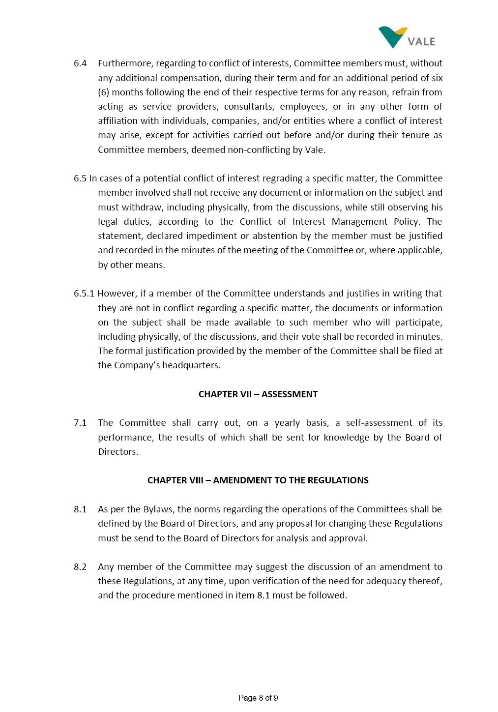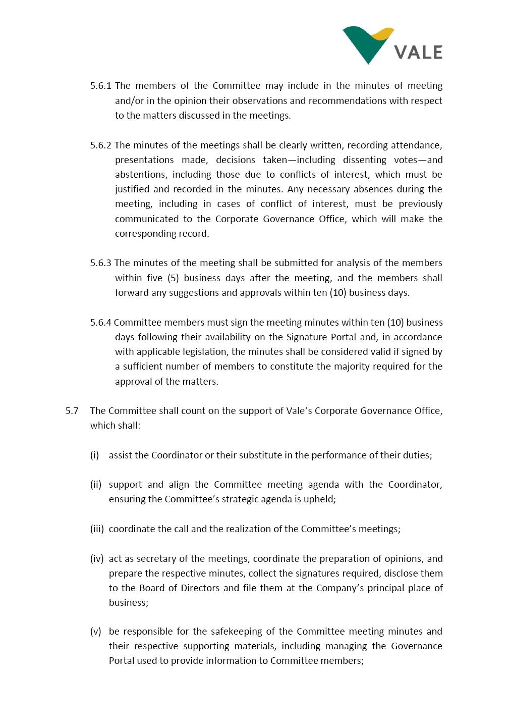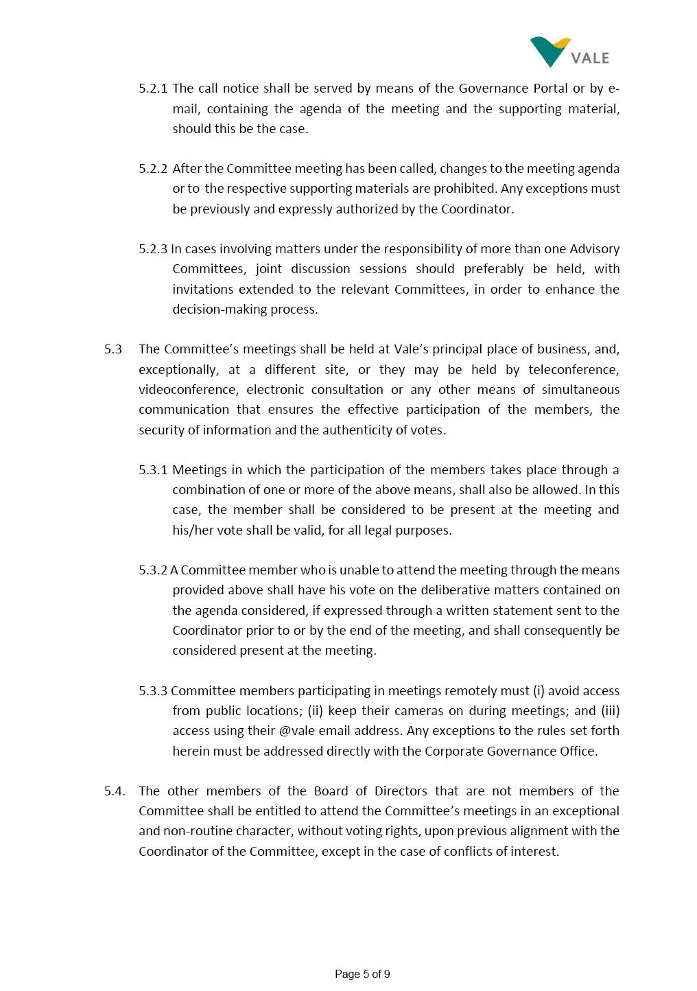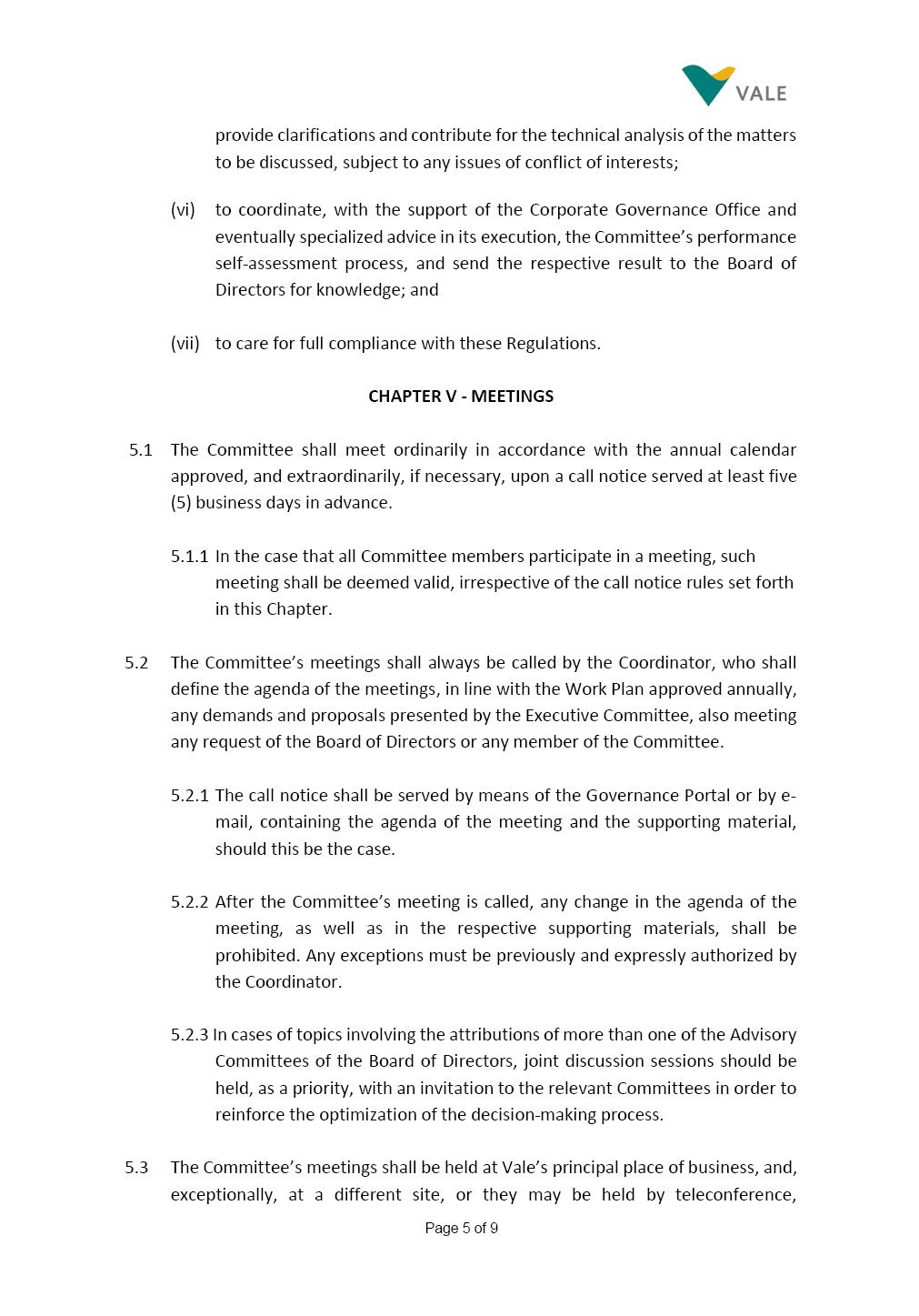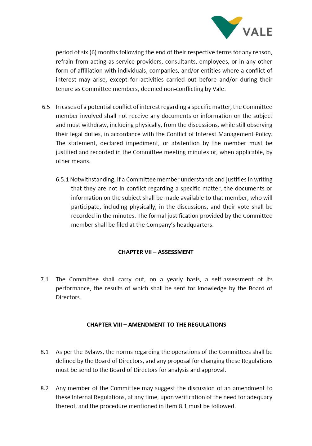 INTERNAL REGULATIONS OF THE SUSTAINABILITY COMMITTEE The Board of Directors of Vale S.A. (“Vale” or “Company”) approved, in the performance of its duties, the Internal Regulations of the Sustainability Committee (“Committee”), in order to govern its composition and operation, as well as the relationship between the Committee and the other bodies of the Company, pursuant to the provisions of Vale’s Bylaws, as follows: CHAPTER I - MISSION 1.1 The mission of the Committee is to assist Vale’s Board of Directors, including by proposing improvements relating to its area of performance, so as to provide improved efficacy and quality to the decisions made by this body, and ensure that the Company’s activities are performed in accordance with the laws, ethics, and internal controls. CHAPTER II – COMPOSITION AND REMUNERATION 2.1 The Committee shall be established by the Board of Directors and made up of three (3) to six (6) members, subject to the following: (i) it shall be fully comprised of members of the Board of Directors; (ii) the number of independent members shall be at least equal to the number of non-independent members; and (iii) the exact number of members shall be defined by the Board of Directors, during the meeting in which they are appointed. 2.1.1 For purposes of these Regulations, the term “independent” has the meaning assigned to the Novo Mercado listing segment of B3 S.A. – Brasil, Bolsa, Balcão, in addition to that included in the Company’s Bylaws. 2.2 The members of the Committee shall have experience and technical capacity in relation to the matters for which the Committee is responsible. 2.3 The criteria and amounts of global and individual remuneration of the members of the Committee shall be established by Vale’s Board of Directors upon distribution of the global amount set in the Company’s Annual Shareholders’ Meeting, and such global amount shall not include the reimbursable expenses Page 2 of 9 required for performance of their duties. The remuneration of Committee members shall consider their responsibilities and the time dedicated to their functions, in line with market practices. 2.4 The members of the Committee shall be reimbursed for the travel, meals, and lodging expenses required for performance of their duties, subject to the internal norms and policies adopted by Vale. CHAPTER III - MANAGEMENT 3.1 The term of management of the members of the Committee shall commence as from the signature of the relevant instrument of investiture and be effective until (i) the end of the unified term of management of the members of Vale’s Board of Directors, or (ii) their removal from office by the Board of Directors, or resignation, which may occur at any time. 3.2 Upon lapse of the term of management of the members of the Committee, they may be reinstated through a new nomination by the Board of Directors. 3.3 The Coordinator of the Committee shall be chosen by the Board of Directors itself, it being understood that, in the event of his/her absence, the Coordinator him/herself shall be responsible for appointing his/her deputy among the other members, as well as the relevant period of replacement. 3.3.1 Should the Coordinator not exercise the prerogative above, the other members shall be responsible for appointing, among those who are present at the meeting, the person that shall take over the function of Coordinator of the Committee. 3.4 The members of the Committee shall not have deputies. 3.5 In the case of vacancy or removal of Committee members, including its Coordinator, by the Board of Directors, it shall appoint a deputy member to complete the remaining management term of the replaced member, and this measure shall be permitted if the minimum composition is maintained according to item 2.1. 3.5.1 A vacancy in a Committee member position may occur due to dismissal, resignation, invalidity, death, proven impediment, loss of the mandate as a Board Member, or as a result of other situations provided for by law. Page 3 of 9 3.5.2 Any resignation from the position must be made through a letter sent by the resigning member to the Committee Coordinator and the Chairman of the Board of Directors ("PCA"), becoming effective, with respect to the Company, upon its receipt. CHAPTER IV - DUTIES 4.1 It is incumbent upon the Committee to assess and recommend the following to the Board of Directors: (i) Sustainability strategy and guidelines and the integration thereof into the Company’s strategic planning, aimed at creation of value, competitivity and sustainability – social, environmental and economic – of Vale, and the Committee is also responsible for monitoring their respective implementation; (ii) the guidelines for long-term social and environmental commitments, which are the responsibility of the Board of Directors, under the terms of the Company's internal policies and rules, and the Committee is also responsible for monitoring the execution of environmental and social goals; (iii) monitoring the company's positioning and strategy regarding climate change, as well as monitoring decarbonization goals, strategy and roadmap; (iv) the company's communication strategy and guidelines and its connection with the Company's stakeholders; as well as monitoring the evolution of Vale's reputation; (v) the Company’s corporate sustainability policies regarding its area of operation on the topics of security, environment, health, education and relationship with communities, indigenous peoples and other stakeholders, human rights, communication and institutional relations, all according to the authority of the Board of Directors, and jointly with the Nomination and Governance Committee; (vi) the direction of the Company’s strategic sustainability indicators as the communication and disclosure thereof, also through Integrated Reporting and other reports disclosed to the market; (vii) the guidelines for Vale’s adhesion to or permanence in initiat