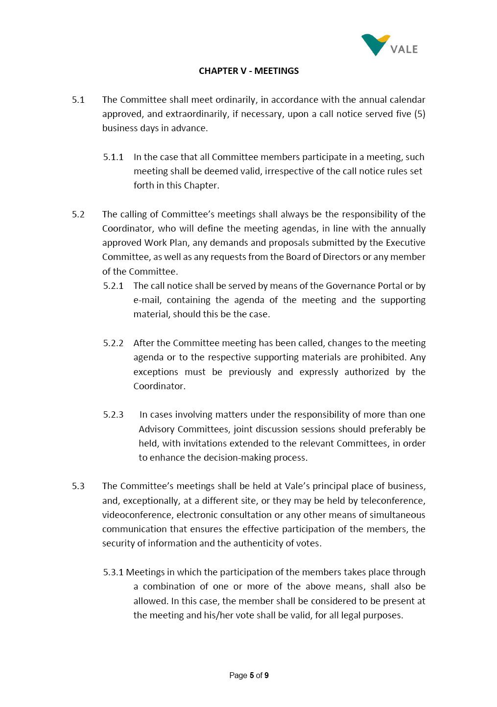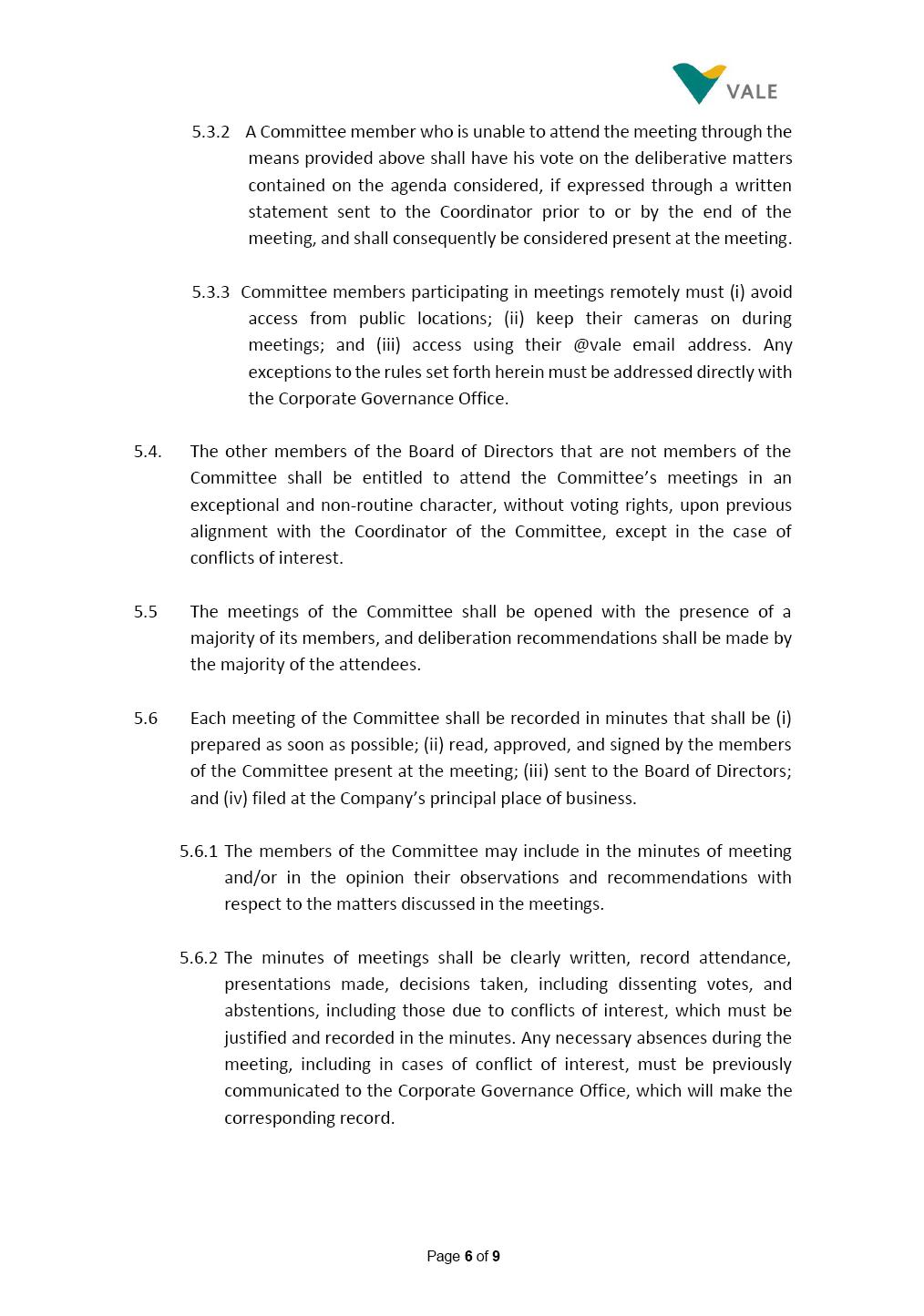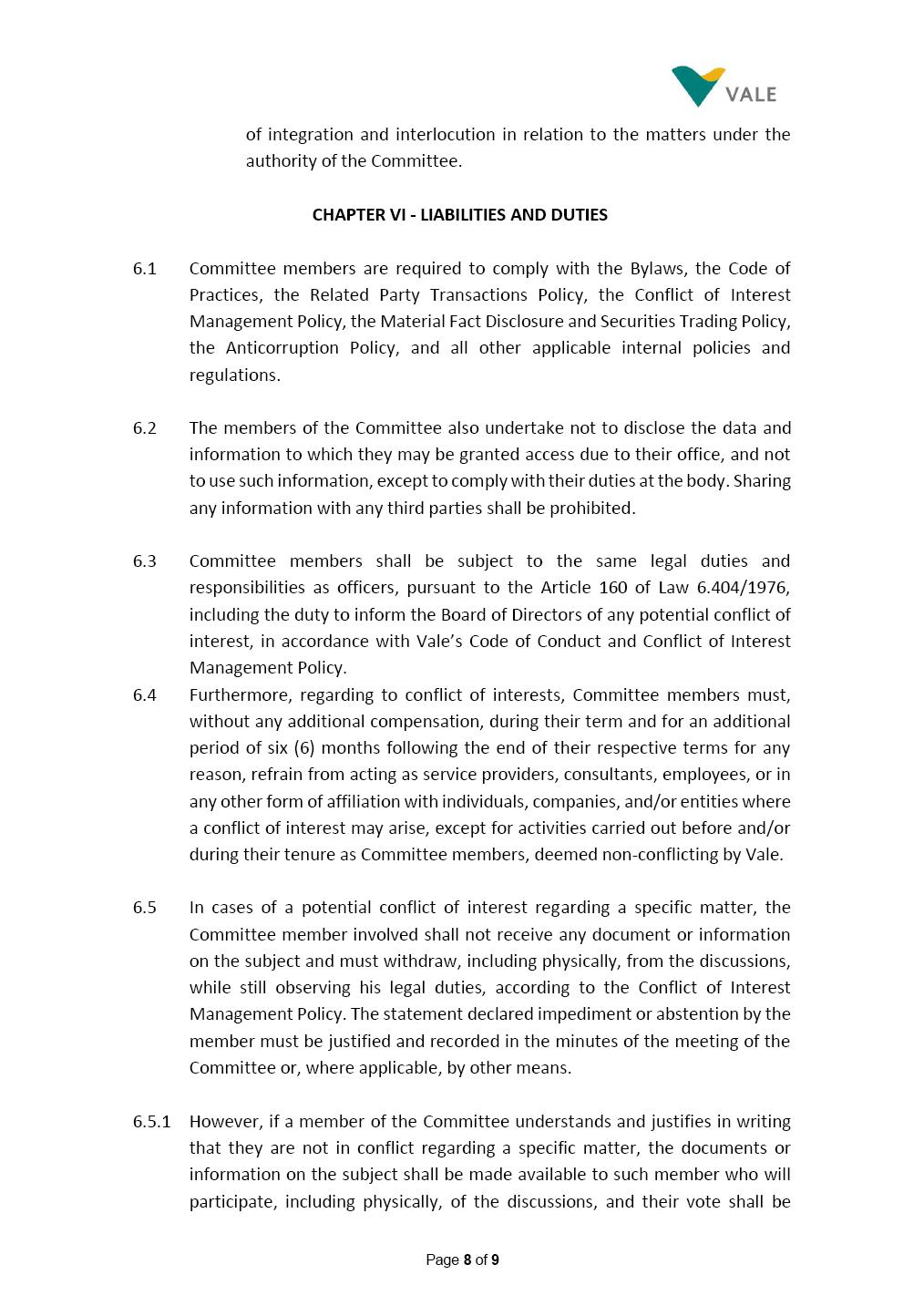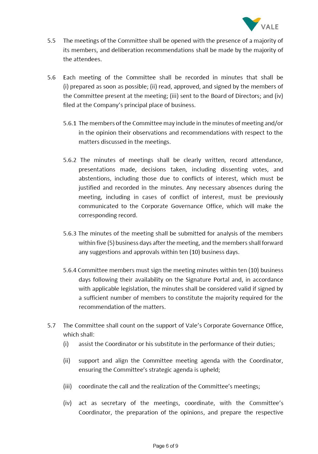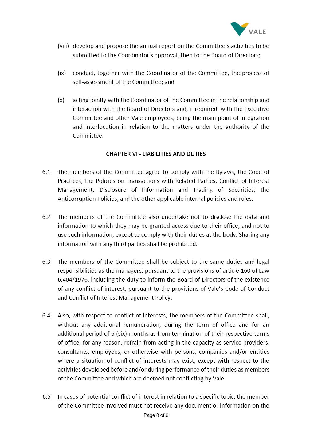INTERNAL REGULATIONS OF THE SUSTAINABILITY COMMITTEE The Board of Directors of Vale S.A. (“Vale” or “Company”) approved, in the performance of its duties, the Internal Regulations of the Sustainability Committee (“Committee”), in order to govern its composition and operation, as well as the relationship between the Committee and the other bodies of the Company, pursuant to the provisions of Vale’s Bylaws, as follows: CHAPTER I - MISSION 1.1 The mission of the Committee is to assist Vale’s Board of Directors, including by proposing improvements relating to its area of performance, so as to provide improved efficacy and quality to the decisions made by this body, and ensure that the Company’s activities are performed in accordance with the laws, ethics, and internal controls. CHAPTER II – COMPOSITION AND REMUNERATION 2.1 The Committee shall be established by the Board of Directors and made up of three (3) to six (6) members, subject to the following: (i) it shall be fully comprised of members of the Board of Directors; (ii) the number of independent members shall be at least equal to the number of non-independent members; and (iii) the exact number of members shall be defined by the Board of Directors, during the meeting in which they are appointed. 2.1.1 For purposes of these Regulations, the term “independent” has the meaning assigned to the Novo Mercado listing segment of B3 S.A. – Brasil, Bolsa, Balcão, in addition to that included in the Company’s Bylaws. 2.2 The members of the Committee shall have experience and technical capacity in relation to the matters for which the Committee is responsible. 2.3 The criteria and amounts of global and individual remuneration of the members of the Committee shall be established by Vale’s Board of Directors upon distribution of the global amount set in the Company’s Annual Shareholders’ Meeting, and such global amount shall not include the reimbursable expenses Page 2 of 9 required for performance of their duties. The remuneration of Committee members shall consider their responsibilities and the time dedicated to their functions, in line with market practices. 2.4 The members of the Committee shall be reimbursed for the travel, meals, and lodging expenses required for performance of their duties, subject to the internal norms and policies adopted by Vale. CHAPTER III - MANAGEMENT 3.1 The term of management of the members of the Committee shall commence as from the signature of the relevant instrument of investiture and be effective until (i) the end of the unified term of management of the members of Vale’s Board of Directors, or (ii) their removal from office by the Board of Directors, or resignation, which may occur at any time. 3.2 Upon lapse of the term of management of the members of the Committee, they may be reinstated through a new nomination by the Board of Directors. 3.3 The Coordinator of the Committee shall be chosen by the Board of Directors itself, it being understood that, in the event of his/her absence, the Coordinator him/herself shall be responsible for appointing his/her deputy among the other members, as well as the relevant period of replacement. 3.3.1 Should the Coordinator not exercise the prerogative above, the other members shall be responsible for appointing, among those who are present at the meeting, the person that shall take over the function of Coordinator of the Committee. 3.4 The members of the Committee shall not have deputies. 3.5 In the case of vacancy or removal of Committee members, including its Coordinator, by the Board of Directors, it shall appoint a deputy member to complete the remaining management term of the replaced member, and this measure shall be permitted if the minimum composition is maintained according to item 2.1. 3.5.1 A vacancy in a Committee member position may occur due to dismissal, resignation, invalidity, death, proven impediment, loss of the mandate as a Board Member, or as a result of other situations provided for by law. Page 3 of 9 3.5.2 Any resignation from the position must be made through a letter sent by the resigning member to the Committee Coordinator and the Chairman of the Board of Directors ("PCA"), becoming effective, with respect to the Company, upon its receipt. CHAPTER IV - DUTIES 4.1 It is incumbent upon the Committee to assess and recommend the following to the Board of Directors: (i) Sustainability strategy and guidelines and the integration thereof into the Company’s strategic planning, aimed at creation of value, competitivity and sustainability – social, environmental and economic – of Vale, and the Committee is also responsible for monitoring their respective implementation; (ii) the guidelines for long-term social and environmental commitments, which are the responsibility of the Board of Directors, under the terms of the Company's internal policies and rules, and the Committee is also responsible for monitoring the execution of environmental and social goals; (iii) monitoring the company's positioning and strategy regarding climate change, as well as monitoring decarbonization goals, strategy and roadmap; (iv) the company's communication strategy and guidelines and its connection with the Company's stakeholders; as well as monitoring the evolution of Vale's reputation; (v) the Company’s corporate sustainability policies regarding its area of operation on the topics of security, environment, health, education and relationship with communities, indigenous peoples and other stakeholders, human rights, communication and institutional relations, all according to the authority of the Board of Directors, and jointly with the Nomination and Governance Committee; (vi) the direction of the Company’s strategic sustainability indicators as the communication and disclosure thereof, also through Integrated Reporting and other reports disclosed to the market; (vii) the guidelines for Vale’s adhesion to or permanence in initiat