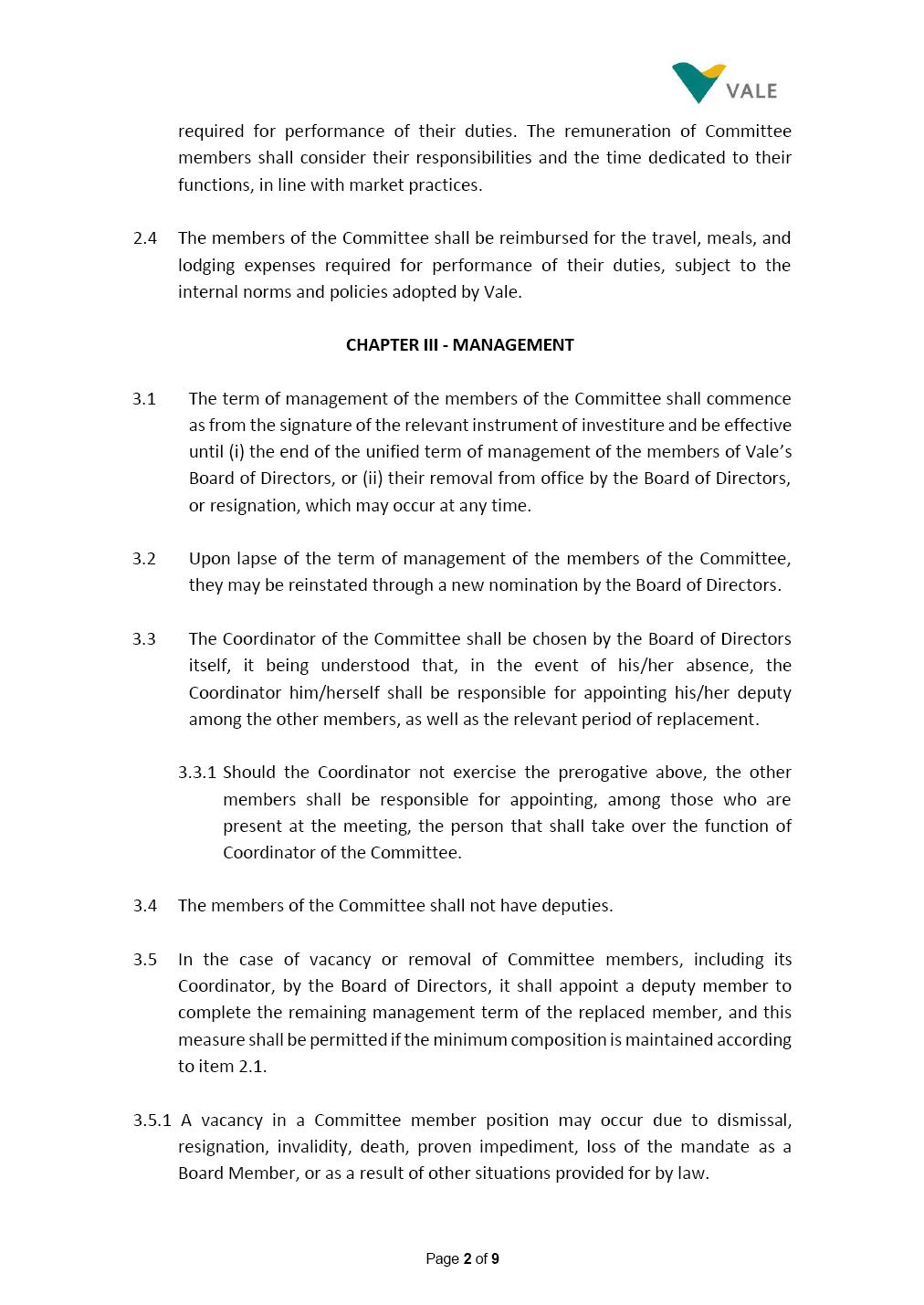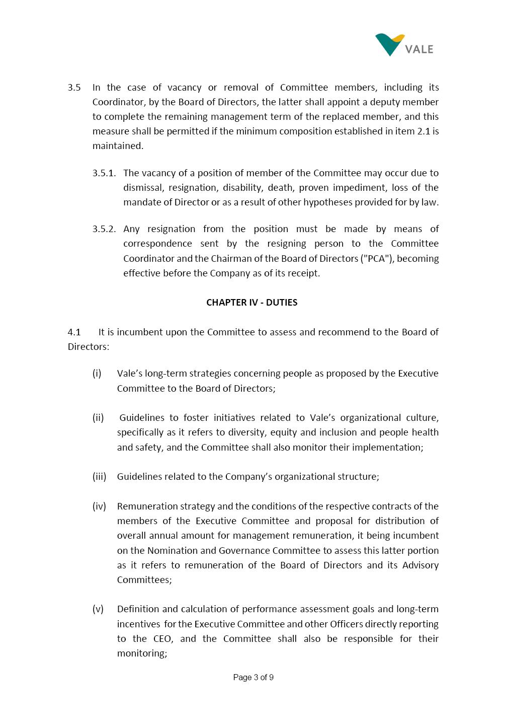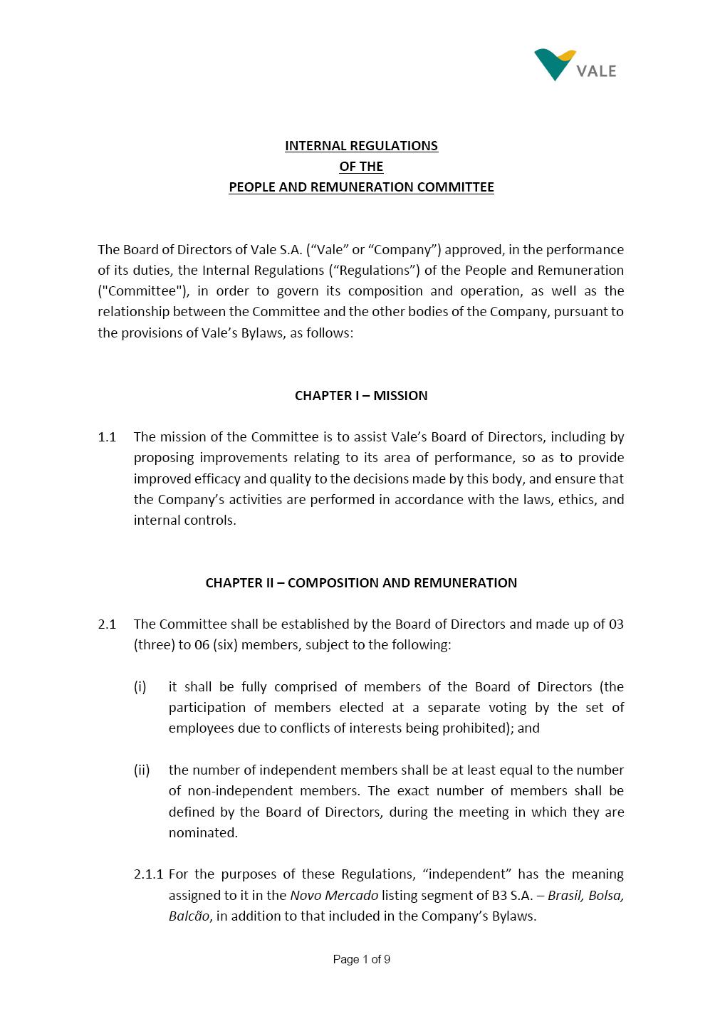 Page 1 of 9 INTERNAL REGULATIONS OF THE PEOPLE AND REMUNERATION COMMITTEE The Board of Directors of Vale S.A. (“Vale” or “Company”) approved, in the performance of its duties, the Internal Regulations (“Regulations”) of the People and Remuneration ("Committee"), in order to govern its composition and operation, as well as the relationship between the Committee and the other bodies of the Company, pursuant to the provisions of Vale’s Bylaws, as follows: CHAPTER I – MISSION 1.1 The mission of the Committee is to assist Vale’s Board of Directors, including by proposing improvements relating to its area of performance, so as to provide improved efficacy and quality to the decisions made by this body, and ensure that the Company’s activities are performed in accordance with the laws, ethics, and internal controls. CHAPTER II – COMPOSITION AND REMUNERATION 2.1 The Committee shall be established by the Board of Directors and made up of 03 (three) to 06 (six) members, subject to the following: (i) it shall be fully comprised of members of the Board of Directors (the participation of members elected at a separate voting by the set of employees due to conflicts of interests being prohibited); and (ii) the number of independent members shall be at least equal to the number of non-independent members. The exact number of members shall be defined by the Board of Directors, during the meeting in which they are nominated. 2.1.1 For the purposes of these Regulations, “independent” has the meaning assigned to it in the Novo Mercado listing segment of B3 S.A. – Brasil, Bolsa, Balcão, in addition to that included in the Company’s Bylaws. Page 2 of 9 2.2 The members of the Committee shall have experience and technical capacity in relation to the matters for which the Committee is responsible. 2.3 The criteria and amounts of global and individual remuneration of the members of the Committee shall be established on a yearly basis by Vale’s Board of Directors upon distribution of the global amount set in the Company’s Annual Shareholders’ Meeting, and such global amount shall not include the reimbursable expenses required for performance of their duties. Remuneration of the members of the Committee shall consider their responsibilities and time spent carrying out their duties, in line with market practices. 2.4 The members of the Committee shall be reimbursed for the travel, meals, and lodging expenses required for the performance of their duties, subject to the internal norms and policies adopted by Vale. CHAPTER III - MANAGEMENT 3.1 The term of management of the members of the Committee shall commence as from the signature of the relevant instrument of investiture and be effective until (i) the end of the unified term of management of the members of Vale’s Board of Directors, or (ii) their removal from office by the Board of Directors, or resignation, which may occur at any time. 3.2 Upon lapse of the term of management of the members of the Committee, they may be reinstated by means of a new nomination by the Board of Directors. 3.3 The Coordinator of the Committee shall be chosen by the Board of Directors, it being understood that, in the event of his/her absence, the Coordinator him/herself shall be responsible for nominating his/her deputy among the other members, as well as the relevant period of replacement. 3.3.1 Should the Coordinator not exercise the prerogative above, the other members shall be responsible for nominating, among those who are present at the meeting, the person that shall take over the function of Coordinator of the Committee. 3.4 The members of the Committee shall not have deputies. Page 3 of 9 3.5 In the case of vacancy or removal of Committee members, including its Coordinator, by the Board of Directors, the latter shall appoint a deputy member to complete the remaining management term of the replaced member, and this measure shall be permitted if the minimum composition established in item 2.1 is maintained. 3.5.1. The vacancy of a position of member of the Committee may occur due to dismissal, resignation, disability, death, proven impediment, loss of the mandate of Director or as a result of other hypotheses provided for by law. 3.5.2. Any resignation from the position must be made by means of correspondence sent by the resigning person to the Committee Coordinator and the Chairman of the Board of Directors ("PCA"), becoming effective before the Company as of its receipt. CHAPTER IV - DUTIES 4.1 It is incumbent upon the Committee to assess and recommend to the Board of Directors: (i) Vale’s long-term strategies concerning people as proposed by the Executive Committee to the Board of Directors; (ii) Guidelines to foster initiatives related to Vale’s organizational culture, specifically as it refers to diversity, equity and inclusion and people health and safety, and the Committee shall also monitor their implementation; (iii) Guidelines related to the Company’s organizational structure; (iv) Remuneration strategy and the conditions of the respective contracts of the members of the Executive Committee and proposal for distribution of overall annual amount for management remuneration, it being incumbent on the Nomination and Governance Committee to assess this latter portion as it refers to remuneration of the Board of Directors and its Advisory Committees; (v) Definition and calculation of performance assessment goals and long-term incentives for the Executive Committee and other Officers directly reporting to the CEO, and the Committee shall also be responsible for their monitoring; Page 4 of 9 (vi) Nomination of the CEO of the Company and, upon his/her recommendation, the other members of the Executive Committee and other Officers directly reporting to the CEO; (vii) The succession plan for the Executive Committee and other Officers directly reporting to the CEO, including their successors, taking into account the experiences and kno
