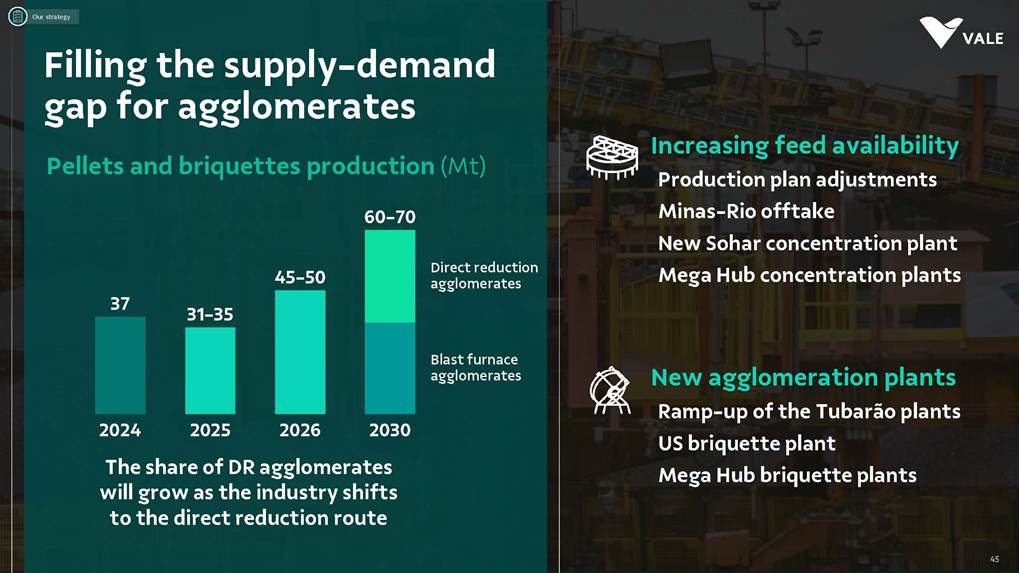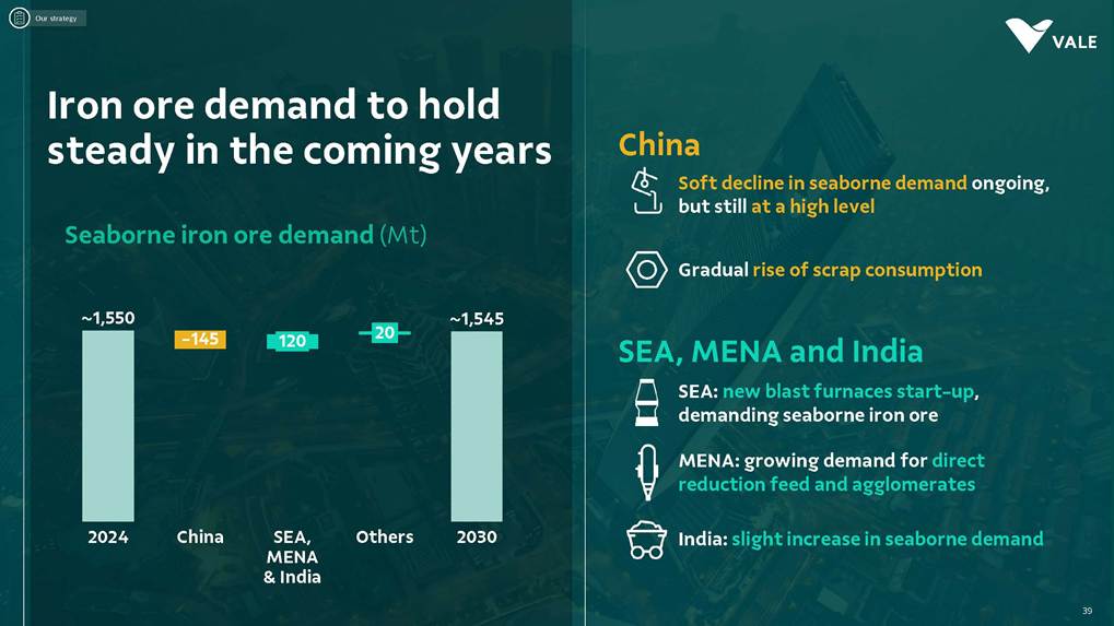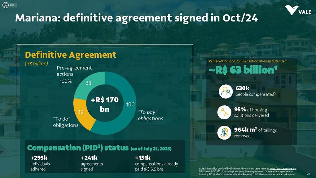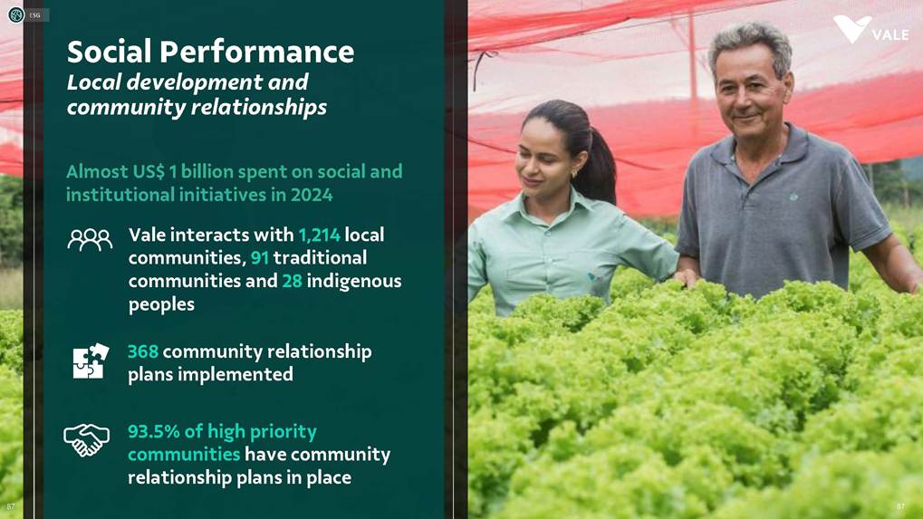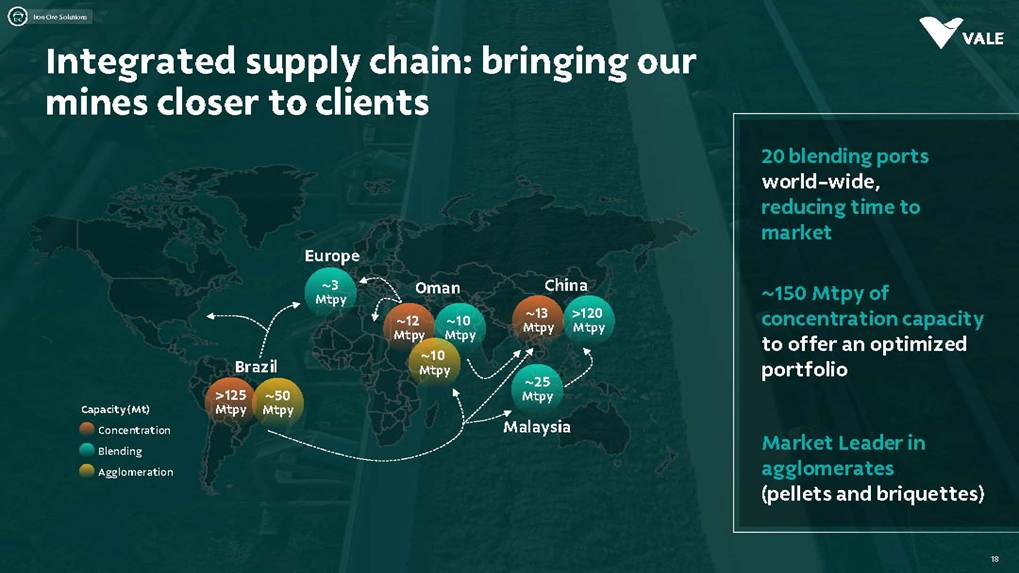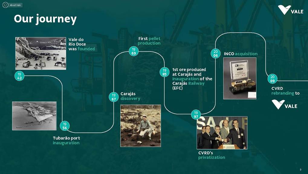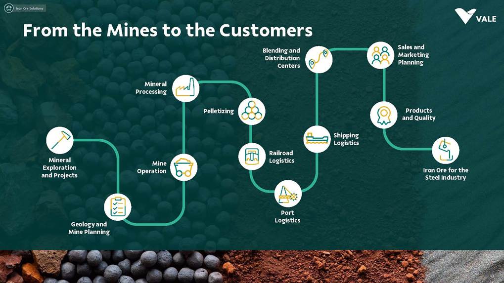 August, 2025 Institutional Presentation Investor RelationsOur Strategy Energy Transition Metals Iron Ore Solutions About Vale 2 ESG Capital AllocationOur Strategy Energy Transition Metals Iron Ore Solutions About Vale 3 ESG Capital Allocation #2 in iron ore production ~20% of seaborne market #6 in nickel production Largest iron ore pellet producer #11 in copper reserves ~20 Bt We are one of the leading Iron ore, Nickel and Copper producers globally About Vale 4 Note: As of 2024.328Mt Iron ore 37Mt Pellets 348kt Copper 160kt Nickel Vale at a glance 2024 Production US$ 38.1 bn Net operating revenue in 2024 Expanded net debt of US$ 18.2 bn as of March 31, 2025 100% of electricity consumed in Brazil from renewable sources US$ 15.4 bn Proforma EBITDA in 2024 US$ 6.0 bn CAPEX in 2024 Industry leader in TRIFR (1.1) in 2024 US$ 3.9 bn in dividends & Interest on Capital paid in 2024 17 of 30 dams Decharacterized as of December 31, 2024 US$ 0.4 bn Disbursed on share buybacks in 2024 Workforce of 64 thousand direct employees in 2024 Key Markets – by revenue (2024) 11% 12% 18% 49% 3% Middle East 3% Rest of the world 4% North America South America Europe Asia ex-China China About Vale 5 Australia Oman U.A.E. Malaysia India Singapore Japan USA Chile Brazil Argentina¹ Peru Canada 6 underground mines UK Netherlands Switzerland China² Northern System Southern System Tubarão Port Iron Quadrangle Itaguaí Port (CPBS) and Guaíba Port (TIG) Carajás Ponta da Madeira Port (PDM) Brazil Iron Quadrangle Vale Worldwide: Located in 19 countries Southeastern System 90% 5% 5% Global Distribution: % of workforce Brazil North America Asia Operation Port Railroad Mega Hub Exploration Joint Venture Offices Headquarter About Vale 6 Note: As of June 2025. ¹ The Argentina office was closed on December 31, 2024. ² We have agreements with 14 ports in China that provide blending services to Vale. Indonesia Saudi Arabia − Majority independent BoD − All BoD members are non-executive directors − Chairman and Vice-Chairman are elected by shareholders − Audit and Risks Committee entirely composed of independent Board members. − Lead Independent Director role − Nominating Committee defines BoD nominees Best governance practices Diversified shareholder base and strong governance 6.0% Treasury 8.7% Previ 6.3% Mitsui&Co 5.9% Blackrock 73.1% Others Shareholder structure Novo Mercado B3's highest corporate governance segment. Vale's shareholder composition July 2025 Stock Exchanges B3 (Brazil) - VALE3 NYSE (ADR) - VALE Shareholders with 5% or more of the total capital Others Note: Previ is a shareholder of Litel Participações S.A. (Litel) and Litela Participações S.A. (Litela), which w r p rt of V ’s form r contro group. B ckrock is r port consi ring Sch u 1 F, fi with th SEC on F b 15, 5, n Br sco’s t b s estimate on December 31, 2024. Treasury: position held by the companies MBR S.A., Vale Holdings B.V. and Vale S.A. The number of shares is presented based on the information contained in the share books of Vale. About Vale 7 Corporate Governance Executive Board Board of Directors1 CEO Gustavo Pimenta Finance & IR EVP Marcelo Bacci IO Operations EVP Carlos Medeiros Commercial and New Business EVP Rogério Nogueira Technical EVP Rafael Bittar People EVP Catia Porto Corporate and External Affairs EVP Alexandre D’Ambrosio Sustainability EVP Grazielle Parenti Click here to access the full information about V ’s Board of Directors and Executive Board. 1 The data takes into account the composition of the Board of Directors on May 7th, 2025. About Vale 8 2.7 years Average Tenure 13 Members 8 (62%) Independent Members 3 Women 4 Racially/ethnically diverse 4 Non Brazilians Our journey 19 42 Vale do Rio Doce was founded 19 56 Tubarão port inauguration Carajás discovery 19 67 19 69 1st ore produced at Carajás and inauguration of the Carajás Railway (EFC) 19 85 CVRD’s privatization 19 97 INCO acquisition 20 06 20 09 CVRD rebranding to About Vale 9 First pellet production Our journey 20 10 Oman operations start-up 20 11 Portfolio: divesting the aluminum business 20 15 Samarco’s dam collapse 20 16 S11D operations start-up 20 17 Governance: Migration to the Novo Mercado 20 18 Portfolio: divesting the fertilizer business 20 19 Portfolio: divesting the manganese business and Brumadinho’s dam collapse 20 21 Portfolio: divesting the coal business 20 23 Briquette operations start up and Base Metals Carve-out 20 24 Vargem Grande and Capanema project start-ups About Vale 10 A focused company with two unique and irreplicable businesses Vale Today Iron Ore Solutions Energy Transition Metals About Vale 11 Our Strategy Energy Transition Metals Iron Ore Solutions About Vale 12 ESG Capital Allocation From the Mines to the Customers Iron Ore Solutions Mineral Exploration and Projects Geology and Mine Planning Mine Operation Mineral Processing Pelletizing Railroad Logistics Port Logistics Shipping Logistics Blending and Distribution Centers Sales and Marketing Planning Products and Quality Iron Ore for the Steel Industry 13 Iron ore fines Carajás fines Brazilian Blend Fines High-silica fines Direct Reduction pellets Blast Furnace pellets − 65% Fe − Low contaminants (silica, alumina and others) − Mined from the Northern System − 62% Fe − Low-alumina − Produced from blending Carajás and high-silica fines − High-sílica iron ore, typically used for blending − Flexible product, with concentration optionality − Mined from the Southern and Southeastern Systems Briquettes Developed by Vale − Agglomerates for direct charge in Direct Reduction Furnaces − Agglomerates for direct charge in Blast Furnaces − Same application as pellets in BF and DR furnaces − Lower CO2 emissions compared to pellet production − Commercial production ramping-up Agglomerates NEW Vale’s mai ir re pr ucts Iron Ore Solutions 14 Southern System PA MG EFC EFVM MRS Ponta da Madeira Port (PDM) - São Luís - MA Tubarão Port - Vito