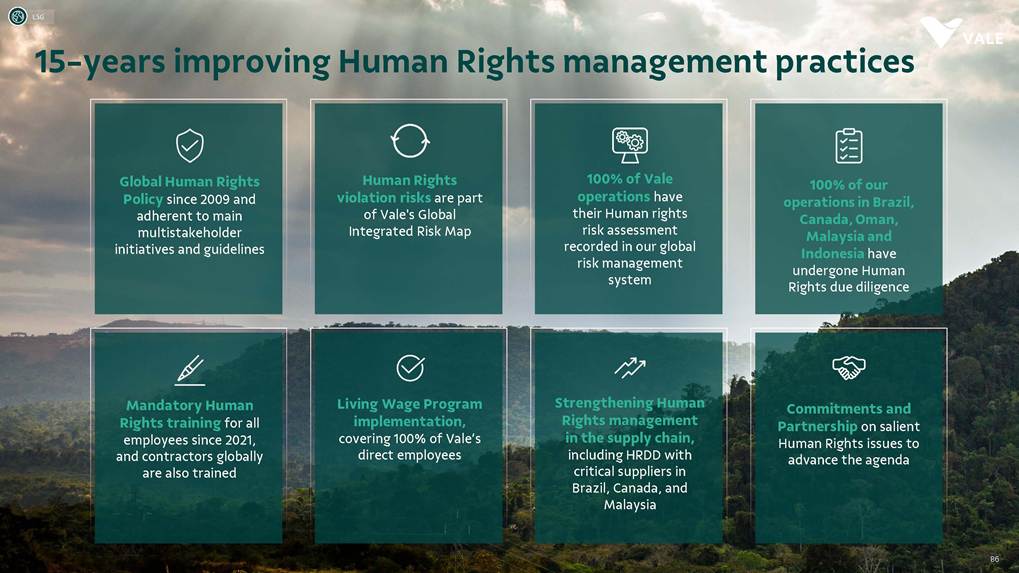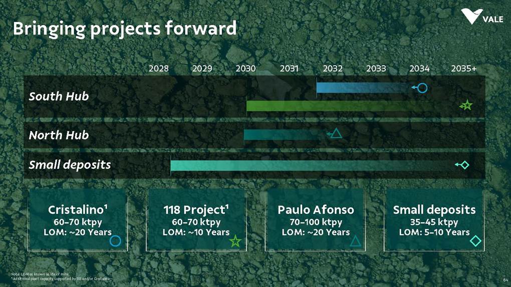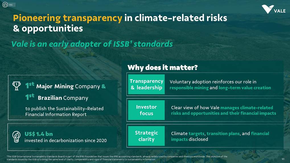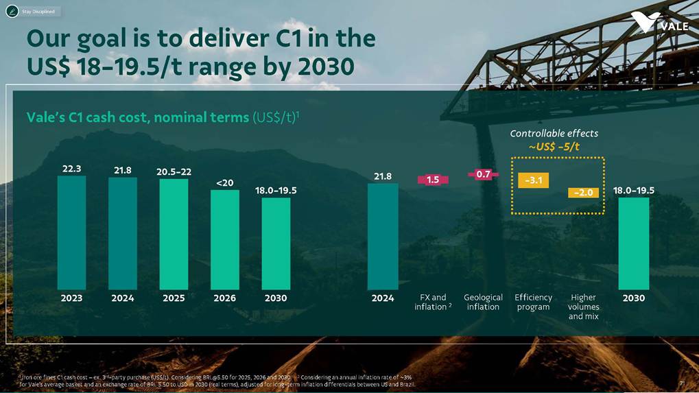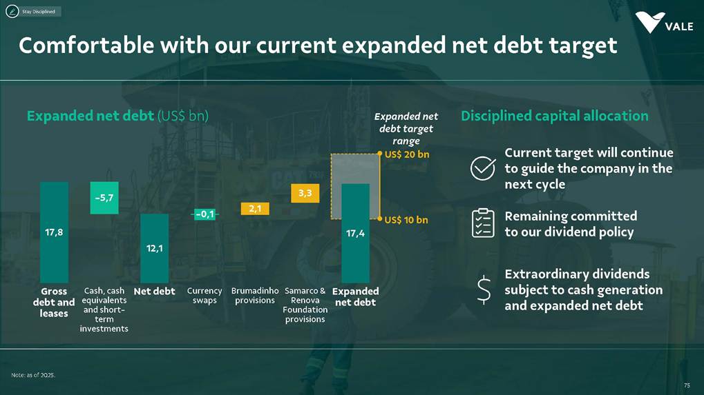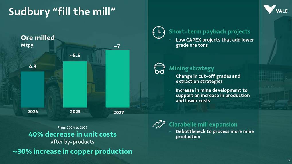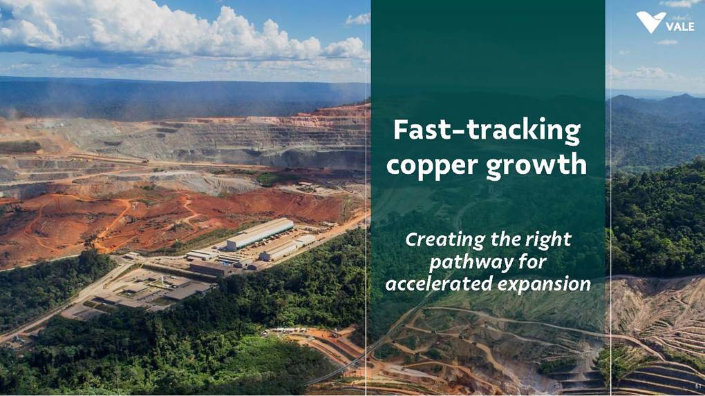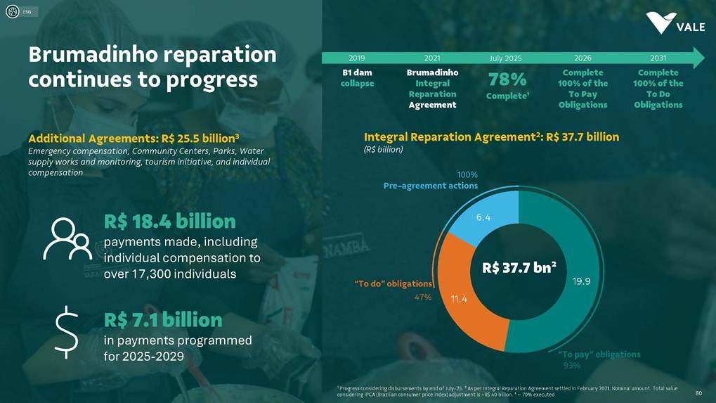 August, 2025 Institutional Presentation Investor RelationsOur Strategy Energy Transition Metals Iron Ore Solutions About Vale 2 ESG Capital AllocationOur Strategy Energy Transition Metals Iron Ore Solutions About Vale 3 ESG Capital Allocation #2 in iron ore production ~20% of seaborne market #6 in nickel production Largest iron ore pellet producer #11 in copper reserves ~20 Bt We are one of the leading Iron ore, Nickel and Copper producers globally About Vale 4 Note: As of 2024.328Mt Iron ore 37Mt Pellets 348kt Copper 160kt Nickel Vale at a glance 2024 Production US$ 38.1 bn Net operating revenue in 2024 Expanded net debt of US$ 18.2 bn as of March 31, 2025 100% of electricity consumed in Brazil from renewable sources US$ 15.4 bn Proforma EBITDA in 2024 US$ 6.0 bn CAPEX in 2024 Industry leader in TRIFR (1.1) in 2024 US$ 3.9 bn in dividends & Interest on Capital paid in 2024 17 of 30 dams Decharacterized as of December 31, 2024 US$ 0.4 bn Disbursed on share buybacks in 2024 Workforce of 64 thousand direct employees in 2024 Key Markets – by revenue (2024) 11% 12% 18% 49% 3% Middle East 3% Rest of the world 4% North America South America Europe Asia ex-China China About Vale 5 Australia Oman U.A.E. Malaysia India Singapore Japan USA Chile Brazil Argentina¹ Peru Canada 6 underground mines UK Netherlands Switzerland China² Northern System Southern System Tubarão Port Iron Quadrangle Itaguaí Port (CPBS) and Guaíba Port (TIG) Carajás Ponta da Madeira Port (PDM) Brazil Iron Quadrangle Vale Worldwide: Located in 19 countries Southeastern System 90% 5% 5% Global Distribution: % of workforce Brazil North America Asia Operation Port Railroad Mega Hub Exploration Joint Venture Offices Headquarter About Vale 6 Note: As of June 2025. ¹ The Argentina office was closed on December 31, 2024. ² We have agreements with 14 ports in China that provide blending services to Vale. Indonesia Saudi Arabia − Majority independent BoD − All BoD members are non-executive directors − Chairman and Vice-Chairman are elected by shareholders − Audit and Risks Committee entirely composed of independent Board members. − Lead Independent Director role − Nominating Committee defines BoD nominees Best governance practices Diversified shareholder base and strong governance 6.0% Treasury 8.7% Previ 6.3% Mitsui&Co 5.9% Blackrock 73.1% Others Shareholder structure Novo Mercado B3's highest corporate governance segment. Vale's shareholder composition July 2025 Stock Exchanges B3 (Brazil) - VALE3 NYSE (ADR) - VALE Shareholders with 5% or more of the total capital Others Note: Previ is a shareholder of Litel Participações S.A. (Litel) and Litela Participações S.A. (Litela), which w r p rt of V ’s form r contro group. B ckrock is r port consi ring Sch u 1 F, fi with th SEC on F b 15, 5, n Br sco’s t b s estimate on December 31, 2024. Treasury: position held by the companies MBR S.A., Vale Holdings B.V. and Vale S.A. The number of shares is presented based on the information contained in the share books of Vale. About Vale 7 Corporate Governance Executive Board Board of Directors1 CEO Gustavo Pimenta Finance & IR EVP Marcelo Bacci IO Operations EVP Carlos Medeiros Commercial and New Business EVP Rogério Nogueira Technical EVP Rafael Bittar People EVP Catia Porto Corporate and External Affairs EVP Alexandre D’Ambrosio Sustainability EVP Grazielle Parenti Click here to access the full information about V ’s Board of Directors and Executive Board. 1 The data takes into account the composition of the Board of Directors on May 7th, 2025. About Vale 8 2.7 years Average Tenure 13 Members 8 (62%) Independent Members 3 Women 4 Racially/ethnically diverse 4 Non Brazilians Our journey 19 42 Vale do Rio Doce was founded 19 56 Tubarão port inauguration Carajás discovery 19 67 19 69 1st ore produced at Carajás and inauguration of the Carajás Railway (EFC) 19 85 CVRD’s privatization 19 97 INCO acquisition 20 06 20 09 CVRD rebranding to About Vale 9 First pellet production Our journey 20 10 Oman operations start-up 20 11 Portfolio: divesting the aluminum business 20 15 Samarco’s dam collapse 20 16 S11D operations start-up 20 17 Governance: Migration to the Novo Mercado 20 18 Portfolio: divesting the fertilizer business 20 19 Portfolio: divesting the manganese business and Brumadinho’s dam collapse 20 21 Portfolio: divesting the coal business 20 23 Briquette operations start up and Base Metals Carve-out 20 24 Vargem Grande and Capanema project start-ups About Vale 10 A focused company with two unique and irreplicable businesses Vale Today Iron Ore Solutions Energy Transition Metals About Vale 11 Our Strategy Energy Transition Metals Iron Ore Solutions About Vale 12 ESG Capital Allocation From the Mines to the Customers Iron Ore Solutions Mineral Exploration and Projects Geology and Mine Planning Mine Operation Mineral Processing Pelletizing Railroad Logistics Port Logistics Shipping Logistics Blending and Distribution Centers Sales and Marketing Planning Products and Quality Iron Ore for the Steel Industry 13 Iron ore fines Carajás fines Brazilian Blend Fines High-silica fines Direct Reduction pellets Blast Furnace pellets − 65% Fe − Low contaminants (silica, alumina and others) − Mined from the Northern System − 62% Fe − Low-alumina − Produced from blending Carajás and high-silica fines − High-sílica iron ore, typically used for blending − Flexible product, with concentration optionality − Mined from the Southern and Southeastern Systems Briquettes Developed by Vale − Agglomerates for direct charge in Direct Reduction Furnaces − Agglomerates for direct charge in Blast Furnaces − Same application as pellets in BF and DR furnaces − Lower CO2 emissions compared to pellet production − Commercial production ramping-up Agglomerates NEW Vale’s mai ir re pr ucts Iron Ore Solutions 14 Southern System PA MG EFC EFVM MRS Ponta da Madeira Port (PDM) - São Luís - MA Tubarão Port - Vito