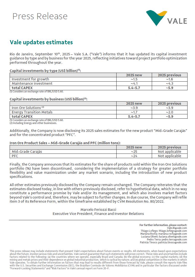 Vale updates estimates Rio de Janeiro, September 10th, 2025 – Vale S.A. (“Vale”) informs that it has updated its capital investment guidance by type and by business for the year 2025, reflecting initiatives toward project portfolio optimization performed throughout the year. Capital investments by type (US$ billion)(1): 2025 new 2025 previous Investment for growth ~1.5 ~1.6 Maintenance investment ~4.1 ~4.3 total CAPEX 5.4-5.7 ~5.9 (1) Considers an exchange rate of BRL/USD 5.60. Capital investments by business (US$ billion)(1): 2025 new 2025 previous Iron Ore Solutions (2) ~3.9 ~3.9 Energy Transition Metals ~1.7 ~2.0 total CAPEX 5.4-5.7 ~5.9 (1) Considers an exchange rate of BRL/USD 5.60. (2) Including Energy and other businesses. Additionally, the Company is now disclosing its 2025 sales estimates for the new product “Mid-Grade Carajás” and for the concentrated product “PFC”. Iron Ore Product Sales – Mid-Grade Carajás and PFC (million tons): 2025 new 2025 previous Mid-Grade Carajás ~25 Not applicable PFC ~24 Not applicable Finally, the Company announces that its estimates for the share of products sold within the Iron Ore Solutions portfolio (%) have been discontinued, considering the implementation of a strategy for greater portfolio flexibility and value maximization under any market scenario, including the introduction of new product specifications. All other estimates previously disclosed by the Company remain unchanged. The Company reiterates that the estimates disclosed today, in line with others previously disclosed, refer to hypothetical data, which in no way constitute a performance promise by Vale and/or its management, and which also involves market factors beyond Vale’s control and, therefore, may be subject to further changes. In due course, the Company will refile item 3 of its Reference Form, within the timeframe established by CVM Resolution No. 80/2022. Marcelo Feriozzi Bacci Executive Vice President, Finance and Investor Relations For further information, please contact: Vale.RI@vale.com Thiago Lofiego: thiago.lofiego@vale.com Mariana Rocha: mariana.rocha@vale.com Luciana Oliveti: luciana.oliveti@vale.com Pedro Terra: pedro.terra@vale.com Patricia Tinoco: patricia.tinoco@vale.com This press release may include statements that present Vale’s expectations about future events or results. All statements, when based upon expectations about the future, involve various risks and uncertainties. Vale cannot guarantee that such statements will prove correct. These risks and uncertainties include factors related to the following: (a) the countries where we operate, especially Brazil and Canada; (b) the global economy; (c) the capital markets; (d) the mining and metals prices and their dependence on global industrial production, which is cyclical by nature; and (e) global competition in the markets in which Vale operates. To obtain further information on factors that may lead to results different from those forecast by Vale, please consult the reports Vale files with the U.S. Securities and Exchange Commission (SEC), the Brazilian Comissão de Valores Mobiliários (CVM) and in particular the factors discussed under “Forward-Looking Statements” and “Risk Factors” in Vale’s annual report on Form 20-F. Press Release