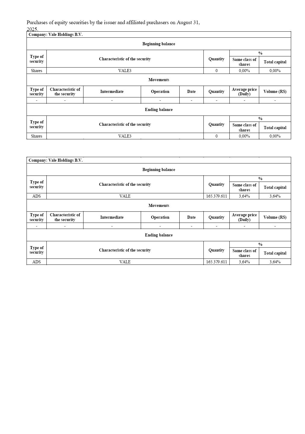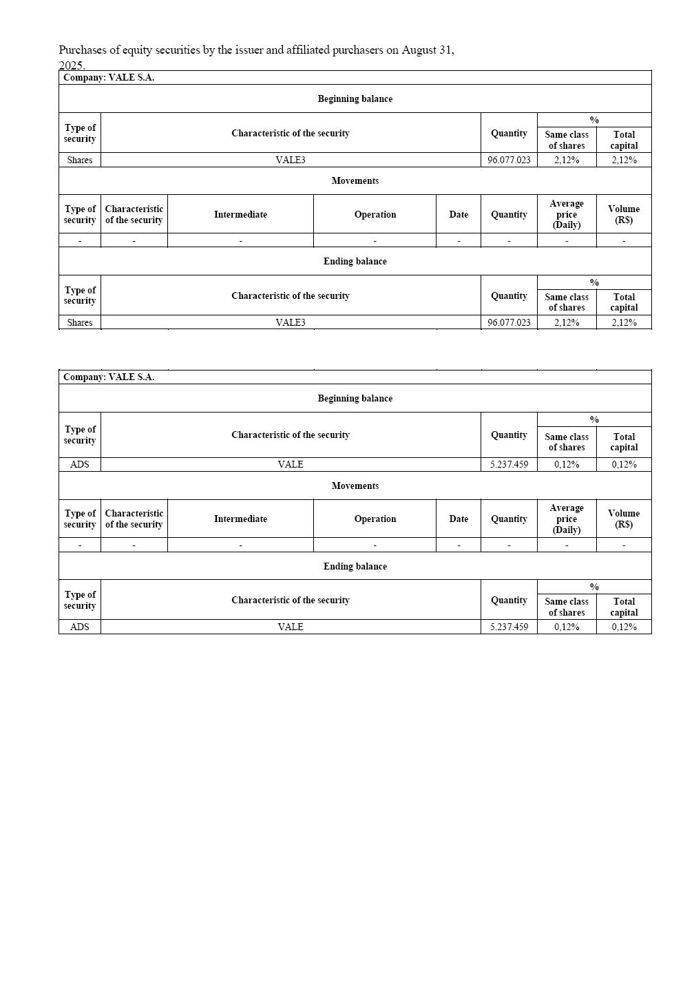 Purchases of equity securities by the issuer and affiliated purchasers on August 31, 2025. Company: VALE S.A. Beginning balance Type of security Characteristic of the security Quantity % Same class of shares Total capital Shares VALE3 96.077.023 2,12% 2,12% Movements Type of security Characteristic of the security Intermediate Operation Date Quantity Average price (Daily) Volume (R$) - - - - - - - - Ending balance Type of security Characteristic of the security Quantity % Same class of shares Total capital Shares VALE3 96.077.023 2,12% 2,12% Company: VALE S.A. Beginning balance Type of security Characteristic of the security Quantity % Same class of shares Total capital ADS VALE 5.237.459 0,12% 0,12% Movements Type of security Characteristic of the security Intermediate Operation Date Quantity Average price (Daily) Volume (R$) - - - - - - - - Ending balance Type of security Characteristic of the security Quantity % Same class of shares Total capital ADS VALE 5.237.459 0,12% 0,12% Purchases of equity securities by the issuer and affiliated purchasers on August 31, 2025. Company: MBR S.A. Beginning balance Type of security Characteristic of the security Quantity % Same class of shares Total capital Shares VALE3 3.534.700 0,08% 0,08% Movements Type of security Characteristic of the security Intermediate Operation Date Quantity Average price (Daily) Volume (R$) - - - - - - - - Ending balance Type of security Characteristic of the security Quantity % Same class of shares Total capital Shares VALE3 3.534.700 0,08% 0,08% Company: MBR S.A. Beginning balance Type of security Characteristic of the security Quantity % Same class of shares Total capital ADS VALE 0 0,00% 0,00% Movements Type of security Characteristic of the security Intermediate Operation Date Quantity Average price (Daily) Volume (R$) - - - - - - - - Ending balance Type of security Characteristic of the security Quantity % Same class of shares Total capital ADS VALE 0 0,00% 0,00% Purchases of equity securities by the issuer and affiliated purchasers on August 31, 2025. Company: Vale Holdings B.V. Beginning balance Type of security Characteristic of the security Quantity % Same class of shares Total capital Shares VALE3 0 0,00% 0,00% Movements Type of security Characteristic of the security Intermediate Operation Date Quantity Average price (Daily) Volume (R$) - - - - - - - - Ending balance Type of security Characteristic of the security Quantity % Same class of shares Total capital Shares VALE3 0 0,00% 0,00% Company: Vale Holdings B.V. Beginning balance Type of security Characteristic of the security Quantity % Same class of shares Total capital ADS VALE 165.379.611 3,64% 3,64% Movements Type of security Characteristic of the security Intermediate Operation Date Quantity Average price (Daily) Volume (R$) - - - - - - - - Ending balance Type of security Characteristic of the security Quantity % Same class of shares Total capital ADS VALE 165.379.611 3,64% 3,64%