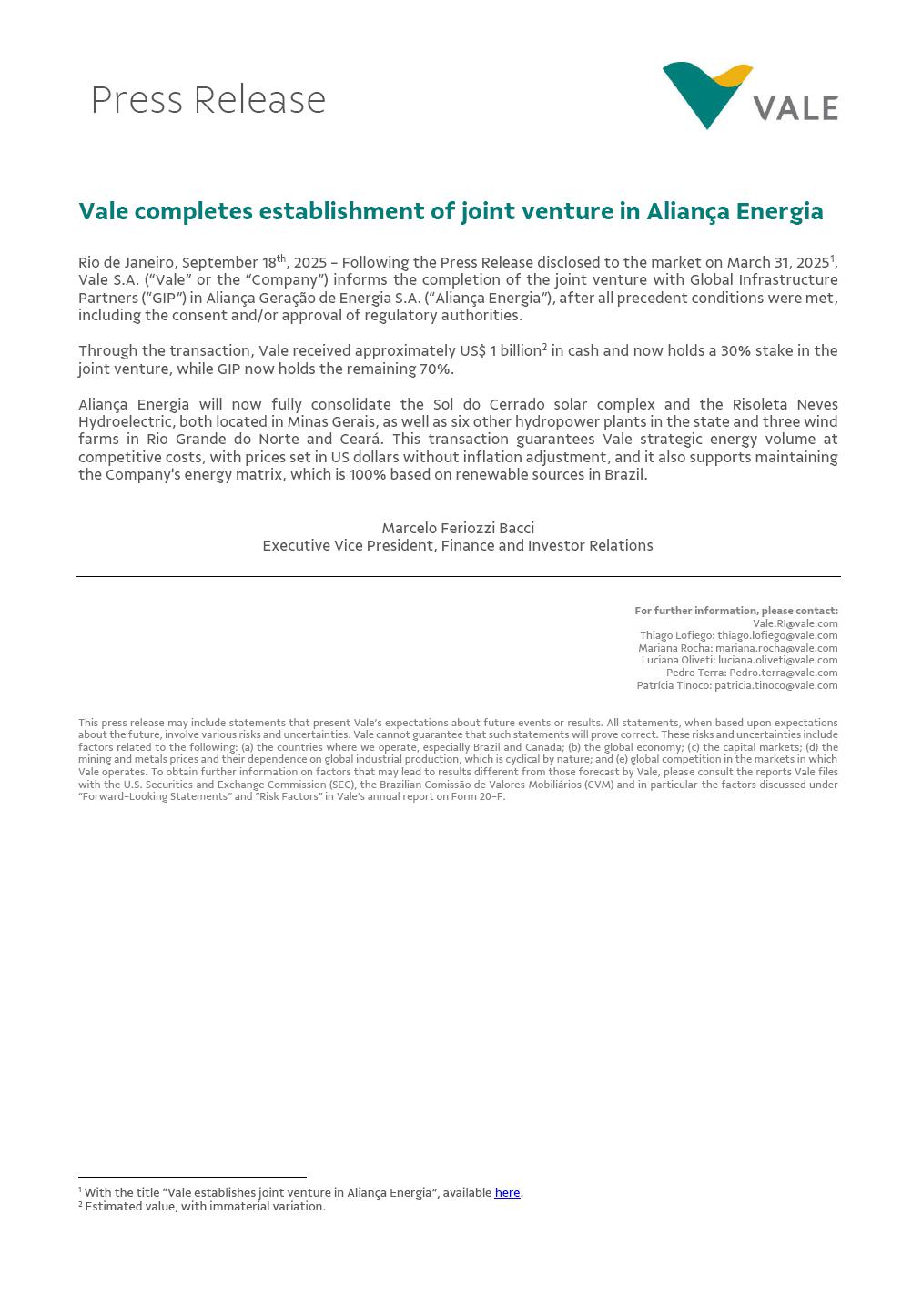 Vale completes establishment of joint venture in Aliança Energia Rio de Janeiro, September 18th, 2025 - Following the Press Release disclosed to the market on March 31, 20251, Vale S.A. (“Vale” or the “Company”) informs the completion of the joint venture with Global Infrastructure Partners (“GIP”) in Aliança Geração de Energia S.A. (“Aliança Energia”), after all precedent conditions were met, including the consent and/or approval of regulatory authorities. Through the transaction, Vale received approximately US$ 1 billion2 in cash and now holds a 30% stake in the joint venture, while GIP now holds the remaining 70%. Aliança Energia will now fully consolidate the Sol do Cerrado solar complex and the Risoleta Neves Hydroelectric, both located in Minas Gerais, as well as six other hydropower plants in the state and three wind farms in Rio Grande do Norte and Ceará. This transaction guarantees Vale strategic energy volume at competitive costs, with prices set in US dollars without inflation adjustment, and it also supports maintaining the Company's energy matrix, which is 100% based on renewable sources in Brazil. Marcelo Feriozzi Bacci Executive Vice President, Finance and Investor Relations For further information, please contact: Vale.RI@vale.com Thiago Lofiego: thiago.lofiego@vale.com Mariana Rocha: mariana.rocha@vale.com Luciana Oliveti: luciana.oliveti@vale.com Pedro Terra: Pedro.terra@vale.com Patrícia Tinoco: patricia.tinoco@vale.com This press release may include statements that present Vale’s expectations about future events or results. All statements, when based upon expectations about the future, involve various risks and uncertainties. Vale cannot guarantee that such statements will prove correct. These risks and uncertainties include factors related to the following: (a) the countries where we operate, especially Brazil and Canada; (b) the global economy; (c) the capital markets; (d) the mining and metals prices and their dependence on global industrial production, which is cyclical by nature; and (e) global competition in the markets in which Vale operates. To obtain further information on factors that may lead to results different from those forecast by Vale, please consult the reports Vale files with the U.S. Securities and Exchange Commission (SEC), the Brazilian Comissão de Valores Mobiliários (CVM) and in particular the factors discussed under “Forward-Looking Statements” and “Risk Factors” in Vale’s annual report on Form 20-F. 1 With the title “Vale establishes joint venture in Aliança Energia”, available here. 2 Estimated value, with immaterial variation. Press Release