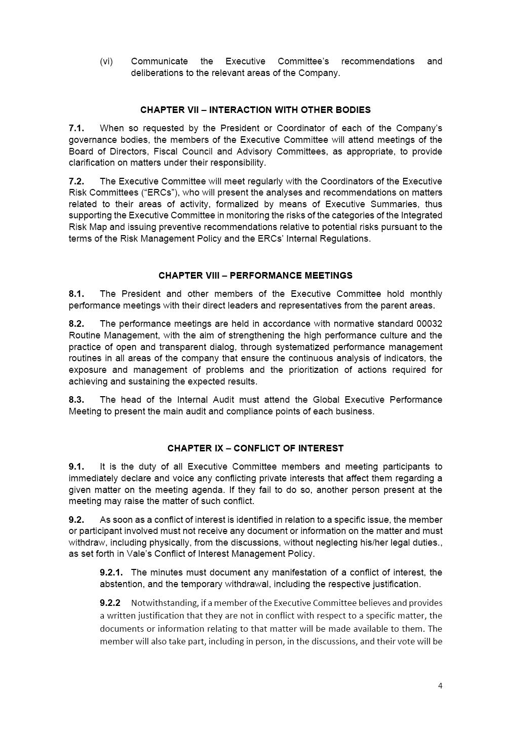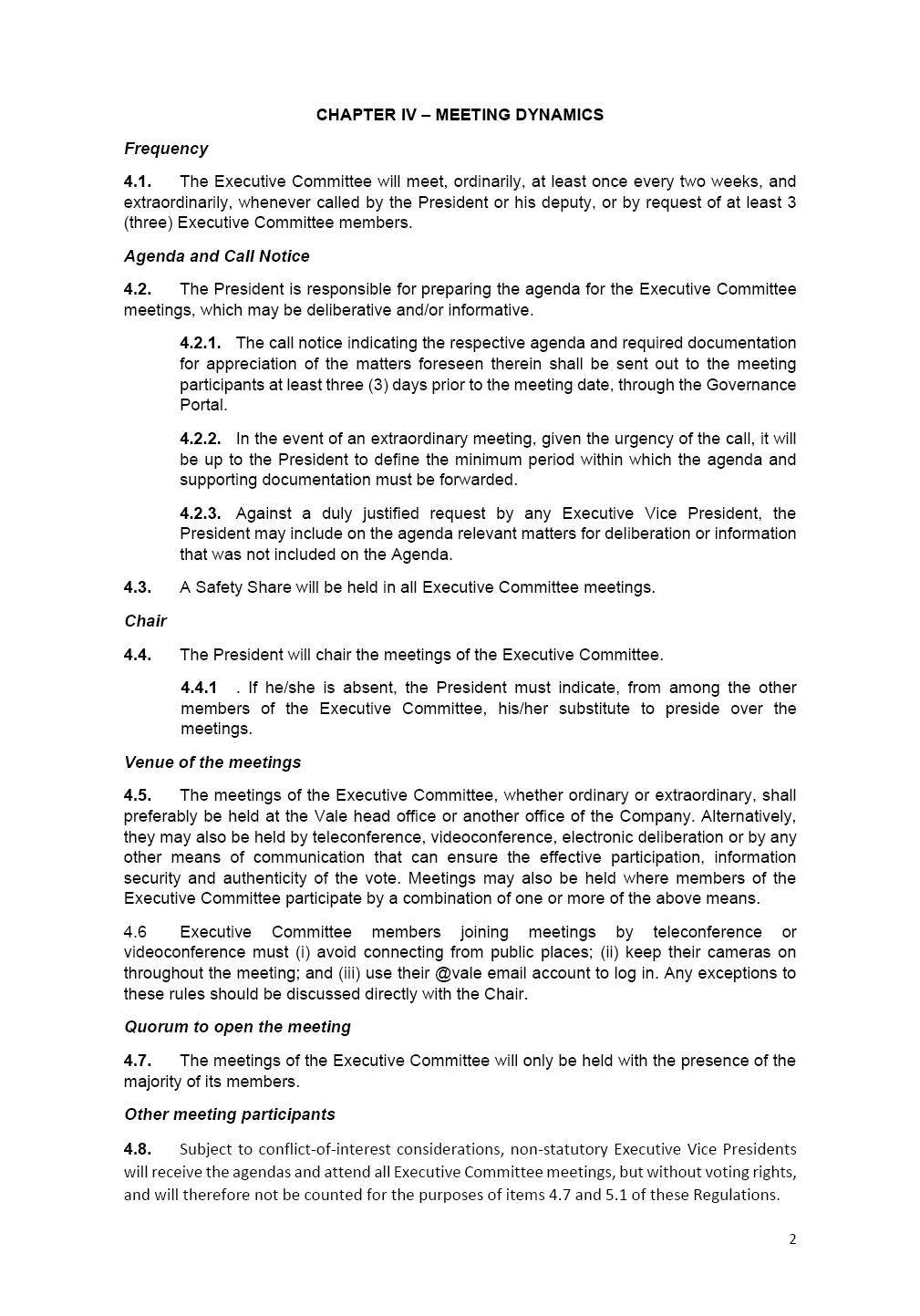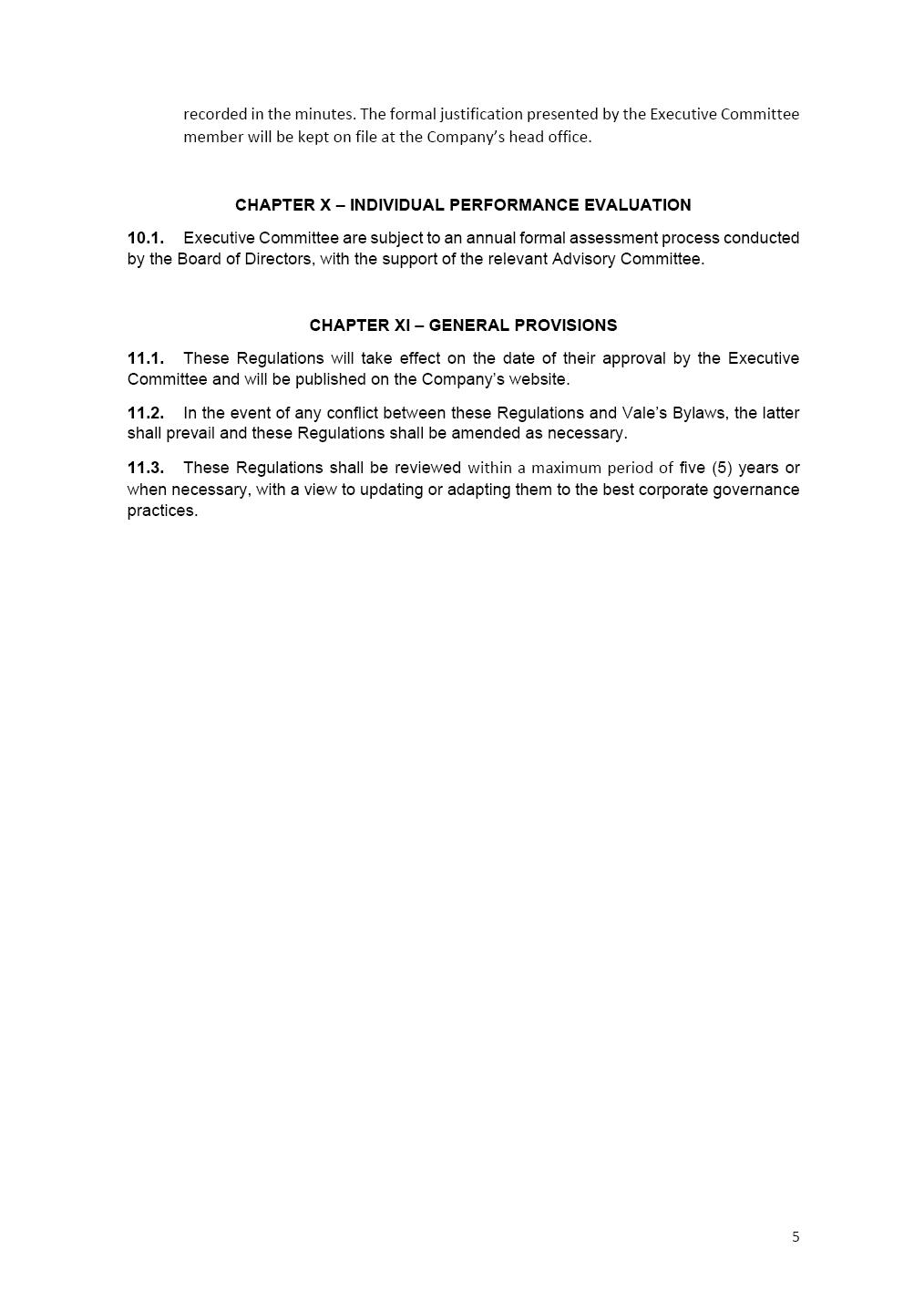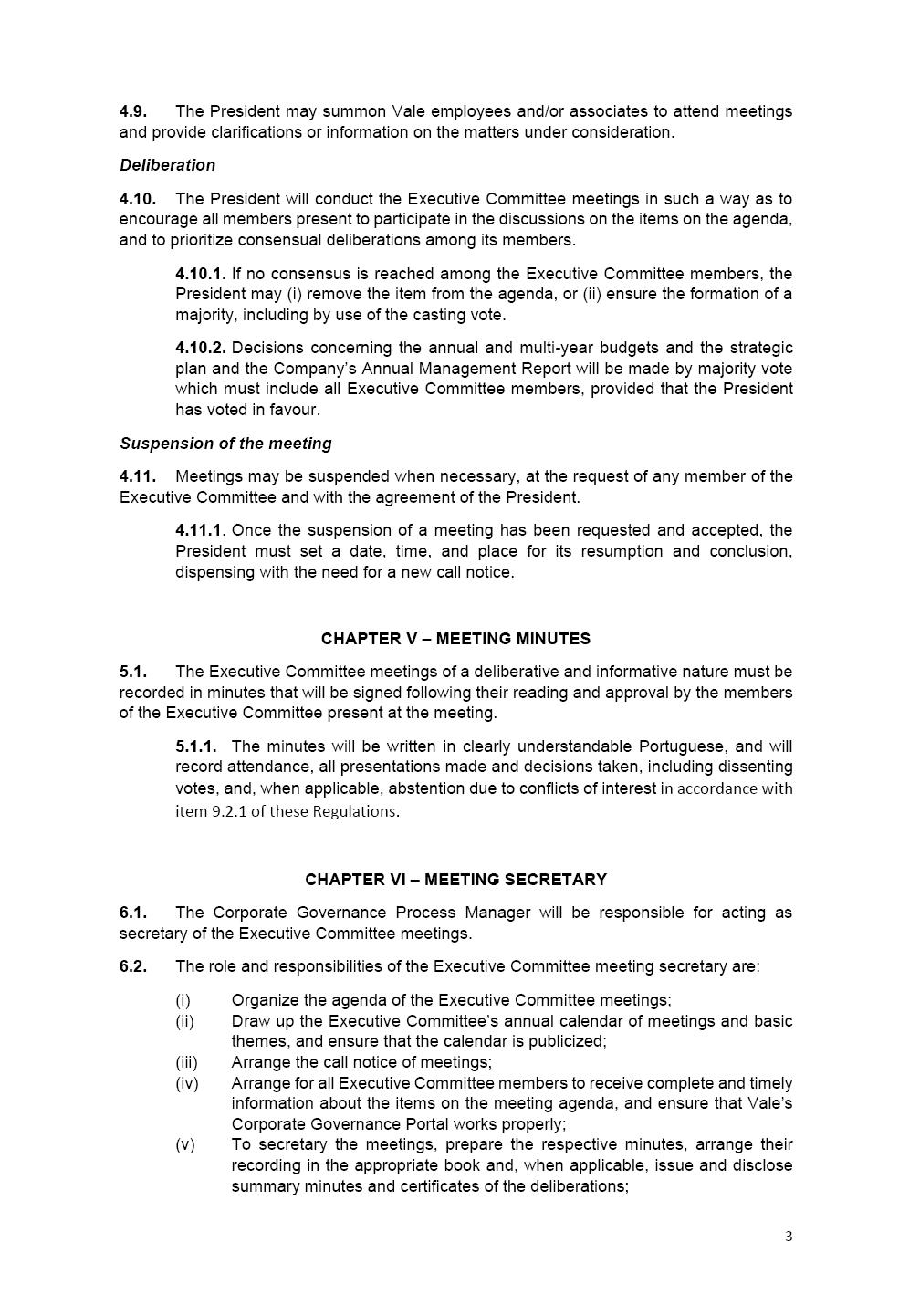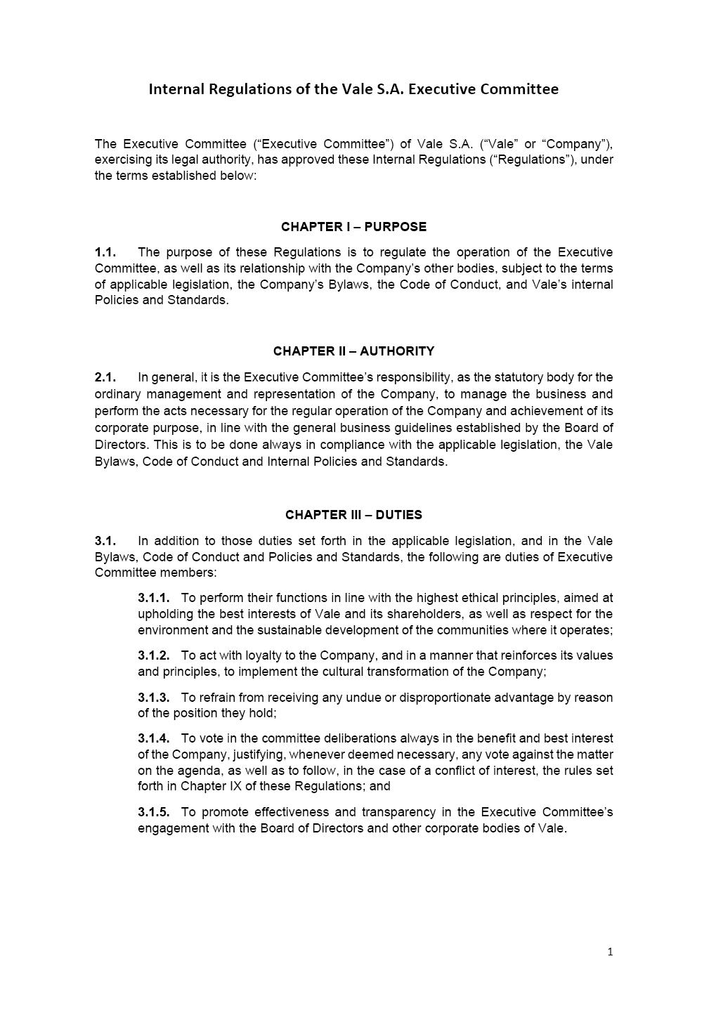 1 Internal Regulations of the Vale S.A. Executive Committee The Executive Committee (“Executive Committee”) of Vale S.A. (“Vale” or “Company”), exercising its legal authority, has approved these Internal Regulations (“Regulations”), under the terms established below: CHAPTER I – PURPOSE 1.1. The purpose of these Regulations is to regulate the operation of the Executive Committee, as well as its relationship with the Company’s other bodies, subject to the terms of applicable legislation, the Company’s Bylaws, the Code of Conduct, and Vale’s internal Policies and Standards. CHAPTER II – AUTHORITY 2.1. In general, it is the Executive Committee’s responsibility, as the statutory body for the ordinary management and representation of the Company, to manage the business and perform the acts necessary for the regular operation of the Company and achievement of its corporate purpose, in line with the general business guidelines established by the Board of Directors. This is to be done always in compliance with the applicable legislation, the Vale Bylaws, Code of Conduct and Internal Policies and Standards. CHAPTER III – DUTIES 3.1. In addition to those duties set forth in the applicable legislation, and in the Vale Bylaws, Code of Conduct and Policies and Standards, the following are duties of Executive Committee members: 3.1.1. To perform their functions in line with the highest ethical principles, aimed at upholding the best interests of Vale and its shareholders, as well as respect for the environment and the sustainable development of the communities where it operates; 3.1.2. To act with loyalty to the Company, and in a manner that reinforces its values and principles, to implement the cultural transformation of the Company; 3.1.3. To refrain from receiving any undue or disproportionate advantage by reason of the position they hold; 3.1.4. To vote in the committee deliberations always in the benefit and best interest of the Company, justifying, whenever deemed necessary, any vote against the matter on the agenda, as well as to follow, in the case of a conflict of interest, the rules set forth in Chapter IX of these Regulations; and 3.1.5. To promote effectiveness and transparency in the Executive Committee’s engagement with the Board of Directors and other corporate bodies of Vale. 2 CHAPTER IV – MEETING DYNAMICS Frequency 4.1. The Executive Committee will meet, ordinarily, at least once every two weeks, and extraordinarily, whenever called by the President or his deputy, or by request of at least 3 (three) Executive Committee members. Agenda and Call Notice 4.2. The President is responsible for preparing the agenda for the Executive Committee meetings, which may be deliberative and/or informative. 4.2.1. The call notice indicating the respective agenda and required documentation for appreciation of the matters foreseen therein shall be sent out to the meeting participants at least three (3) days prior to the meeting date, through the Governance Portal. 4.2.2. In the event of an extraordinary meeting, given the urgency of the call, it will be up to the President to define the minimum period within which the agenda and supporting documentation must be forwarded. 4.2.3. Against a duly justified request by any Executive Vice President, the President may include on the agenda relevant matters for deliberation or information that was not included on the Agenda. 4.3. A Safety Share will be held in all Executive Committee meetings. Chair 4.4. The President will chair the meetings of the Executive Committee. 4.4.1 . If he/she is absent, the President must indicate, from among the other members of the Executive Committee, his/her substitute to preside over the meetings. Venue of the meetings 4.5. The meetings of the Executive Committee, whether ordinary or extraordinary, shall preferably be held at the Vale head office or another office of the Company. Alternatively, they may also be held by teleconference, videoconference, electronic deliberation or by any other means of communication that can ensure the effective participation, information security and authenticity of the vote. Meetings may also be held where members of the Executive Committee participate by a combination of one or more of the above means. 4.6 Executive Committee members joining meetings by teleconference or videoconference must (i) avoid connecting from public places; (ii) keep their cameras on throughout the meeting; and (iii) use their @vale email account to log in. Any exceptions to these rules should be discussed directly with the Chair. Quorum to open the meeting 4.7. The meetings of the Executive Committee will only be held with the presence of the majority of its members. Other meeting participants 4.8. Subject to conflict-of-interest considerations, non-statutory Executive Vice Presidents will receive the agendas and attend all Executive Committee meetings, but without voting rights, and will therefore not be counted for the purposes of items 4.7 and 5.1 of these Regulations. 3 4.9. The President may summon Vale employees and/or associates to attend meetings and provide clarifications or information on the matters under consideration. Deliberation 4.10. The President will conduct the Executive Committee meetings in such a way as to encourage all members present to participate in the discussions on the items on the agenda, and to prioritize consensual deliberations among its members. 4.10.1. If no consensus is reached among the Executive Committee members, the President may (i) remove the item from the agenda, or (ii) ensure the formation of a majority, including by use of the casting vote. 4.10.2. Decisions concerning the annual and multi-year budgets and the strategic plan and the Company’s Annual Management Report will be made by majority vote which must include all Executive Committee members, provided that the President has voted in favour. Suspension of the meeting 4.11. Meetings ma