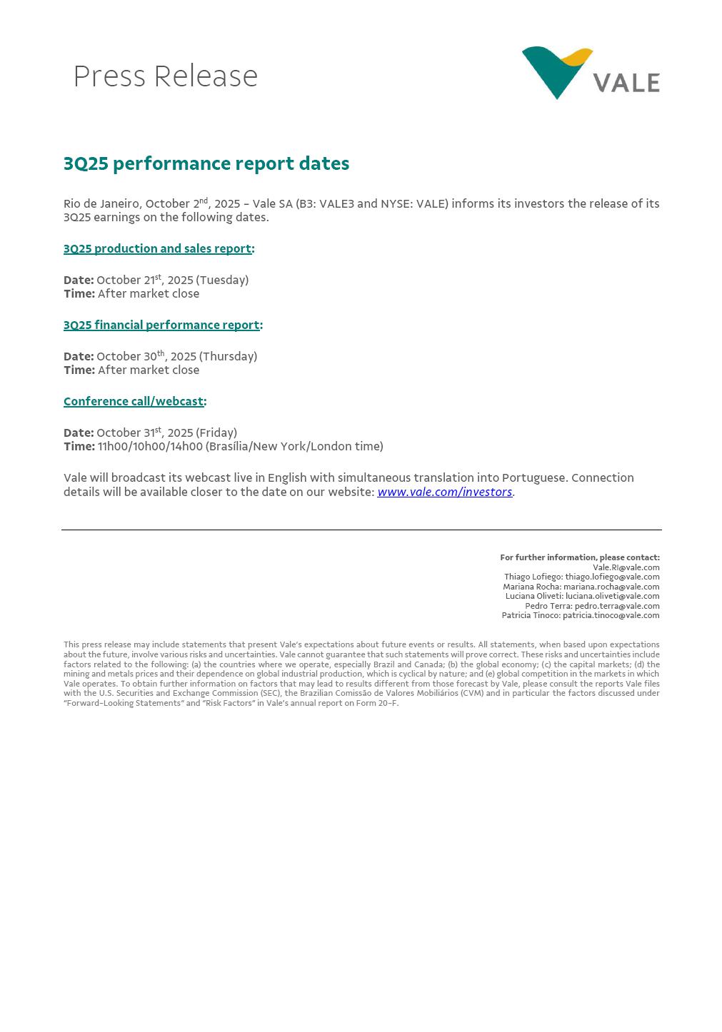 3Q25 performance report dates Rio de Janeiro, October 2nd, 2025 - Vale SA (B3: VALE3 and NYSE: VALE) informs its investors the release of its 3Q25 earnings on the following dates. 3Q25 production and sales report: Date: October 21st, 2025 (Tuesday) Time: After market close 3Q25 financial performance report: Date: October 30th, 2025 (Thursday) Time: After market close Conference call/webcast: Date: October 31st, 2025 (Friday) Time: 11h00/10h00/14h00 (Brasília/New York/London time) Vale will broadcast its webcast live in English with simultaneous translation into Portuguese. Connection details will be available closer to the date on our website: www.vale.com/investors. For further information, please contact: Vale.RI@vale.com Thiago Lofiego: thiago.lofiego@vale.com Mariana Rocha: mariana.rocha@vale.com Luciana Oliveti: luciana.oliveti@vale.com Pedro Terra: pedro.terra@vale.com Patricia Tinoco: patricia.tinoco@vale.com This press release may include statements that present Vale’s expectations about future events or results. All statements, when based upon expectations about the future, involve various risks and uncertainties. Vale cannot guarantee that such statements will prove correct. These risks and uncertainties include factors related to the following: (a) the countries where we operate, especially Brazil and Canada; (b) the global economy; (c) the capital markets; (d) the mining and metals prices and their dependence on global industrial production, which is cyclical by nature; and (e) global competition in the markets in which Vale operates. To obtain further information on factors that may lead to results different from those forecast by Vale, please consult the reports Vale files with the U.S. Securities and Exchange Commission (SEC), the Brazilian Comissão de Valores Mobiliários (CVM) and in particular the factors discussed under “Forward-Looking Statements” and “Risk Factors” in Vale’s annual report on Form 20-F. Press Release