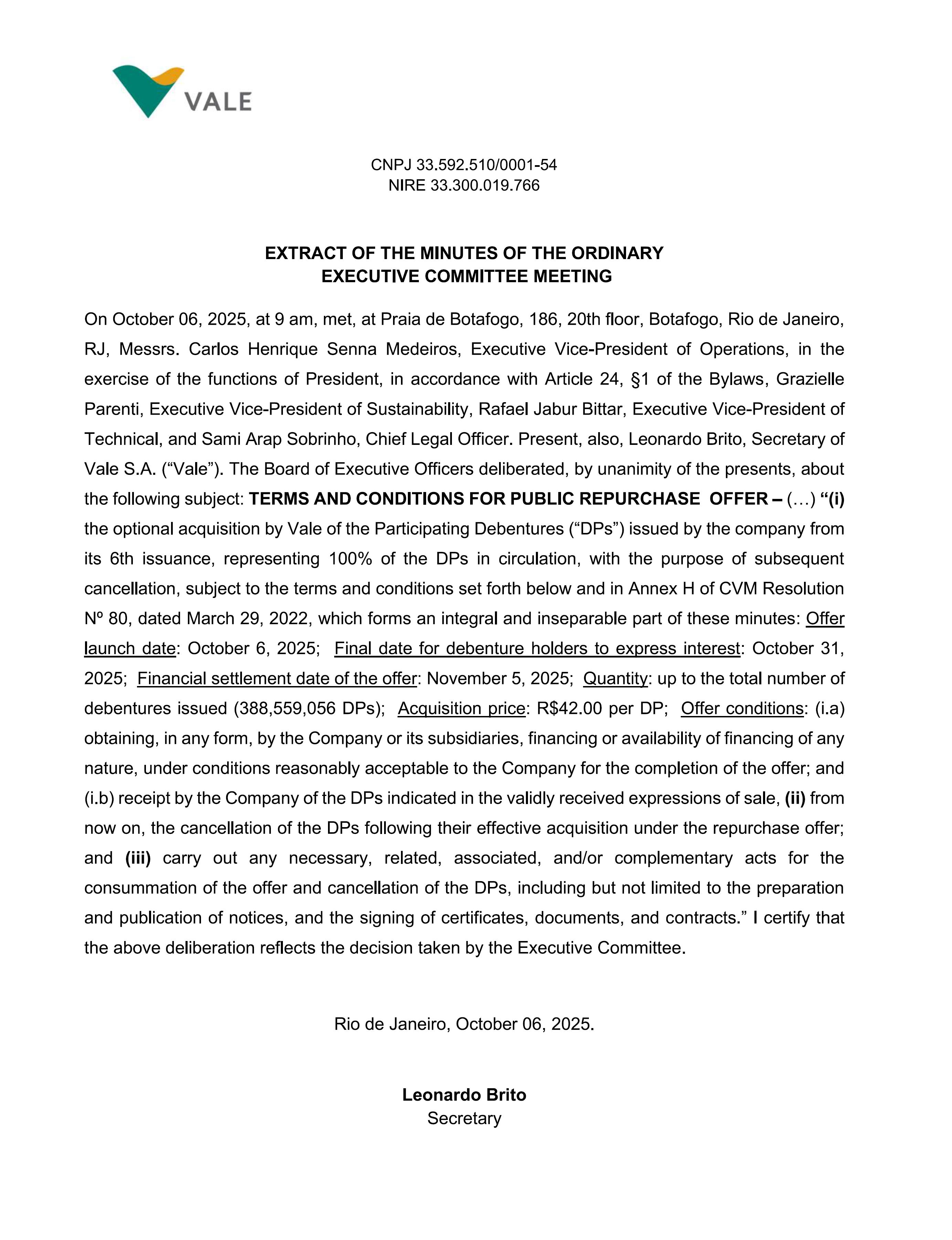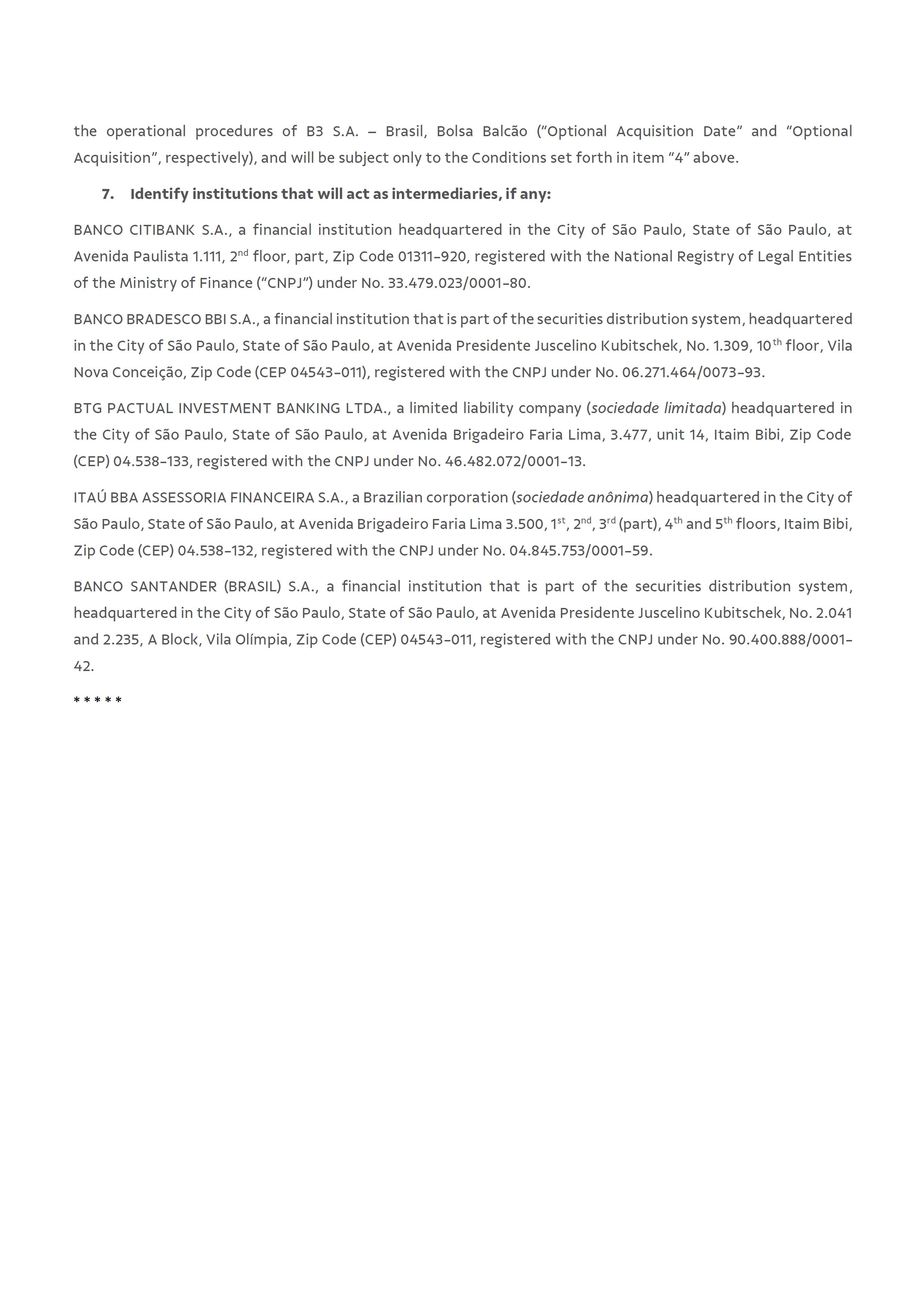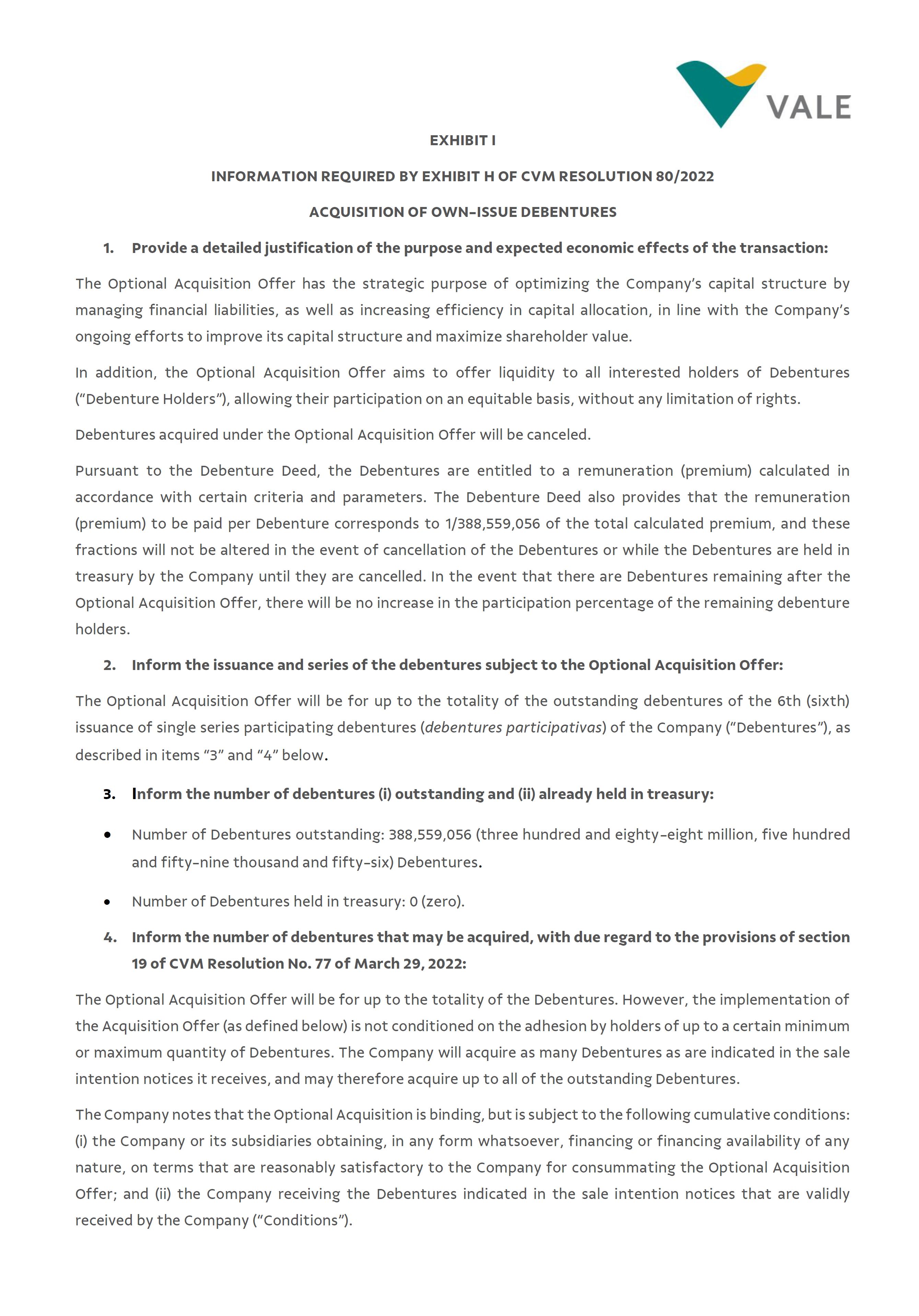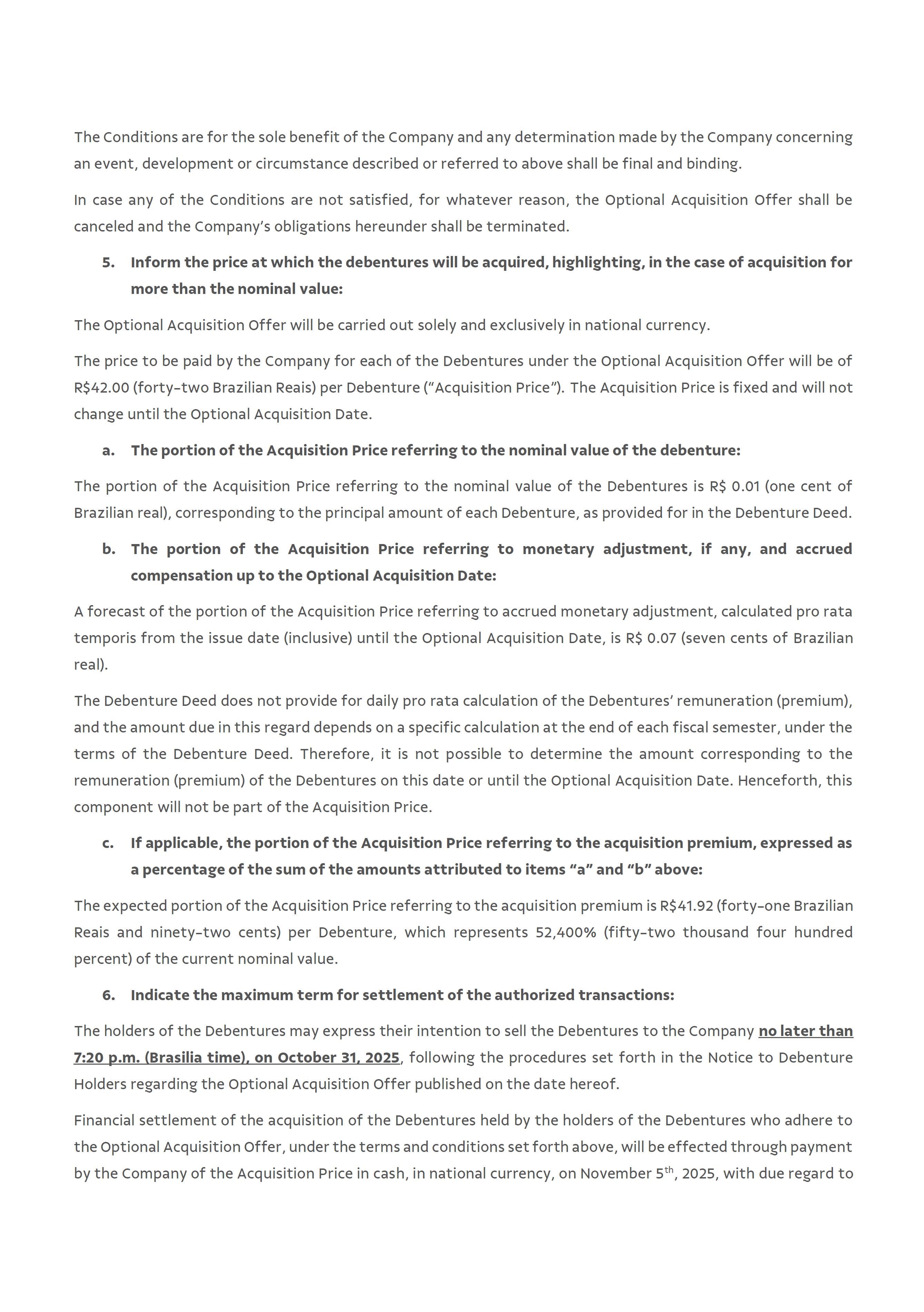 EXHIBIT I INFORMATION REQUIRED BY EXHIBIT H OF CVM RESOLUTION 80/2022 ACQUISITION OF OWN-ISSUE DEBENTURES 1. Provide a detailed justification of the purpose and expected economic effects of the transaction: The Optional Acquisition Offer has the strategic purpose of optimizing the Company’s capital structure by managing financial liabilities, as well as increasing efficiency in capital allocation, in line with the Company’s ongoing efforts to improve its capital structure and maximize shareholder value. In addition, the Optional Acquisition Offer aims to offer liquidity to all interested holders of Debentures (“Debenture Holders”), allowing their participation on an equitable basis, without any limitation of rights. Debentures acquired under the Optional Acquisition Offer will be canceled. Pursuant to the Debenture Deed, the Debentures are entitled to a remuneration (premium) calculated in accordance with certain criteria and parameters. The Debenture Deed also provides that the remuneration (premium) to be paid per Debenture corresponds to 1/388,559,056 of the total calculated premium, and these fractions will not be altered in the event of cancellation of the Debentures or while the Debentures are held in treasury by the Company until they are cancelled. In the event that there are Debentures remaining after the Optional Acquisition Offer, there will be no increase in the participation percentage of the remaining debenture holders. 2. Inform the issuance and series of the debentures subject to the Optional Acquisition Offer: The Optional Acquisition Offer will be for up to the totality of the outstanding debentures of the 6th (sixth) issuance of single series participating debentures (debentures participativas) of the Company (“Debentures”), as described in items “3” and “4” below. 3. Inform the number of debentures (i) outstanding and (ii) already held in treasury: • Number of Debentures outstanding: 388,559,056 (three hundred and eighty-eight million, five hundred and fifty-nine thousand and fifty-six) Debentures. • Number of Debentures held in treasury: 0 (zero). 4. Inform the number of debentures that may be acquired, with due regard to the provisions of section 19 of CVM Resolution No. 77 of March 29, 2022: The Optional Acquisition Offer will be for up to the totality of the Debentures. However, the implementation of the Acquisition Offer (as defined below) is not conditioned on the adhesion by holders of up to a certain minimum or maximum quantity of Debentures. The Company will acquire as many Debentures as are indicated in the sale intention notices it receives, and may therefore acquire up to all of the outstanding Debentures. The Company notes that the Optional Acquisition is binding, but is subject to the following cumulative conditions: (i) the Company or its subsidiaries obtaining, in any form whatsoever, financing or financing availability of any nature, on terms that are reasonably satisfactory to the Company for consummating the Optional Acquisition Offer; and (ii) the Company receiving the Debentures indicated in the sale intention notices that are validly received by the Company (“Conditions”). The Conditions are for the sole benefit of the Company and any determination made by the Company concerning an event, development or circumstance described or referred to above shall be final and binding. In case any of the Conditions are not satisfied, for whatever reason, the Optional Acquisition Offer shall be canceled and the Company’s obligations hereunder shall be terminated. 5. Inform the price at which the debentures will be acquired, highlighting, in the case of acquisition for more than the nominal value: The Optional Acquisition Offer will be carried out solely and exclusively in national currency. The price to be paid by the Company for each of the Debentures under the Optional Acquisition Offer will be of R$42.00 (forty-two Brazilian Reais) per Debenture (“Acquisition Price”). The Acquisition Price is fixed and will not change until the Optional Acquisition Date. a. The portion of the Acquisition Price referring to the nominal value of the debenture: The portion of the Acquisition Price referring to the nominal value of the Debentures is R$ 0.01 (one cent of Brazilian real), corresponding to the principal amount of each Debenture, as provided for in the Debenture Deed. b. The portion of the Acquisition Price referring to monetary adjustment, if any, and accrued compensation up to the Optional Acquisition Date: A forecast of the portion of the Acquisition Price referring to accrued monetary adjustment, calculated pro rata temporis from the issue date (inclusive) until the Optional Acquisition Date, is R$ 0.07 (seven cents of Brazilian real). The Debenture Deed does not provide for daily pro rata calculation of the Debentures’ remuneration (premium), and the amount due in this regard depends on a specific calculation at the end of each fiscal semester, under the terms of the Debenture Deed. Therefore, it is not possible to determine the amount corresponding to the remuneration (premium) of the Debentures on this date or until the Optional Acquisition Date. Henceforth, this component will not be part of the Acquisition Price. c. If applicable, the portion of the Acquisition Price referring to the acquisition premium, expressed as a percentage of the sum of the amounts attributed to items “a” and “b” above: The expected portion of the Acquisition Price referring to the acquisition premium is R$41.92 (forty-one Brazilian Reais and ninety-two cents) per Debenture, which represents 52,400% (fifty-two thousand four hundred percent) of the current nominal value. 6. Indicate the maximum term for settlement of the authorized transactions: The holders of the Debentures may express their intention to sell the Debentures to the Company no later than 7:20 p.m. (Brasilia time), on October 31, 2025, following the procedures set forth in t