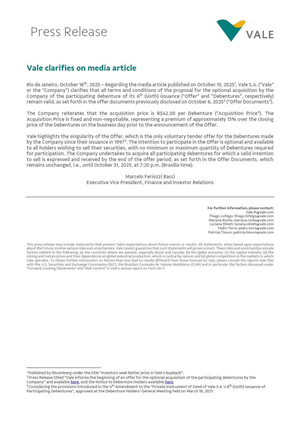 Vale clarifies on media article Rio de Janeiro, October 16th, 2025 – Regarding the media article published on October 15, 20251, Vale S.A. (“Vale” or the “Company”) clarifies that all terms and conditions of the proposal for the optional acquisition by the Company of the participating debenture of its 6th (sixth) issuance (“Offer” and “Debentures”, respectively) remain valid, as set forth in the offer documents previously disclosed on October 6, 20252 (“Offer Documents”). The Company reiterates that the acquisition price is R$42.00 per Debenture (“Acquisition Price”). The Acquisition Price is fixed and non-negotiable, representing a premium of approximately 15% over the closing price of the Debentures on the business day prior to the announcement of the Offer. Vale highlights the singularity of the Offer, which is the only voluntary tender offer for the Debentures made by the Company since their issuance in 19973. The intention to participate in the Offer is optional and available to all holders wishing to sell their securities, with no minimum or maximum quantity of Debentures required for participation. The Company undertakes to acquire all participating debentures for which a valid intention to sell is expressed and received by the end of the offer period, as set forth in the Offer Documents, which remains unchanged, i.e., until October 31, 2025, at 7:20 p.m. (Brasília time). Marcelo Feriozzi Bacci Executive Vice President, Finance and Investor Relations For further information, please contact: Vale.RI@vale.com Thiago Lofiego: thiago.lofiego@vale.com Mariana Rocha: mariana.rocha@vale.com Luciana Oliveti: luciana.oliveti@vale.com Pedro Terra: pedro.terra@vale.com Patricia Tinoco: patricia.tinoco@vale.com This press release may include statements that present Vale’s expectations about future events or results. All statements, when based upon expectations about the future, involve various risks and uncertainties. Vale cannot guarantee that such statements will prove correct. These risks and uncertainties include factors related to the following: (a) the countries where we operate, especially Brazil and Canada; (b) the global economy; (c) the capital markets; (d) the mining and metals prices and their dependence on global industrial production, which is cyclical by nature; and (e) global competition in the markets in which Vale operates. To obtain further information on factors that may lead to results different from those forecast by Vale, please consult the reports Vale files with the U.S. Securities and Exchange Commission (SEC), the Brazilian Comissão de Valores Mobiliários (CVM) and in particular the factors discussed under “Forward-Looking Statements” and “Risk Factors” in Vale’s annual report on Form 20-F. 1 Published by Bloomberg under the title “Investors seek better price in Vale’s buyback”. 2 Press Release titled “Vale informs the beginning of an offer for the optional acquisition of the participating debentures by the Company” and available here, and the Notice to Debenture Holders available here. 3 Considering the provisions introduced in the 4th Amendment to the “Private Instrument of Deed of Vale S.A.’s 6th (Sixth) Issuance of Participating Debentures”, approved at the Debenture Holders’ General Meeting held on March 19, 2021. Press Release