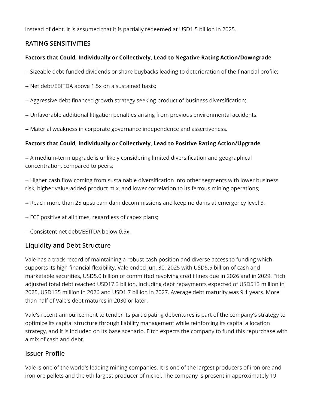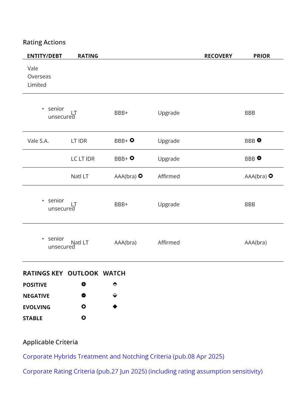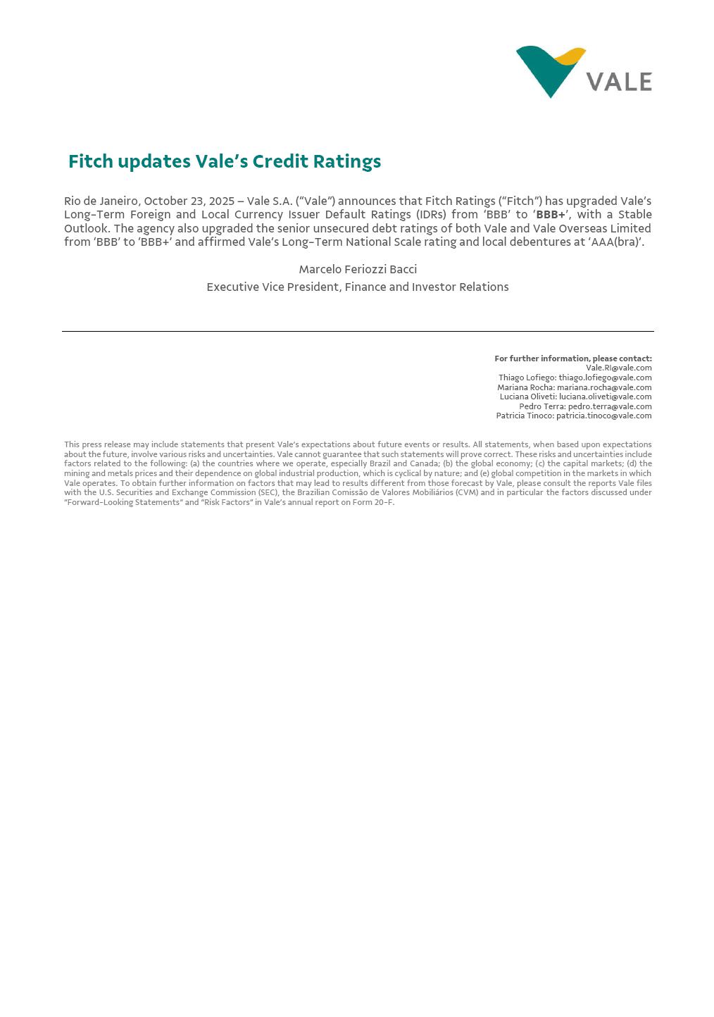 Fitch updates Vale’s Credit Ratings Rio de Janeiro, October 23, 2025 – Vale S.A. (“Vale”) announces that Fitch Ratings (“Fitch”) has upgraded Vale’s Long-Term Foreign and Local Currency Issuer Default Ratings (IDRs) from ‘BBB’ to ‘BBB+’, with a Stable Outlook. The agency also upgraded the senior unsecured debt ratings of both Vale and Vale Overseas Limited from ‘BBB’ to ‘BBB+’ and affirmed Vale’s Long-Term National Scale rating and local debentures at ‘AAA(bra)’. Marcelo Feriozzi Bacci Executive Vice President, Finance and Investor Relations For further information, please contact: Vale.RI@vale.com Thiago Lofiego: thiago.lofiego@vale.com Mariana Rocha: mariana.rocha@vale.com Luciana Oliveti: luciana.oliveti@vale.com Pedro Terra: pedro.terra@vale.com Patricia Tinoco: patricia.tinoco@vale.com This press release may include statements that present Vale’s expectations about future events or results. All statements, when based upon expectations about the future, involve various risks and uncertainties. Vale cannot guarantee that such statements will prove correct. These risks and uncertainties include factors related to the following: (a) the countries where we operate, especially Brazil and Canada; (b) the global economy; (c) the capital markets; (d) the mining and metals prices and their dependence on global industrial production, which is cyclical by nature; and (e) global competition in the markets in which Vale operates. To obtain further information on factors that may lead to results different from those forecast by Vale, please consult the reports Vale files with the U.S. Securities and Exchange Commission (SEC), the Brazilian Comissão de Valores Mobiliários (CVM) and in particular the factors discussed under “Forward-Looking Statements” and “Risk Factors” in Vale’s annual report on Form 20-F. 23 OCT 2025 Fitch Upgrades Vale IDRs to 'BBB+'; Outlook Stable Fitch Ratings - New York - 23 Oct 2025: Fitch Ratings has upgraded Vale S.A.'s (Vale) Long-Term Foreign and Local Currency Issuer Default Ratings (IDRs) to 'BBB+' from 'BBB'. Fitch has also upgraded its crossborder unsecured bonds to 'BBB+' from 'BBB', and affirmed its Long-Term National Scale rating and local debentures at 'AAA(bra)'. Fitch has also upgraded the senior unsecured debt ratings of Vale Overseas Limited to 'BBB+' from 'BBB'. Rating Outlook is Stable. The upgrade reflects Vale's broader diversification into higher value-added products, greater operational flexibility and rising scale, along with environmental risk mitigation that reduced litigation uncertainty. Vale's credit risk profile has strengthened within the rating category and versus peers. Vale's ratings reflect its leading iron ore position, low costs, high-grade mineral deposits, long reserve life, conservative capital structure and elevated financial flexibility. Fitch's expects low leverage and solid free cash flow through iron ore price cycles, with disciplined balancing of growth opportunities and shareholder returns. Key Rating Drivers Robust Business Profile: Vale is the world's largest iron ore pellets producer and one of the three largest seaborne iron ore miners. Its Northern System dominant market position is buttressed by abundant reserves, size and cost competitiveness. Operations in Para, northern Brazil, represent about11% of the global seaborne market. About 90% of Vale's EBITDA comes from iron ore. Vale is also one of the world's largest nickel miners (1% of EBITDA) and a large (but not top 10) copper producer (10% of EBITDA). Flexible Value Over Volume: Vale is obtaining a stronger balance of size, higher value-added products and flexibility in its mix, improving profitability, FCF and stability. Its portfolio favors premium highgrade iron ore products, direct reduction metallics and faster production flexibility to support more sustainable steelmaking. Vale has also developed mid-grade products that balance silica and alumina to meet shifting blast furnaces baseload burden requirements. Low-Cost Producer: Vale holds a first-quartile cost position in its largest iron ore systems, according to CRU, supported by high-grade iron ore and integrated infrastructure. Vale kept cash cost guidance at USD20.5/t-USD22/t, targets to below USD20/t by 2026, and, through efficiency programs—including autonomous fleet adoption, higher volumes and new product mix—aims for USD18/t-USD19.5/t by 2030. Sound Capital Structure: Vale's conservative balance sheet is also a key rating consideration. Average gross debt between 2025 and 2027 is forecast at USD18 billion following increases in local debentures. After dividends, share repurchases and payments of interest on capital, Fitch expects Vale's net debt to average USD12 billion between 2025 and 2027. For 2025, 2026 and 2027, Fitch expects net leverage of around 0.9x. Decreasing Iron Ore Prices: Despite current price resilience, the outlook for iron ore prices looks challenging at Fitch's mid-cycle prices assumptions. For 2026 and 2027, Fitch assumes iron ore prices at USD85 in 2026, USD75 in 2027 and UD70/t in 2028. Expected increase in global supply from Simandou and structural weaknesses in Chinese growth and real estate remain concerns, despite policy support in China, which has been underpinning steel demand and spurring iron ore prices. Strong Cash Flow Generation: Vale's EBITDA is expected to be USD14.2 billion in 2025, USD13.4 billion in 2026 and USD13.3 billion in 2027. These figures assume cash cost improvements continue, and capital expenditures average about USD5.7 billion, due to investments requirements, such as for Vargem Grande, Capanema, and Serra Sul (S11D). Free cash flow (FCF) margin is expected to be 4.2% and 4.0% in 2026 and 2027, respectively. Controlled Growth Strategy: Fitch expects Vale to maintain a strong balance sheet and disciplined capital allocation, while evaluating diversification across businesses and products. Vale has reeval