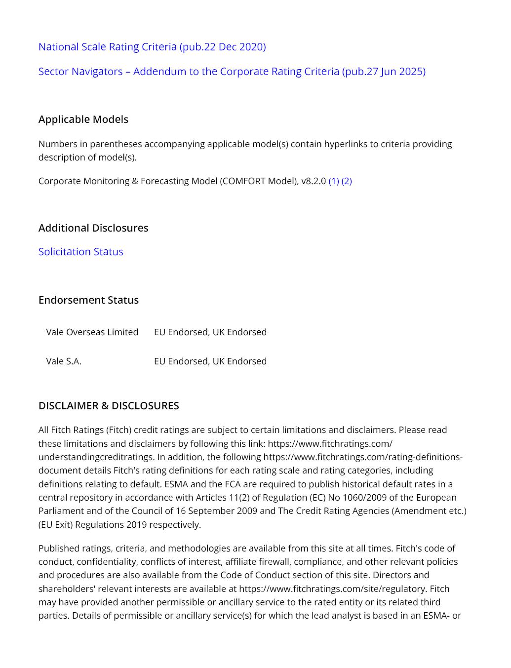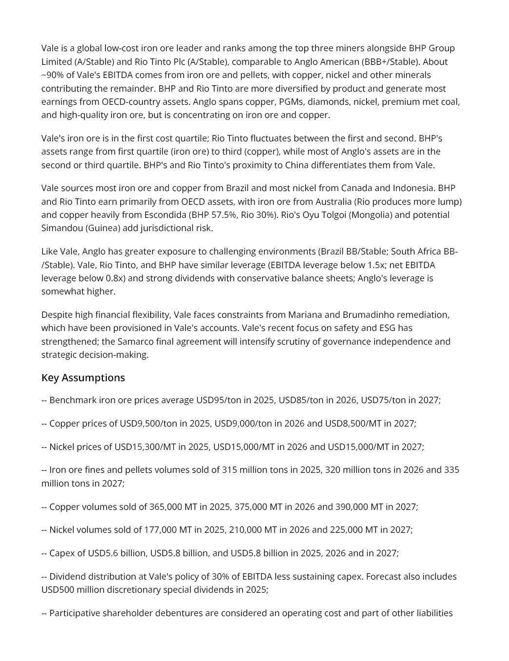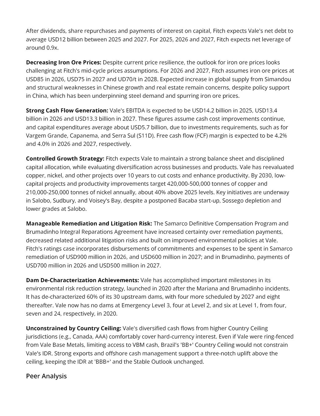 Fitch updates Vale’s Credit Ratings Rio de Janeiro, October 23, 2025 – Vale S.A. (“Vale”) announces that Fitch Ratings (“Fitch”) has upgraded Vale’s Long-Term Foreign and Local Currency Issuer Default Ratings (IDRs) from ‘BBB’ to ‘BBB+’, with a Stable Outlook. The agency also upgraded the senior unsecured debt ratings of both Vale and Vale Overseas Limited from ‘BBB’ to ‘BBB+’ and affirmed Vale’s Long-Term National Scale rating and local debentures at ‘AAA(bra)’. Marcelo Feriozzi Bacci Executive Vice President, Finance and Investor Relations For further information, please contact: Vale.RI@vale.com Thiago Lofiego: thiago.lofiego@vale.com Mariana Rocha: mariana.rocha@vale.com Luciana Oliveti: luciana.oliveti@vale.com Pedro Terra: pedro.terra@vale.com Patricia Tinoco: patricia.tinoco@vale.com This press release may include statements that present Vale’s expectations about future events or results. All statements, when based upon expectations about the future, involve various risks and uncertainties. Vale cannot guarantee that such statements will prove correct. These risks and uncertainties include factors related to the following: (a) the countries where we operate, especially Brazil and Canada; (b) the global economy; (c) the capital markets; (d) the mining and metals prices and their dependence on global industrial production, which is cyclical by nature; and (e) global competition in the markets in which Vale operates. To obtain further information on factors that may lead to results different from those forecast by Vale, please consult the reports Vale files with the U.S. Securities and Exchange Commission (SEC), the Brazilian Comissão de Valores Mobiliários (CVM) and in particular the factors discussed under “Forward-Looking Statements” and “Risk Factors” in Vale’s annual report on Form 20-F. 23 OCT 2025 Fitch Upgrades Vale IDRs to 'BBB+'; Outlook Stable Fitch Ratings - New York - 23 Oct 2025: Fitch Ratings has upgraded Vale S.A.'s (Vale) Long-Term Foreign and Local Currency Issuer Default Ratings (IDRs) to 'BBB+' from 'BBB'. Fitch has also upgraded its crossborder unsecured bonds to 'BBB+' from 'BBB', and affirmed its Long-Term National Scale rating and local debentures at 'AAA(bra)'. Fitch has also upgraded the senior unsecured debt ratings of Vale Overseas Limited to 'BBB+' from 'BBB'. Rating Outlook is Stable. The upgrade reflects Vale's broader diversification into higher value-added products, greater operational flexibility and rising scale, along with environmental risk mitigation that reduced litigation uncertainty. Vale's credit risk profile has strengthened within the rating category and versus peers. Vale's ratings reflect its leading iron ore position, low costs, high-grade mineral deposits, long reserve life, conservative capital structure and elevated financial flexibility. Fitch's expects low leverage and solid free cash flow through iron ore price cycles, with disciplined balancing of growth opportunities and shareholder returns. Key Rating Drivers Robust Business Profile: Vale is the world's largest iron ore pellets producer and one of the three largest seaborne iron ore miners. Its Northern System dominant market position is buttressed by abundant reserves, size and cost competitiveness. Operations in Para, northern Brazil, represent about11% of the global seaborne market. About 90% of Vale's EBITDA comes from iron ore. Vale is also one of the world's largest nickel miners (1% of EBITDA) and a large (but not top 10) copper producer (10% of EBITDA). Flexible Value Over Volume: Vale is obtaining a stronger balance of size, higher value-added products and flexibility in its mix, improving profitability, FCF and stability. Its portfolio favors premium highgrade iron ore products, direct reduction metallics and faster production flexibility to support more sustainable steelmaking. Vale has also developed mid-grade products that balance silica and alumina to meet shifting blast furnaces baseload burden requirements. Low-Cost Producer: Vale holds a first-quartile cost position in its largest iron ore systems, according to CRU, supported by high-grade iron ore and integrated infrastructure. Vale kept cash cost guidance at USD20.5/t-USD22/t, targets to below USD20/t by 2026, and, through efficiency programs—including autonomous fleet adoption, higher volumes and new product mix—aims for USD18/t-USD19.5/t by 2030. Sound Capital Structure: Vale's conservative balance sheet is also a key rating consideration. Average gross debt between 2025 and 2027 is forecast at USD18 billion following increases in local debentures. After dividends, share repurchases and payments of interest on capital, Fitch expects Vale's net debt to average USD12 billion between 2025 and 2027. For 2025, 2026 and 2027, Fitch expects net leverage of around 0.9x. Decreasing Iron Ore Prices: Despite current price resilience, the outlook for iron ore prices looks challenging at Fitch's mid-cycle prices assumptions. For 2026 and 2027, Fitch assumes iron ore prices at USD85 in 2026, USD75 in 2027 and UD70/t in 2028. Expected increase in global supply from Simandou and structural weaknesses in Chinese growth and real estate remain concerns, despite policy support in China, which has been underpinning steel demand and spurring iron ore prices. Strong Cash Flow Generation: Vale's EBITDA is expected to be USD14.2 billion in 2025, USD13.4 billion in 2026 and USD13.3 billion in 2027. These figures assume cash cost improvements continue, and capital expenditures average about USD5.7 billion, due to investments requirements, such as for Vargem Grande, Capanema, and Serra Sul (S11D). Free cash flow (FCF) margin is expected to be 4.2% and 4.0% in 2026 and 2027, respectively. Controlled Growth Strategy: Fitch expects Vale to maintain a strong balance sheet and disciplined capital allocation, while evaluating diversification across businesses and products. Vale has reeval