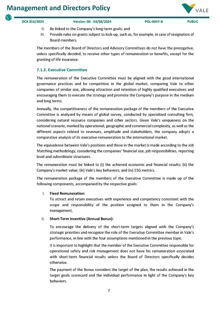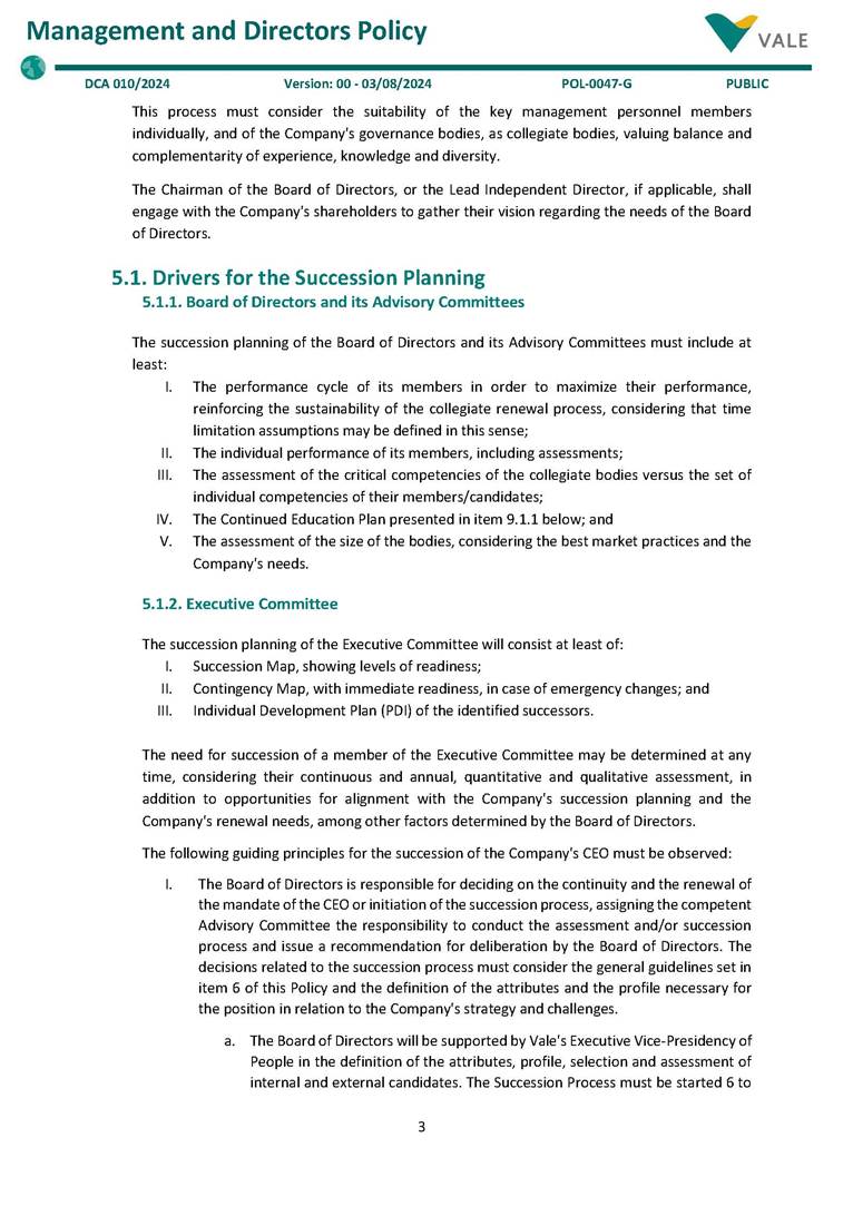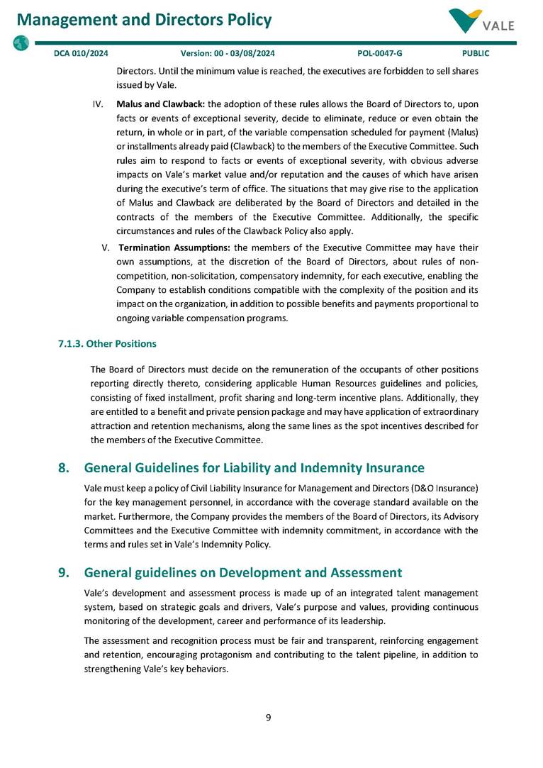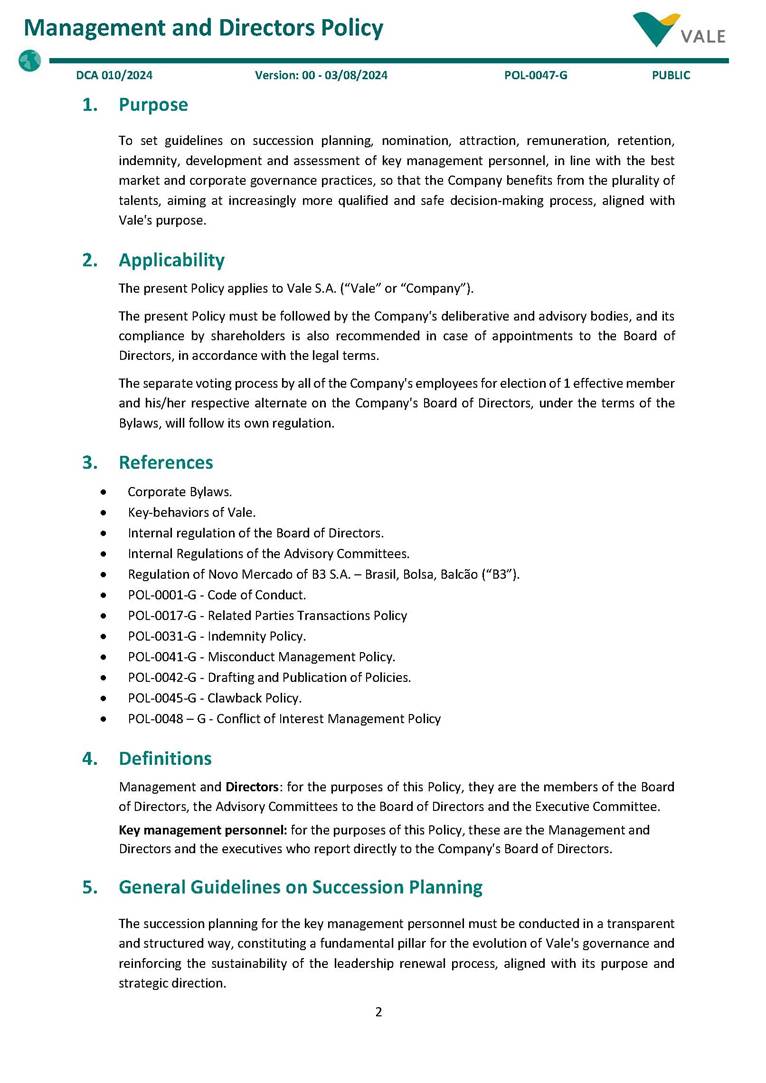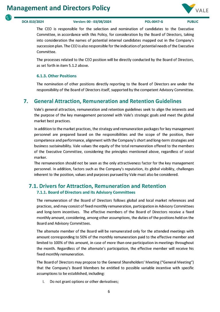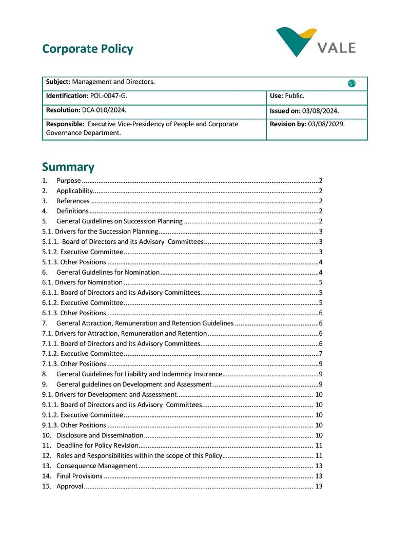 Summary 1. Purpose .................................................................................................................................2 2. Applicability...........................................................................................................................2 3. References .............................................................................................................................2 4. Definitions ..............................................................................................................................2 5. General Guidelines on Succession Planning ..........................................................................2 5.1. Drivers for the Succession Planning ........................................................................................3 5.1.1. Board of Directors and its Advisory Committees ...............................................................3 5.1.2. Executive Committee ...........................................................................................................3 5.1.3. Other Positions ....................................................................................................................4 6. General Guidelines for Nomination .......................................................................................4 6.1. Drivers for Nomination ...........................................................................................................5 6.1.1. Board of Directors and its Advisory Committees .................................................................5 6.1.2. Executive Committee ...........................................................................................................5 6.1.3. Other Positions ....................................................................................................................6 7. General Attraction, Remuneration and Retention Guidelines ..............................................6 7.1. Drivers for Attraction, Remuneration and Retention .............................................................6 7.1.1. Board of Directors and its Advisory Committees .................................................................6 7.1.2. Executive Committee ...........................................................................................................7 7.1.3. Other Positions ....................................................................................................................9 8. General Guidelines for Liability and Indemnity Insurance .....................................................9 9. General guidelines on Development and Assessment ..........................................................9 9.1. Drivers for Development and Assessment........................................................................... 10 9.1.1. Board of Directors and its Advisory Committees ............................................................. 10 9.1.2. Executive Committee ........................................................................................................ 10 9.1.3. Other Positions ................................................................................................................. 10 10. Disclosure and Dissemination ............................................................................................. 10 11. Deadline for Policy Revision ................................................................................................ 11 12. Roles and Responsibilities within the scope of this Policy .................................................. 11 13. Consequence Management ................................................................................................ 13 14. Final Provisions ................................................................................................................... 13 15. Approval .............................................................................................................................. 13 Subject: Management and Directors. Identification: POL-0047-G. Use: Public. Resolution: DCA 010/2024. Issued on: 03/08/2024. Responsible: Executive Vice-Presidency of People and Corporate Governance Department. Revision by: 03/08/2029. Corporate Policy 2 Management and Directors Policy DCA 010/2024 Version: 00 - 03/08/2024 POL-0047-G PUBLIC 1. Purpose To set guidelines on succession planning, nomination, attraction, remuneration, retention, indemnity, development and assessment of key management personnel, in line with the best market and corporate governance practices, so that the Company benefits from the plurality of talents, aiming at increasingly more qualified and safe decision-making process, aligned with Vale's purpose. 2. Applicability The present Policy applies to Vale S.A. (“Vale” or “Company”). The present Policy must be followed by the Company's deliberative and advisory bodies, and its compliance by shareholders is also recommended in case of appointments to the Board of Directors, in accordance with the legal terms. The separate voting process by all of the Company's employees for election of 1 effective member and his/her respective alternate on the Company's Board of Directors, under the terms of the Bylaws, will follow its own regulation. 3. References • Corporate Bylaws. • Key-behaviors of Vale. • Internal regulation of the Board of Directors. • Internal Regulations of the Advisory Committees. • Regulation of Novo Mercado of B3 S.A. – Brasil, Bolsa, Balcão (“B3”). • POL-0001-G - Code of Conduct. • POL-0017-G - Related Parties Transactions Policy • POL-0031-G - Indemnity Policy. • POL-0041-G - Misconduct Management Policy. • POL-0042-G - Drafting and Publication of Policies. • POL-0045-G - Clawback Policy. • POL-0048 – G - Conflict of Interest Management Policy 4. Definitions Management and Directors: for the purposes of this Policy, they are the members of the Boar