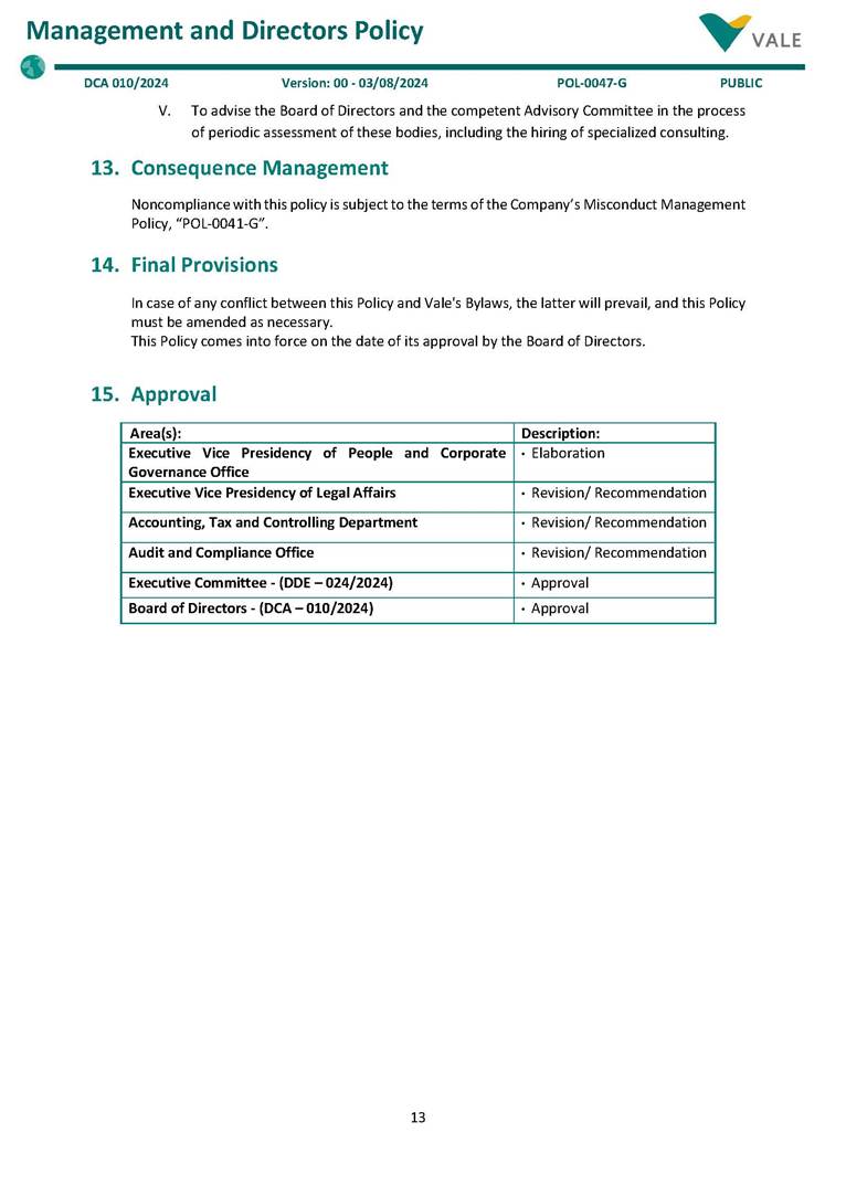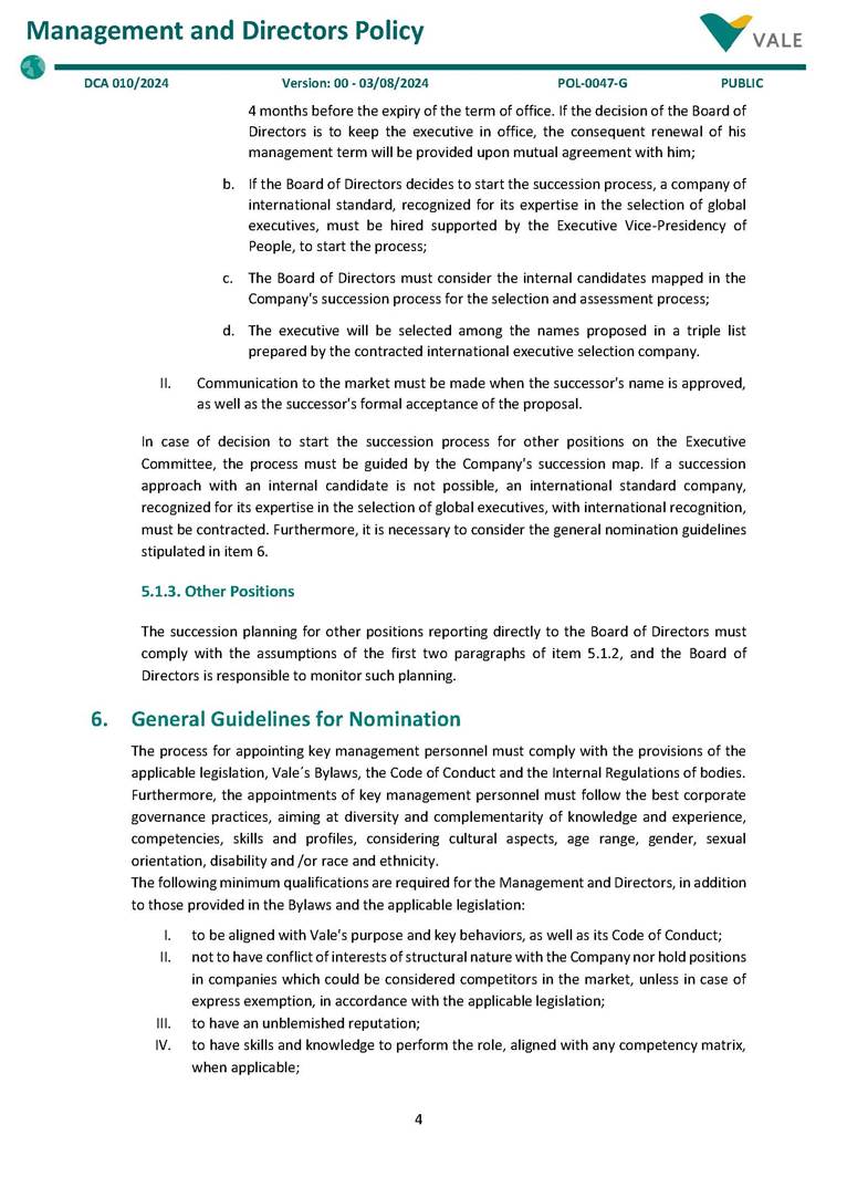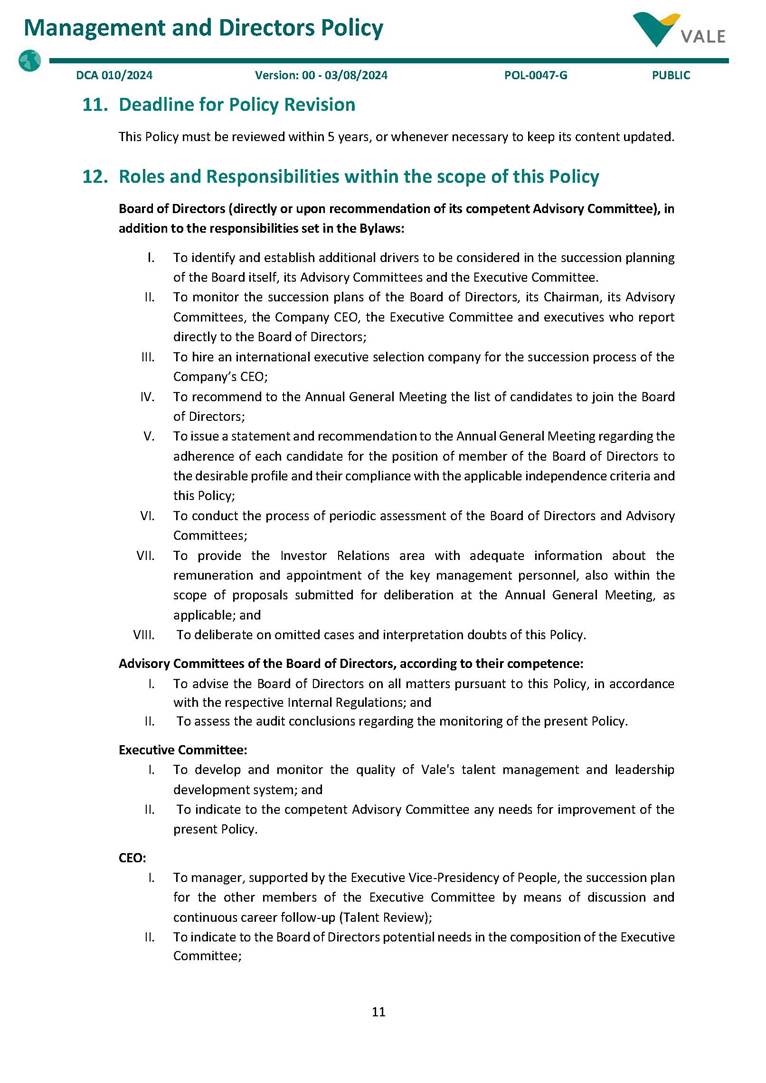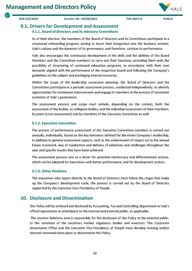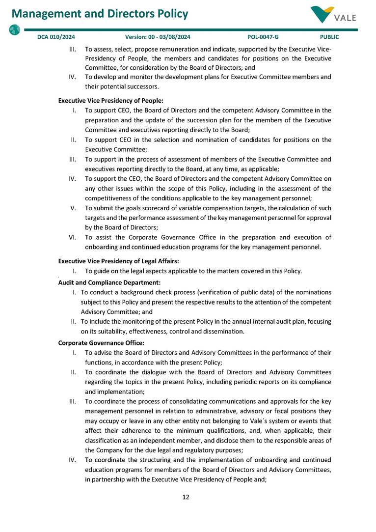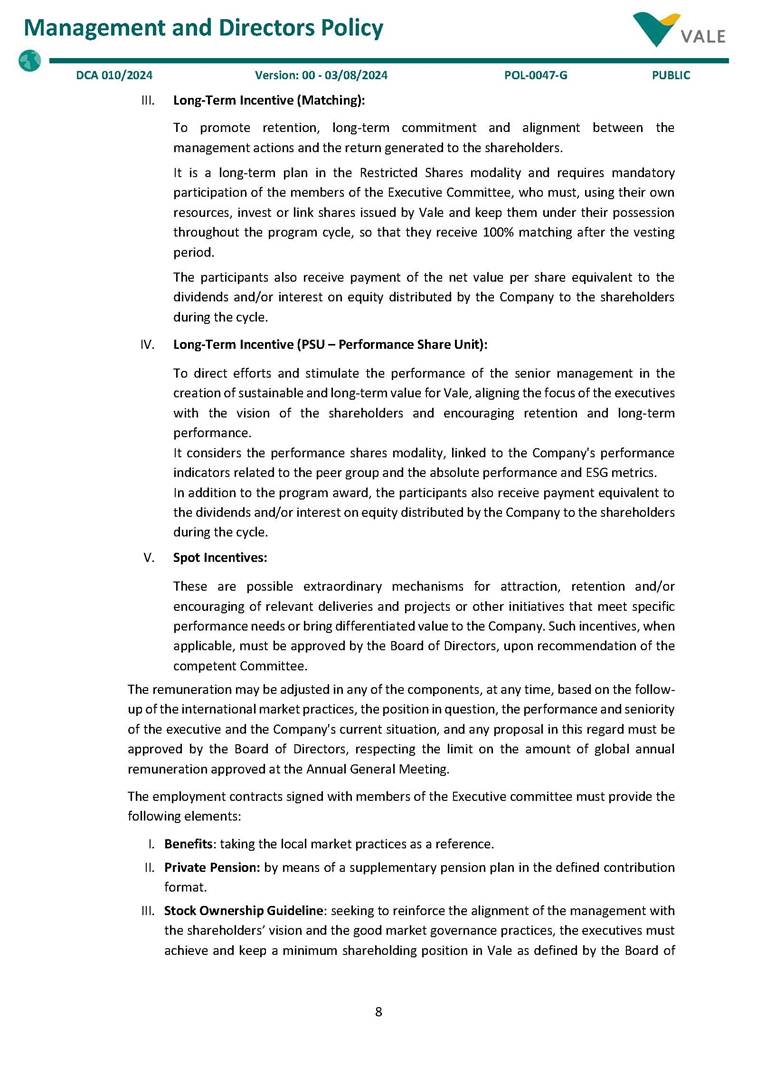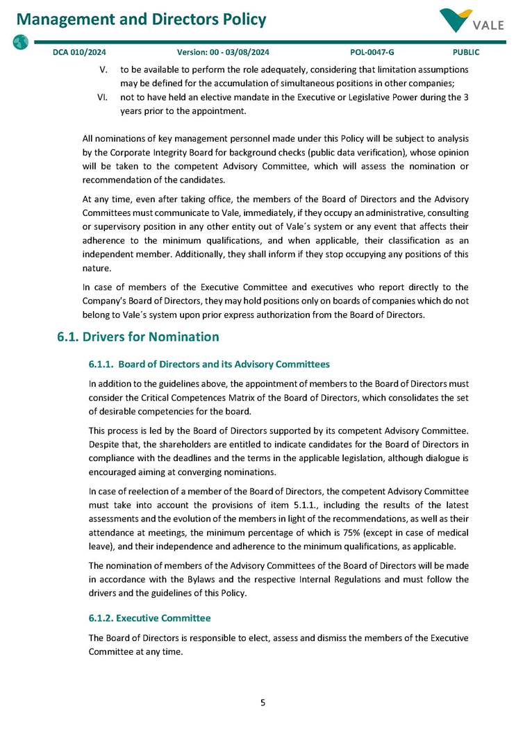 Summary 1. Purpose .................................................................................................................................2 2. Applicability...........................................................................................................................2 3. References .............................................................................................................................2 4. Definitions ..............................................................................................................................2 5. General Guidelines on Succession Planning ..........................................................................2 5.1. Drivers for the Succession Planning ........................................................................................3 5.1.1. Board of Directors and its Advisory Committees ...............................................................3 5.1.2. Executive Committee ...........................................................................................................3 5.1.3. Other Positions ....................................................................................................................4 6. General Guidelines for Nomination .......................................................................................4 6.1. Drivers for Nomination ...........................................................................................................5 6.1.1. Board of Directors and its Advisory Committees .................................................................5 6.1.2. Executive Committee ...........................................................................................................5 6.1.3. Other Positions ....................................................................................................................6 7. General Attraction, Remuneration and Retention Guidelines ..............................................6 7.1. Drivers for Attraction, Remuneration and Retention .............................................................6 7.1.1. Board of Directors and its Advisory Committees .................................................................6 7.1.2. Executive Committee ...........................................................................................................7 7.1.3. Other Positions ....................................................................................................................9 8. General Guidelines for Liability and Indemnity Insurance .....................................................9 9. General guidelines on Development and Assessment ..........................................................9 9.1. Drivers for Development and Assessment........................................................................... 10 9.1.1. Board of Directors and its Advisory Committees ............................................................. 10 9.1.2. Executive Committee ........................................................................................................ 10 9.1.3. Other Positions ................................................................................................................. 10 10. Disclosure and Dissemination ............................................................................................. 10 11. Deadline for Policy Revision ................................................................................................ 11 12. Roles and Responsibilities within the scope of this Policy .................................................. 11 13. Consequence Management ................................................................................................ 13 14. Final Provisions ................................................................................................................... 13 15. Approval .............................................................................................................................. 13 Subject: Management and Directors. Identification: POL-0047-G. Use: Public. Resolution: DCA 010/2024. Issued on: 03/08/2024. Responsible: Executive Vice-Presidency of People and Corporate Governance Department. Revision by: 03/08/2029. Corporate Policy 2 Management and Directors Policy DCA 010/2024 Version: 00 - 03/08/2024 POL-0047-G PUBLIC 1. Purpose To set guidelines on succession planning, nomination, attraction, remuneration, retention, indemnity, development and assessment of key management personnel, in line with the best market and corporate governance practices, so that the Company benefits from the plurality of talents, aiming at increasingly more qualified and safe decision-making process, aligned with Vale's purpose. 2. Applicability The present Policy applies to Vale S.A. (“Vale” or “Company”). The present Policy must be followed by the Company's deliberative and advisory bodies, and its compliance by shareholders is also recommended in case of appointments to the Board of Directors, in accordance with the legal terms. The separate voting process by all of the Company's employees for election of 1 effective member and his/her respective alternate on the Company's Board of Directors, under the terms of the Bylaws, will follow its own regulation. 3. References • Corporate Bylaws. • Key-behaviors of Vale. • Internal regulation of the Board of Directors. • Internal Regulations of the Advisory Committees. • Regulation of Novo Mercado of B3 S.A. – Brasil, Bolsa, Balcão (“B3”). • POL-0001-G - Code of Conduct. • POL-0017-G - Related Parties Transactions Policy • POL-0031-G - Indemnity Policy. • POL-0041-G - Misconduct Management Policy. • POL-0042-G - Drafting and Publication of Policies. • POL-0045-G - Clawback Policy. • POL-0048 – G - Conflict of Interest Management Policy 4. Definitions Management and Directors: for the purposes of this Policy, they are the members of the Boar