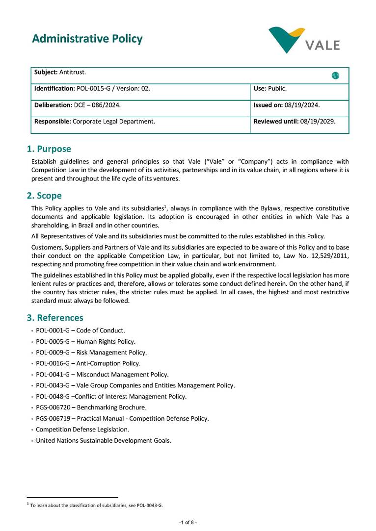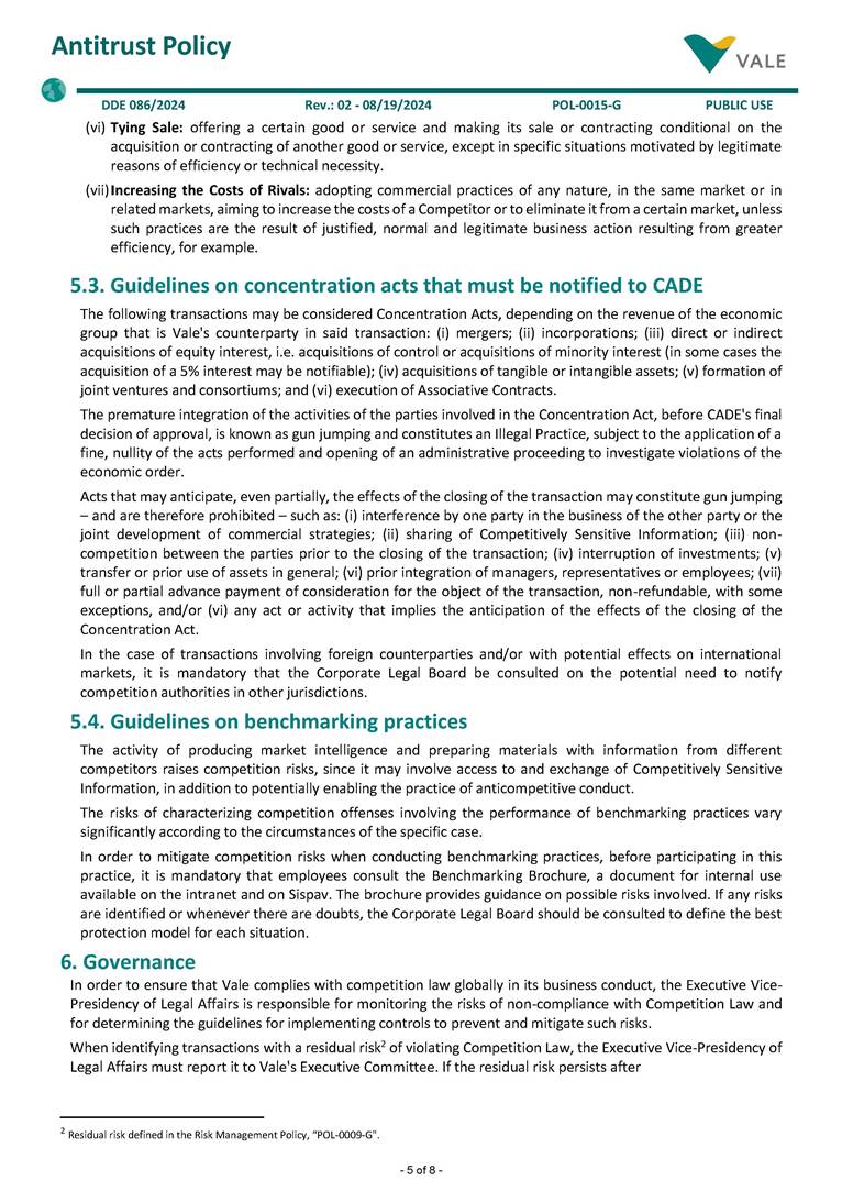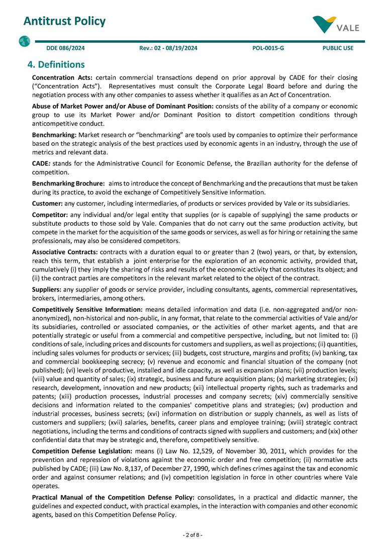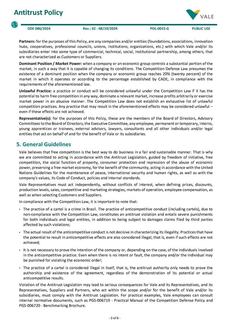 Subject: Antitrust. Identification: POL-0015-G / Version: 02. Use: Public. Deliberation: DCE – 086/2024. Issued on: 08/19/2024. Responsible: Corporate Legal Department. Reviewed until: 08/19/2029. -1 of 8 - Administrative Policy 1. Purpose Establish guidelines and general principles so that Vale (“Vale” or “Company”) acts in compliance with Competition Law in the development of its activities, partnerships and in its value chain, in all regions where it is present and throughout the life cycle of its ventures. 2. Scope This Policy applies to Vale and its subsidiaries1, always in compliance with the Bylaws, respective constitutive documents and applicable legislation. Its adoption is encouraged in other entities in which Vale has a shareholding, in Brazil and in other countries. All Representatives of Vale and its subsidiaries must be committed to the rules established in this Policy. Customers, Suppliers and Partners of Vale and its subsidiaries are expected to be aware of this Policy and to base their conduct on the applicable Competition Law, in particular, but not limited to, Law No. 12,529/2011, respecting and promoting free competition in their value chain and work environment. The guidelines established in this Policy must be applied globally, even if the respective local legislation has more lenient rules or practices and, therefore, allows or tolerates some conduct defined herein. On the other hand, if the country has stricter rules, the stricter rules must be applied. In all cases, the highest and most restrictive standard must always be followed. 3. References • POL-0001-G – Code of Conduct. • POL-0005-G – Human Rights Policy. • POL-0009-G – Risk Management Policy. • POL-0016-G – Anti-Corruption Policy. • POL-0041-G – Misconduct Management Policy. • POL-0043-G – Vale Group Companies and Entities Management Policy. • POL-0048-G –Conflict of Interest Management Policy. • PGS-006720 – Benchmarking Brochure. • PGS-006719 – Practical Manual - Competition Defense Policy. • Competition Defense Legislation. • United Nations Sustainable Development Goals. 1 To learn about the classification of subsidiaries, see POL-0043-G. - 2 of 8 - Antitrust Policy DDE 086/2024 Rev.: 02 - 08/19/2024 POL-0015-G PUBLIC USE 4. Definitions Concentration Acts: certain commercial transactions depend on prior approval by CADE for their closing (“Concentration Acts”). Representatives must consult the Corporate Legal Board before and during the negotiation process with any other companies to assess whether it qualifies as an Act of Concentration. Abuse of Market Power and/or Abuse of Dominant Position: consists of the ability of a company or economic group to use its Market Power and/or Dominant Position to distort competition conditions through anticompetitive conduct. Benchmarking: Market research or “benchmarking” are tools used by companies to optimize their performance based on the strategic analysis of the best practices used by economic agents in an industry, through the use of metrics and relevant data. CADE: stands for the Administrative Council for Economic Defense, the Brazilian authority for the defense of competition. Benchmarking Brochure: aims to introduce the concept of Benchmarking and the precautions that must be taken during its practice, to avoid the exchange of Competitively Sensitive Information. Customer: any customer, including intermediaries, of products or services provided by Vale or its subsidiaries. Competitor: any individual and/or legal entity that supplies (or is capable of supplying) the same products or substitute products to those sold by Vale. Companies that do not carry out the same production activity, but compete in the market for the acquisition of the same goods or services, as well as for hiring or retaining the same professionals, may also be considered competitors. Associative Contracts: contracts with a duration equal to or greater than 2 (two) years, or that, by extension, reach this term, that establish a joint enterprise for the exploration of an economic activity, provided that, cumulatively (i) they imply the sharing of risks and results of the economic activity that constitutes its object; and (ii) the contract parties are competitors in the relevant market related to the object of the contract. Suppliers: any supplier of goods or service provider, including consultants, agents, commercial representatives, brokers, intermediaries, among others. Competitively Sensitive Information: means detailed information and data (i.e. non-aggregated and/or non-anonymized), non-historical and non-public, in any format, that relate to the commercial activities of Vale and/or its subsidiaries, controlled or associated companies, or the activities of other market agents, and that are potentially strategic or useful from a commercial and competitive perspective, including, but not limited to: (i) conditions of sale, including prices and discounts for customers and suppliers, as well as projections; (ii) quantities, including sales volumes for products or services; (iii) budgets, cost structure, margins and profits; (iv) banking, tax and commercial bookkeeping secrecy; (v) revenue and economic and financial situation of the company (not published); (vi) levels of productive, installed and idle capacity, as well as expansion plans; (vii) production levels; (viii) value and quantity of sales; (ix) strategic, business and future acquisition plans; (x) marketing strategies; (xi) research, development, innovation and new products; (xii) intellectual property rights, such as trademarks and patents; (xiii) production processes, industrial processes and company secrets; (xiv) commercially sensitive decisions and information related to the companies' competitive plans and strategies; (xv) production and industrial processes, business secrets; (xvi) information on distribution or supply channels, as well as lists of customers and s