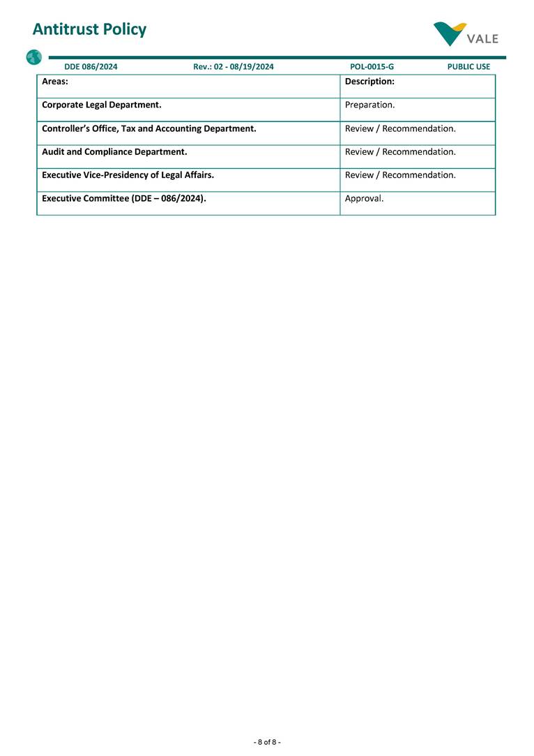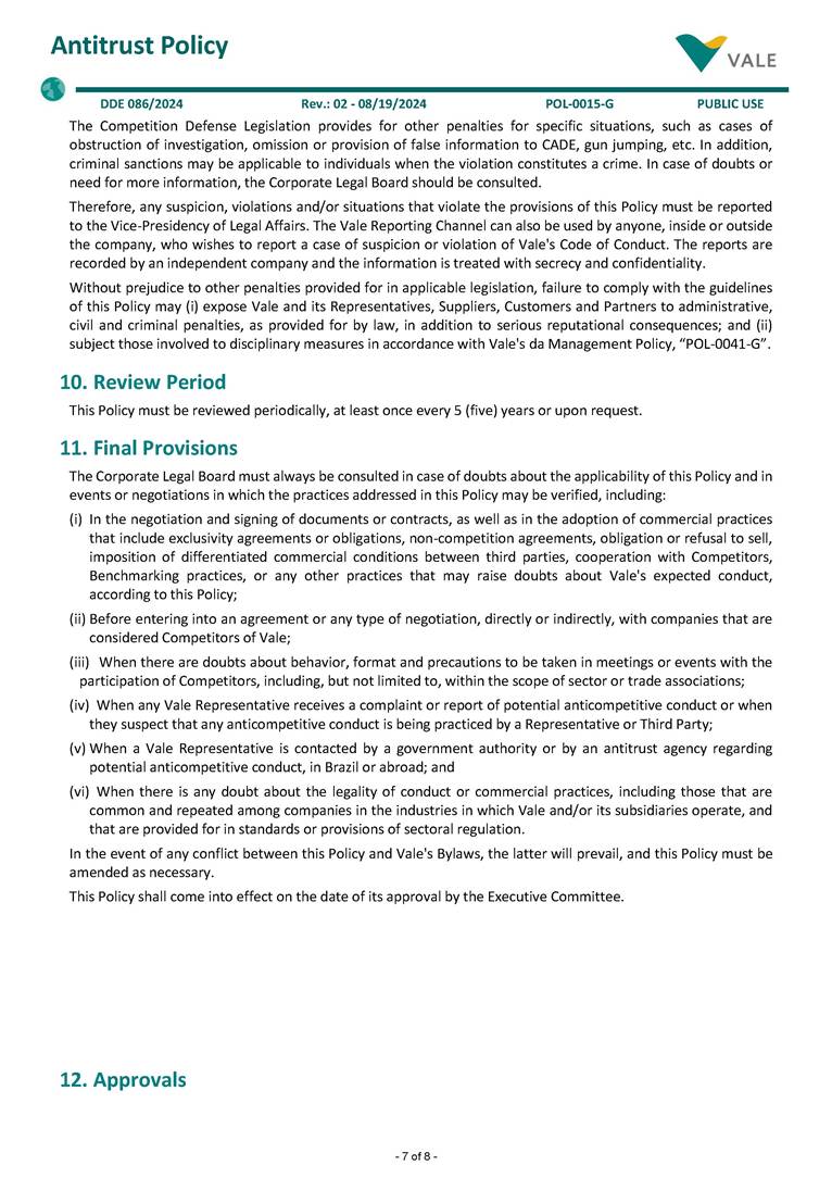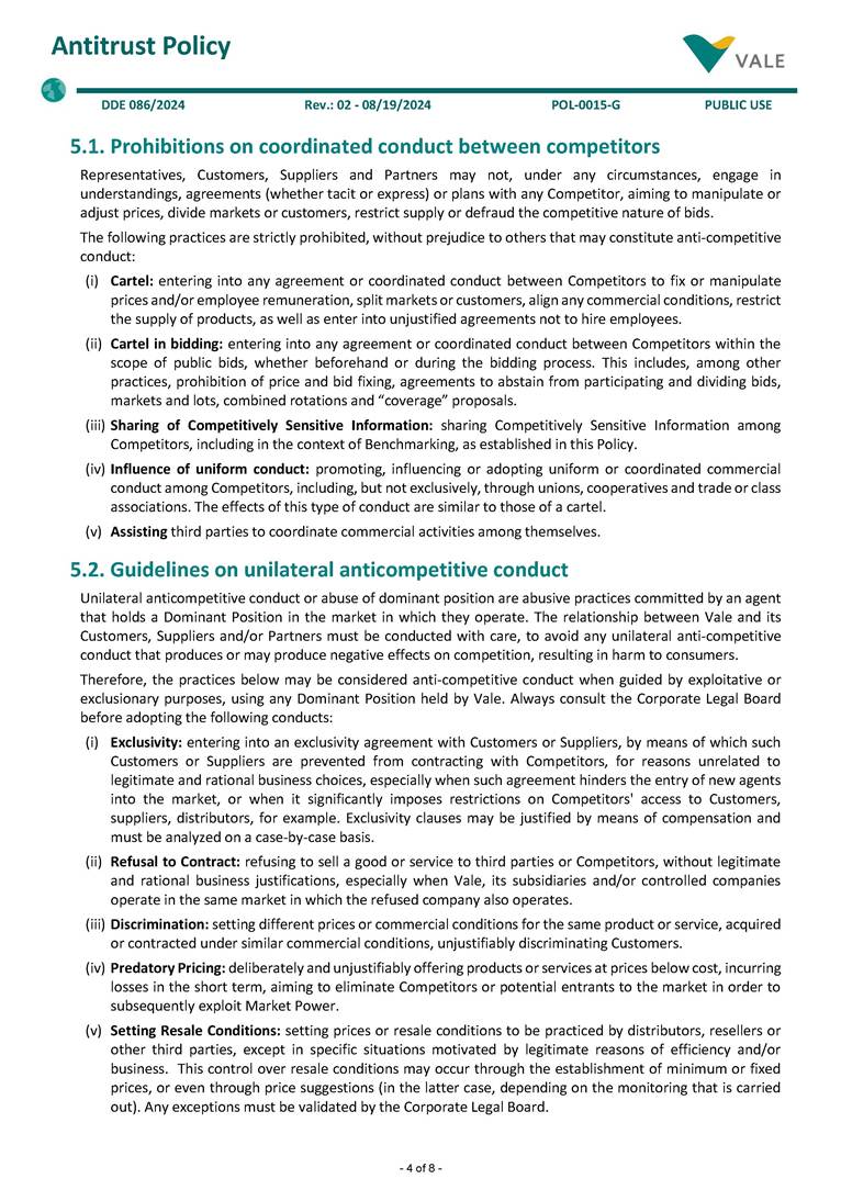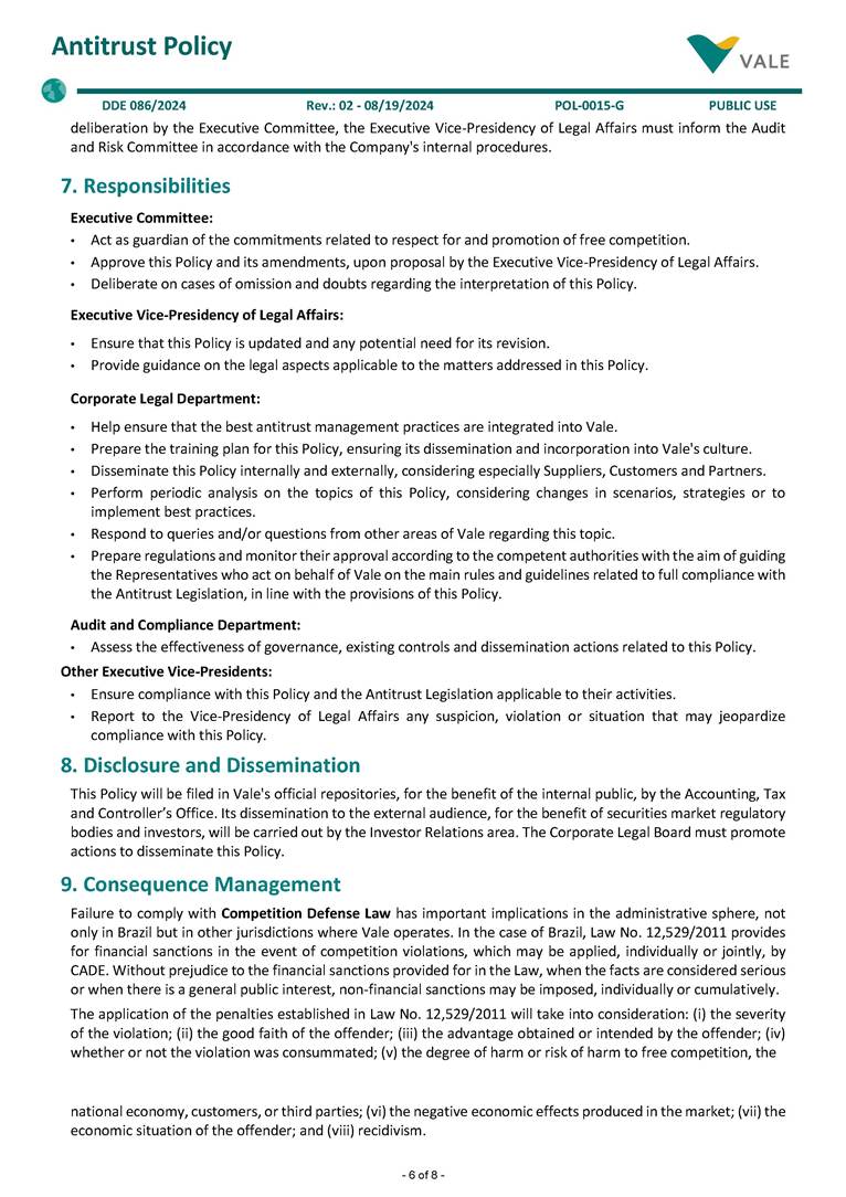 Subject: Antitrust. Identification: POL-0015-G / Version: 02. Use: Public. Deliberation: DCE – 086/2024. Issued on: 08/19/2024. Responsible: Corporate Legal Department. Reviewed until: 08/19/2029. -1 of 8 - Administrative Policy 1. Purpose Establish guidelines and general principles so that Vale (“Vale” or “Company”) acts in compliance with Competition Law in the development of its activities, partnerships and in its value chain, in all regions where it is present and throughout the life cycle of its ventures. 2. Scope This Policy applies to Vale and its subsidiaries1, always in compliance with the Bylaws, respective constitutive documents and applicable legislation. Its adoption is encouraged in other entities in which Vale has a shareholding, in Brazil and in other countries. All Representatives of Vale and its subsidiaries must be committed to the rules established in this Policy. Customers, Suppliers and Partners of Vale and its subsidiaries are expected to be aware of this Policy and to base their conduct on the applicable Competition Law, in particular, but not limited to, Law No. 12,529/2011, respecting and promoting free competition in their value chain and work environment. The guidelines established in this Policy must be applied globally, even if the respective local legislation has more lenient rules or practices and, therefore, allows or tolerates some conduct defined herein. On the other hand, if the country has stricter rules, the stricter rules must be applied. In all cases, the highest and most restrictive standard must always be followed. 3. References • POL-0001-G – Code of Conduct. • POL-0005-G – Human Rights Policy. • POL-0009-G – Risk Management Policy. • POL-0016-G – Anti-Corruption Policy. • POL-0041-G – Misconduct Management Policy. • POL-0043-G – Vale Group Companies and Entities Management Policy. • POL-0048-G –Conflict of Interest Management Policy. • PGS-006720 – Benchmarking Brochure. • PGS-006719 – Practical Manual - Competition Defense Policy. • Competition Defense Legislation. • United Nations Sustainable Development Goals. 1 To learn about the classification of subsidiaries, see POL-0043-G. - 2 of 8 - Antitrust Policy DDE 086/2024 Rev.: 02 - 08/19/2024 POL-0015-G PUBLIC USE 4. Definitions Concentration Acts: certain commercial transactions depend on prior approval by CADE for their closing (“Concentration Acts”). Representatives must consult the Corporate Legal Board before and during the negotiation process with any other companies to assess whether it qualifies as an Act of Concentration. Abuse of Market Power and/or Abuse of Dominant Position: consists of the ability of a company or economic group to use its Market Power and/or Dominant Position to distort competition conditions through anticompetitive conduct. Benchmarking: Market research or “benchmarking” are tools used by companies to optimize their performance based on the strategic analysis of the best practices used by economic agents in an industry, through the use of metrics and relevant data. CADE: stands for the Administrative Council for Economic Defense, the Brazilian authority for the defense of competition. Benchmarking Brochure: aims to introduce the concept of Benchmarking and the precautions that must be taken during its practice, to avoid the exchange of Competitively Sensitive Information. Customer: any customer, including intermediaries, of products or services provided by Vale or its subsidiaries. Competitor: any individual and/or legal entity that supplies (or is capable of supplying) the same products or substitute products to those sold by Vale. Companies that do not carry out the same production activity, but compete in the market for the acquisition of the same goods or services, as well as for hiring or retaining the same professionals, may also be considered competitors. Associative Contracts: contracts with a duration equal to or greater than 2 (two) years, or that, by extension, reach this term, that establish a joint enterprise for the exploration of an economic activity, provided that, cumulatively (i) they imply the sharing of risks and results of the economic activity that constitutes its object; and (ii) the contract parties are competitors in the relevant market related to the object of the contract. Suppliers: any supplier of goods or service provider, including consultants, agents, commercial representatives, brokers, intermediaries, among others. Competitively Sensitive Information: means detailed information and data (i.e. non-aggregated and/or non-anonymized), non-historical and non-public, in any format, that relate to the commercial activities of Vale and/or its subsidiaries, controlled or associated companies, or the activities of other market agents, and that are potentially strategic or useful from a commercial and competitive perspective, including, but not limited to: (i) conditions of sale, including prices and discounts for customers and suppliers, as well as projections; (ii) quantities, including sales volumes for products or services; (iii) budgets, cost structure, margins and profits; (iv) banking, tax and commercial bookkeeping secrecy; (v) revenue and economic and financial situation of the company (not published); (vi) levels of productive, installed and idle capacity, as well as expansion plans; (vii) production levels; (viii) value and quantity of sales; (ix) strategic, business and future acquisition plans; (x) marketing strategies; (xi) research, development, innovation and new products; (xii) intellectual property rights, such as trademarks and patents; (xiii) production processes, industrial processes and company secrets; (xiv) commercially sensitive decisions and information related to the companies' competitive plans and strategies; (xv) production and industrial processes, business secrets; (xvi) information on distribution or supply channels, as well as lists of customers and s