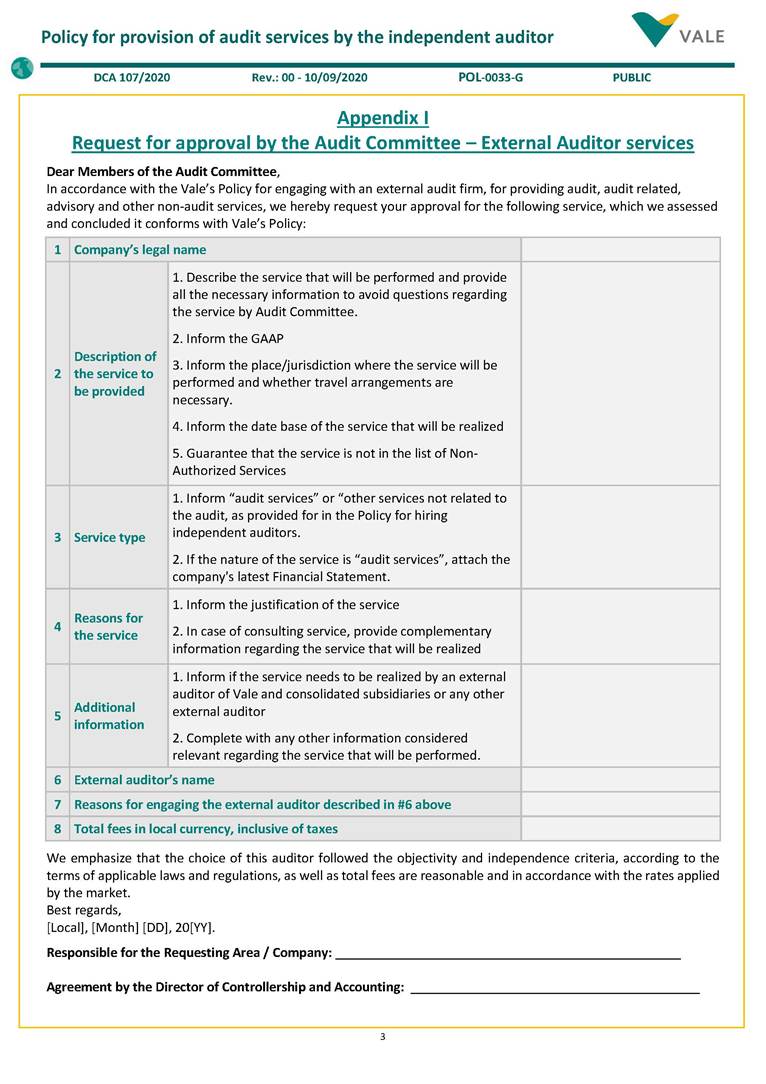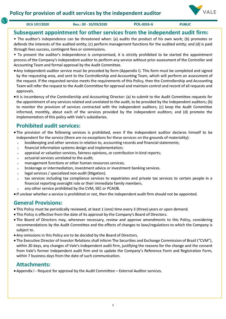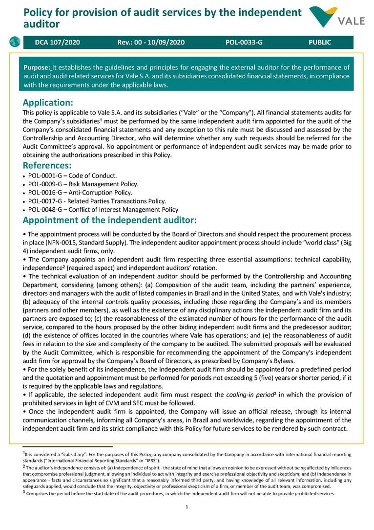 1 Policy for provision of audit services by the independent auditor DCA xxx/2020 Rev.: 00-xx/xx/2020 POL-0033-G PÚBLICO DCA 107/2020 Rev.: 00 - 10/09/2020 POL-0033-G PUBLIC Application: This policy is applicable to Vale S.A. and its subsidiaries (“Vale” or the “Company”). All financial statements audits for the Company’s subsidiaries1 must be performed by the same independent audit firm appointed for the audit of the Company’s consolidated financial statements and any exception to this rule must be discussed and assessed by the Controllership and Accounting Director, who will determine whether any such requests should be referred for the Audit Committee’s approval. No appointment or performance of independent audit services may be made prior to obtaining the authorizations prescribed in this Policy. References: • POL-0001-G – Code of Conduct. • POL-0009-G – Risk Management Policy. • POL-0016-G – Anti-Corruption Policy. • POL-0017-G - Related Parties Transactions Policy. • POL-0048-G – Conflict of Interest Management Policy Appointment of the independent auditor: • The appointment process will be conducted by the Board of Directors and should respect the procurement process in place (NFN-0015, Standard Supply). The independent auditor appointment process should include “world class” (Big 4) independent audit firms, only. • The Company appoints an independent audit firm respecting three essential assumptions: technical capability, independence2 (required aspect) and independent auditors’ rotation. • The technical evaluation of an independent auditor should be performed by the Controllership and Accounting Department, considering (among others): (a) Composition of the audit team, including the partners’ experience, directors and managers with the audit of listed companies in Brazil and in the United States, and with Vale's industry; (b) adequacy of the internal controls quality processes, including those regarding the Company’s and its members (partners and other members), as well as the existence of any disciplinary actions the independent audit firm and its partners are exposed to; (c) the reasonableness of the estimated number of hours for the performance of the audit service, compared to the hours proposed by the other biding independent audit firms and the predecessor auditor; (d) the existence of offices located in the countries where Vale has operations; and (e) the reasonableness of audit fees in relation to the size and complexity of the company to be audited. The submitted proposals will be evaluated by the Audit Committee, which is responsible for recommending the appointment of the Company’s independent audit firm for approval by the Company’s Board of Directors, as prescribed by Company's Bylaws. • For the solely benefit of its independence, the independent audit firm should be appointed for a predefined period and the quotation and appointment must be performed for periods not exceeding 5 (five) years or shorter period, if it is required by the applicable laws and regulations. • If applicable, the selected independent audit firm must respect the cooling-in period3 in which the provision of prohibited services in light of CVM and SEC must be followed. • Once the independent audit firm is appointed, the Company will issue an official release, through its internal communication channels, informing all Company’s areas, in Brazil and worldwide, regarding the appointment of the independent audit firm and its strict compliance with this Policy for future services to be rendered by such contract. 1It is considered a “subsidiary”. For the purposes of this Policy, any company consolidated by the Company in accordance with international financial reporting standards (“International Financial Reporting Standards” or “IFRS”). 2 The auditor's independence consists of: (a) Independence of spirit - the state of mind that allows an opinion to be expressed without being affected by influences that compromise professional judgment, allowing an individual to act with integrity and exercise professional objectivity and skepticism; and (b) Independence in appearance - facts and circumstances so significant that a reasonably informed third party, and having knowledge of all relevant information, including any safeguards applied, would conclude that the integrity, objectivity or professional skepticism of a firm, or member of the audit team, was compromised. 3 Comprises the period before the start date of the audit procedures, in which the independent audit firm will not be able to provide prohibited services. Purpose: It establishes the guidelines and principles for engaging the external auditor for the performance of audit and audit related services for Vale S.A. and its subsidiaries consolidated financial statements, in compliance with the requirements under the applicable laws. 2 Policy for provision of audit services by the independent auditor DCA 107/2020 Rev.: 00 - 10/09/2020 POL-0033-G PUBLIC Subsequent appointment for other services from the independent audit firm: • The auditor's independence can be threatened when: (a) audits the product of his own work; (b) promotes or defends the interests of the audited entity; (c) perform management functions for the audited entity; and (d) is paid through fees success, contingent fees or commissions. • To prevent the auditor's independence is compromised, it is strictly prohibited to be started the appointment process of the Company's independent auditor to perform any service without prior assessment of the Controller and Accounting Team and formal approval by the Audit Committee. • Any independent auditor service must be preceded by form (Appendix I). This form must be completed and signed by the requesting area, and sent to the Controllership and Accounting Team, which will perform an assessment of the request. If the requested service meets the requirements of this Poli