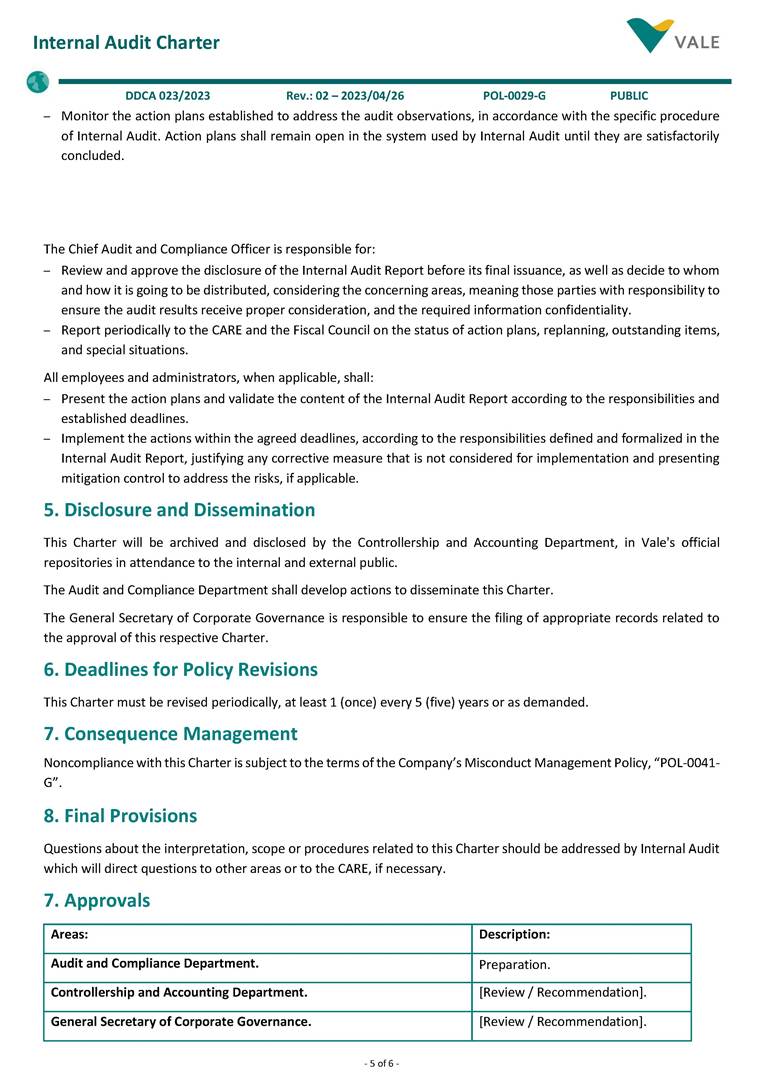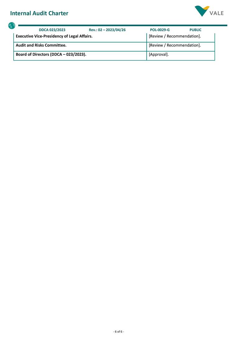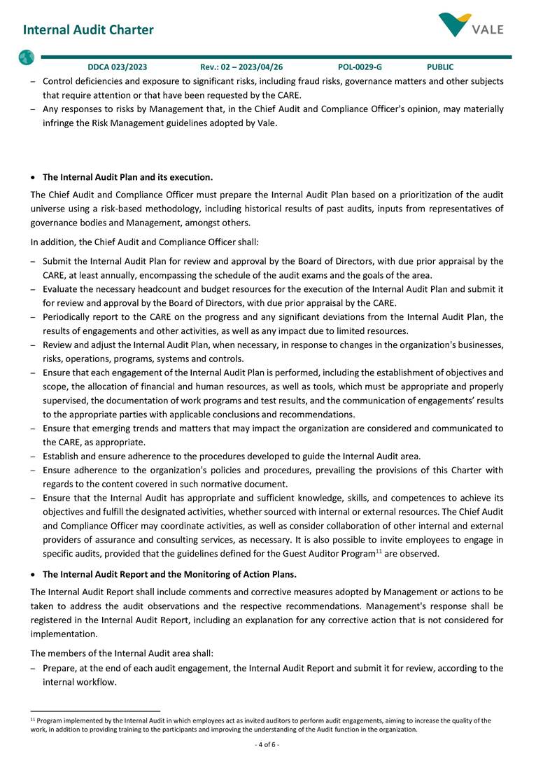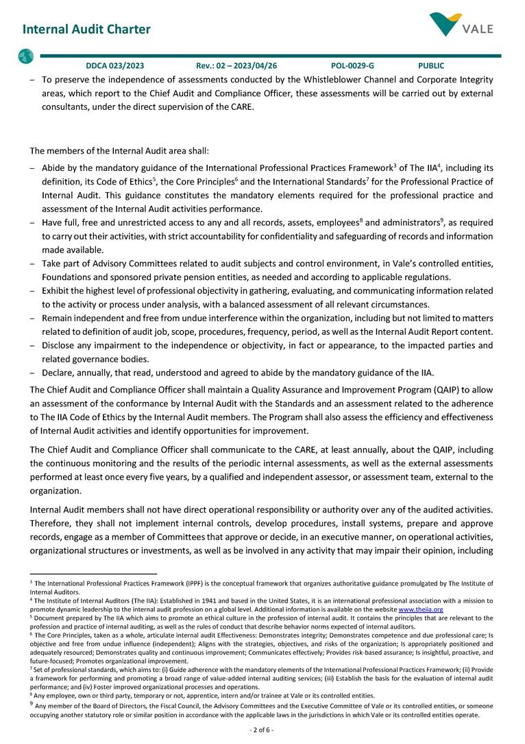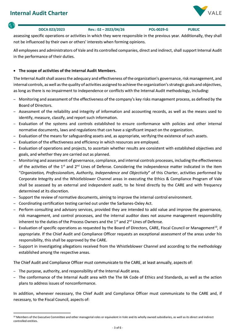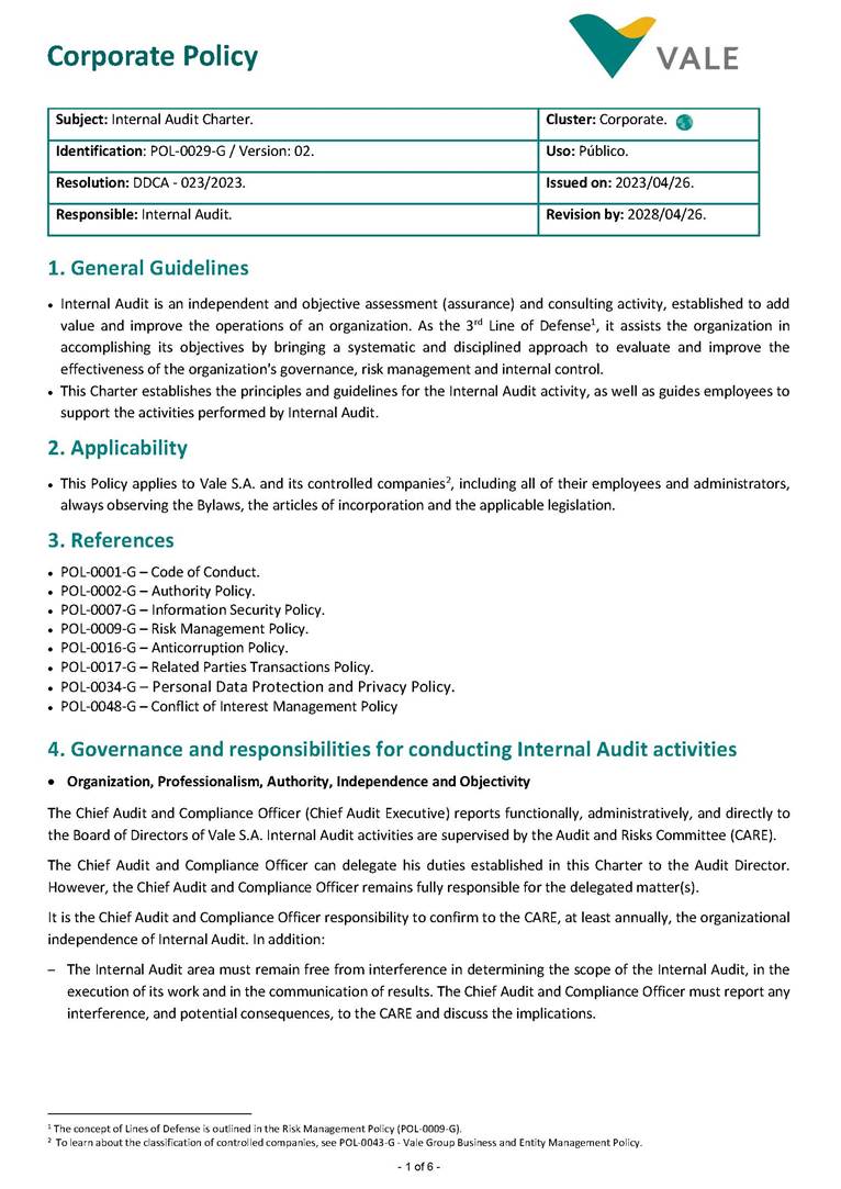 - 1 of 6 - Corporate Policy Subject: Internal Audit Charter. Cluster: Corporate. Identification: POL-0029-G / Version: 02. Uso: Público. Resolution: DDCA - 023/2023. Issued on: 2023/04/26. Responsible: Internal Audit. Revision by: 2028/04/26. 1. General Guidelines • Internal Audit is an independent and objective assessment (assurance) and consulting activity, established to add value and improve the operations of an organization. As the 3rd Line of Defense1, it assists the organization in accomplishing its objectives by bringing a systematic and disciplined approach to evaluate and improve the effectiveness of the organization's governance, risk management and internal control. • This Charter establishes the principles and guidelines for the Internal Audit activity, as well as guides employees to support the activities performed by Internal Audit. 2. Applicability • This Policy applies to Vale S.A. and its controlled companies2, including all of their employees and administrators, always observing the Bylaws, the articles of incorporation and the applicable legislation. 3. References • POL-0001-G – Code of Conduct. • POL-0002-G – Authority Policy. • POL-0007-G – Information Security Policy. • POL-0009-G – Risk Management Policy. • POL-0016-G – Anticorruption Policy. • POL-0017-G – Related Parties Transactions Policy. • POL-0034-G – Personal Data Protection and Privacy Policy. • POL-0048-G – Conflict of Interest Management Policy 4. Governance and responsibilities for conducting Internal Audit activities • Organization, Professionalism, Authority, Independence and Objectivity The Chief Audit and Compliance Officer (Chief Audit Executive) reports functionally, administratively, and directly to the Board of Directors of Vale S.A. Internal Audit activities are supervised by the Audit and Risks Committee (CARE). The Chief Audit and Compliance Officer can delegate his duties established in this Charter to the Audit Director. However, the Chief Audit and Compliance Officer remains fully responsible for the delegated matter(s). It is the Chief Audit and Compliance Officer responsibility to confirm to the CARE, at least annually, the organizational independence of Internal Audit. In addition: – The Internal Audit area must remain free from interference in determining the scope of the Internal Audit, in the execution of its work and in the communication of results. The Chief Audit and Compliance Officer must report any interference, and potential consequences, to the CARE and discuss the implications. 1 The concept of Lines of Defense is outlined in the Risk Management Policy (POL-0009-G). 2 To learn about the classification of controlled companies, see POL-0043-G - Vale Group Business and Entity Management Policy. - 2 of 6 - Internal Audit Charter DDCA 023/2023 Rev.: 02 – 2023/04/26 POL-0029-G PUBLIC – To preserve the independence of assessments conducted by the Whistleblower Channel and Corporate Integrity areas, which report to the Chief Audit and Compliance Officer, these assessments will be carried out by external consultants, under the direct supervision of the CARE. The members of the Internal Audit area shall: – Abide by the mandatory guidance of the International Professional Practices Framework3 of The IIA4, including its definition, its Code of Ethics5, the Core Principles6 and the International Standards7 for the Professional Practice of Internal Audit. This guidance constitutes the mandatory elements required for the professional practice and assessment of the Internal Audit activities performance. – Have full, free and unrestricted access to any and all records, assets, employees8 and administrators9, as required to carry out their activities, with strict accountability for confidentiality and safeguarding of records and information made available. – Take part of Advisory Committees related to audit subjects and control environment, in Vale’s controlled entities, Foundations and sponsored private pension entities, as needed and according to applicable regulations. – Exhibit the highest level of professional objectivity in gathering, evaluating, and communicating information related to the activity or process under analysis, with a balanced assessment of all relevant circumstances. – Remain independent and free from undue interference within the organization, including but not limited to matters related to definition of audit job, scope, procedures, frequency, period, as well as the Internal Audit Report content. – Disclose any impairment to the independence or objectivity, in fact or appearance, to the impacted parties and related governance bodies. – Declare, annually, that read, understood and agreed to abide by the mandatory guidance of the IIA. The Chief Audit and Compliance Officer shall maintain a Quality Assurance and Improvement Program (QAIP) to allow an assessment of the conformance by Internal Audit with the Standards and an assessment related to the adherence to The IIA Code of Ethics by the Internal Audit members. The Program shall also assess the efficiency and effectiveness of Internal Audit activities and identify opportunities for improvement. The Chief Audit and Compliance Officer shall communicate to the CARE, at least annually, about the QAIP, including the continuous monitoring and the results of the periodic internal assessments, as well as the external assessments performed at least once every five years, by a qualified and independent assessor, or assessment team, external to the organization. Internal Audit members shall not have direct operational responsibility or authority over any of the audited activities. Therefore, they shall not implement internal controls, develop procedures, install systems, prepare and approve records, engage as a member of Committees that approve or decide, in an executive manner, on operational activities, organizational structures or investments, as well as be involv