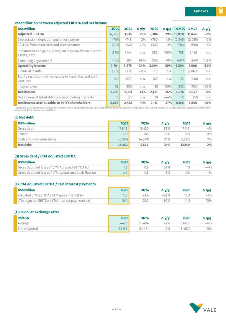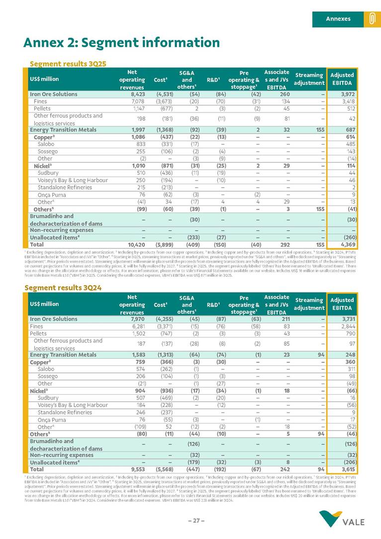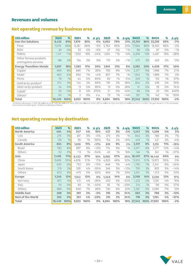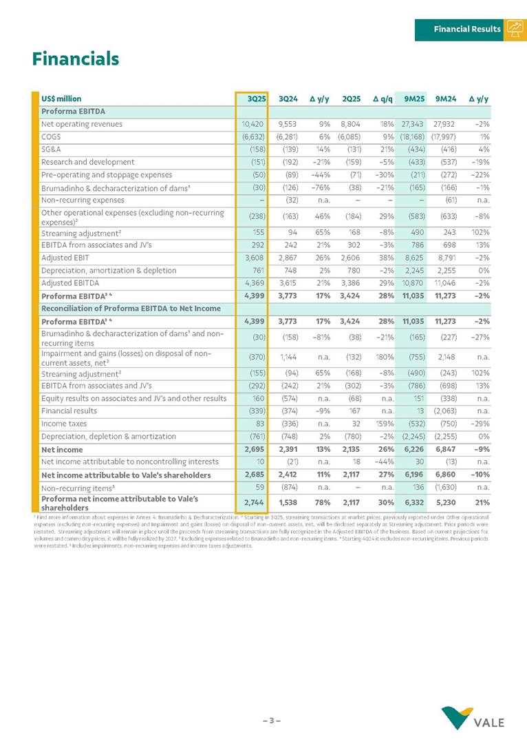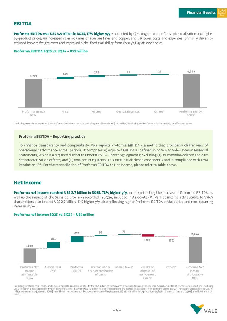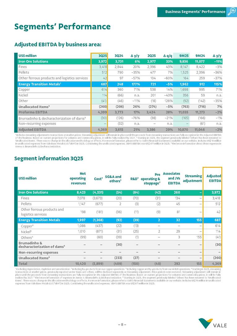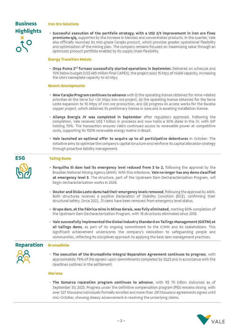 – 1 – 8. Selected financial indicators 9. US$ million 3Q25 3Q24 Δ y/y 2Q25 Δ q/q 9M25 9M24 Δ y/y Net operating revenues 10,420 9,553 9% 8,804 18% 27,343 27,932 -2% 10. Total costs and expenses (ex-Brumadinho and dams decharacterization) 1 (7,229) (6,896) 5% (6,630) 9% (19,829) (19,916) 0% Expenses related to Brumadinho and dams decharacterization (30) (126) -76% (38) -21% (165) (166) -1% 11. Adjusted EBIT 3,608 2,867 26% 2,606 38% 8,625 8,791 -2% 12. Adjusted EBITDA 4,369 3,615 21% 3,386 29% 10,870 11,046 -2% 13. Proforma EBITDA2 3 4,399 3,773 17% 3,424 28% 11,035 11,273 -2% 14. Proforma EBITDA margin (%) 42% 39% 3 p.p. 39% 3 p.p. 40% 40% 0 p.p. 5. Free cash flow 2,568 587 337% 1,008 155% 4,080 5,610 -27% 6. Recurring free cash flow 1,562 512 205% 1,008 55% 3,074 2,954 4% 7. Attributable net income 2,685 2,412 11% 2,117 27% 6,196 6,860 -10% 3. Proforma net income attributable to Vale’s shareholders 2,744 1,538 78% 2,117 30% 6,332 5,230 21% 4. Net debt⁴ 12,452 9,536 31% 12,149 2% 12,452 9,536 31% 2. Expanded net debt 16,640 16,472 1% 17,448 -5% 16,640 16,472 1% 1. Capital expenditures 1,250 1,398 -11% 1,053 19% 3,477 4,121 -16% 1 Includes adjustment of US$ 155 million in 3Q25, US$ 168 million in 2Q25, US$ 490 million in 9M25, US$ 94 million in 3Q24 and US$ 243 million in 9M24 to reflect the streaming transactions performance at market price. 2 Excluding expenses related to Brumadinho and non-recurring items. 3 Including the EBITDA from associates and JVs. Historical figures were restated. 4 Including leases (IFRS 16). Results Highlights • Robust sales performance across all business segments. Iron ore, copper and nickel sales increased by 5% (+4 Mt), 20% (+15 kt) and 6% (+2 kt) y/y, respectively, supported by solid operational performance. • The average realized iron ore fines price was US$ 94.4/t, 11% higher q/q and 4% higher y/y, outperforming the broader increase in iron ore reference price. This performance reflects quality premiums improvements driven by the product portfolio strategy. • All-in costs for iron ore declined 4% y/y to US$ 52.9/t, driven by enhanced quality premiums and reduced freight costs. • Iron ore fines’ C1 cash cost, excluding third-party purchases, remained largely flat y/y and on track to meet the 2025 guidance, reaching US$ 20.7/t in the quarter. • Copper all-in costs were down 65% y/y (to US$ 994/t), while nickel all-in costs declined 32% y/y (to US$ 12,347/t). These improvements were driven by operational efficiencies, increased production and higher by-products revenues. • Copper all-in cost guidance for 2025 further revised down to US$ 1,000-1,500/t (from US$ 1,500-2,000/t), driven by higher gold prices. Nickel all-in cost guidance for 2025 revised down to US$ 13,000-14,000/t, (from US$ 14,000-15,500/t), driven by solid operational performance and strong metals price, benefitting polymetallic assets. • Proforma EBITDA totaled US$ 4.4 billion, up 17% y/y and 28% q/q, driven by higher volumes, cost efficiencies, and higher iron ore, copper and by-products prices. • Capital expenditures of US$ 1.3 billion were US$ 0.1 billion lower y/y, on track to meet the guidance of US$ 5.4-5.7 billion set for 2025. • Recurring Free Cash Flow generation was US$ 1.6 billion, US$ 1.0 billion higher y/y, primarily reflecting stronger EBITDA. • Expanded net debt of US$ 16.6 billion at quarter-end, US$ 0.8 billion lower q/q, driven by robust FCF generation. Rio de Janeiro, October 30th, 2025 Vale’s performance in 3Q25 “We delivered another strong quarter, marked by solid operational performance, continued progress on our strategic agenda and commitment to safety. Iron ore production reached its highest quarterly level since 2018 and copper had its best Q3 result since 2019, while we continued to improve our cost competitiveness on nickel. All of these reflect the operational consistency and relentless dedication of our teams. We advanced key growth projects under the New Carajás program and successfully started up the 2nd furnace at Onça Puma, unlocking growth and reinforcing our long-term value creation strategy. Our flexible iron ore portfolio, supported by an extended value chain, once again proved essential in enhancing our competitiveness and resilience across market cycles. Safety remains our priority, and we are very happy to have achieved an important milestone by having no dams classified at emergency level 3 - a fundamental step in our journey to become a trusted partner to society. These results strengthen my confidence in Vale’s future and in the value we are creating for all stakeholders.", commented Gustavo Pimenta, CEO – 2 – Business Highlights Iron Ore Solutions • Successful execution of the portfolio strategy, with a US$ 2/t improvement in iron ore fines premiums q/q, supported by the increase in blended and concentrated products. In the quarter, Vale also officially launched its mid-grade Carajás product, which provides greater operational flexibility and optimization of the mining plan. The company remains focused on maximizing value through an optimized product portfolio enabled by its supply chain flexibility. Energy Transition Metals • Onça Puma 2nd furnace successfully started operations in September. Delivered on schedule and 13% below budget (US$ 480 million final CAPEX), the project adds 15 ktpy of nickel capacity, increasing the site's nameplate capacity to 40 ktpy. Recent developments • New Carajás Program continues to advance with (i) the operating license obtained for mine-related activities at the Serra Sul +20 Mtpy iron ore project, (ii) the operating license obtained for the Serra Leste expansion to 10 Mtpy of iron ore production, and (iii) progress on access works for the Bacaba copper project, which obtained its preliminary license in June and is awaiting installation license. • Aliança Energia JV was completed in September after regulatory approvals. Following the completion, Vale receiv