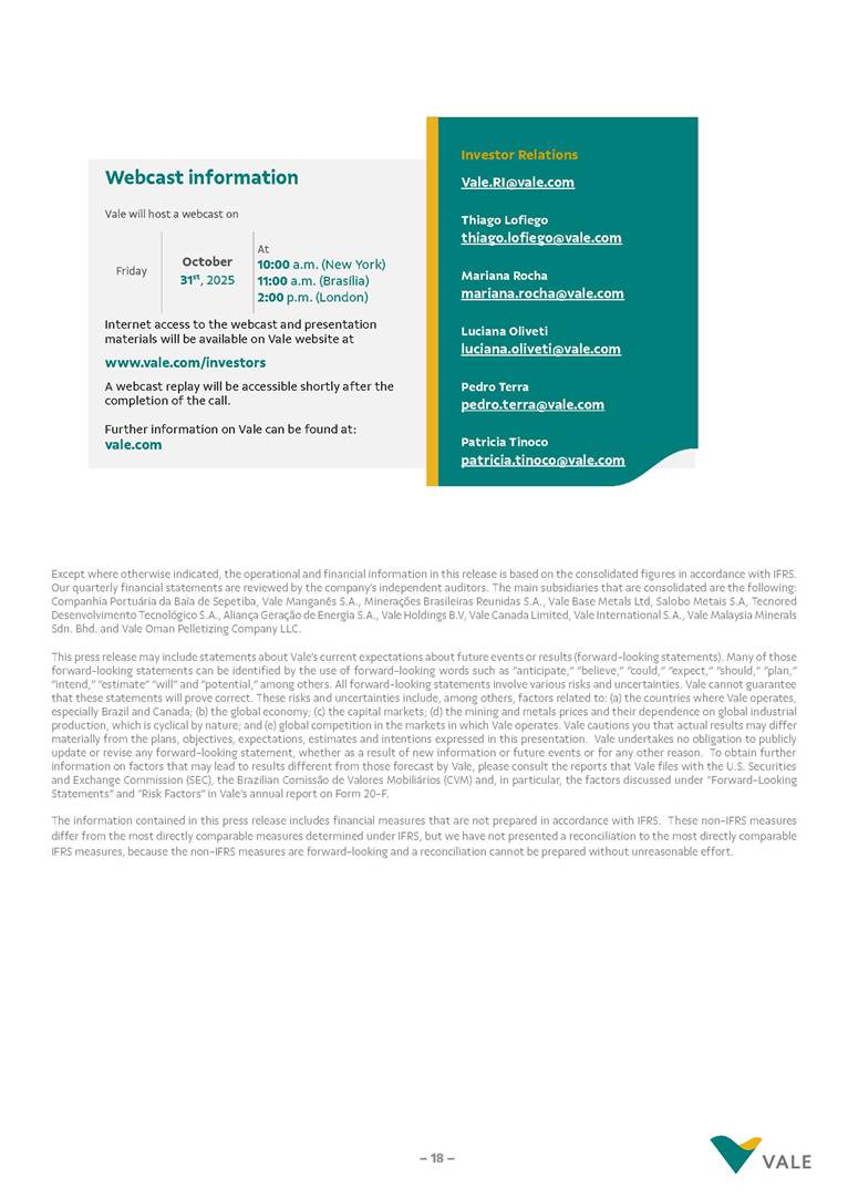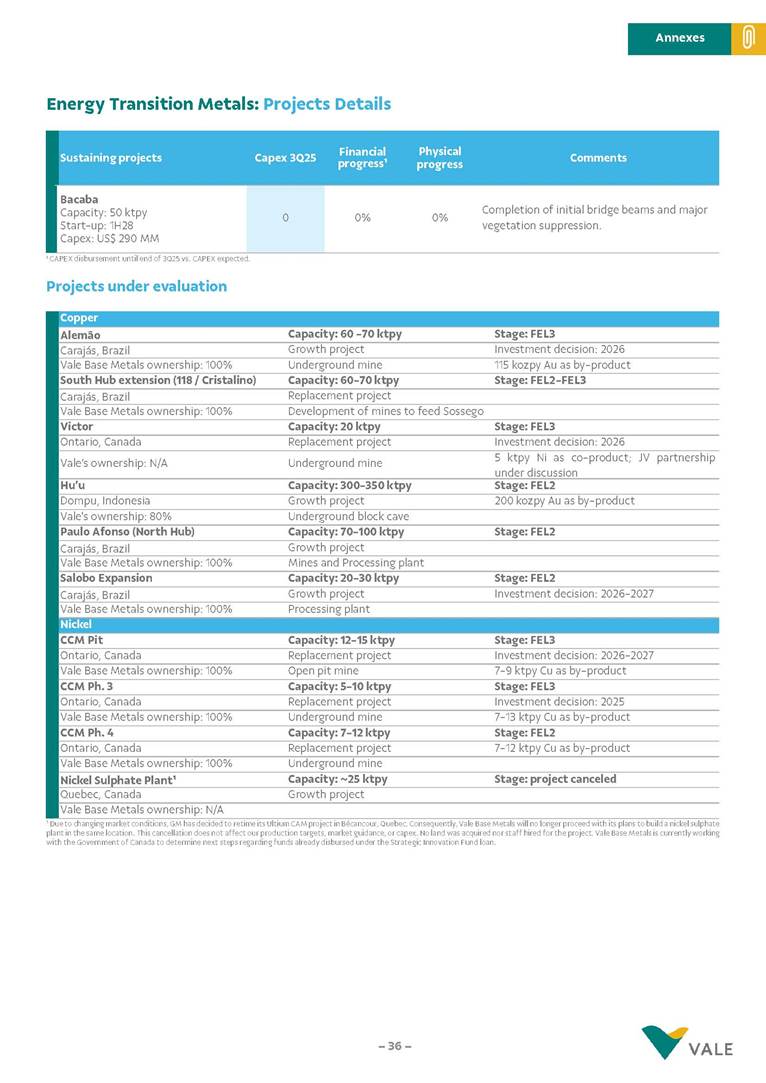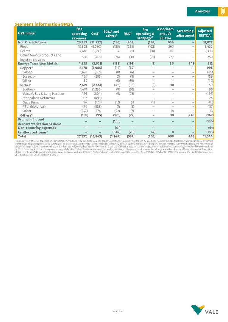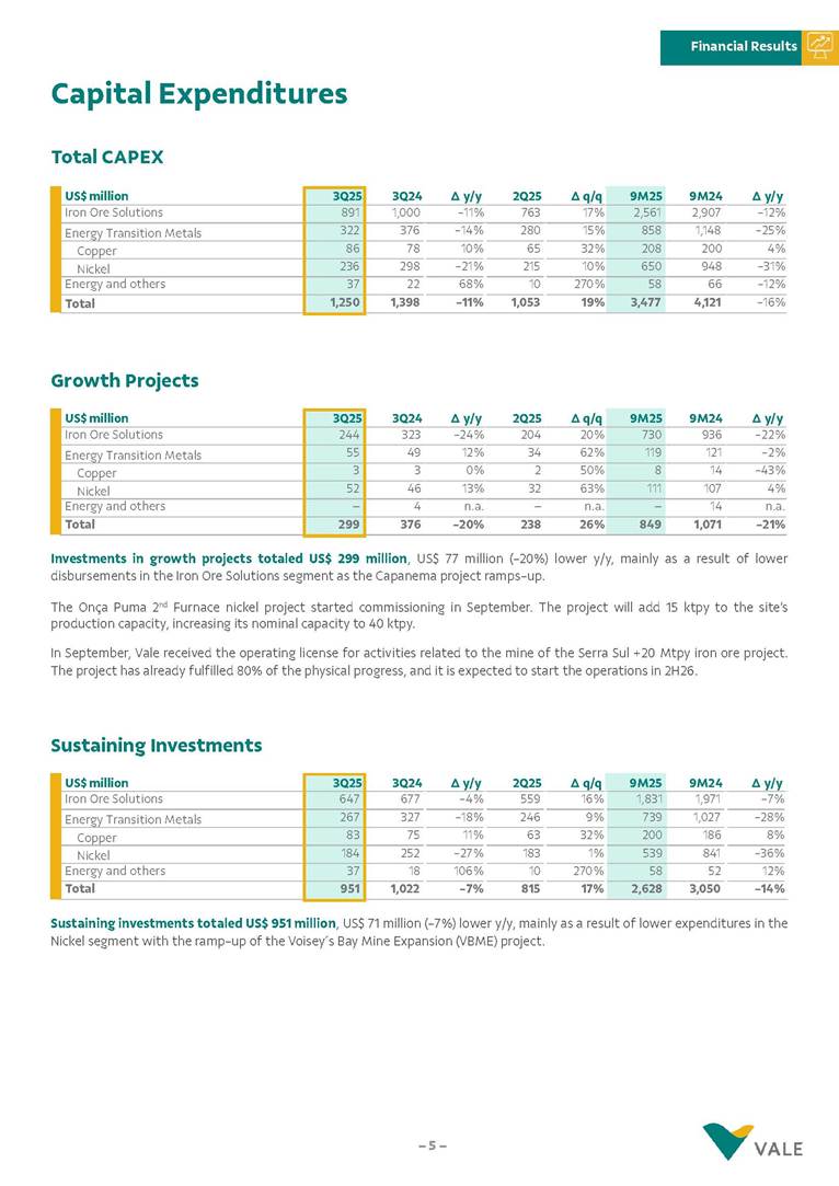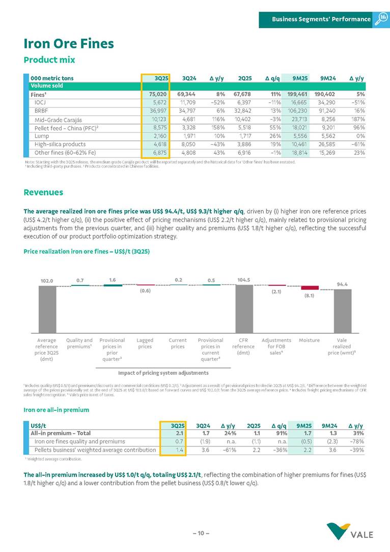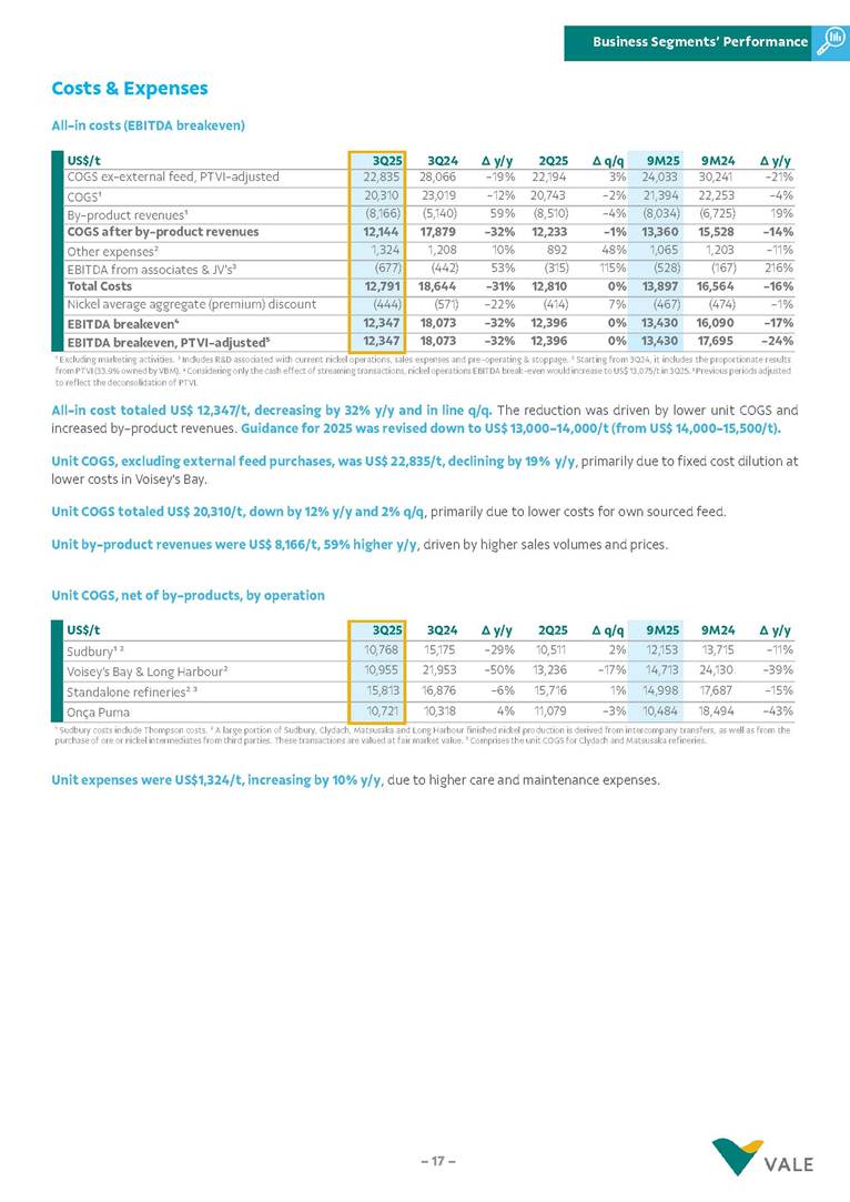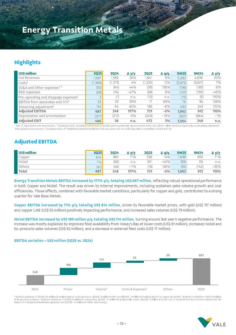 – 1 – 8. Selected financial indicators 9. US$ million 3Q25 3Q24 Δ y/y 2Q25 Δ q/q 9M25 9M24 Δ y/y Net operating revenues 10,420 9,553 9% 8,804 18% 27,343 27,932 -2% 10. Total costs and expenses (ex-Brumadinho and dams decharacterization) 1 (7,229) (6,896) 5% (6,630) 9% (19,829) (19,916) 0% Expenses related to Brumadinho and dams decharacterization (30) (126) -76% (38) -21% (165) (166) -1% 11. Adjusted EBIT 3,608 2,867 26% 2,606 38% 8,625 8,791 -2% 12. Adjusted EBITDA 4,369 3,615 21% 3,386 29% 10,870 11,046 -2% 13. Proforma EBITDA2 3 4,399 3,773 17% 3,424 28% 11,035 11,273 -2% 14. Proforma EBITDA margin (%) 42% 39% 3 p.p. 39% 3 p.p. 40% 40% 0 p.p. 5. Free cash flow 2,568 587 337% 1,008 155% 4,080 5,610 -27% 6. Recurring free cash flow 1,562 512 205% 1,008 55% 3,074 2,954 4% 7. Attributable net income 2,685 2,412 11% 2,117 27% 6,196 6,860 -10% 3. Proforma net income attributable to Vale’s shareholders 2,744 1,538 78% 2,117 30% 6,332 5,230 21% 4. Net debt⁴ 12,452 9,536 31% 12,149 2% 12,452 9,536 31% 2. Expanded net debt 16,640 16,472 1% 17,448 -5% 16,640 16,472 1% 1. Capital expenditures 1,250 1,398 -11% 1,053 19% 3,477 4,121 -16% 1 Includes adjustment of US$ 155 million in 3Q25, US$ 168 million in 2Q25, US$ 490 million in 9M25, US$ 94 million in 3Q24 and US$ 243 million in 9M24 to reflect the streaming transactions performance at market price. 2 Excluding expenses related to Brumadinho and non-recurring items. 3 Including the EBITDA from associates and JVs. Historical figures were restated. 4 Including leases (IFRS 16). Results Highlights • Robust sales performance across all business segments. Iron ore, copper and nickel sales increased by 5% (+4 Mt), 20% (+15 kt) and 6% (+2 kt) y/y, respectively, supported by solid operational performance. • The average realized iron ore fines price was US$ 94.4/t, 11% higher q/q and 4% higher y/y, outperforming the broader increase in iron ore reference price. This performance reflects quality premiums improvements driven by the product portfolio strategy. • All-in costs for iron ore declined 4% y/y to US$ 52.9/t, driven by enhanced quality premiums and reduced freight costs. • Iron ore fines’ C1 cash cost, excluding third-party purchases, remained largely flat y/y and on track to meet the 2025 guidance, reaching US$ 20.7/t in the quarter. • Copper all-in costs were down 65% y/y (to US$ 994/t), while nickel all-in costs declined 32% y/y (to US$ 12,347/t). These improvements were driven by operational efficiencies, increased production and higher by-products revenues. • Copper all-in cost guidance for 2025 further revised down to US$ 1,000-1,500/t (from US$ 1,500-2,000/t), driven by higher gold prices. Nickel all-in cost guidance for 2025 revised down to US$ 13,000-14,000/t, (from US$ 14,000-15,500/t), driven by solid operational performance and strong metals price, benefitting polymetallic assets. • Proforma EBITDA totaled US$ 4.4 billion, up 17% y/y and 28% q/q, driven by higher volumes, cost efficiencies, and higher iron ore, copper and by-products prices. • Capital expenditures of US$ 1.3 billion were US$ 0.1 billion lower y/y, on track to meet the guidance of US$ 5.4-5.7 billion set for 2025. • Recurring Free Cash Flow generation was US$ 1.6 billion, US$ 1.0 billion higher y/y, primarily reflecting stronger EBITDA. • Expanded net debt of US$ 16.6 billion at quarter-end, US$ 0.8 billion lower q/q, driven by robust FCF generation. Rio de Janeiro, October 30th, 2025 Vale’s performance in 3Q25 “We delivered another strong quarter, marked by solid operational performance, continued progress on our strategic agenda and commitment to safety. Iron ore production reached its highest quarterly level since 2018 and copper had its best Q3 result since 2019, while we continued to improve our cost competitiveness on nickel. All of these reflect the operational consistency and relentless dedication of our teams. We advanced key growth projects under the New Carajás program and successfully started up the 2nd furnace at Onça Puma, unlocking growth and reinforcing our long-term value creation strategy. Our flexible iron ore portfolio, supported by an extended value chain, once again proved essential in enhancing our competitiveness and resilience across market cycles. Safety remains our priority, and we are very happy to have achieved an important milestone by having no dams classified at emergency level 3 - a fundamental step in our journey to become a trusted partner to society. These results strengthen my confidence in Vale’s future and in the value we are creating for all stakeholders.", commented Gustavo Pimenta, CEO – 2 – Business Highlights Iron Ore Solutions • Successful execution of the portfolio strategy, with a US$ 2/t improvement in iron ore fines premiums q/q, supported by the increase in blended and concentrated products. In the quarter, Vale also officially launched its mid-grade Carajás product, which provides greater operational flexibility and optimization of the mining plan. The company remains focused on maximizing value through an optimized product portfolio enabled by its supply chain flexibility. Energy Transition Metals • Onça Puma 2nd furnace successfully started operations in September. Delivered on schedule and 13% below budget (US$ 480 million final CAPEX), the project adds 15 ktpy of nickel capacity, increasing the site's nameplate capacity to 40 ktpy. Recent developments • New Carajás Program continues to advance with (i) the operating license obtained for mine-related activities at the Serra Sul +20 Mtpy iron ore project, (ii) the operating license obtained for the Serra Leste expansion to 10 Mtpy of iron ore production, and (iii) progress on access works for the Bacaba copper project, which obtained its preliminary license in June and is awaiting installation license. • Aliança Energia JV was completed in September after regulatory approvals. Following the completion, Vale receiv