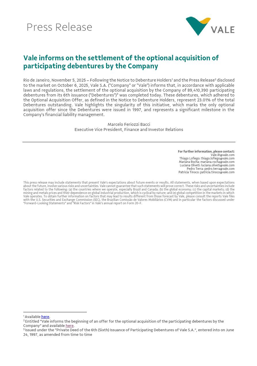 Vale informs on the settlement of the optional acquisition of participating debentures by the Company Rio de Janeiro, November 5, 2025 – Following the Notice to Debenture Holders1 and the Press Release2 disclosed to the market on October 6, 2025, Vale S.A. ("Company" or "Vale") informs that, in accordance with applicable laws and regulations, the settlement of the optional acquisition by the Company of 89,410,390 participating debentures from its 6th issuance ("Debentures")3 was completed today. These debentures, which adhered to the Optional Acquisition Offer, as defined in the Notice to Debenture Holders, represent 23.01% of the total Debentures outstanding. Vale highlights the singularity of this initiative, which marks the only optional acquisition offer since the Debentures were issued in 1997, and represents a significant milestone in the Company's financial liability management. Marcelo Feriozzi Bacci Executive Vice President, Finance and Investor Relations For further information, please contact: Vale.RI@vale.com Thiago Lofiego: thiago.lofiego@vale.com Mariana Rocha: mariana.rocha@vale.com Luciana Oliveti: luciana.oliveti@vale.com Pedro Terra: pedro.terra@vale.com Patricia Tinoco: patricia.tinoco@vale.com This press release may include statements that present Vale’s expectations about future events or results. All statements, when based upon expectations about the future, involve various risks and uncertainties. Vale cannot guarantee that such statements will prove correct. These risks and uncertainties include factors related to the following: (a) the countries where we operate, especially Brazil and Canada; (b) the global economy; (c) the capital markets; (d) the mining and metals prices and their dependence on global industrial production, which is cyclical by nature; and (e) global competition in the markets in which Vale operates. To obtain further information on factors that may lead to results different from those forecast by Vale, please consult the reports Vale files with the U.S. Securities and Exchange Commission (SEC), the Brazilian Comissão de Valores Mobiliários (CVM) and in particular the factors discussed under “Forward-Looking Statements” and “Risk Factors” in Vale’s annual report on Form 20-F. 1 Available here. 2 Entitled “Vale informs the beginning of an offer for the optional acquisition of the participating debentures by the Company” and available here. 3 Issued under the “Private Deed of the 6th (Sixth) Issuance of Participating Debentures of Vale S.A.”, entered into on June 24, 1997, as amended from time to time Press Release