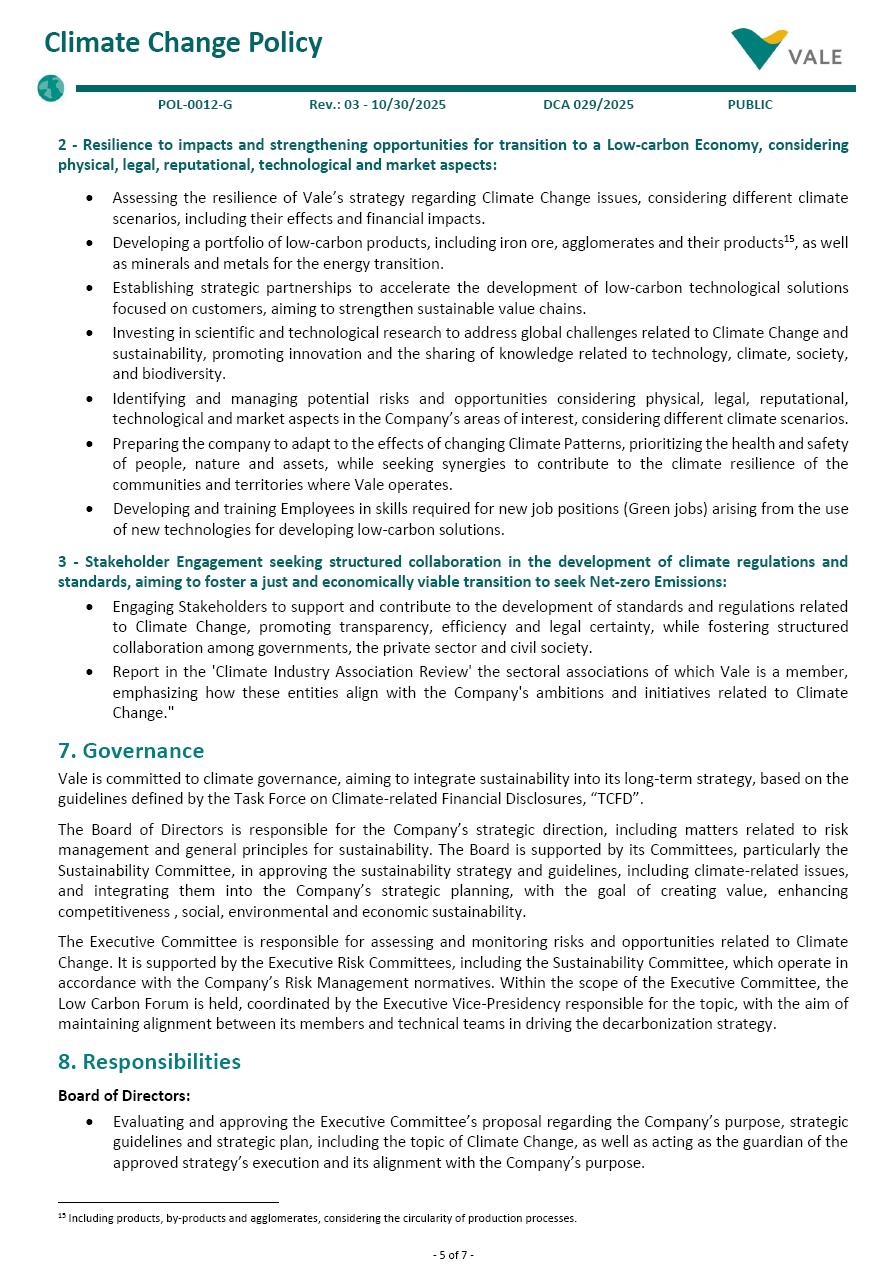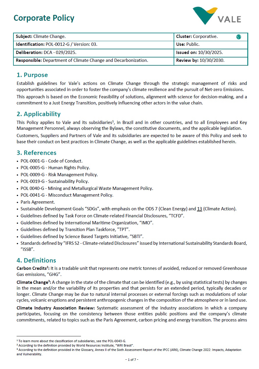Subject: Climate Change. Cluster: Corporative. Identification: POL-0012-G / Version: 03. Use: Public. Deliberation: DCA - 029/2025. Issued on: 10/30/2025. Responsible: Department of Climate Change and Decarbonization. Review by: 10/30/2030. - 1 of 7 - Corporate Policy 1. Purpose Establish guidelines for Vale's actions on Climate Change through the strategic management of risks and opportunities associated in order to foster the company's climate resilience and the pursuit of Net-zero Emissions. This approach is based on the Economic Feasibility of solutions, alignment with science for decision-making, and a commitment to a Just Energy Transition, positively influencing other actors in the value chain. 2. Applicability This Policy applies to Vale and its subsidiaries1, in Brazil and in other countries, and to all Employees and Key Management Personnel, always observing the Bylaws, the constitutive documents, and the applicable legislation. Customers, Suppliers and Partners of Vale and its subsidiaries are expected to be aware of this Policy and seek to base their conduct on best practices in Climate Change, as well as the applicable guidelines established herein. 3. References • POL-0001-G - Code of Conduct. • POL-0005-G - Human Rights Policy. • POL-0009-G - Risk Management Policy. • POL-0019-G - Sustainability Policy. • POL 0040-G - Mining and Metallurgical Waste Management Policy. • POL-0041-G - Misconduct Management Policy. • Paris Agreement. • Sustainable Development Goals “SDGs”, with emphasis on the ODS 7 (Clean Energy) and 13 (Climate Action). • Guidelines defined by Task Force on Climate-related Financial Disclosures, “TCFD”. • Guidelines defined by International Maritime Organization, “IMO”. • Guidelines defined by Transition Plan Taskforce, "TPT”. • Guidelines defined by Science Based Targets Initiative, “SBTi”. • Standards defined by “IFRS S2 - Climate-related Disclosures” issued by International Sustainability Standards Board, “ISSB”. 4. Definitions Carbon Credits2: It is a tradable unit that represents one metric tonnes of avoided, reduced or removed Greenhouse Gas emissions, “GHG”. Climate Change3: A change in the state of the climate that can be identified (e.g., by using statistical tests) by changes in the mean and/or the variability of its properties and that persists for an extended period, typically decades or longer. Climate Change may be due to natural internal processes or external forcings such as modulations of solar cycles, volcanic eruptions and persistent anthropogenic changes in the composition of the atmosphere or in land use. Climate Industry Association Review: Systematic assessment of the industry associations in which a company participates, focusing on the consistency between those entities public positions and the company’s climate commitments, related to topics such as the Paris Agreement, carbon pricing and energy transition. The process aims 1 To learn more about the classification of subsidiaries, see the POL-0043-G. 2 According to the definition provided by World Resources Institute, “WRI Brasil”. 3 According to the definition provided in the Glossary, Annex II of the Sixth Assessment Report of the IPCC (AR6), Climate Change 2022: Impacts, Adaptation and Vulnerability. - 2 of 7 - Climate Change Policy POL-0012-G Rev.: 03 - 10/30/2025 DCA 029/2025 PUBLIC to identify alignments and misalignments, and may propose measures such as engagement, reassessment of participation or public transparency, as well as establishing governance for ongoing monitoring. Climate Patterns: Predictable and measurable behavior patterns of climate elements such as temperature, precipitation, wind and humidity, which together with geographic factors (altitude, vegetation cover, air masses, etc.), define the climate of a certain region. Customers: Any customer, including their intermediaries, of Vale’s products or services or those of its subsidiaries. Economic Feasibility: Analysis that determines whether a project, investment or activity is financially sustainable and capable of generating value (return) through the disbursements involved. Employees: For the purposes of this Policy, any Vale employee and/or its subsidiaries, whether permanent or temporary, interns, young apprentices and/or trainees. Green jobs4: Decent jobs that contribute to protecting and restoring the environment and addressing Climate Change. Greenhouse Gases (GHG): Defined by GHG Protocol (Greenhouse Gas Protocol) as CO2, CH4, N2O, HFC, PFC, SF6 and NF3, being referred to in this Policy as “emissions”; “carbon” or “GHG”. Hard-to-abate5: Refers to the sectors whose emissions are difficult to reduce (hard-to-abate), in which, therefore, the transition is considered more challenging, such as heavy industry, notably iron and steel, cement and chemicals, and the three modes of long-distance transport: trucking, shipping and aviation. High-integrity Carbon Credits: Certificates that represent the real, measurable, additional, permanent and verified removal or reduction of GHG emissions, reconciling technical, of governance and socio-environmental aspects over time. Just Energy Transition: Promoting the transition to a green economy in a way that is fair and inclusive for all stakeholders means creating decent work opportunities and leaving no one behind (International Labour Organization – ILO, 2023). This transition must incorporate key principles, such as respect and dignity for vulnerable groups, the creation of decent jobs, social protection, employment rights, fairness in energy access and use, in addition to social dialogue and democratic consultation with the relevant Stakeholders, while coping with the effects of asset-stranding and the transition to Net-Zero (IPCC, 2022a). Key Management Personnel: For the purposes of this Policy, the members of the Board of Directors, the Executive Committee, the Advisory Committees to th