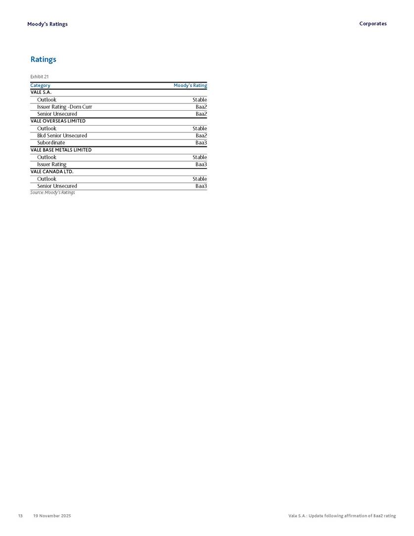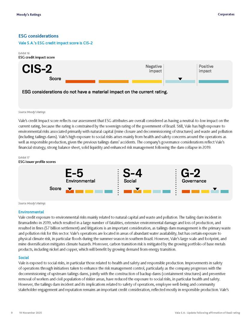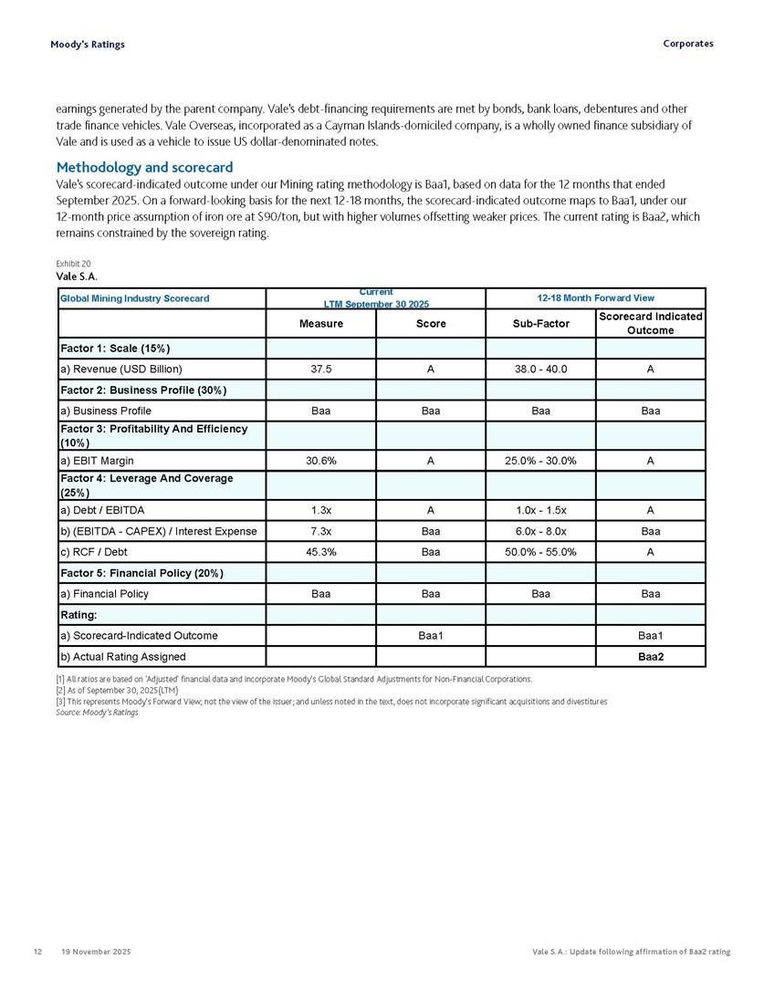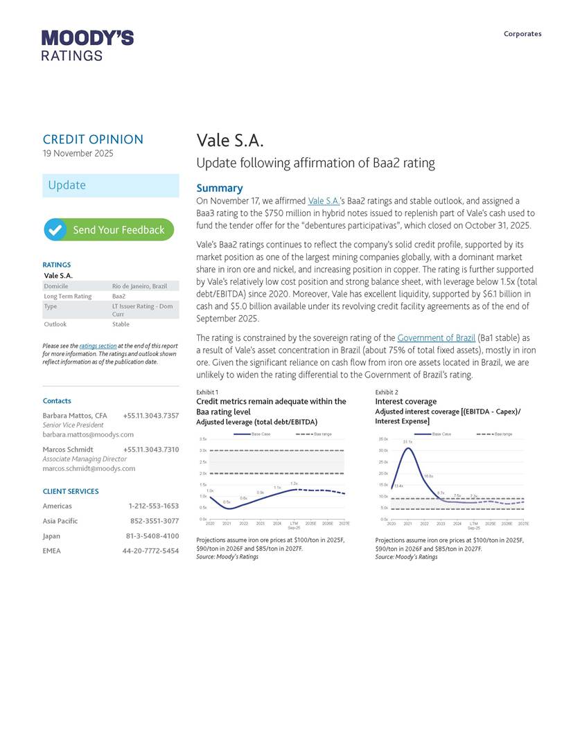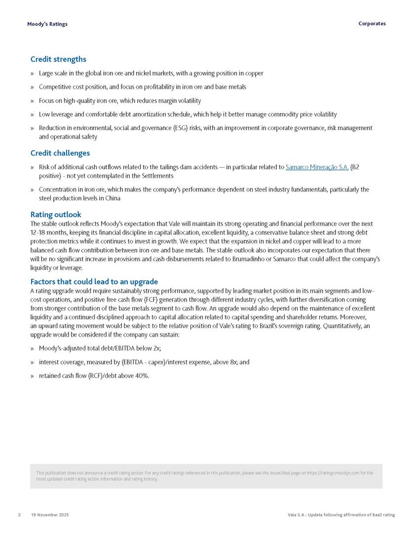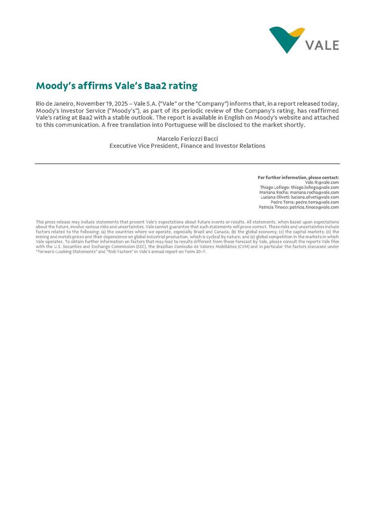 Moody’s affirms Vale’s Baa2 rating Rio de Janeiro, November 19, 2025 – Vale S.A. (“Vale” or the “Company”) informs that, in a report released today, Moody’s Investor Service (“Moody’s”), as part of its periodic review of the Company’s rating, has reaffirmed Vale’s rating at Baa2 with a stable outlook. The report is available in English on Moody’s website and attached to this communication. A free translation into Portuguese will be disclosed to the market shortly. Marcelo Feriozzi Bacci Executive Vice President, Finance and Investor Relations For further information, please contact: Vale.RI@vale.com Thiago Lofiego: thiago.lofiego@vale.com Mariana Rocha: mariana.rocha@vale.com Luciana Oliveti: luciana.oliveti@vale.com Pedro Terra: pedro.terra@vale.com Patricia Tinoco: patricia.tinoco@vale.com This press release may include statements that present Vale’s expectations about future events or results. All statements, when based upon expectations about the future, involve various risks and uncertainties. Vale cannot guarantee that such statements will prove correct. These risks and uncertainties include factors related to the following: (a) the countries where we operate, especially Brazil and Canada; (b) the global economy; (c) the capital markets; (d) the mining and metals prices and their dependence on global industrial production, which is cyclical by nature; and (e) global competition in the markets in which Vale operates. To obtain further information on factors that may lead to results different from those forecast by Vale, please consult the reports Vale files with the U.S. Securities and Exchange Commission (SEC), the Brazilian Comissão de Valores Mobiliários (CVM) and in particular the factors discussed under “Forward-Looking Statements” and “Risk Factors” in Vale’s annual report on Form 20-F. Corporates CREDIT OPINION 19 November 2025 Update RATINGS Vale S.A. Domicile Rio de Janeiro, Brazil Long Term Rating Baa2 Type LT Issuer Rating - Dom Curr Outlook Stable Please see the ratings section at the end of this report for more information. The ratings and outlook shown reflect information as of the publication date. Contacts Barbara Mattos, CFA +55.11.3043.7357 Senior Vice President barbara.mattos@moodys.com Marcos Schmidt +55.11.3043.7310 Associate Managing Director marcos.schmidt@moodys.com CLIENT SERVICES Americas 1-212-553-1653 Asia Pacific 852-3551-3077 Japan 81-3-5408-4100 EMEA 44-20-7772-5454 Vale S.A. Update following affirmation of Baa2 rating Summary On November 17, we affirmed Vale S.A.'s Baa2 ratings and stable outlook, and assigned a Baa3 rating to the $750 million in hybrid notes issued to replenish part of Vale's cash used to fund the tender offer for the “debentures participativas”, which closed on October 31, 2025. Vale's Baa2 ratings continues to reflect the company’s solid credit profile, supported by its market position as one of the largest mining companies globally, with a dominant market share in iron ore and nickel, and increasing position in copper. The rating is further supported by Vale's relatively low cost position and strong balance sheet, with leverage below 1.5x (total debt/EBITDA) since 2020. Moreover, Vale has excellent liquidity, supported by $6.1 billion in cash and $5.0 billion available under its revolving credit facility agreements as of the end of September 2025. The rating is constrained by the sovereign rating of the Government of Brazil (Ba1 stable) as a result of Vale's asset concentration in Brazil (about 75% of total fixed assets), mostly in iron ore. Given the significant reliance on cash flow from iron ore assets located in Brazil, we are unlikely to widen the rating differential to the Government of Brazil's rating. Exhibit 1 Credit metrics remain adequate within the Baa rating level Adjusted leverage (total debt/EBITDA) Exhibit 2 Interest coverage Adjusted interest coverage [(EBITDA - Capex)/ Interest Expense] 1.0x 0.5x 0.6x 0.9x 1.1x 1.3x 0.0x 0.5x 1.0x 1.5x 2.0x 2.5x 3.0x 3.5x 2020 2021 2022 2023 2024 LTM Sep-25 2025E 2026E 2027E Base Case Baa range Projections assume iron ore prices at $100/ton in 2025F, $90/ton in 2026F and $85/ton in 2027F. Source: Moody's Ratings 13.4x 31.1x 16.8x 8.7x 7.5x 7.3x 0.0x 5.0x 10.0x 15.0x 20.0x 25.0x 30.0x 35.0x 2020 2021 2022 2023 2024 LTM Sep-25 2025E 2026E 2027E Base Case Baa range Projections assume iron ore prices at $100/ton in 2025F, $90/ton in 2026F and $85/ton in 2027F. Source: Moody's Ratings Moody's Ratings Corporates Credit strengths » Large scale in the global iron ore and nickel markets, with a growing position in copper » Competitive cost position, and focus on profitability in iron ore and base metals » Focus on high-quality iron ore, which reduces margin volatility » Low leverage and comfortable debt amortization schedule, which help it better manage commodity price volatility » Reduction in environmental, social and governance (ESG) risks, with an improvement in corporate governance, risk management and operational safety Credit challenges » Risk of additional cash outflows related to the tailings dam accidents — in particular related to Samarco Mineração S.A. (B2 positive) - not yet contemplated in the Settlements » Concentration in iron ore, which makes the company's performance dependent on steel industry fundamentals, particularly the steel production levels in China Rating outlook The stable outlook reflects Moody's expectation that Vale will maintain its strong operating and financial performance over the next 12-18 months, keeping its financial discipline in capital allocation, excellent liquidity, a conservative balance sheet and strong debt protection metrics while it continues to invest in growth. We expect that the expansion in nickel and copper will lead to a more balanced cash flow contribution between iron ore and base metals. The stable outlook also incorporates our expectation that there will be no significant 