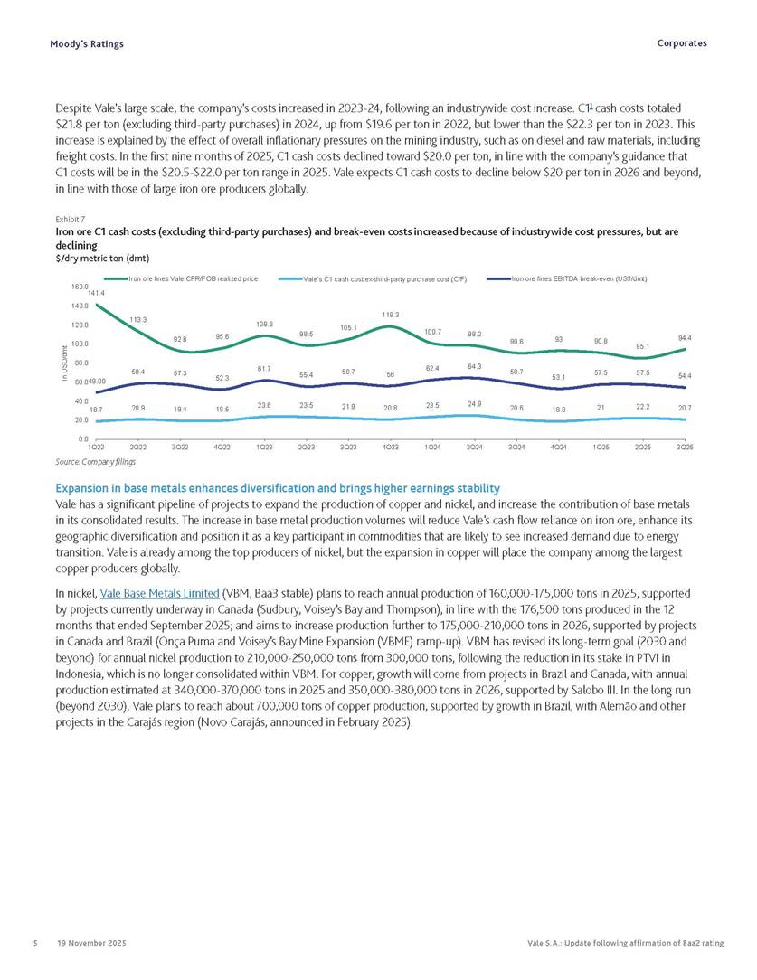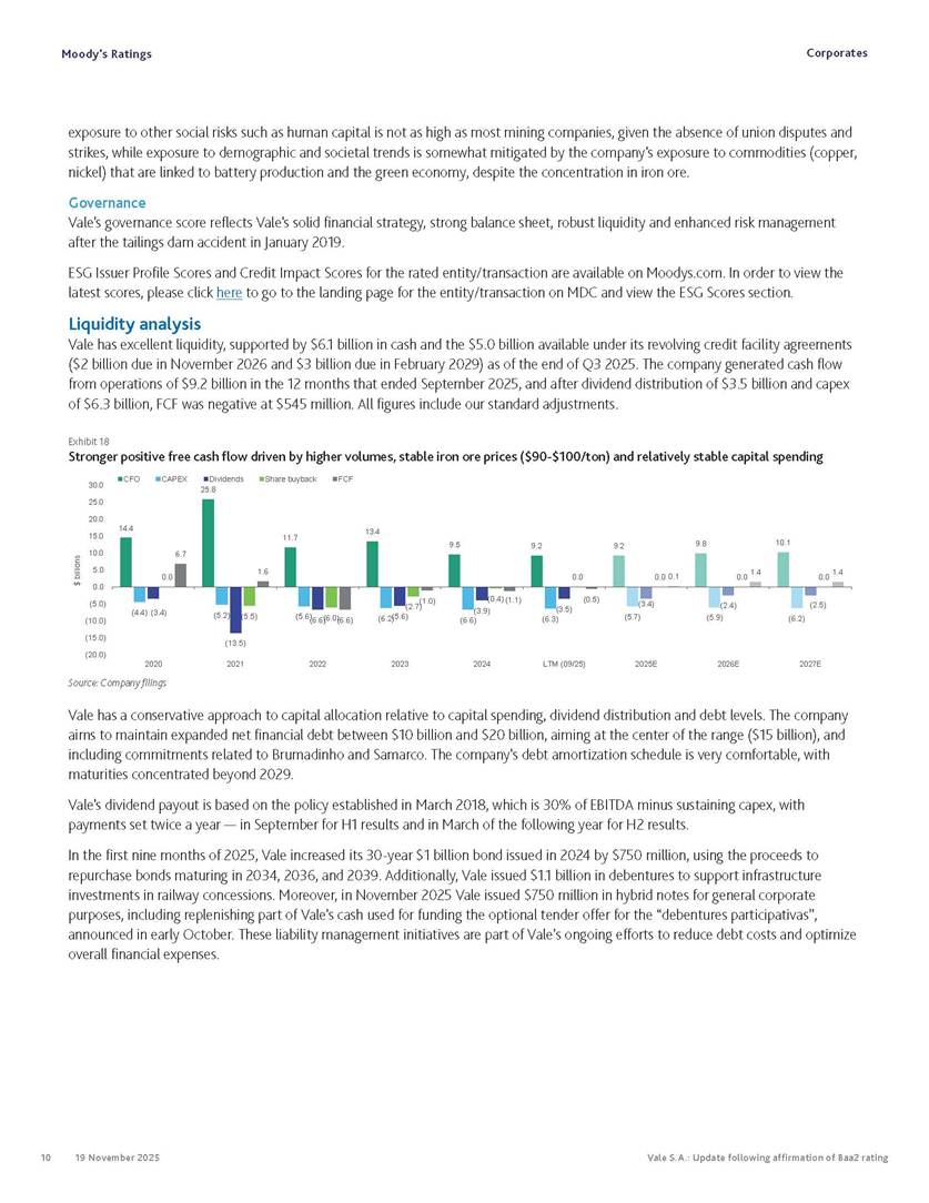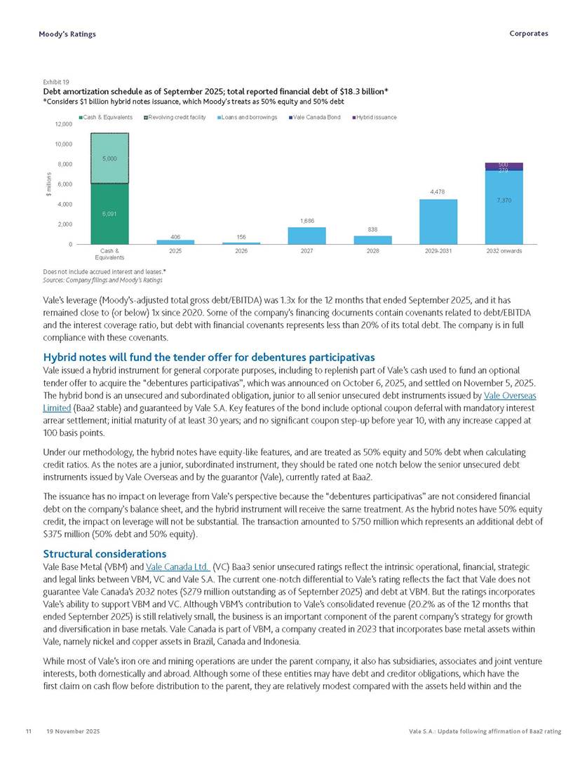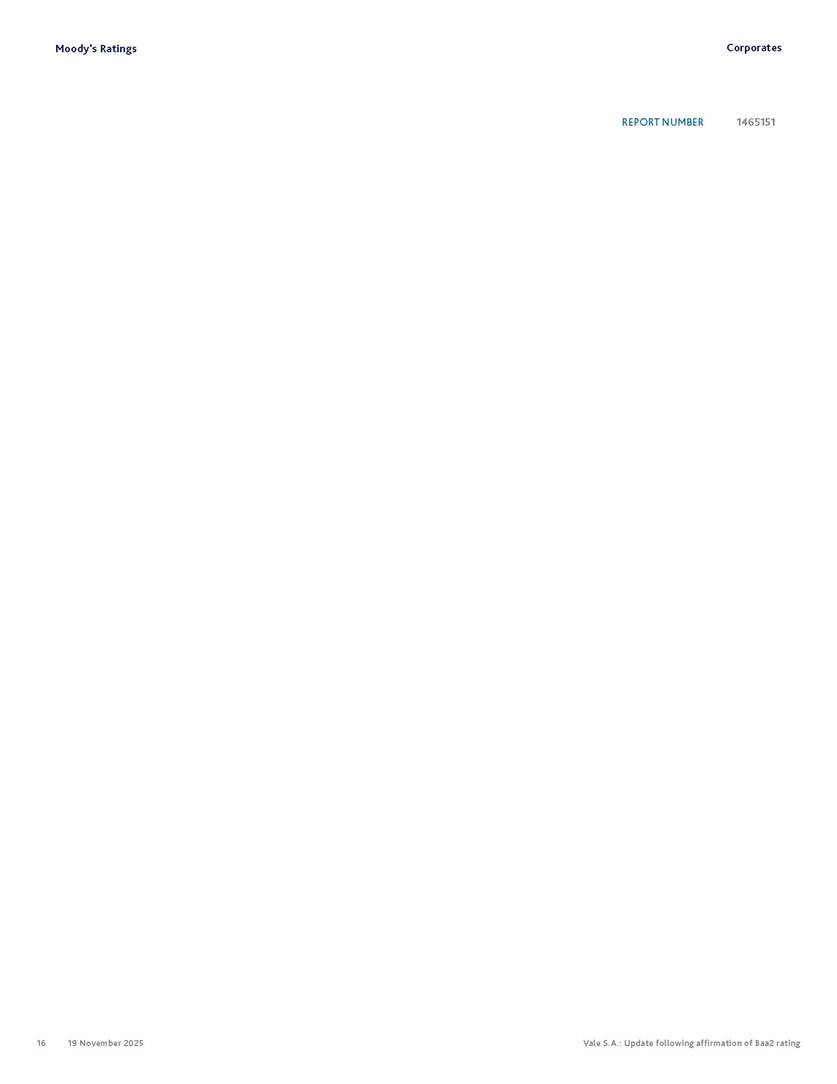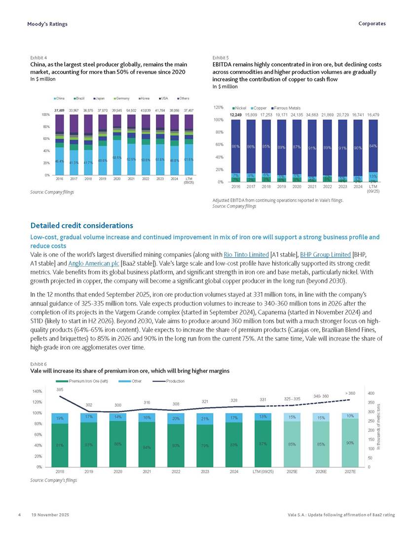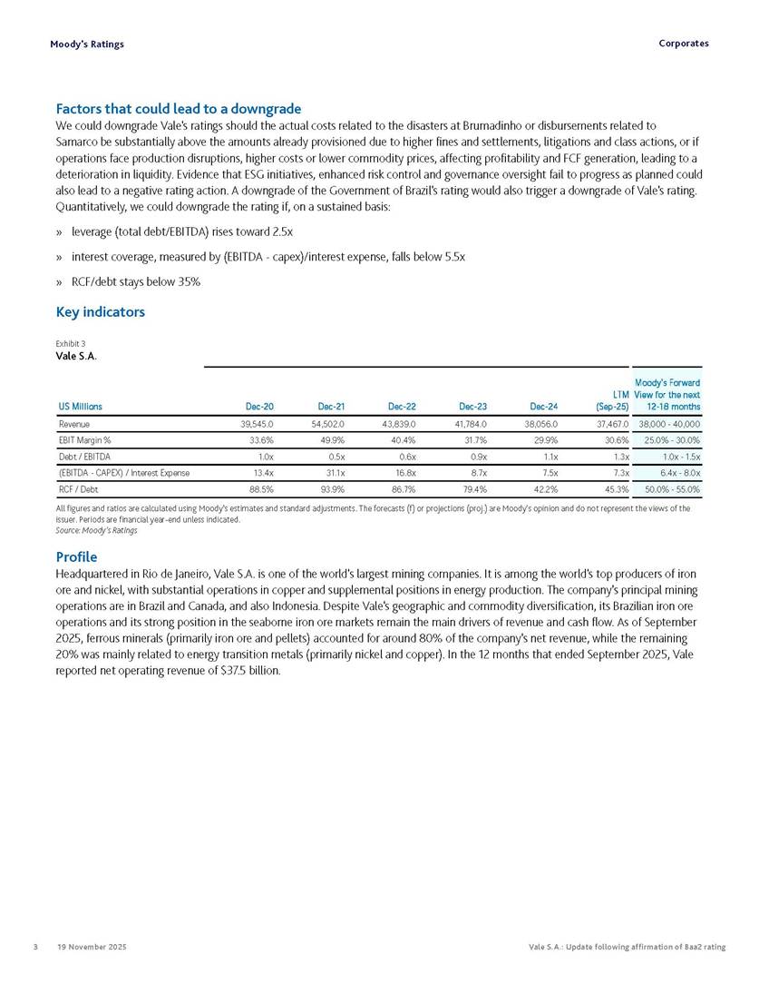 Moody’s affirms Vale’s Baa2 rating Rio de Janeiro, November 19, 2025 – Vale S.A. (“Vale” or the “Company”) informs that, in a report released today, Moody’s Investor Service (“Moody’s”), as part of its periodic review of the Company’s rating, has reaffirmed Vale’s rating at Baa2 with a stable outlook. The report is available in English on Moody’s website and attached to this communication. A free translation into Portuguese will be disclosed to the market shortly. Marcelo Feriozzi Bacci Executive Vice President, Finance and Investor Relations For further information, please contact: Vale.RI@vale.com Thiago Lofiego: thiago.lofiego@vale.com Mariana Rocha: mariana.rocha@vale.com Luciana Oliveti: luciana.oliveti@vale.com Pedro Terra: pedro.terra@vale.com Patricia Tinoco: patricia.tinoco@vale.com This press release may include statements that present Vale’s expectations about future events or results. All statements, when based upon expectations about the future, involve various risks and uncertainties. Vale cannot guarantee that such statements will prove correct. These risks and uncertainties include factors related to the following: (a) the countries where we operate, especially Brazil and Canada; (b) the global economy; (c) the capital markets; (d) the mining and metals prices and their dependence on global industrial production, which is cyclical by nature; and (e) global competition in the markets in which Vale operates. To obtain further information on factors that may lead to results different from those forecast by Vale, please consult the reports Vale files with the U.S. Securities and Exchange Commission (SEC), the Brazilian Comissão de Valores Mobiliários (CVM) and in particular the factors discussed under “Forward-Looking Statements” and “Risk Factors” in Vale’s annual report on Form 20-F. Corporates CREDIT OPINION 19 November 2025 Update RATINGS Vale S.A. Domicile Rio de Janeiro, Brazil Long Term Rating Baa2 Type LT Issuer Rating - Dom Curr Outlook Stable Please see the ratings section at the end of this report for more information. The ratings and outlook shown reflect information as of the publication date. Contacts Barbara Mattos, CFA +55.11.3043.7357 Senior Vice President barbara.mattos@moodys.com Marcos Schmidt +55.11.3043.7310 Associate Managing Director marcos.schmidt@moodys.com CLIENT SERVICES Americas 1-212-553-1653 Asia Pacific 852-3551-3077 Japan 81-3-5408-4100 EMEA 44-20-7772-5454 Vale S.A. Update following affirmation of Baa2 rating Summary On November 17, we affirmed Vale S.A.'s Baa2 ratings and stable outlook, and assigned a Baa3 rating to the $750 million in hybrid notes issued to replenish part of Vale's cash used to fund the tender offer for the “debentures participativas”, which closed on October 31, 2025. Vale's Baa2 ratings continues to reflect the company’s solid credit profile, supported by its market position as one of the largest mining companies globally, with a dominant market share in iron ore and nickel, and increasing position in copper. The rating is further supported by Vale's relatively low cost position and strong balance sheet, with leverage below 1.5x (total debt/EBITDA) since 2020. Moreover, Vale has excellent liquidity, supported by $6.1 billion in cash and $5.0 billion available under its revolving credit facility agreements as of the end of September 2025. The rating is constrained by the sovereign rating of the Government of Brazil (Ba1 stable) as a result of Vale's asset concentration in Brazil (about 75% of total fixed assets), mostly in iron ore. Given the significant reliance on cash flow from iron ore assets located in Brazil, we are unlikely to widen the rating differential to the Government of Brazil's rating. Exhibit 1 Credit metrics remain adequate within the Baa rating level Adjusted leverage (total debt/EBITDA) Exhibit 2 Interest coverage Adjusted interest coverage [(EBITDA - Capex)/ Interest Expense] 1.0x 0.5x 0.6x 0.9x 1.1x 1.3x 0.0x 0.5x 1.0x 1.5x 2.0x 2.5x 3.0x 3.5x 2020 2021 2022 2023 2024 LTM Sep-25 2025E 2026E 2027E Base Case Baa range Projections assume iron ore prices at $100/ton in 2025F, $90/ton in 2026F and $85/ton in 2027F. Source: Moody's Ratings 13.4x 31.1x 16.8x 8.7x 7.5x 7.3x 0.0x 5.0x 10.0x 15.0x 20.0x 25.0x 30.0x 35.0x 2020 2021 2022 2023 2024 LTM Sep-25 2025E 2026E 2027E Base Case Baa range Projections assume iron ore prices at $100/ton in 2025F, $90/ton in 2026F and $85/ton in 2027F. Source: Moody's Ratings Moody's Ratings Corporates Credit strengths » Large scale in the global iron ore and nickel markets, with a growing position in copper » Competitive cost position, and focus on profitability in iron ore and base metals » Focus on high-quality iron ore, which reduces margin volatility » Low leverage and comfortable debt amortization schedule, which help it better manage commodity price volatility » Reduction in environmental, social and governance (ESG) risks, with an improvement in corporate governance, risk management and operational safety Credit challenges » Risk of additional cash outflows related to the tailings dam accidents — in particular related to Samarco Mineração S.A. (B2 positive) - not yet contemplated in the Settlements » Concentration in iron ore, which makes the company's performance dependent on steel industry fundamentals, particularly the steel production levels in China Rating outlook The stable outlook reflects Moody's expectation that Vale will maintain its strong operating and financial performance over the next 12-18 months, keeping its financial discipline in capital allocation, excellent liquidity, a conservative balance sheet and strong debt protection metrics while it continues to invest in growth. We expect that the expansion in nickel and copper will lead to a more balanced cash flow contribution between iron ore and base metals. The stable outlook also incorporates our expectation that there will be no significant 