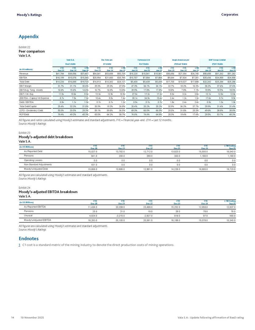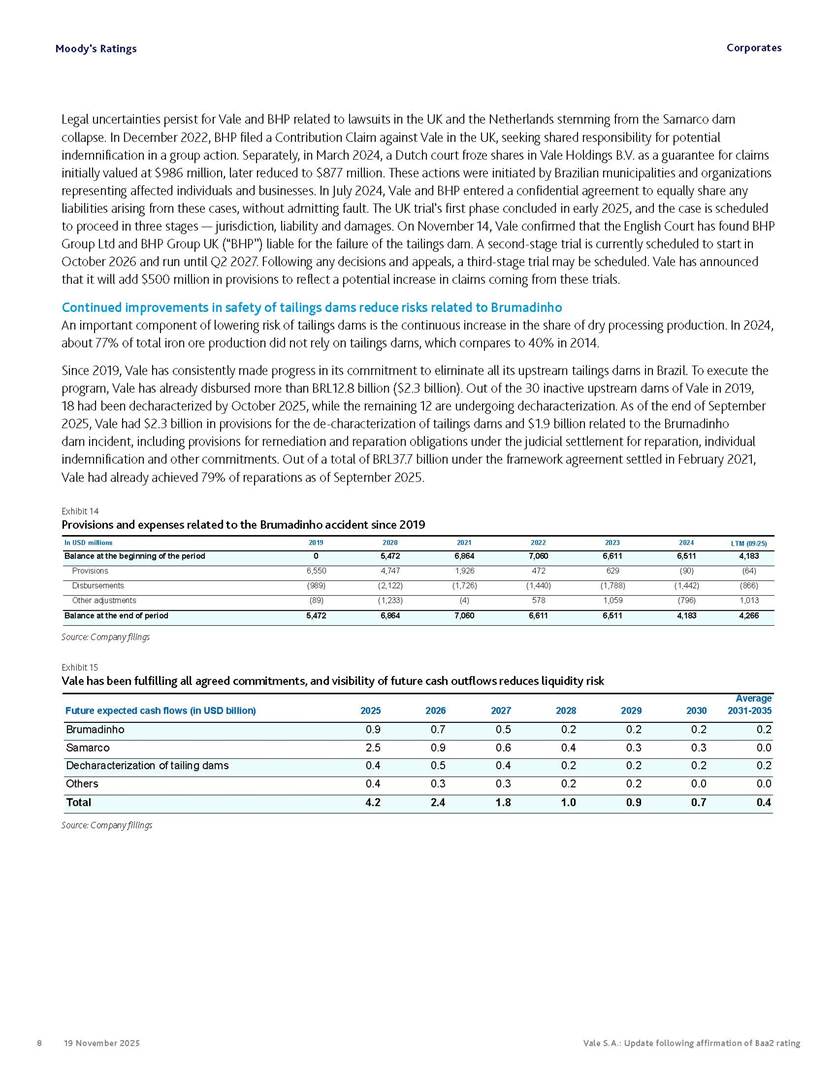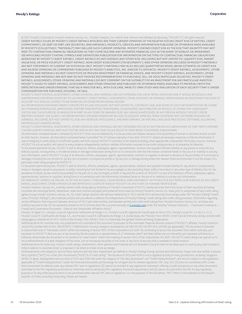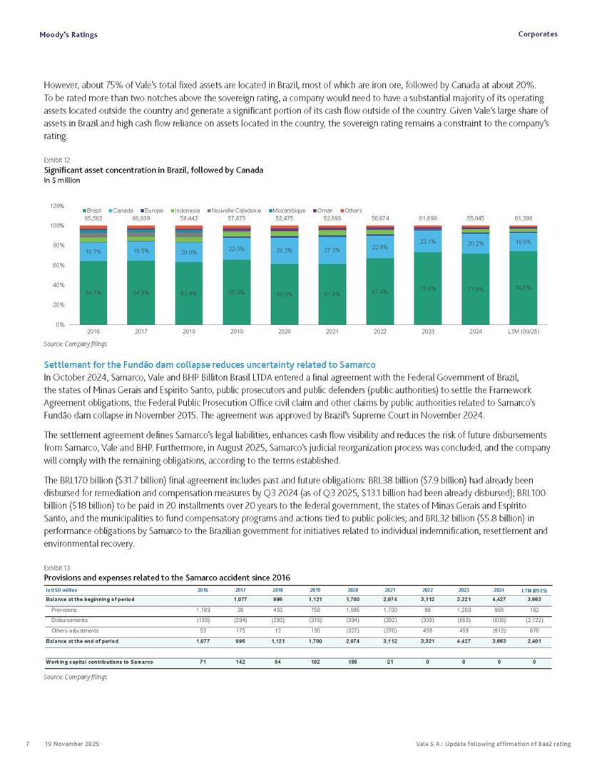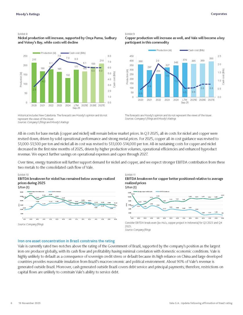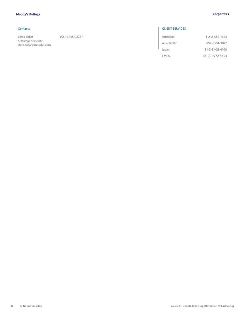 Moody’s affirms Vale’s Baa2 rating Rio de Janeiro, November 19, 2025 – Vale S.A. (“Vale” or the “Company”) informs that, in a report released today, Moody’s Investor Service (“Moody’s”), as part of its periodic review of the Company’s rating, has reaffirmed Vale’s rating at Baa2 with a stable outlook. The report is available in English on Moody’s website and attached to this communication. A free translation into Portuguese will be disclosed to the market shortly. Marcelo Feriozzi Bacci Executive Vice President, Finance and Investor Relations For further information, please contact: Vale.RI@vale.com Thiago Lofiego: thiago.lofiego@vale.com Mariana Rocha: mariana.rocha@vale.com Luciana Oliveti: luciana.oliveti@vale.com Pedro Terra: pedro.terra@vale.com Patricia Tinoco: patricia.tinoco@vale.com This press release may include statements that present Vale’s expectations about future events or results. All statements, when based upon expectations about the future, involve various risks and uncertainties. Vale cannot guarantee that such statements will prove correct. These risks and uncertainties include factors related to the following: (a) the countries where we operate, especially Brazil and Canada; (b) the global economy; (c) the capital markets; (d) the mining and metals prices and their dependence on global industrial production, which is cyclical by nature; and (e) global competition in the markets in which Vale operates. To obtain further information on factors that may lead to results different from those forecast by Vale, please consult the reports Vale files with the U.S. Securities and Exchange Commission (SEC), the Brazilian Comissão de Valores Mobiliários (CVM) and in particular the factors discussed under “Forward-Looking Statements” and “Risk Factors” in Vale’s annual report on Form 20-F. Corporates CREDIT OPINION 19 November 2025 Update RATINGS Vale S.A. Domicile Rio de Janeiro, Brazil Long Term Rating Baa2 Type LT Issuer Rating - Dom Curr Outlook Stable Please see the ratings section at the end of this report for more information. The ratings and outlook shown reflect information as of the publication date. Contacts Barbara Mattos, CFA +55.11.3043.7357 Senior Vice President barbara.mattos@moodys.com Marcos Schmidt +55.11.3043.7310 Associate Managing Director marcos.schmidt@moodys.com CLIENT SERVICES Americas 1-212-553-1653 Asia Pacific 852-3551-3077 Japan 81-3-5408-4100 EMEA 44-20-7772-5454 Vale S.A. Update following affirmation of Baa2 rating Summary On November 17, we affirmed Vale S.A.'s Baa2 ratings and stable outlook, and assigned a Baa3 rating to the $750 million in hybrid notes issued to replenish part of Vale's cash used to fund the tender offer for the “debentures participativas”, which closed on October 31, 2025. Vale's Baa2 ratings continues to reflect the company’s solid credit profile, supported by its market position as one of the largest mining companies globally, with a dominant market share in iron ore and nickel, and increasing position in copper. The rating is further supported by Vale's relatively low cost position and strong balance sheet, with leverage below 1.5x (total debt/EBITDA) since 2020. Moreover, Vale has excellent liquidity, supported by $6.1 billion in cash and $5.0 billion available under its revolving credit facility agreements as of the end of September 2025. The rating is constrained by the sovereign rating of the Government of Brazil (Ba1 stable) as a result of Vale's asset concentration in Brazil (about 75% of total fixed assets), mostly in iron ore. Given the significant reliance on cash flow from iron ore assets located in Brazil, we are unlikely to widen the rating differential to the Government of Brazil's rating. Exhibit 1 Credit metrics remain adequate within the Baa rating level Adjusted leverage (total debt/EBITDA) Exhibit 2 Interest coverage Adjusted interest coverage [(EBITDA - Capex)/ Interest Expense] 1.0x 0.5x 0.6x 0.9x 1.1x 1.3x 0.0x 0.5x 1.0x 1.5x 2.0x 2.5x 3.0x 3.5x 2020 2021 2022 2023 2024 LTM Sep-25 2025E 2026E 2027E Base Case Baa range Projections assume iron ore prices at $100/ton in 2025F, $90/ton in 2026F and $85/ton in 2027F. Source: Moody's Ratings 13.4x 31.1x 16.8x 8.7x 7.5x 7.3x 0.0x 5.0x 10.0x 15.0x 20.0x 25.0x 30.0x 35.0x 2020 2021 2022 2023 2024 LTM Sep-25 2025E 2026E 2027E Base Case Baa range Projections assume iron ore prices at $100/ton in 2025F, $90/ton in 2026F and $85/ton in 2027F. Source: Moody's Ratings Moody's Ratings Corporates Credit strengths » Large scale in the global iron ore and nickel markets, with a growing position in copper » Competitive cost position, and focus on profitability in iron ore and base metals » Focus on high-quality iron ore, which reduces margin volatility » Low leverage and comfortable debt amortization schedule, which help it better manage commodity price volatility » Reduction in environmental, social and governance (ESG) risks, with an improvement in corporate governance, risk management and operational safety Credit challenges » Risk of additional cash outflows related to the tailings dam accidents — in particular related to Samarco Mineração S.A. (B2 positive) - not yet contemplated in the Settlements » Concentration in iron ore, which makes the company's performance dependent on steel industry fundamentals, particularly the steel production levels in China Rating outlook The stable outlook reflects Moody's expectation that Vale will maintain its strong operating and financial performance over the next 12-18 months, keeping its financial discipline in capital allocation, excellent liquidity, a conservative balance sheet and strong debt protection metrics while it continues to invest in growth. We expect that the expansion in nickel and copper will lead to a more balanced cash flow contribution between iron ore and base metals. The stable outlook also incorporates our expectation that there will be no significant 