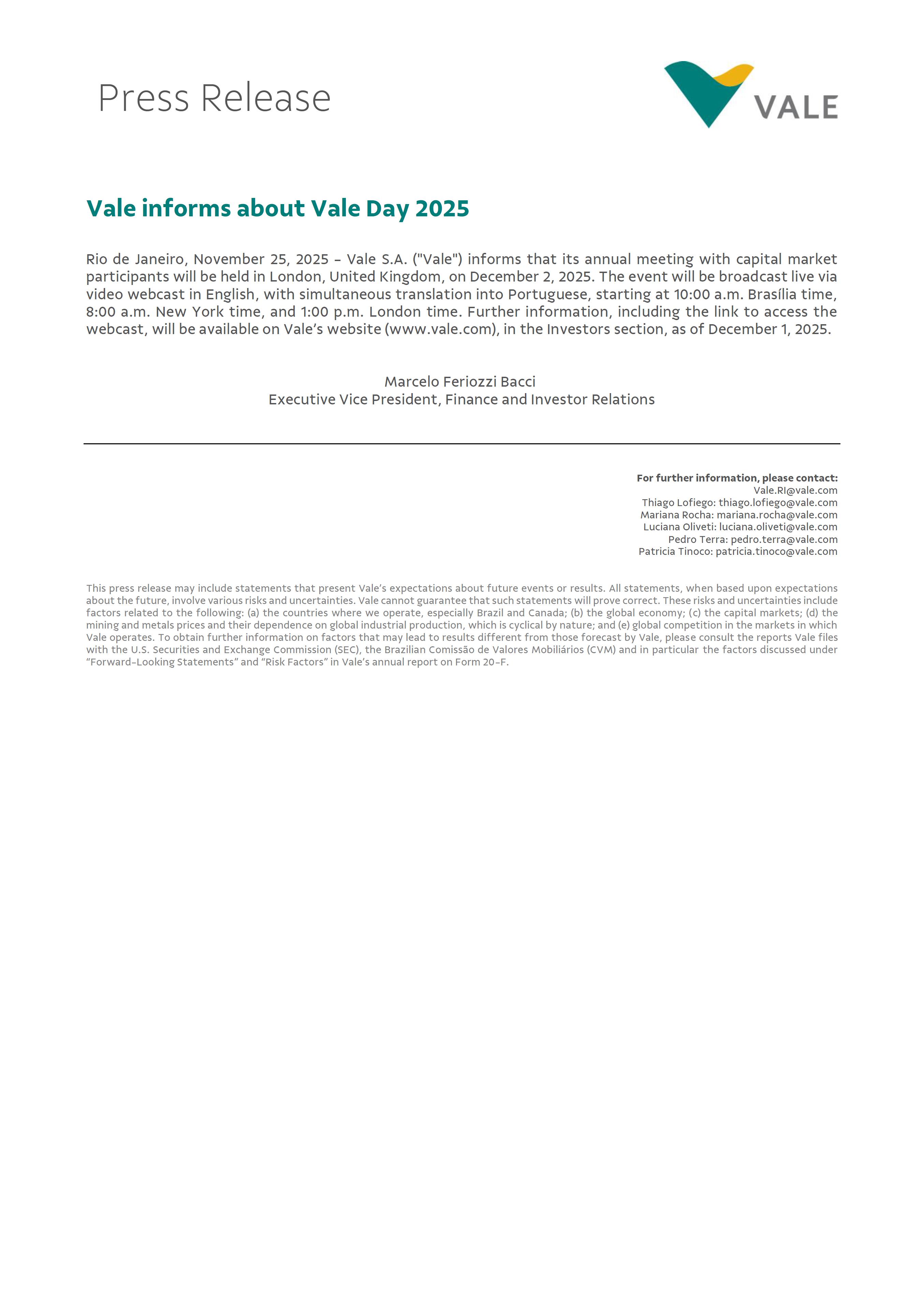Vale informs about Vale Day 2025 Rio de Janeiro, November 25, 2025 - Vale S.A. ("Vale") informs that its annual meeting with capital market participants will be held in London, United Kingdom, on December 2, 2025. The event will be broadcast live via video webcast in English, with simultaneous translation into Portuguese, starting at 10:00 a.m. Brasília time, 8:00 a.m. New York time, and 1:00 p.m. London time. Further information, including the link to access the webcast, will be available on Vale’s website (www.vale.com), in the Investors section, as of December 1, 2025. Marcelo Feriozzi BacciExecutive Vice President, Finance and Investor Relations For further information, please contact: Vale.RI@vale.com Thiago Lofiego: thiago.lofiego@vale.com Mariana Rocha: mariana.rocha@vale.com Luciana Oliveti: luciana.oliveti@vale.com Pedro Terra: pedro.terra@vale.com Patricia Tinoco: patricia.tinoco@vale.com This press release may include statements that present Vale’s expectations about future events or results. All statements, when based upon expectations about the future, involve various risks and uncertainties. Vale cannot guarantee that such statements will prove correct. These risks and uncertainties include factors related to the following: (a) the countries where we operate, especially Brazil and Canada; (b) the global economy; (c) the capital markets; (d) the mining and metals prices and their dependence on global industrial production, which is cyclical by nature; and (e) global competition in the markets in which Vale operates. To obtain further information on factors that may lead to results different from those forecast by Vale, please consult the reports Vale files with the U.S. Securities and Exchange Commission (SEC), the Brazilian Comissão de Valores Mobiliários (CVM) and in particular the factors discussed under “Forward-Looking Statements” and “Risk Factors” in Vale’s annual report on Form 20-F. Press Release