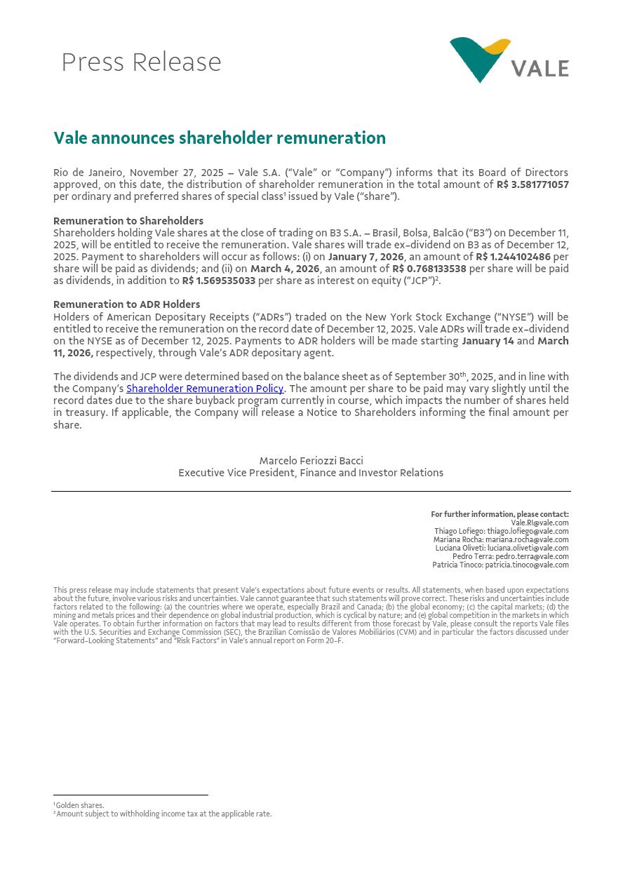 Vale announces shareholder remuneration Rio de Janeiro, November 27, 2025 – Vale S.A. (“Vale” or “Company”) informs that its Board of Directors approved, on this date, the distribution of shareholder remuneration in the total amount of R$ 3.581771057 per ordinary and preferred shares of special class1 issued by Vale (“share”). Remuneration to Shareholders Shareholders holding Vale shares at the close of trading on B3 S.A. – Brasil, Bolsa, Balcão (“B3”) on December 11, 2025, will be entitled to receive the remuneration. Vale shares will trade ex-dividend on B3 as of December 12, 2025. Payment to shareholders will occur as follows: (i) on January 7, 2026, an amount of R$ 1.244102486 per share will be paid as dividends; and (ii) on March 4, 2026, an amount of R$ 0.768133538 per share will be paid as dividends, in addition to R$ 1.569535033 per share as interest on equity (“JCP”)2. Remuneration to ADR Holders Holders of American Depositary Receipts (“ADRs”) traded on the New York Stock Exchange (“NYSE”) will be entitled to receive the remuneration on the record date of December 12, 2025. Vale ADRs will trade ex-dividend on the NYSE as of December 12, 2025. Payments to ADR holders will be made starting January 14 and March 11, 2026, respectively, through Vale’s ADR depositary agent. The dividends and JCP were determined based on the balance sheet as of September 30th, 2025, and in line with the Company’s Shareholder Remuneration Policy. The amount per share to be paid may vary slightly until the record dates due to the share buyback program currently in course, which impacts the number of shares held in treasury. If applicable, the Company will release a Notice to Shareholders informing the final amount per share. Marcelo Feriozzi Bacci Executive Vice President, Finance and Investor Relations For further information, please contact: Vale.RI@vale.com Thiago Lofiego: thiago.lofiego@vale.com Mariana Rocha: mariana.rocha@vale.com Luciana Oliveti: luciana.oliveti@vale.com Pedro Terra: pedro.terra@vale.com Patricia Tinoco: patricia.tinoco@vale.com This press release may include statements that present Vale’s expectations about future events or results. All statements, when based upon expectations about the future, involve various risks and uncertainties. Vale cannot guarantee that such statements will prove correct. These risks and uncertainties include factors related to the following: (a) the countries where we operate, especially Brazil and Canada; (b) the global economy; (c) the capital markets; (d) the mining and metals prices and their dependence on global industrial production, which is cyclical by nature; and (e) global competition in the markets in which Vale operates. To obtain further information on factors that may lead to results different from those forecast by Vale, please consult the reports Vale files with the U.S. Securities and Exchange Commission (SEC), the Brazilian Comissão de Valores Mobiliários (CVM) and in particular the factors discussed under “Forward-Looking Statements” and “Risk Factors” in Vale’s annual report on Form 20-F. 1 Golden shares. 2 Amount subject to withholding income tax at the applicable rate. Press Release