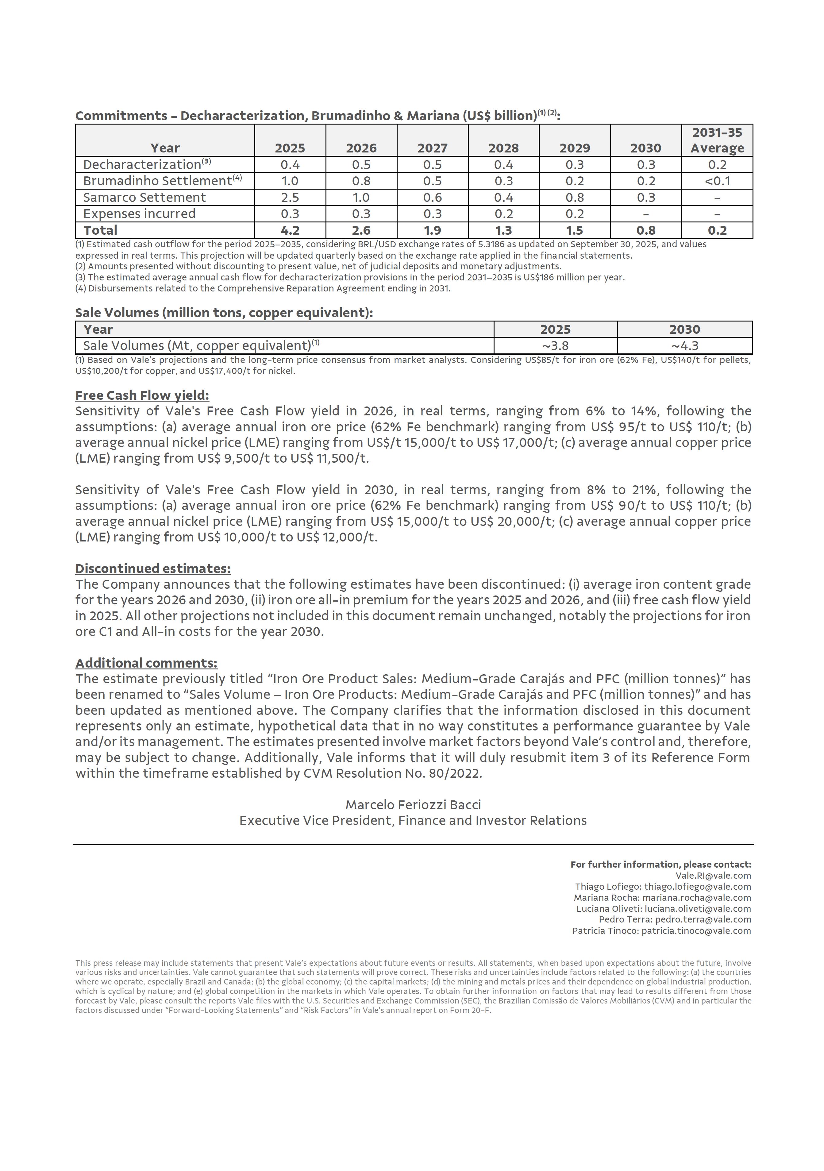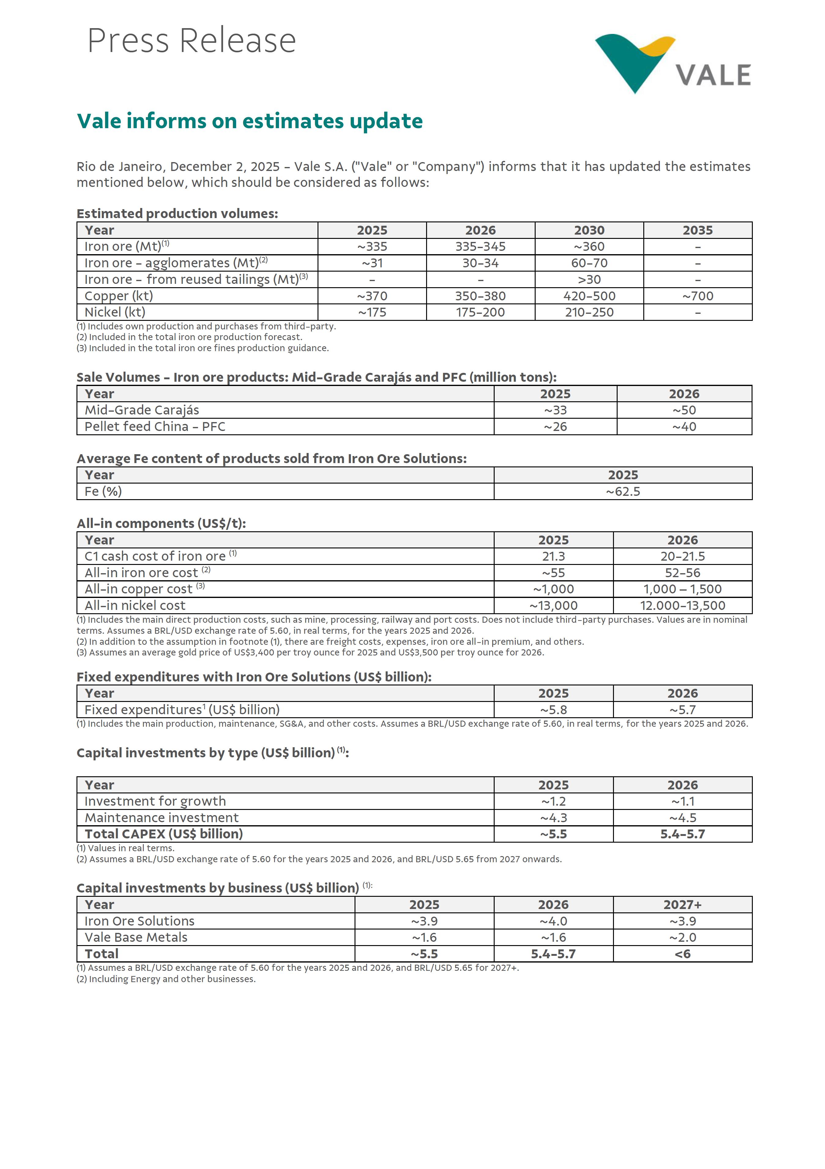 Vale informs on estimates update Rio de Janeiro, December 2, 2025 - Vale S.A. ("Vale" or "Company") informs that it has updated the estimates mentioned below, which should be considered as follows: Estimated production volumes: Year 2025 2026 2030 2035 Iron ore (Mt)(1) ~335 335-345 ~360 - Iron ore - agglomerates (Mt)(2) ~31 30-34 60-70 - Iron ore - from reused tailings (Mt)(3) - - >30 - Copper (kt) ~370 350-380 420-500 ~700 Nickel (kt) ~175 175-200 210-250 - (1) Includes own production and purchases from third-party. (2) Included in the total iron ore production forecast. (3) Included in the total iron ore fines production guidance. Sale Volumes - Iron ore products: Mid-Grade Carajás and PFC (million tons): Year 2025 2026 Mid-Grade Carajás ~33 ~50 Pellet feed China - PFC ~26 ~40 Average Fe content of products sold from Iron Ore Solutions: Year 2025 Fe (%) ~62.5 All-in components (US$/t): Year 2025 2026 C1 cash cost of iron ore (1) 21.3 20-21.5 All-in iron ore cost (2) ~55 52-56 All-in copper cost (3) ~1,000 1,000 – 1,500 All-in nickel cost ~13,000 12.000-13,500 (1) Includes the main direct production costs, such as mine, processing, railway and port costs. Does not include third-party purchases. Values are in nominal terms. Assumes a BRL/USD exchange rate of 5.60, in real terms, for the years 2025 and 2026. (2) In addition to the assumption in footnote (1), there are freight costs, expenses, iron ore all-in premium, and others. (3) Assumes an average gold price of US$3,400 per troy ounce for 2025 and US$3,500 per troy ounce for 2026. Fixed expenditures with Iron Ore Solutions (US$ billion): Year 2025 2026 Fixed expenditures1 (US$ billion) ~5.8 ~5.7 (1) Includes the main production, maintenance, SG&A, and other costs. Assumes a BRL/USD exchange rate of 5.60, in real terms, for the years 2025 and 2026. Capital investments by type (US$ billion) (1): Year 2025 2026 Investment for growth ~1.2 ~1.1 Maintenance investment ~4.3 ~4.5 Total CAPEX (US$ billion) ~5.5 5.4-5.7 (1) Values in real terms. (2) Assumes a BRL/USD exchange rate of 5.60 for the years 2025 and 2026, and BRL/USD 5.65 from 2027 onwards. Capital investments by business (US$ billion) (1): Year 2025 2026 2027+ Iron Ore Solutions ~3.9 ~4.0 ~3.9 Vale Base Metals ~1.6 ~1.6 ~2.0 Total ~5.5 5.4-5.7 <6 (1) Assumes a BRL/USD exchange rate of 5.60 for the years 2025 and 2026, and BRL/USD 5.65 for 2027+. (2) Including Energy and other businesses. Press Release Commitments - Decharacterization, Brumadinho & Mariana (US$ billion)(1) (2): Year 2025 2026 2027 2028 2029 2030 2031-35 Average Decharacterization(³) 0.4 0.5 0.5 0.4 0.3 0.3 0.2 Brumadinho Settlement(4) 1.0 0.8 0.5 0.3 0.2 0.2 <0.1 Samarco Settement 2.5 1.0 0.6 0.4 0.8 0.3 - Expenses incurred 0.3 0.3 0.3 0.2 0.2 - - Total 4.2 2.6 1.9 1.3 1.5 0.8 0.2 (1) Estimated cash outflow for the period 2025–2035, considering BRL/USD exchange rates of 5.3186 as updated on September 30, 2025, and values expressed in real terms. This projection will be updated quarterly based on the exchange rate applied in the financial statements. (2) Amounts presented without discounting to present value, net of judicial deposits and monetary adjustments. (3) The estimated average annual cash flow for decharacterization provisions in the period 2031–2035 is US$186 million per year. (4) Disbursements related to the Comprehensive Reparation Agreement ending in 2031. Sale Volumes (million tons, copper equivalent): Year 2025 2030 Sale Volumes (Mt, copper equivalent)(1) ~3.8 ~4.3 (1) Based on Vale’s projections and the long-term price consensus from market analysts. Considering US$85/t for iron ore (62% Fe), US$140/t for pellets, US$10,200/t for copper, and US$17,400/t for nickel. Free Cash Flow yield: Sensitivity of Vale's Free Cash Flow yield in 2026, in real terms, ranging from 6% to 14%, following the assumptions: (a) average annual iron ore price (62% Fe benchmark) ranging from US$ 95/t to US$ 110/t; (b) average annual nickel price (LME) ranging from US$/t 15,000/t to US$ 17,000/t; (c) average annual copper price (LME) ranging from US$ 9,500/t to US$ 11,500/t. Sensitivity of Vale's Free Cash Flow yield in 2030, in real terms, ranging from 8% to 21%, following the assumptions: (a) average annual iron ore price (62% Fe benchmark) ranging from US$ 90/t to US$ 110/t; (b) average annual nickel price (LME) ranging from US$ 15,000/t to US$ 20,000/t; (c) average annual copper price (LME) ranging from US$ 10,000/t to US$ 12,000/t. Discontinued estimates: The Company announces that the following estimates have been discontinued: (i) average iron content grade for the years 2026 and 2030, (ii) iron ore all-in premium for the years 2025 and 2026, and (iii) free cash flow yield in 2025. All other projections not included in this document remain unchanged, notably the projections for iron ore C1 and All-in costs for the year 2030. Additional comments: The estimate previously titled “Iron Ore Product Sales: Medium-Grade Carajás and PFC (million tonnes)” has been renamed to “Sales Volume – Iron Ore Products: Medium-Grade Carajás and PFC (million tonnes)” and has been updated as mentioned above. The Company clarifies that the information disclosed in this document represents only an estimate, hypothetical data that in no way constitutes a performance guarantee by Vale and/or its management. The estimates presented involve market factors beyond Vale’s control and, therefore, may be subject to change. Additionally, Vale informs that it will duly resubmit item 3 of its Reference Form within the timeframe established by CVM Resolution No. 80/2022. Marcelo Feriozzi Bacci Executive Vice President, Finance and Investor Relations For further information, please contact: Vale.RI@vale.com Thiago Lofiego: thiago.lofiego@vale.com Mariana Rocha: mariana.rocha@vale.com Luciana Oliveti: luciana.oliveti@vale.com Pedro Terra: pedro.terra@vale.com Patricia Tinoco: patricia.tinoco@vale.com This press release may include sta