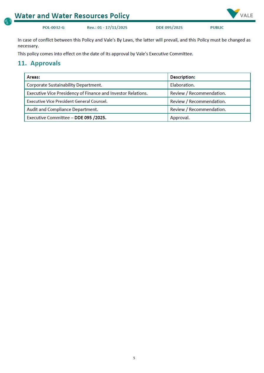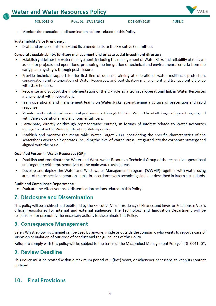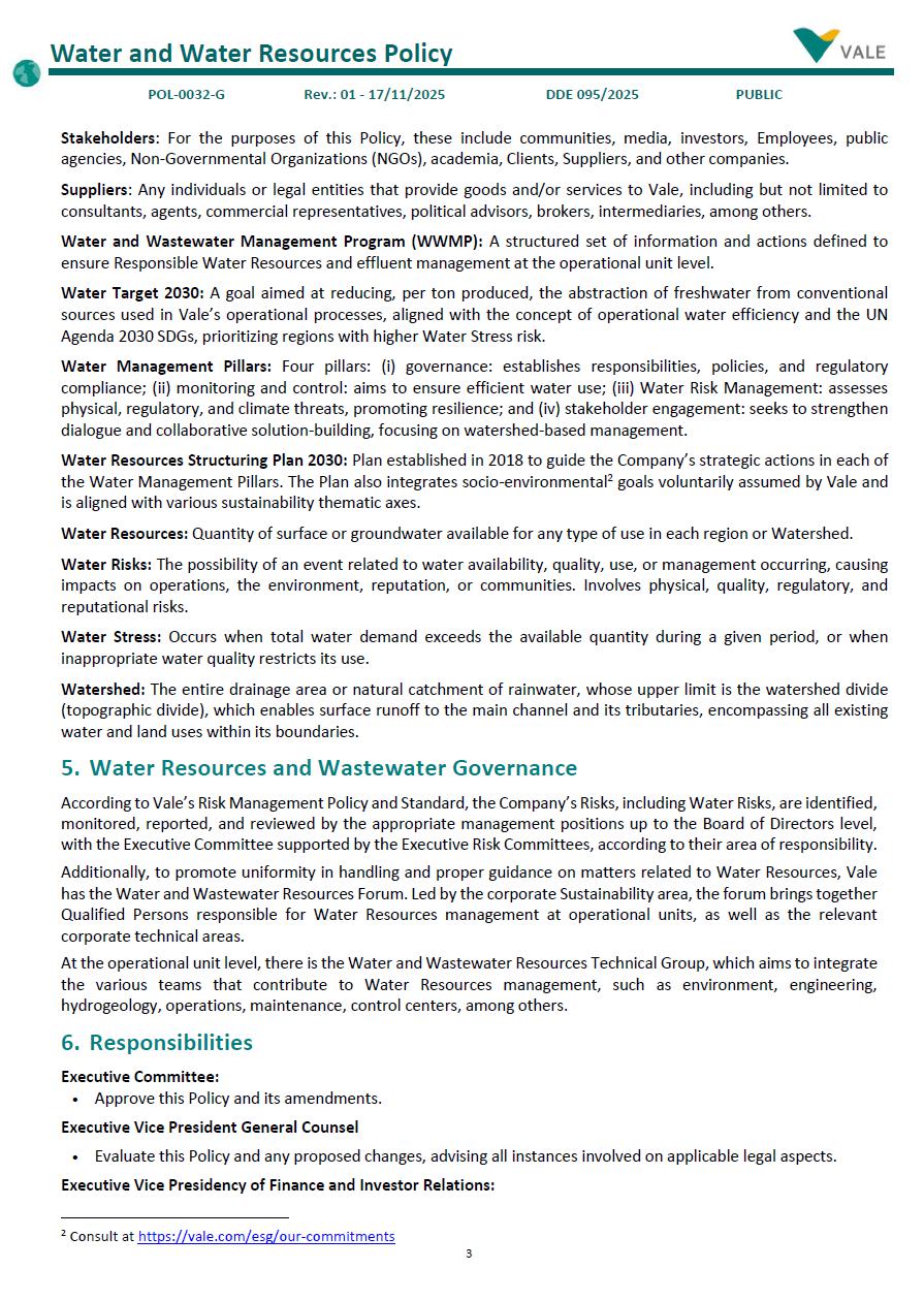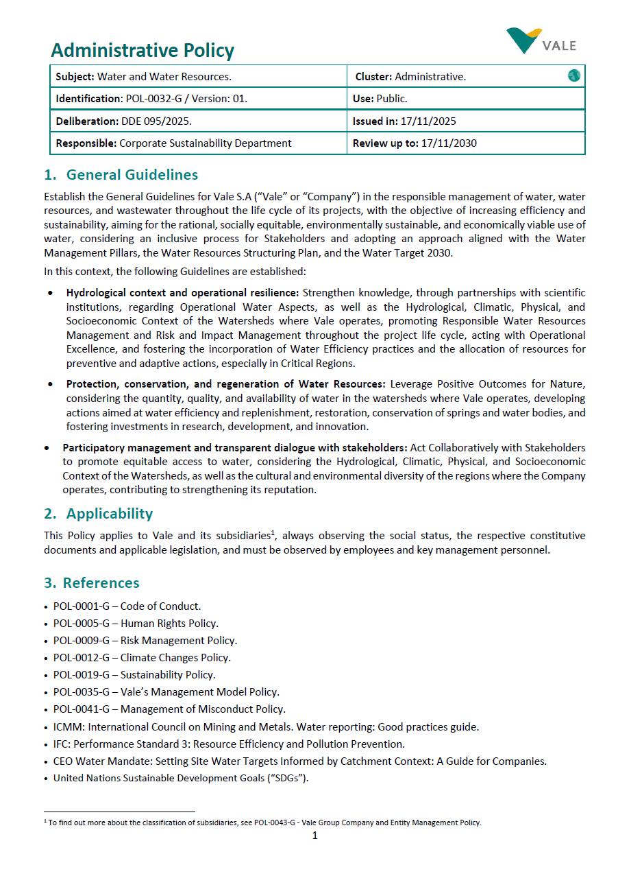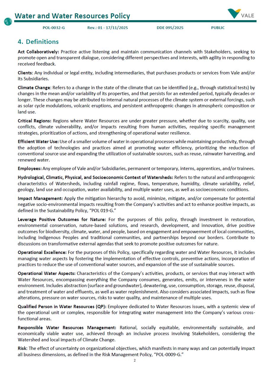 Subject: Water and Water Resources. Cluster: Administrative. Identification: POL-0032-G / Version: 01. Use: Public. Deliberation: DDE 095/2025. Issued in: 17/11/2025 Responsible: Corporate Sustainability Department Review up to: 17/11/2030 1 Administrative Policy 1. General Guidelines Establish the General Guidelines for Vale S.A (“Vale” or “Company”) in the responsible management of water, water resources, and wastewater throughout the life cycle of its projects, with the objective of increasing efficiency and sustainability, aiming for the rational, socially equitable, environmentally sustainable, and economically viable use of water, considering an inclusive process for Stakeholders and adopting an approach aligned with the Water Management Pillars, the Water Resources Structuring Plan, and the Water Target 2030. In this context, the following Guidelines are established: • Hydrological context and operational resilience: Strengthen knowledge, through partnerships with scientific institutions, regarding Operational Water Aspects, as well as the Hydrological, Climatic, Physical, and Socioeconomic Context of the Watersheds where Vale operates, promoting Responsible Water Resources Management and Risk and Impact Management throughout the project life cycle, acting with Operational Excellence, and fostering the incorporation of Water Efficiency practices and the allocation of resources for preventive and adaptive actions, especially in Critical Regions. • Protection, conservation, and regeneration of Water Resources: Leverage Positive Outcomes for Nature, considering the quantity, quality, and availability of water in the watersheds where Vale operates, developing actions aimed at water efficiency and replenishment, restoration, conservation of springs and water bodies, and fostering investments in research, development, and innovation. • Participatory management and transparent dialogue with stakeholders: Act Collaboratively with Stakeholders to promote equitable access to water, considering the Hydrological, Climatic, Physical, and Socioeconomic Context of the Watersheds, as well as the cultural and environmental diversity of the regions where the Company operates, contributing to strengthening its reputation. 2. Applicability This Policy applies to Vale and its subsidiaries1, always observing the social status, the respective constitutive documents and applicable legislation, and must be observed by employees and key management personnel. 3. References • POL-0001-G – Code of Conduct. • POL-0005-G – Human Rights Policy. • POL-0009-G – Risk Management Policy. • POL-0012-G – Climate Changes Policy. • POL-0019-G – Sustainability Policy. • POL-0035-G – Vale’s Management Model Policy. • POL-0041-G – Management of Misconduct Policy. • ICMM: International Council on Mining and Metals. Water reporting: Good practices guide. • IFC: Performance Standard 3: Resource Efficiency and Pollution Prevention. • CEO Water Mandate: Setting Site Water Targets Informed by Catchment Context: A Guide for Companies. • United Nations Sustainable Development Goals (“SDGs”). 1 To find out more about the classification of subsidiaries, see POL-0043-G - Vale Group Company and Entity Management Policy. 2 Water and Water Resources Policy POL-0032-G Rev.: 01 - 17/11/2025 DDE 095/2025 PUBLIC 4. Definitions Act Collaboratively: Practice active listening and maintain communication channels with Stakeholders, seeking to promote open and transparent dialogue, considering different perspectives and interests, with agility in responding to received feedback. Clients: Any individual or legal entity, including intermediaries, that purchases products or services from Vale and/or its Subsidiaries. Climate Change: Refers to a change in the state of the climate that can be identified (e.g., through statistical tests) by changes in the mean and/or variability of its properties, and that persists for an extended period, typically decades or longer. These changes may be attributed to internal natural processes of the climate system or external forcings, such as solar cycle modulations, volcanic eruptions, and persistent anthropogenic changes in atmospheric composition or land use. Critical Regions: Regions where Water Resources are under greater pressure, whether due to scarcity, quality, use conflicts, climate vulnerability, and/or impacts resulting from human activities, requiring specific management strategies, prioritization of actions, and strengthening of operational water resilience. Efficient Water Use: Use of a smaller volume of water in operational processes while maintaining productivity, through the adoption of technologies and practices aimed at promoting water efficiency, prioritizing the reduction of conventional source use and expanding the utilization of sustainable sources, such as reuse, rainwater harvesting, and renewed water. Employees: Any employee of Vale and/or Subsidiaries, permanent or temporary, interns, apprentices, and/or trainees. Hydrological, Climatic, Physical, and Socioeconomic Context of Watersheds: Refers to the natural and anthropogenic characteristics of Watersheds, including rainfall regime, flows, temperature, humidity, climate variability, relief, geology, land use and occupation, water availability, and multiple water uses, as well as socioeconomic conditions. Impact Management: Apply the mitigation hierarchy to avoid, minimize, mitigate, and/or compensate for potential negative socio-environmental impacts resulting from the Company’s activities and act to enhance positive impacts, as defined in the Sustainability Policy, “POL 019-G.” Leverage Positive Outcomes for Nature: For the purposes of this policy, through investment in restoration, environmental conservation, nature-based solutions, and research, development, and innovation, drive positive outcomes for biodiversity, climate, water, and people, based on engagement and empowerm