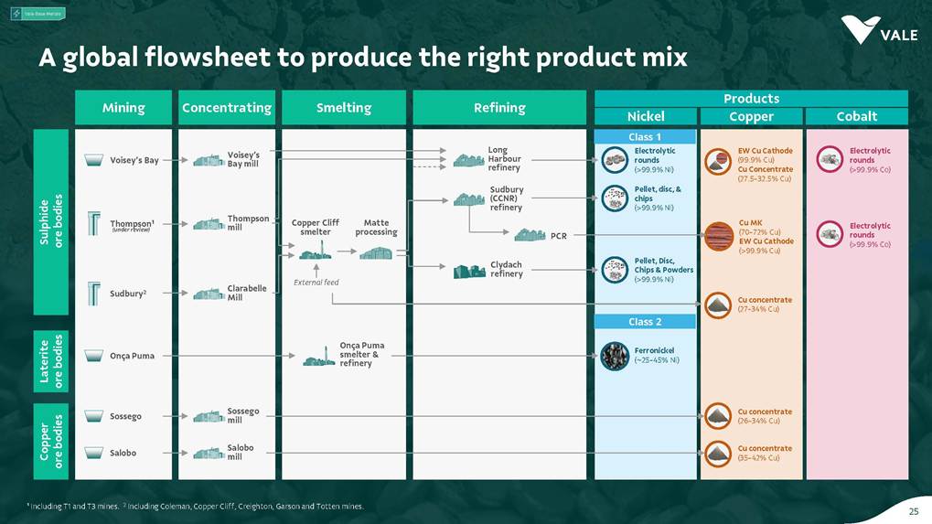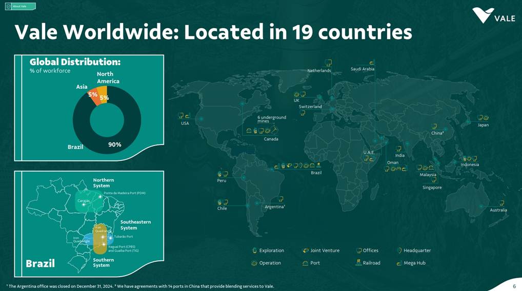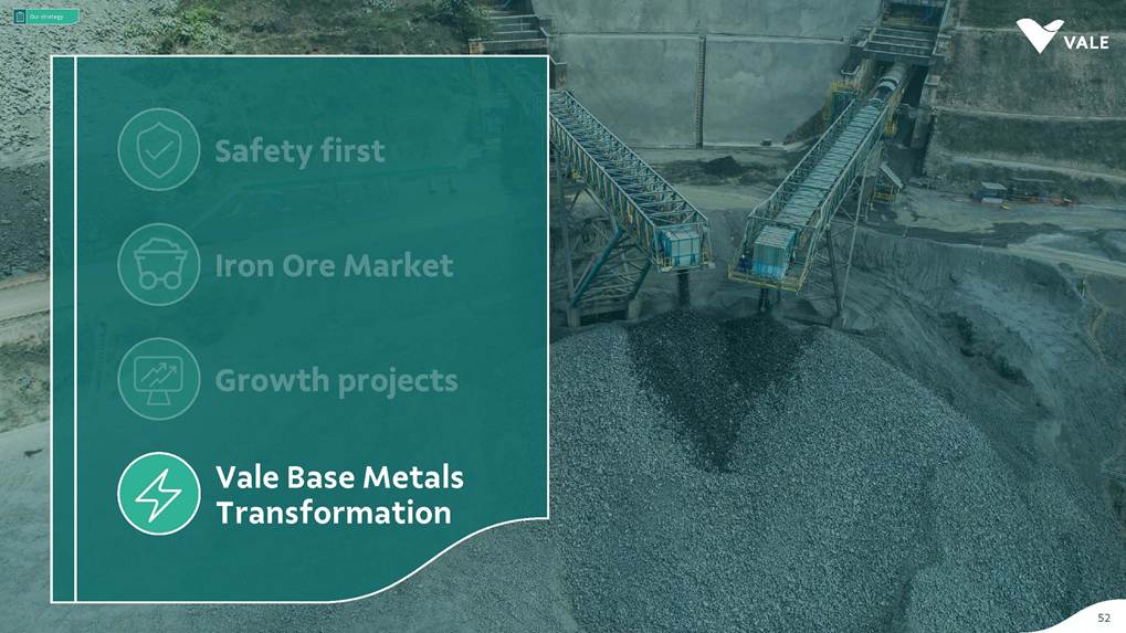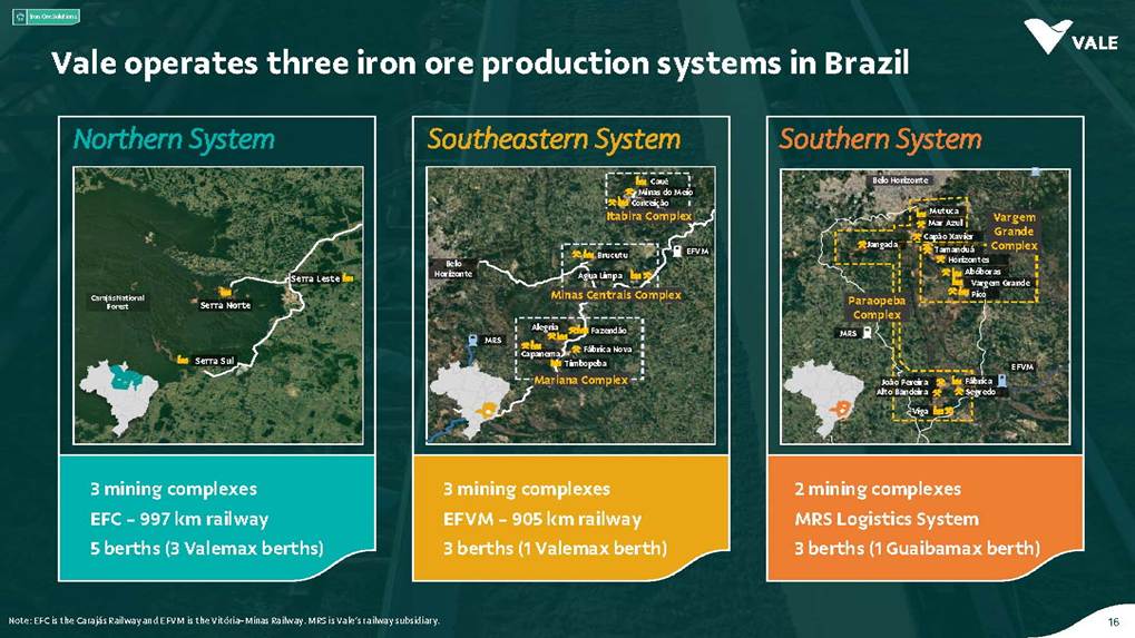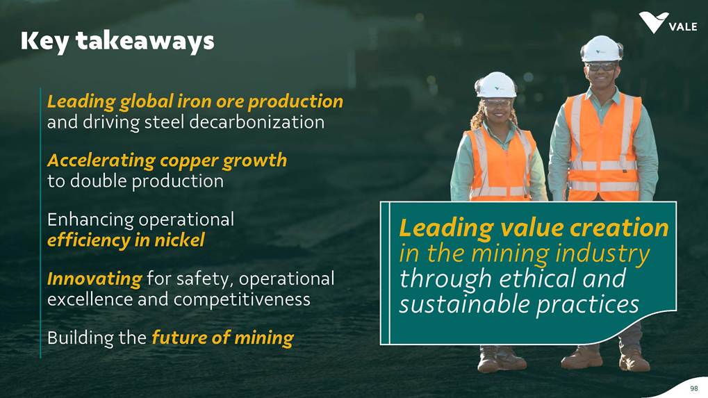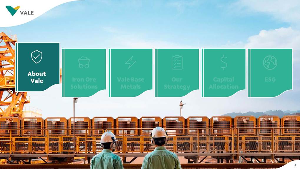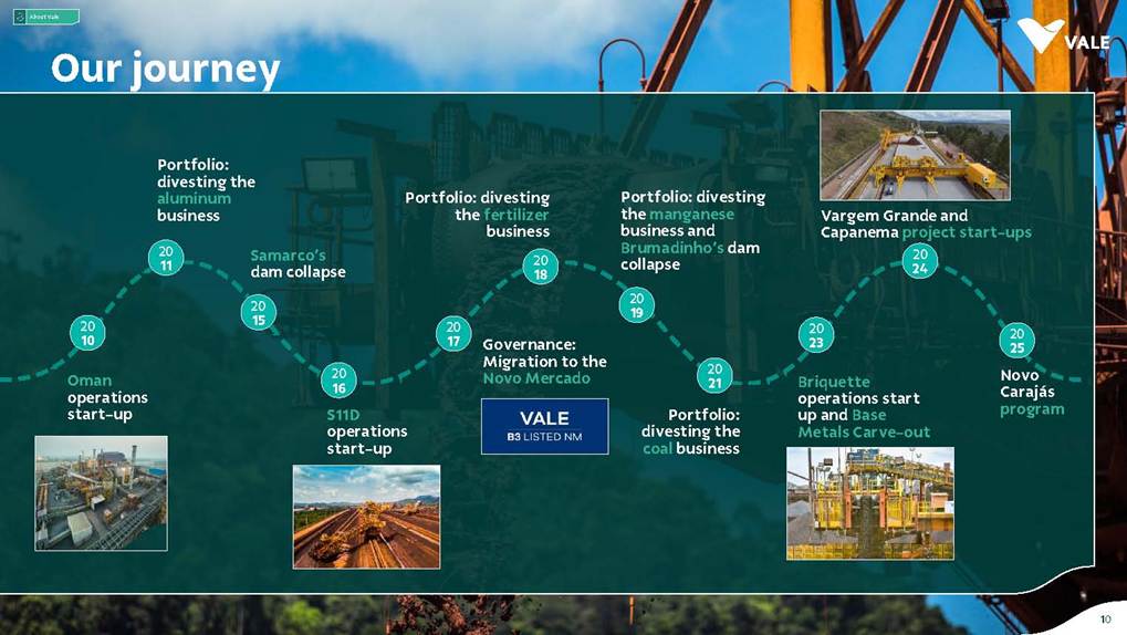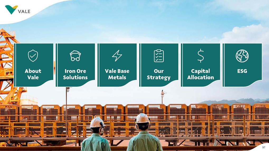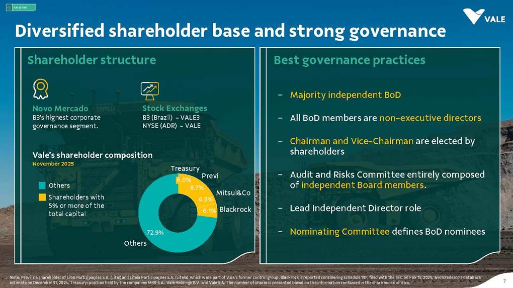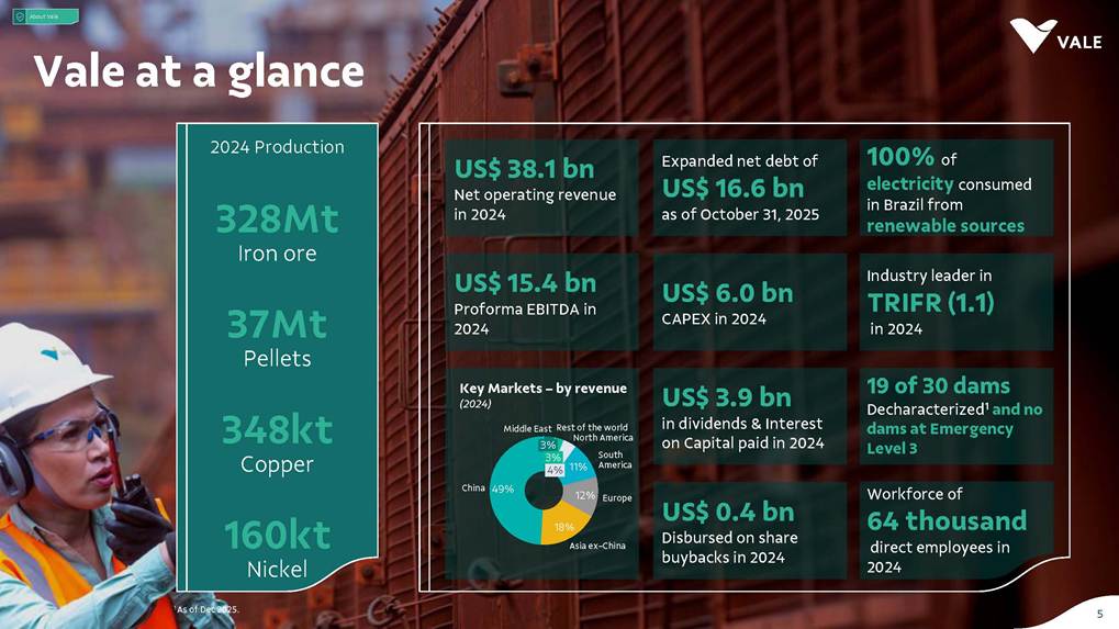 1 Institutional Presentation Investor Relations December 2025 2 AboutVale ESG Iron OreSolutions Vale Base Metals OurStrategy Capital Allocation AboutVale 3 #2 in iron ore production ~20% of seaborne market #6in nickel production Largestiron ore pellet producer #11 in copper reserves ~20 Bt We are one of the leadingIron ore, Nickel and Copper producers globally Note: As of 2024. About Vale 4 Vale at a glance About Vale 328MtIron ore 37MtPellets 348ktCopper 160ktNickel 2024 Production US$ 38.1 bn Net operating revenue in 2024 Expanded net debt of US$ 16.6 bn as of October 31, 2025 100% of electricity consumed in Brazil from renewable sources US$ 15.4 bn Proforma EBITDA in 2024 US$ 6.0 bn CAPEX in 2024 Industry leader in TRIFR (1.1) in 2024 US$ 3.9 bn in dividends & Interest on Capital paid in 2024 19 of 30 dams Decharacterized1 and no dams at Emergency Level 3 US$ 0.4 bn Disbursed on share buybacks in 2024 Key Markets – by revenue (2024) 11% 12% 18% 49% 3% Middle East 3% Rest of the world 4% North America SouthAmerica Europe Asia ex-China China Workforce of 64 thousand direct employees in 2024 5 1 As of Dec 2025. Australia Oman U.A.E. Malaysia India Singapore Japan USA Chile Brazil Argentina¹ Peru Diversified shareholder base and strong governance Note: Previ is a shareholder of Litel Participações S.A. (Litel) and Litela Participações S.A. (Litela), which w r p rt of V ’s form r contro group. B ckrock is r port consi ring Sch u 1 F, fi with th SEC on F b 15, 5, n Br sco’s t b s estimate on December 31, 2024. Treasury: position held by the companies MBR S.A., Vale Holdings B.V. and Vale S.A. The number of shares is presented based on the information contained in the share books of Vale. 6.0% Treasury 8.7% Previ 6.3% Mitsui&Co 6.1% Blackrock 72.9% Others Shareholder structure Novo Mercado B3's highest corporate governance segment. Vale's shareholder composition November 2025 Stock Exchanges B3 (Brazil) - VALE3 NYSE (ADR) - VALE Shareholders with 5% or more of the total capital Others − Majority independent BoD − All BoD members are non-executive directors − Chairman and Vice-Chairman are elected by shareholders − Audit and Risks Committee entirely composed of independent Board members. − Lead Independent Director role − Nominating Committee defines BoD nominees Best governance practices 7 About Vale Corporate Governance About Vale Executive Board Board of Directors1 CEO Gustavo Pimenta Finance & IR EVP Marcelo Bacci IO OperationsEVP Carlos Medeiros Commercial and New Business EVP Rogério Nogueira Technical EVP Rafael Bittar People EVP Samanta Pillar Legal AffairsEVP Sami Arap SustainabilityEVP Grazielle Parenti Click here to cc ss th fu inform tion bout V ’s Bo r of Dir ctors n Ex cuti Bo r . 1 The data takes into account the composition of the Board of Directors on May 7th, 2025. 2.7 years Average Tenure 13 Members 8 (62%) Independent Members 3 Women 4 Racially/ethnically diverse 4 Non Brazilians 8 Our journey Vale doRio Doce was founded Tubarão port inauguration CVRD rebranding to About Vale 9 1942 1956 1967 1969 1985 1997 2006 2009 Carajás discovery First pellet production 1st ore producedat Carajás and inauguration of the Carajás Railway (EFC) CVRD’s privatization INCOacquisition Our journey S11D operations start-up Samarco’s dam collapse 2010 2011 2015 2016 2017 2018 2019 2021 2023 2024 2025 Oman operations start-up Portfolio: divesting the aluminum business Governance: Migration to the Novo Mercado Portfolio: divesting the fertilizer business Portfolio: divesting the manganese business and Brumadinho’s dam collapse Portfolio: divesting the coal business Briquette operations start up and Base Metals Carve-out Vargem Grande and Capanema project start-ups Novo Carajás program About Vale 10 A focused companywith two unique and irreplicable businesses Vale Today About Vale 11 Iron Ore Solutions Vale Base Metals Iron OreSolutions 12 From the Mines to the Customers 13 Iron Ore Solutions Mineral Explorationand Projects Geology and Mine Planning Mine Operation Mineral Processing Pelletizing Railroad Logistics Port Logistics Shipping Logistics Blending and Distribution Centers Sales and Marketing Planning Products and Quality Iron Ore for the Steel Industry Vale’s mai ir re pr ucts Iron Ore Solutions Iron ore fines Carajás fines Brazilian Blend Fines Pellet Feed China (PFC) − 65% Fe − Low contaminants (silica, alumina and others) − Mined from the Northern System − 63% Fe − Low-alumina − Produced from blending Carajás and high-silica fines − ~63% Fe − Low-alumina − Pellet feed concentrated in Chinese facilities Mid-Grade Carajás − ~63% Fe − Low-alumina and Low-phosphorus − Mined from the Northern System Direct Reduction pellets Blast Furnace pellets BriquettesDeveloped by Vale − Agglomerates for direct charge in Direct Reduction Furnaces − Agglomerates for direct charge in Blast Furnaces − Same application as pellets in BF and DR furnaces − Lower CO2 emissions compared to pellet production − Commercial production ramping-up Agglomerates 14 Brazilian States: MA = Maranhão PA = Pará MG = Minas Gerais ES = Espírito Santo RJ = Rio de Janeiro Iron Ore Solutions 15 Vale operates three iron ore production systems in Brazil, which include mines, processing plants, railways and port facilities Southern System PA MG EFC EFVM MRS Ponta da Madeira Port (PDM) - São Luís - MA Tubarão Port - Vitoria - ES Itaguaí Port (CPBS) - RJ Guaíba Port (TIG) - RJ MA RJ ES Northern System Southeastern System Vale operates three iron ore production systems in Brazil Note: EFC is the Carajás Railway and EFVM is the Vitória-Min s R i w . MRS is V ’s r i w subsi i r . Northern System Southeastern System Southern System − 3 mining complexes − EFC - 997 km railway − 5 berths (3 Valemax berths) Serra Norte Serra Sul Serra Leste Carajás National Forest Cauê Belo Horizonte Conceição Alegria Timbopeba Brucutu Água Limpa Fazendão Itabi