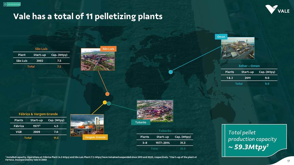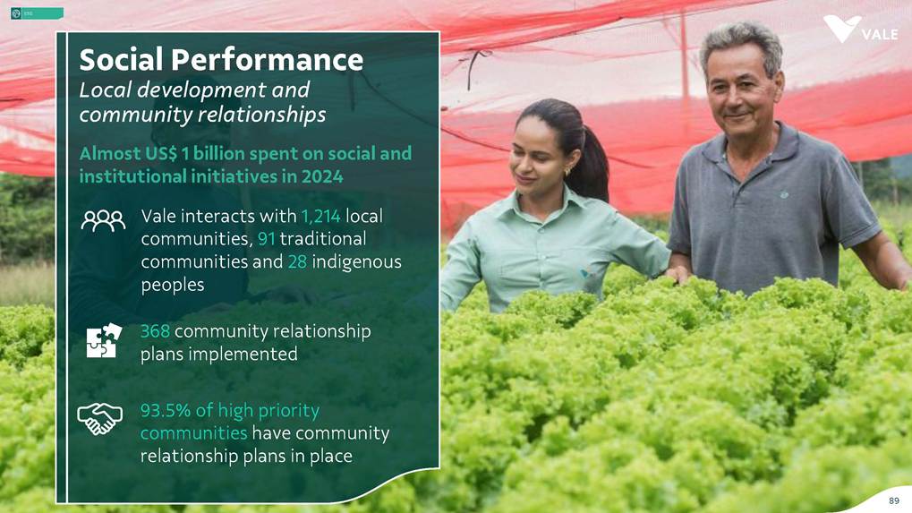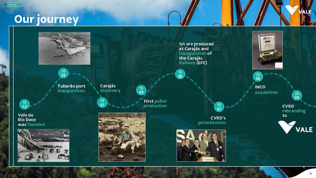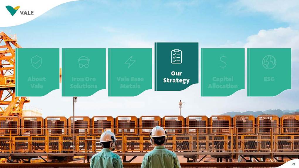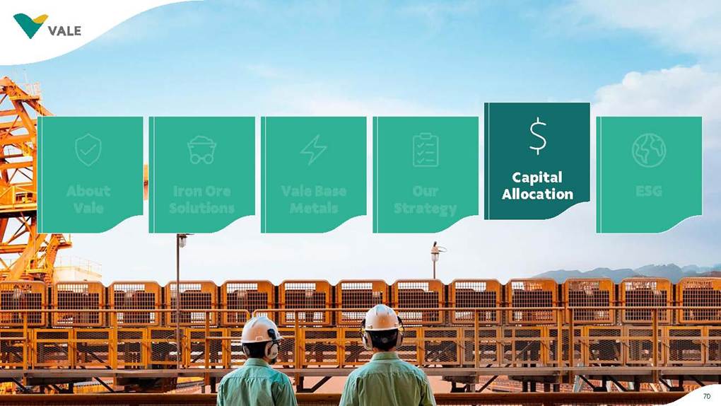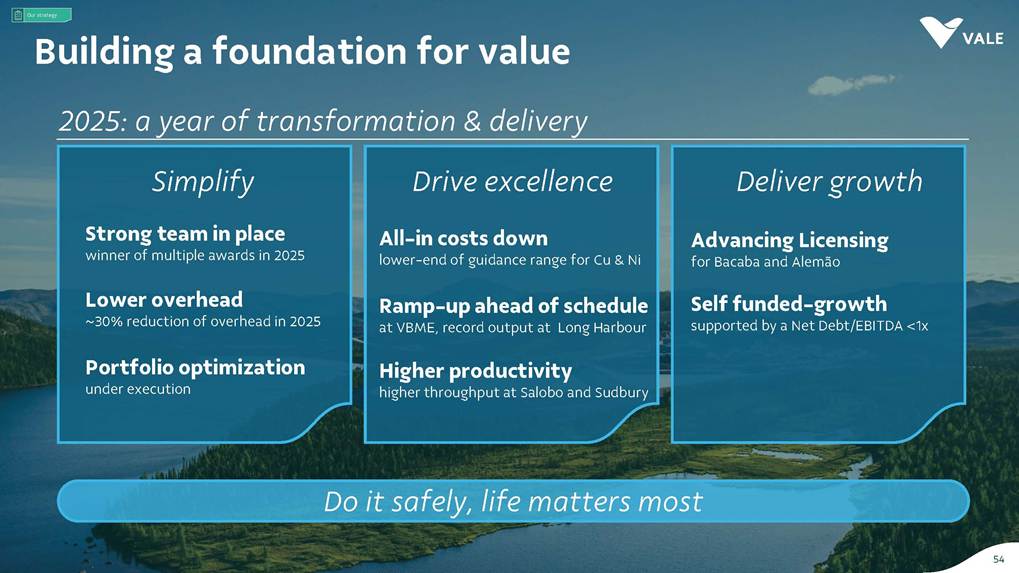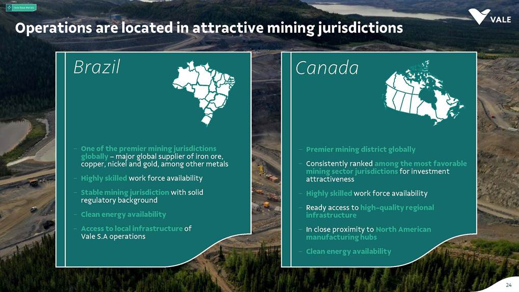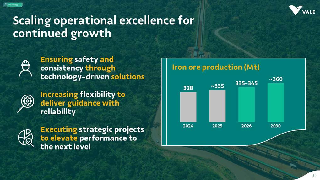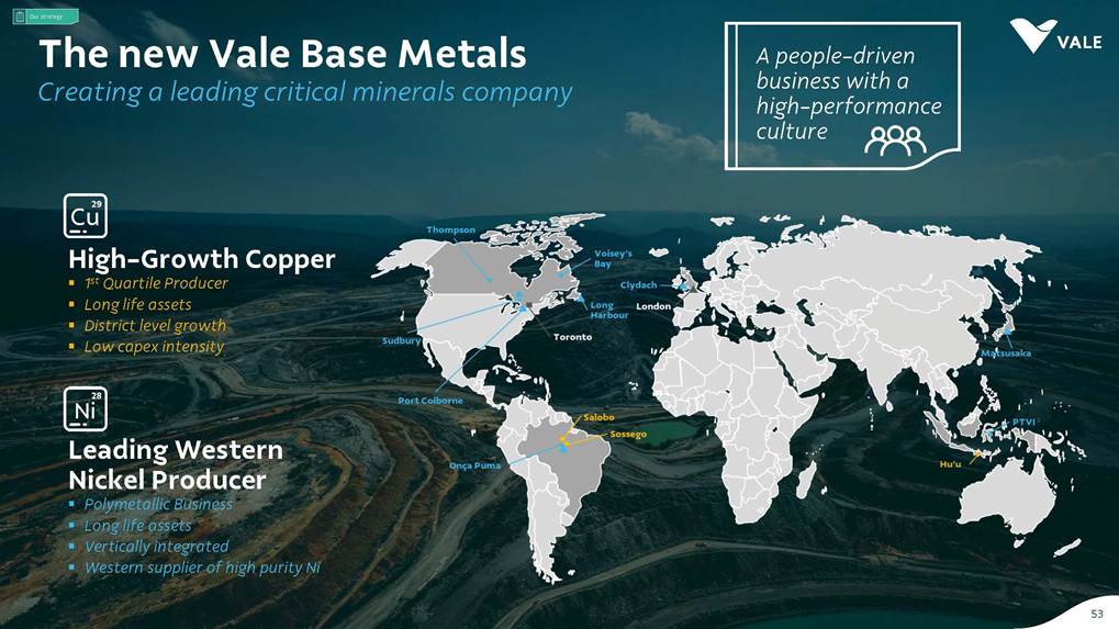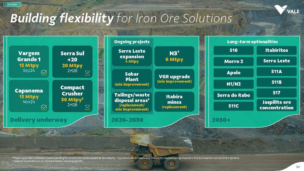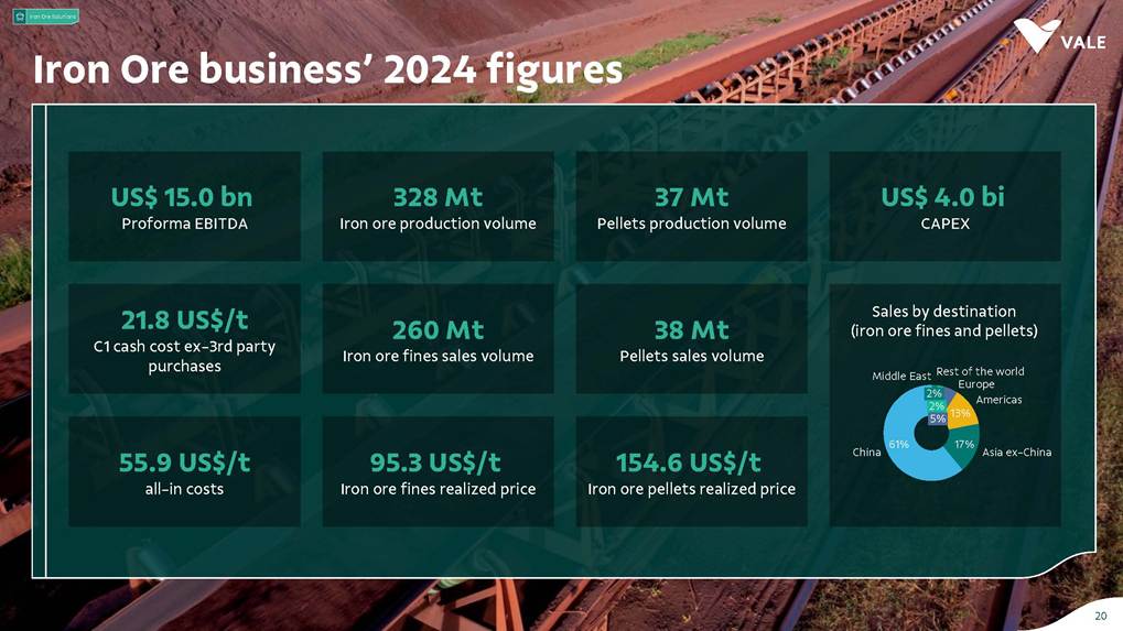1 Institutional Presentation Investor Relations December 2025 2 AboutVale ESG Iron OreSolutions Vale Base Metals OurStrategy Capital Allocation AboutVale 3 #2 in iron ore production ~20% of seaborne market #6in nickel production Largestiron ore pellet producer #11 in copper reserves ~20 Bt We are one of the leadingIron ore, Nickel and Copper producers globally Note: As of 2024. About Vale 4 Vale at a glance About Vale 328MtIron ore 37MtPellets 348ktCopper 160ktNickel 2024 Production US$ 38.1 bn Net operating revenue in 2024 Expanded net debt of US$ 16.6 bn as of October 31, 2025 100% of electricity consumed in Brazil from renewable sources US$ 15.4 bn Proforma EBITDA in 2024 US$ 6.0 bn CAPEX in 2024 Industry leader in TRIFR (1.1) in 2024 US$ 3.9 bn in dividends & Interest on Capital paid in 2024 19 of 30 dams Decharacterized1 and no dams at Emergency Level 3 US$ 0.4 bn Disbursed on share buybacks in 2024 Key Markets – by revenue (2024) 11% 12% 18% 49% 3% Middle East 3% Rest of the world 4% North America SouthAmerica Europe Asia ex-China China Workforce of 64 thousand direct employees in 2024 5 1 As of Dec 2025. Australia Oman U.A.E. Malaysia India Singapore Japan USA Chile Brazil Argentina¹ Peru Diversified shareholder base and strong governance Note: Previ is a shareholder of Litel Participações S.A. (Litel) and Litela Participações S.A. (Litela), which w r p rt of V ’s form r contro group. B ckrock is r port consi ring Sch u 1 F, fi with th SEC on F b 15, 5, n Br sco’s t b s estimate on December 31, 2024. Treasury: position held by the companies MBR S.A., Vale Holdings B.V. and Vale S.A. The number of shares is presented based on the information contained in the share books of Vale. 6.0% Treasury 8.7% Previ 6.3% Mitsui&Co 6.1% Blackrock 72.9% Others Shareholder structure Novo Mercado B3's highest corporate governance segment. Vale's shareholder composition November 2025 Stock Exchanges B3 (Brazil) - VALE3 NYSE (ADR) - VALE Shareholders with 5% or more of the total capital Others − Majority independent BoD − All BoD members are non-executive directors − Chairman and Vice-Chairman are elected by shareholders − Audit and Risks Committee entirely composed of independent Board members. − Lead Independent Director role − Nominating Committee defines BoD nominees Best governance practices 7 About Vale Corporate Governance About Vale Executive Board Board of Directors1 CEO Gustavo Pimenta Finance & IR EVP Marcelo Bacci IO OperationsEVP Carlos Medeiros Commercial and New Business EVP Rogério Nogueira Technical EVP Rafael Bittar People EVP Samanta Pillar Legal AffairsEVP Sami Arap SustainabilityEVP Grazielle Parenti Click here to cc ss th fu inform tion bout V ’s Bo r of Dir ctors n Ex cuti Bo r . 1 The data takes into account the composition of the Board of Directors on May 7th, 2025. 2.7 years Average Tenure 13 Members 8 (62%) Independent Members 3 Women 4 Racially/ethnically diverse 4 Non Brazilians 8 Our journey Vale doRio Doce was founded Tubarão port inauguration CVRD rebranding to About Vale 9 1942 1956 1967 1969 1985 1997 2006 2009 Carajás discovery First pellet production 1st ore producedat Carajás and inauguration of the Carajás Railway (EFC) CVRD’s privatization INCOacquisition Our journey S11D operations start-up Samarco’s dam collapse 2010 2011 2015 2016 2017 2018 2019 2021 2023 2024 2025 Oman operations start-up Portfolio: divesting the aluminum business Governance: Migration to the Novo Mercado Portfolio: divesting the fertilizer business Portfolio: divesting the manganese business and Brumadinho’s dam collapse Portfolio: divesting the coal business Briquette operations start up and Base Metals Carve-out Vargem Grande and Capanema project start-ups Novo Carajás program About Vale 10 A focused companywith two unique and irreplicable businesses Vale Today About Vale 11 Iron Ore Solutions Vale Base Metals Iron OreSolutions 12 From the Mines to the Customers 13 Iron Ore Solutions Mineral Explorationand Projects Geology and Mine Planning Mine Operation Mineral Processing Pelletizing Railroad Logistics Port Logistics Shipping Logistics Blending and Distribution Centers Sales and Marketing Planning Products and Quality Iron Ore for the Steel Industry Vale’s mai ir re pr ucts Iron Ore Solutions Iron ore fines Carajás fines Brazilian Blend Fines Pellet Feed China (PFC) − 65% Fe − Low contaminants (silica, alumina and others) − Mined from the Northern System − 63% Fe − Low-alumina − Produced from blending Carajás and high-silica fines − ~63% Fe − Low-alumina − Pellet feed concentrated in Chinese facilities Mid-Grade Carajás − ~63% Fe − Low-alumina and Low-phosphorus − Mined from the Northern System Direct Reduction pellets Blast Furnace pellets BriquettesDeveloped by Vale − Agglomerates for direct charge in Direct Reduction Furnaces − Agglomerates for direct charge in Blast Furnaces − Same application as pellets in BF and DR furnaces − Lower CO2 emissions compared to pellet production − Commercial production ramping-up Agglomerates 14 Brazilian States: MA = Maranhão PA = Pará MG = Minas Gerais ES = Espírito Santo RJ = Rio de Janeiro Iron Ore Solutions 15 Vale operates three iron ore production systems in Brazil, which include mines, processing plants, railways and port facilities Southern System PA MG EFC EFVM MRS Ponta da Madeira Port (PDM) - São Luís - MA Tubarão Port - Vitoria - ES Itaguaí Port (CPBS) - RJ Guaíba Port (TIG) - RJ MA RJ ES Northern System Southeastern System Vale operates three iron ore production systems in Brazil Note: EFC is the Carajás Railway and EFVM is the Vitória-Min s R i w . MRS is V ’s r i w subsi i r . Northern System Southeastern System Southern System − 3 mining complexes − EFC - 997 km railway − 5 berths (3 Valemax berths) Serra Norte Serra Sul Serra Leste Carajás National Forest Cauê Belo Horizonte Conceição Alegria Timbopeba Brucutu Água Limpa Fazendão Itabi
